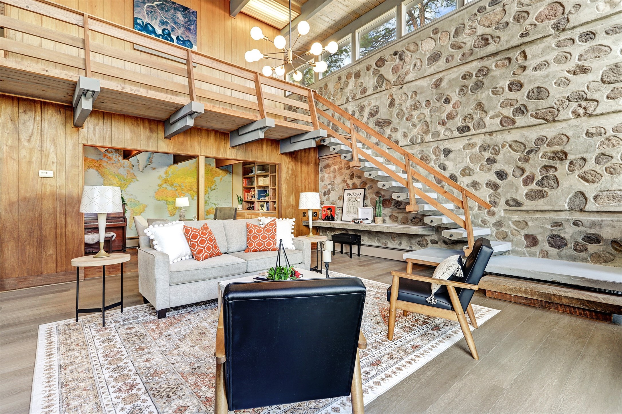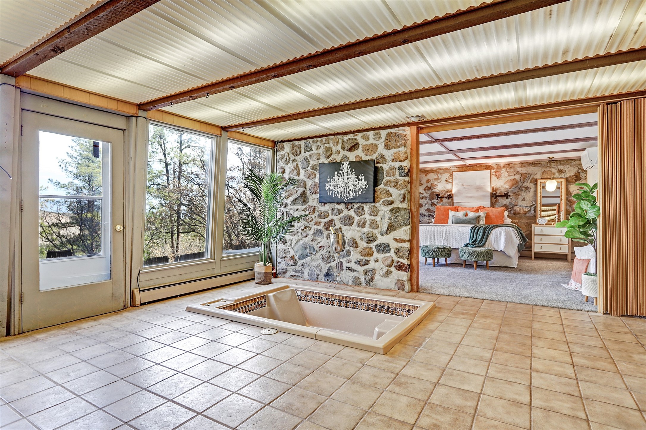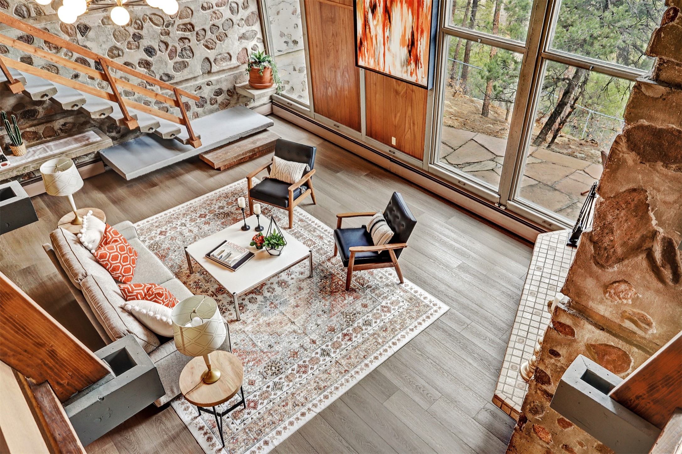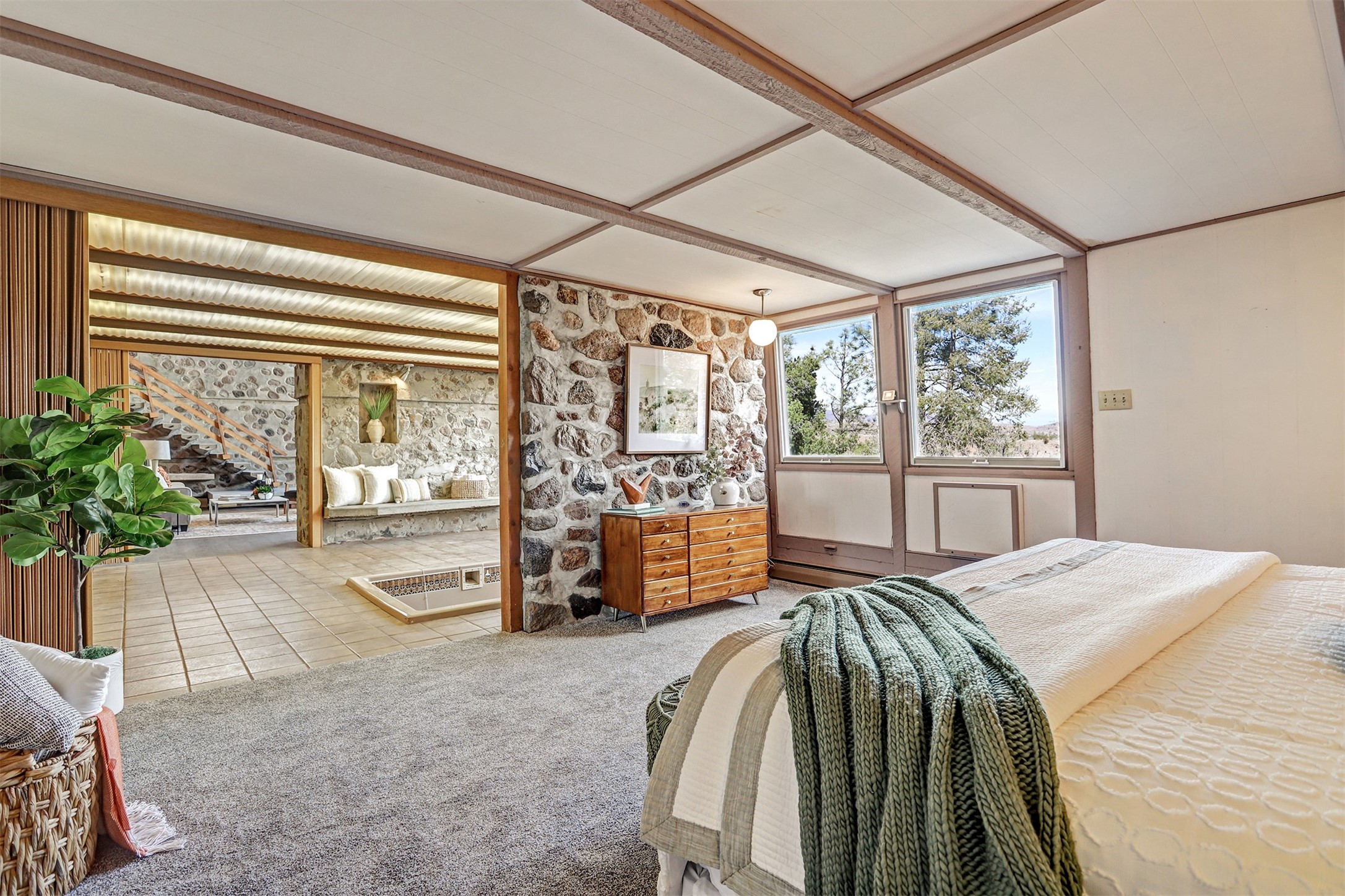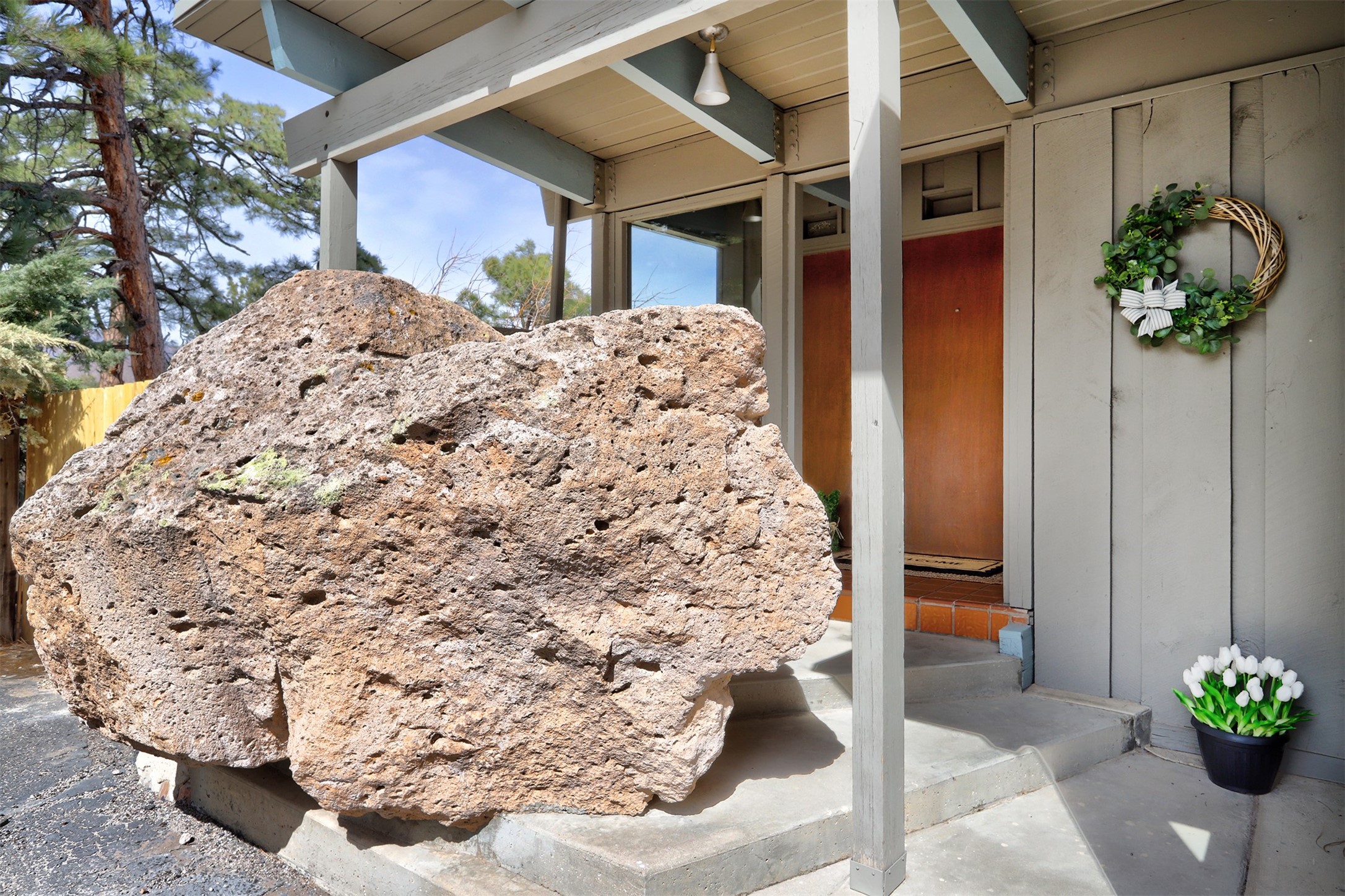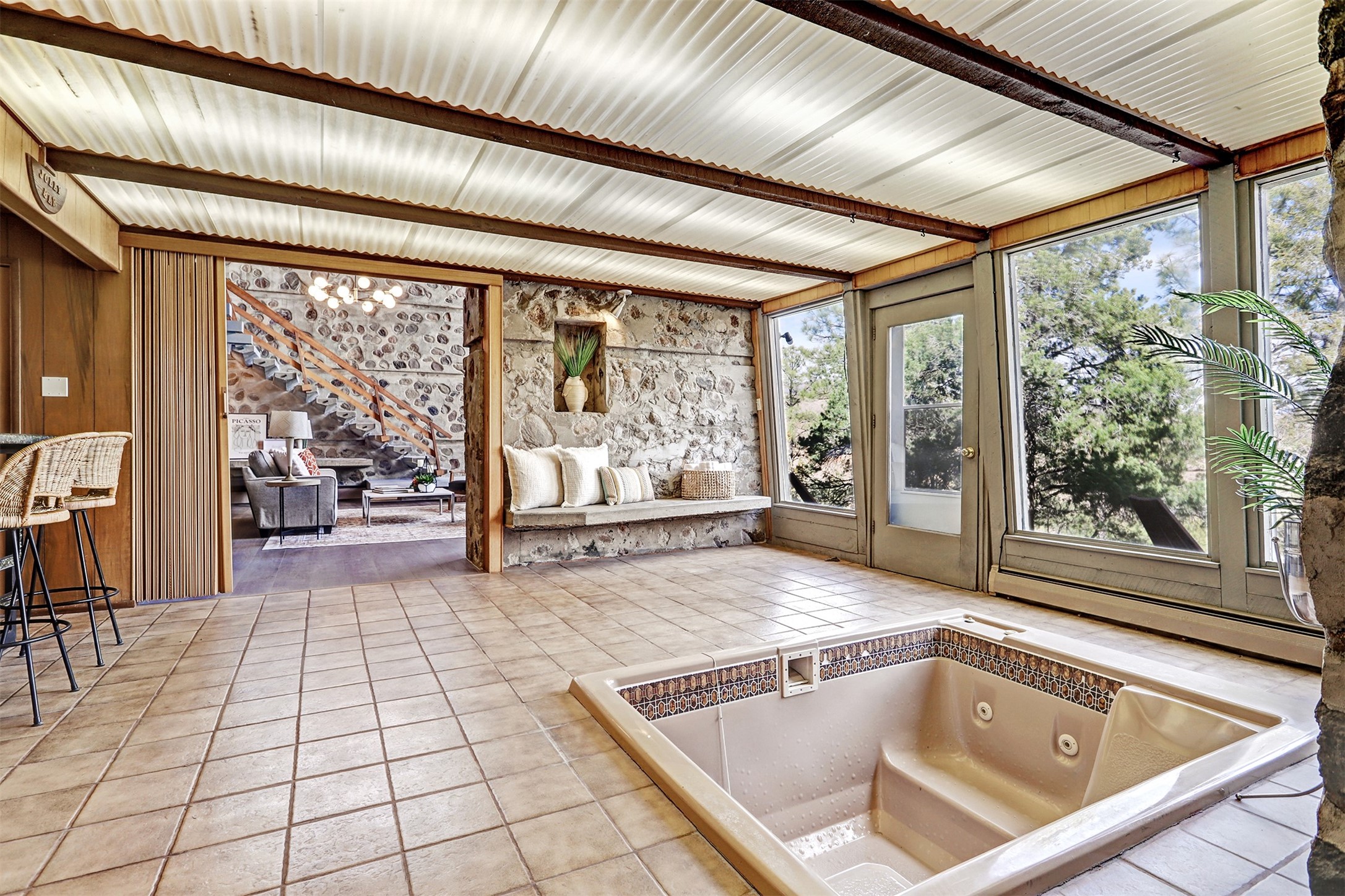 Perched on the picturesque Rendija Canyon, this stunning property with a biophilic architectural design seamlessly brings nature's qualities indoors. This remarkable property incorporates the New Mexico landscape by utilizing ponderosa, pion, and oak woods, as well as native rocks and minerals. Upon entry, you'll be met with views of the National Forest through massive two-story windows. Take the catwalk to the dining room, where the endless views continue. Your guests are sure to be awed by the organic splendor this area invokes. This level includes three guest rooms and a versatile flex room complete with a bathroom featuring fun swan fixtures. The kitchen offers convenient access to an outdoor patio and barbecue area as well as a laundry room and a two-car garage. Descend to the lower level to a spacious family room featuring Midcentury accents, such as the fireplace hood, floating hearth, and a Sputnik chandelier. This area includes a hot tub and wet bar with direct access to the back patio. The primary suite features a walk-in closet and an expansive bathroom adorned with a unique clamshell sink and koi-themed fixtures. Additionally, this level houses a large study with built-in bookshelves and a utility room providing ample storage. Stepping outside, you'll have a nice-sized, fenced yard before reaching the canyon and National Forest. This exceptional one-of-a-kind home combines modern amenities, striking design, and an immersive connection to nature. Don't miss your chance to experience this one-of-a-kind property. Schedule a showing today!