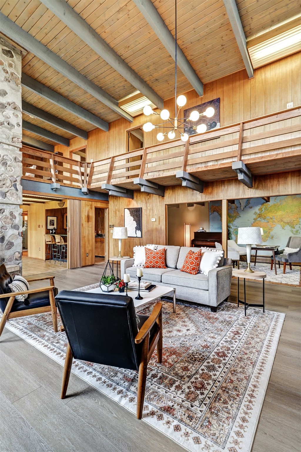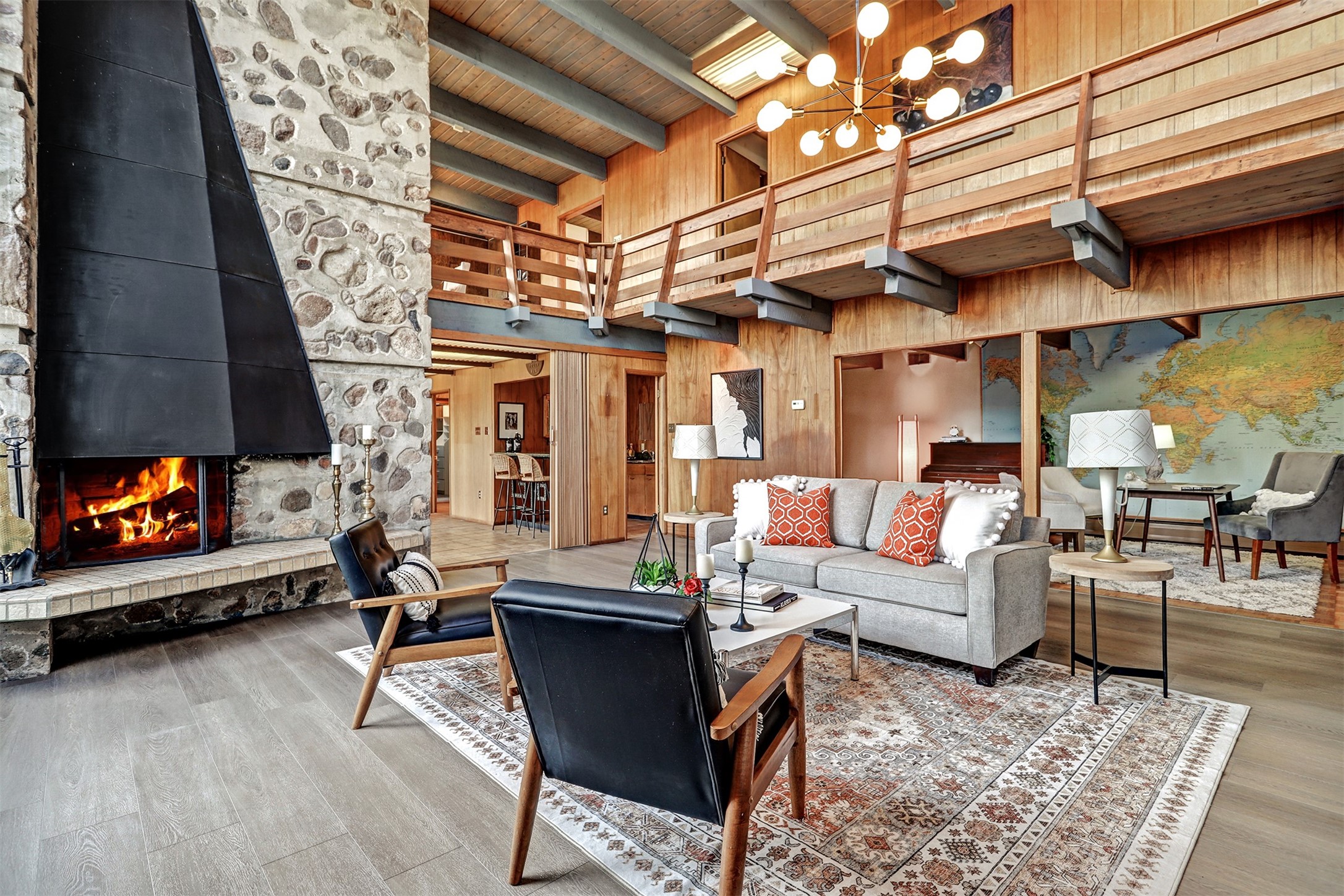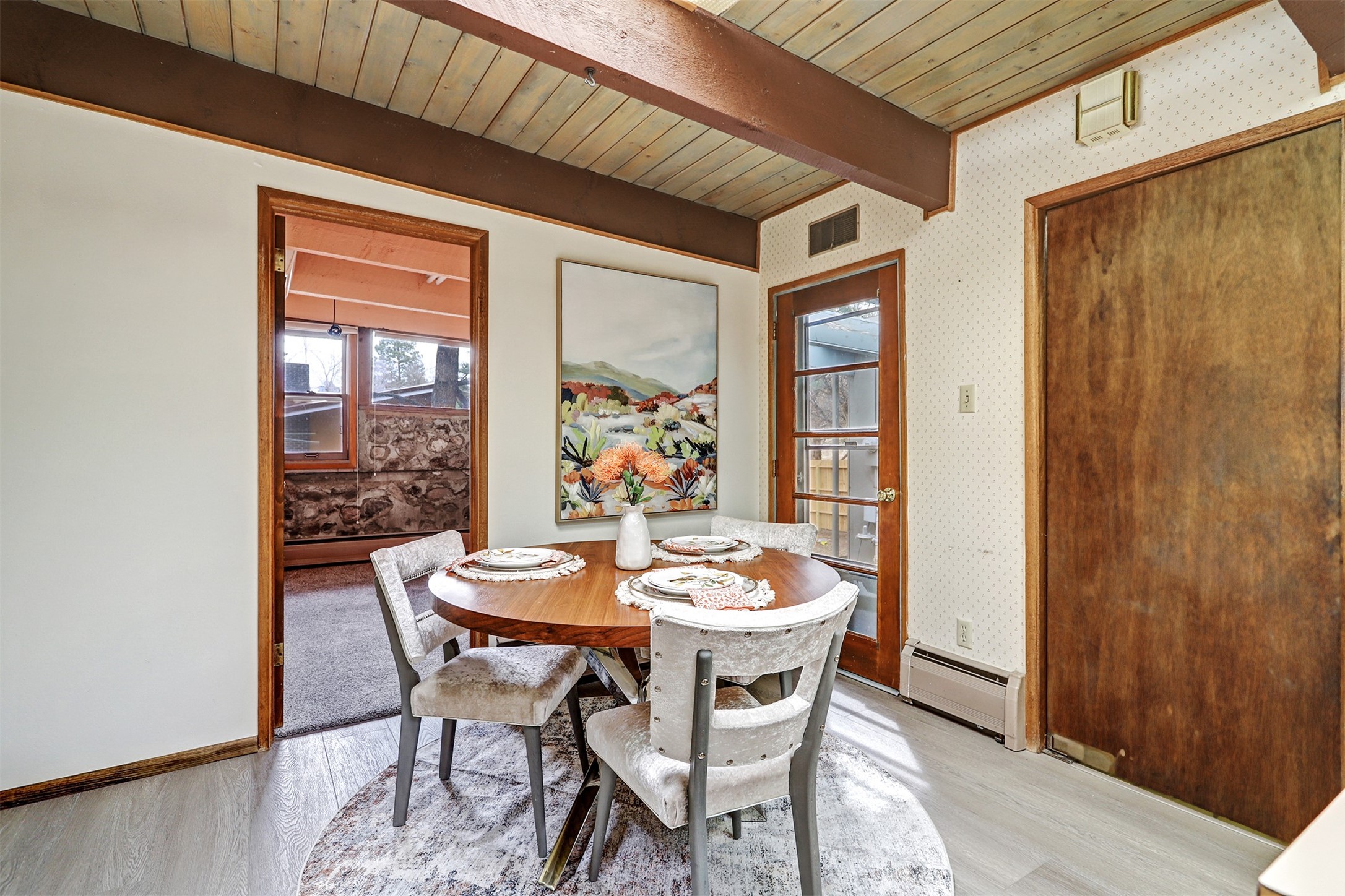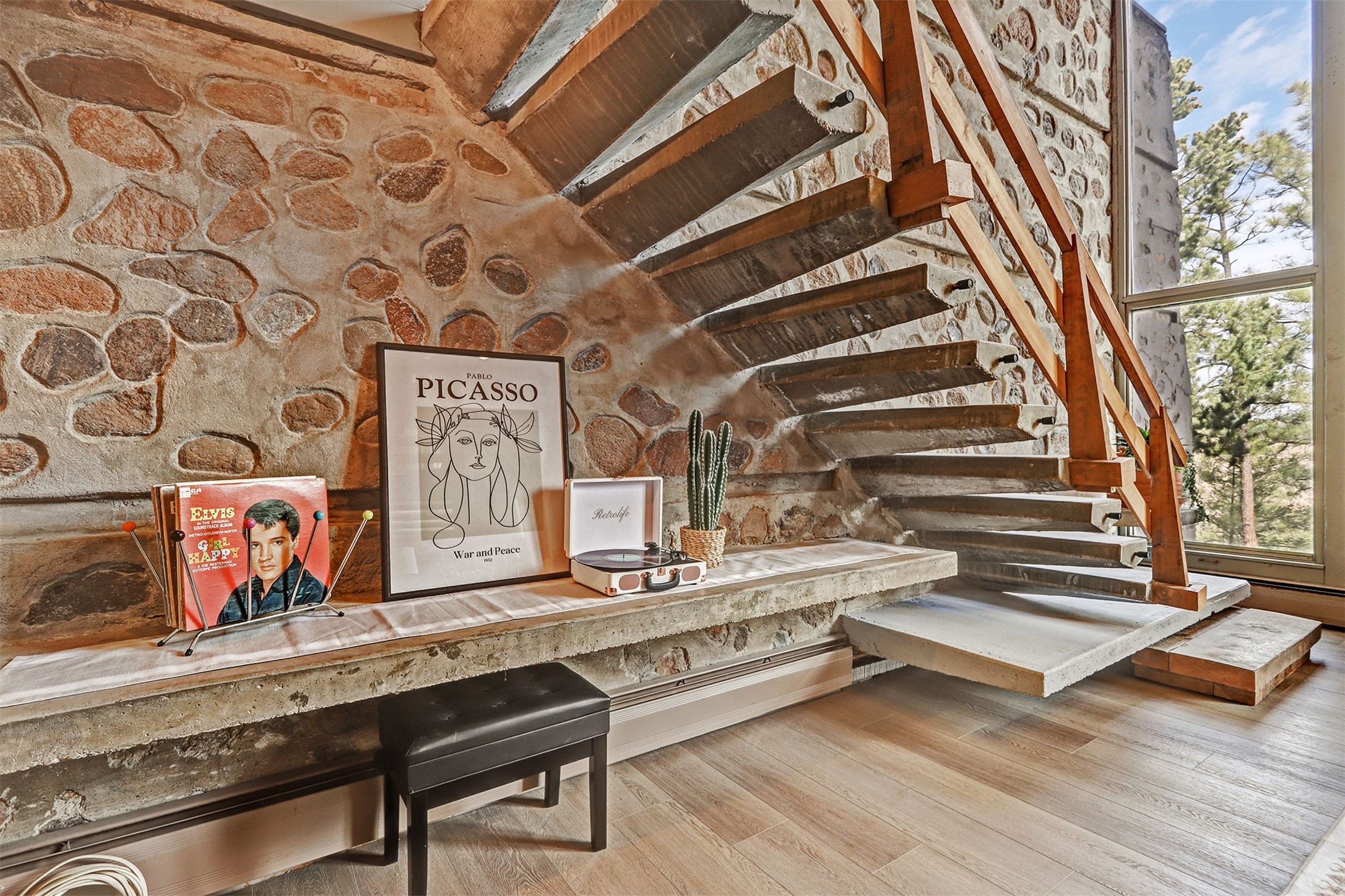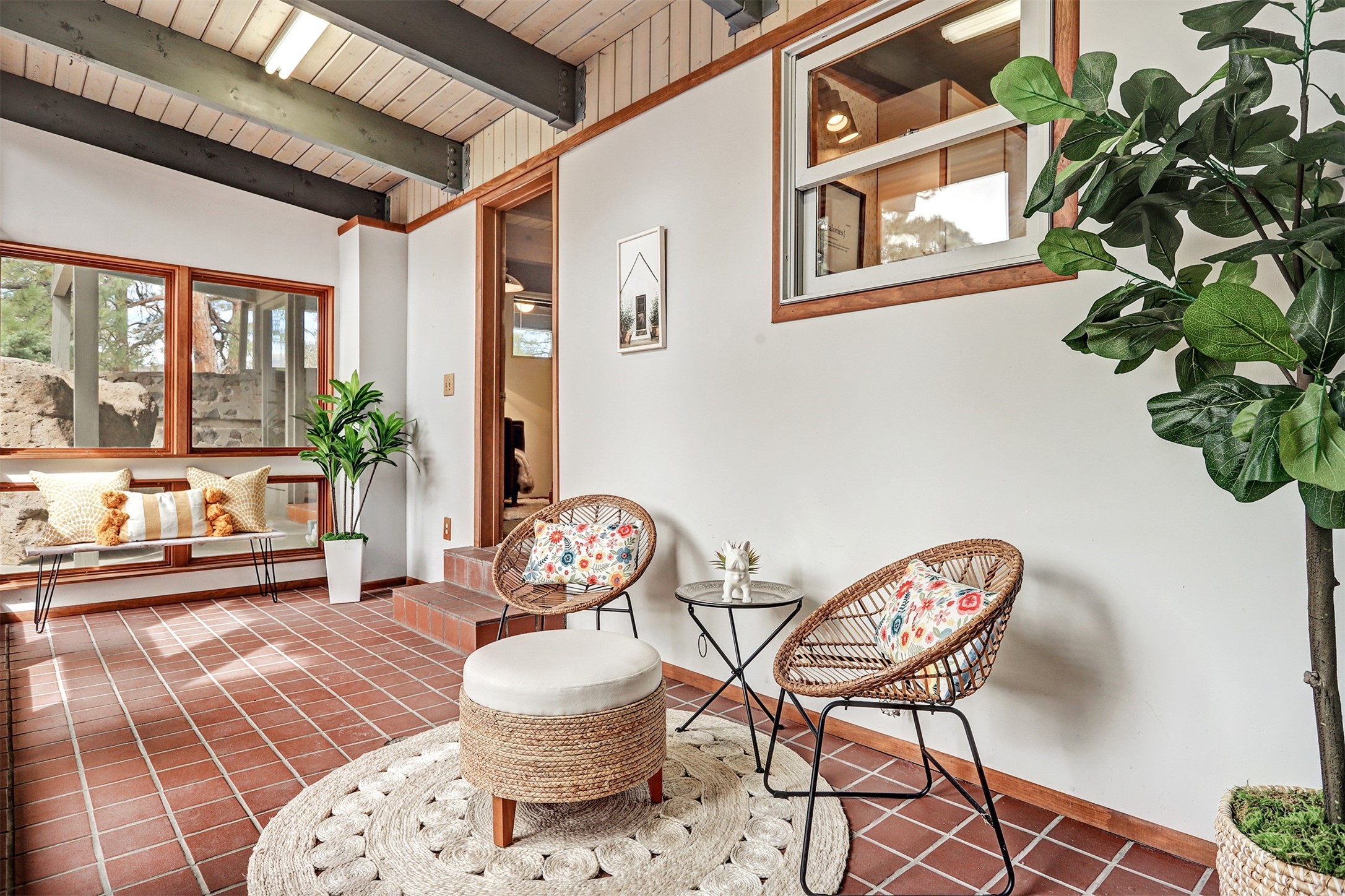 Perched on the picturesque Rendija Canyon, this stunning property with a biophilic architectural design seamlessly brings nature's qualities indoors. This remarkable property incorporates the New Mexico landscape by utilizing ponderosa, pion, and oak woods, as well as native rocks and minerals. Upon entry, you'll be met with views of the National Forest through massive two-story windows. Take the catwalk to the dining room, where the endless views continue. Your guests are sure to be awed by the organic splendor this area invokes. This level includes three guest rooms and a versatile flex room complete with a bathroom featuring fun swan fixtures. The kitchen offers convenient access to an outdoor patio and barbecue area as well as a laundry room and a two-car garage. Descend to the lower level to a spacious family room featuring Midcentury accents, such as the fireplace hood, floating hearth, and a Sputnik chandelier. This area includes a hot tub and wet bar with direct access to the back patio. The primary suite features a walk-in closet and an expansive bathroom adorned with a unique clamshell sink and koi-themed fixtures. Additionally, this level houses a large study with built-in bookshelves and a utility room providing ample storage. Stepping outside, you'll have a nice-sized, fenced yard before reaching the canyon and National Forest. This exceptional one-of-a-kind home combines modern amenities, striking design, and an immersive connection to nature. Don't miss your chance to experience this one-of-a-kind property. Schedule a showing today!