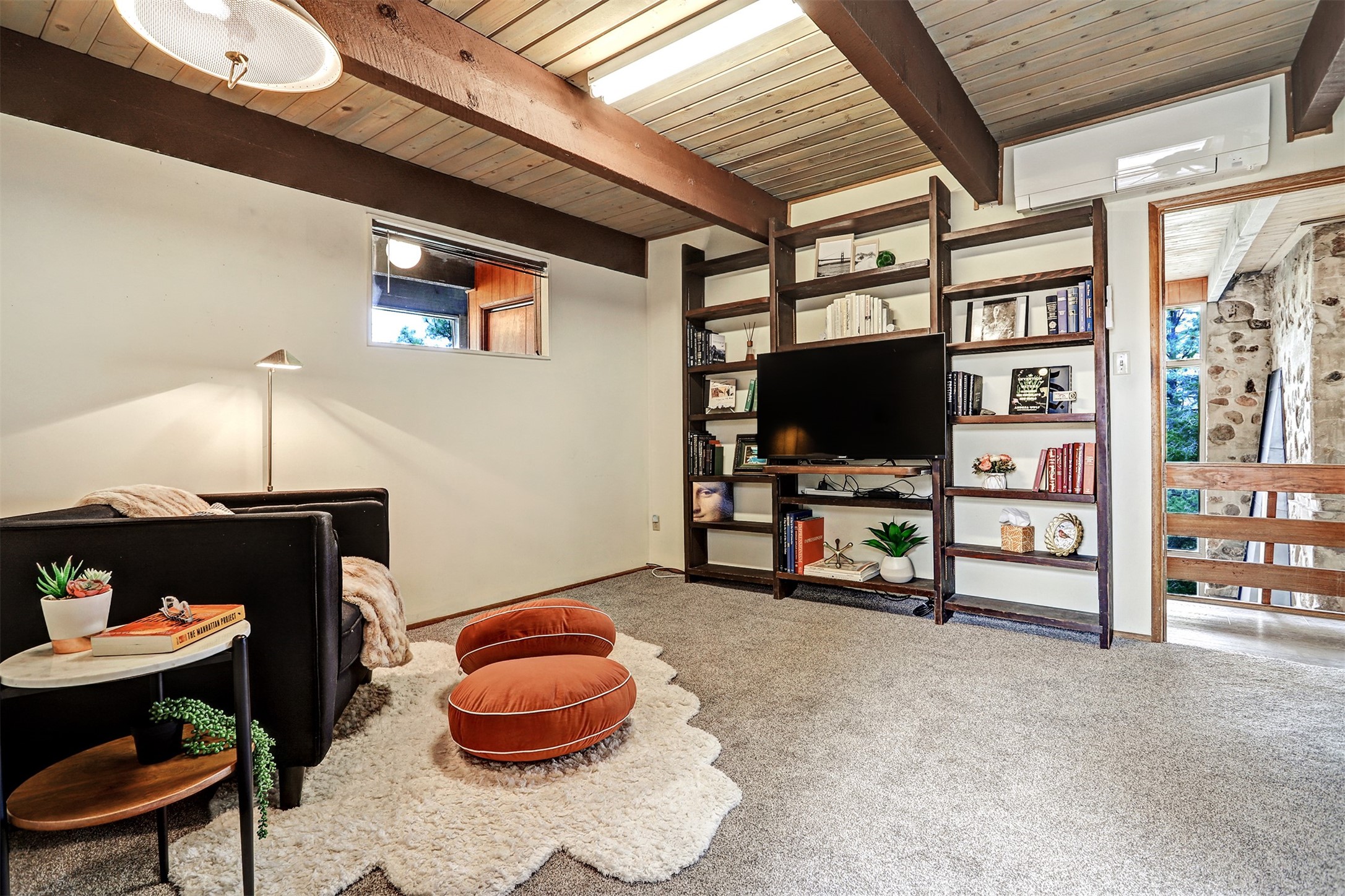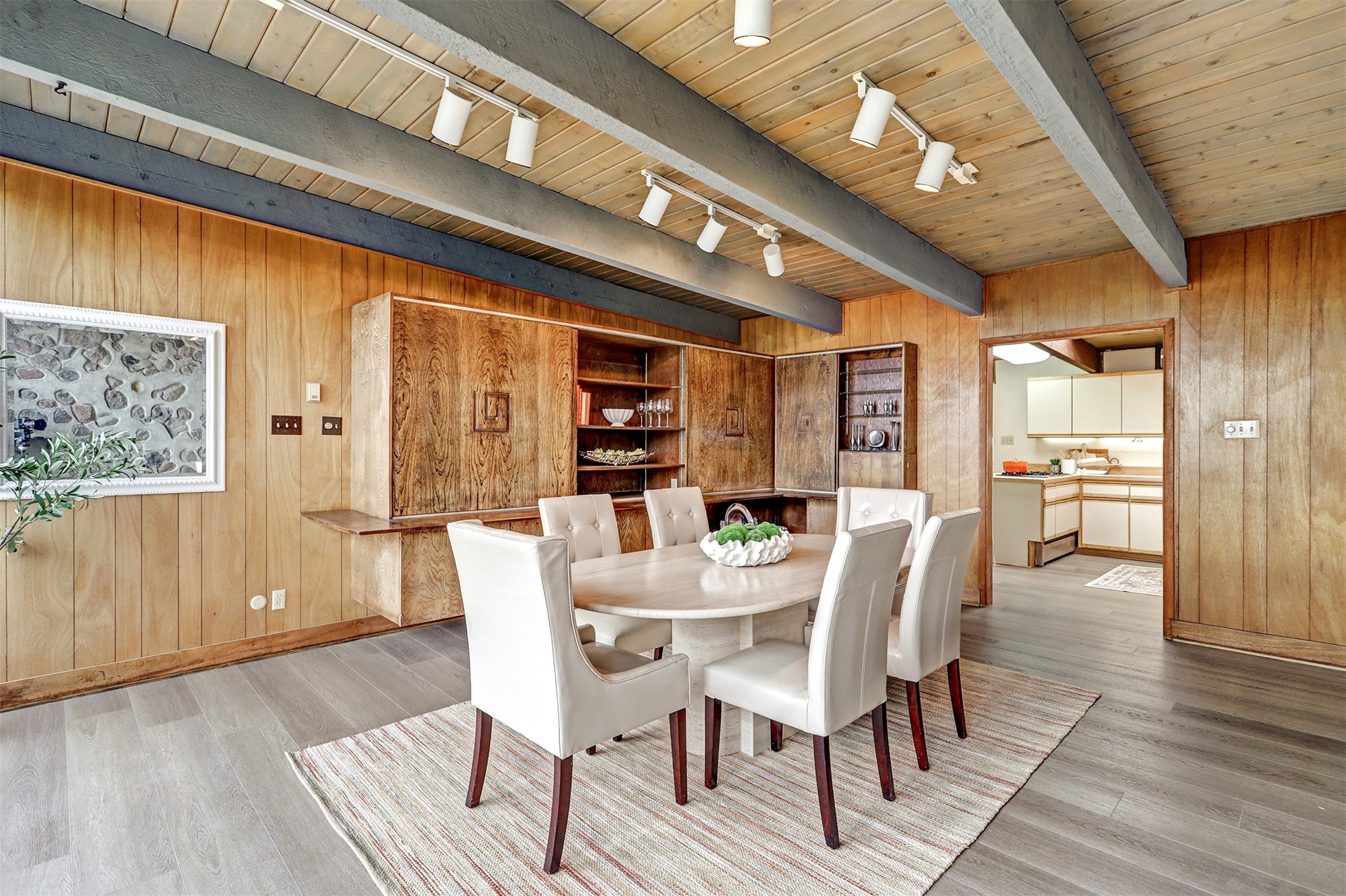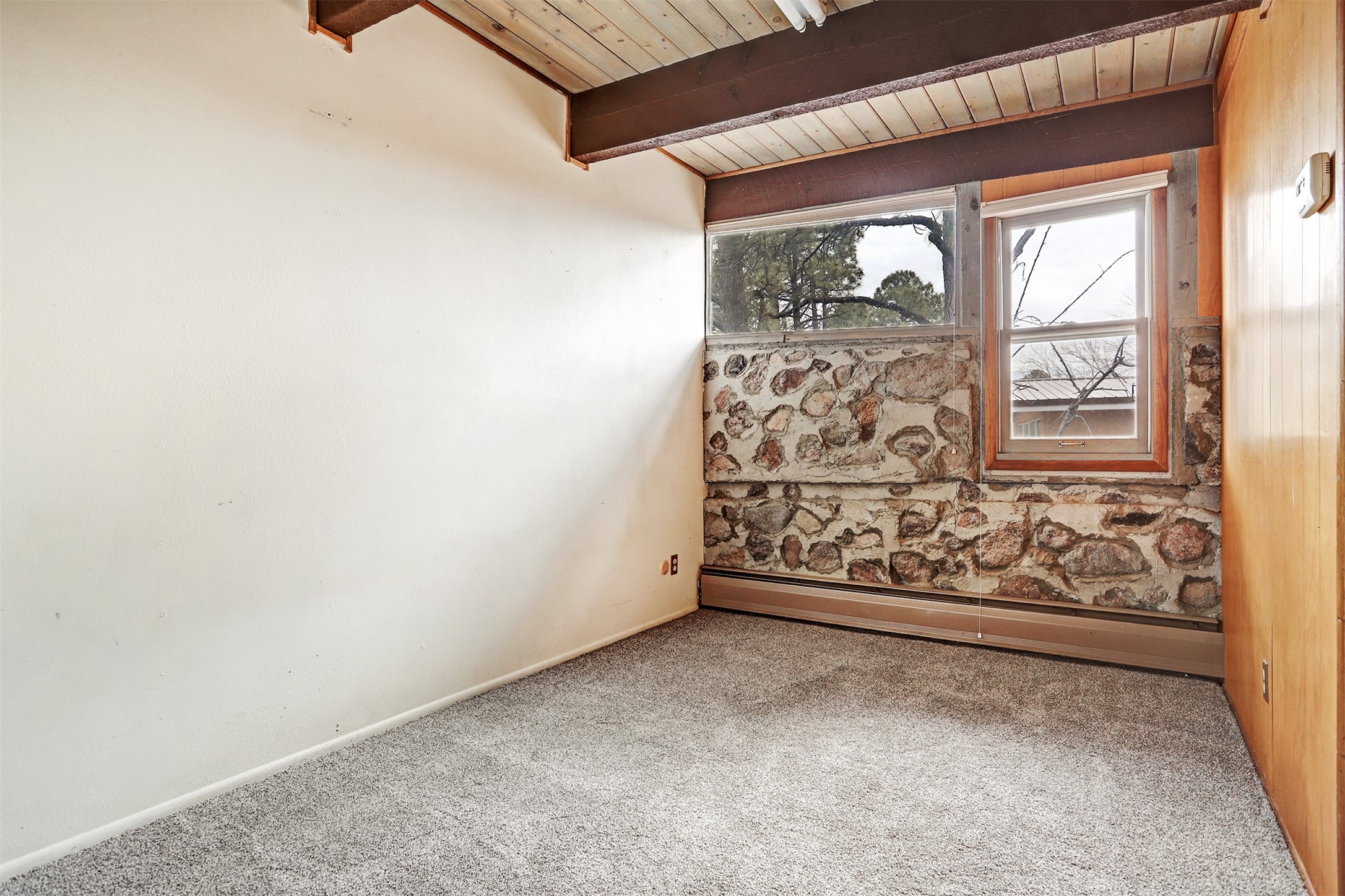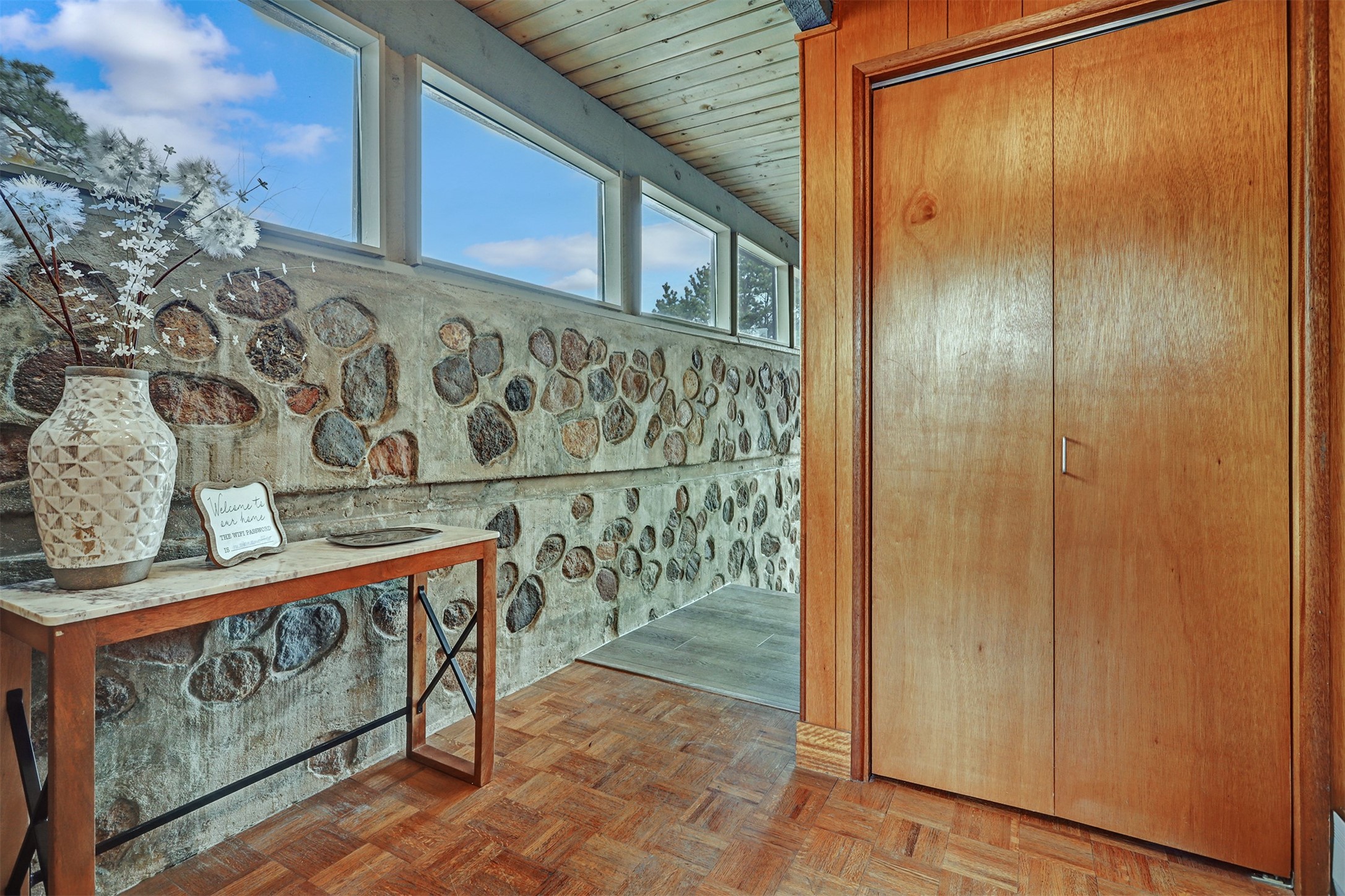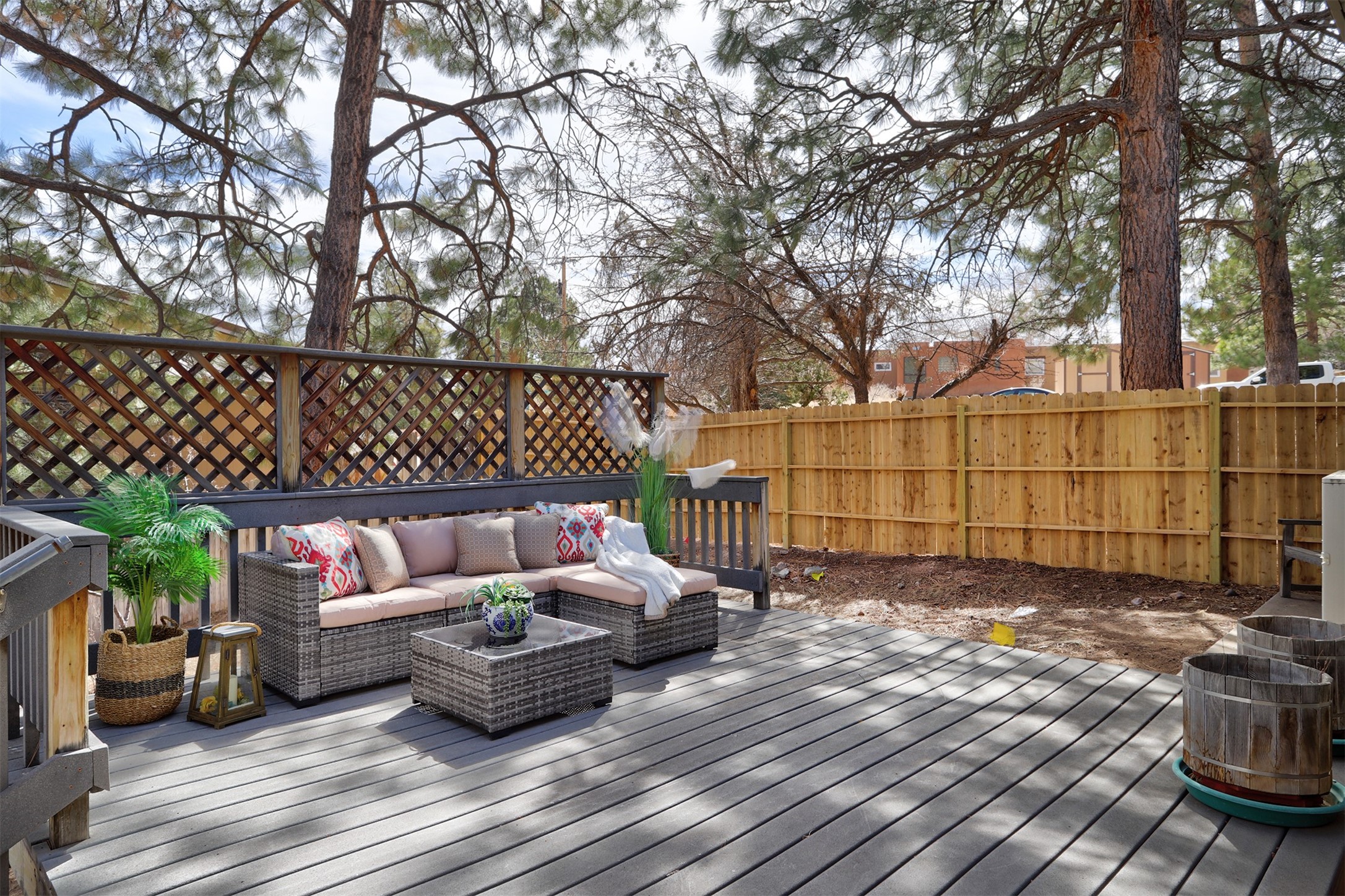 Perched on the picturesque Rendija Canyon, this stunning property with a biophilic architectural design seamlessly brings nature's qualities indoors. This remarkable property incorporates the New Mexico landscape by utilizing ponderosa, pion, and oak woods, as well as native rocks and minerals. Upon entry, you'll be met with views of the National Forest through massive two-story windows. Take the catwalk to the dining room, where the endless views continue. Your guests are sure to be awed by the organic splendor this area invokes. This level includes three guest rooms and a versatile flex room complete with a bathroom featuring fun swan fixtures. The kitchen offers convenient access to an outdoor patio and barbecue area as well as a laundry room and a two-car garage. Descend to the lower level to a spacious family room featuring Midcentury accents, such as the fireplace hood, floating hearth, and a Sputnik chandelier. This area includes a hot tub and wet bar with direct access to the back patio. The primary suite features a walk-in closet and an expansive bathroom adorned with a unique clamshell sink and koi-themed fixtures. Additionally, this level houses a large study with built-in bookshelves and a utility room providing ample storage. Stepping outside, you'll have a nice-sized, fenced yard before reaching the canyon and National Forest. This exceptional one-of-a-kind home combines modern amenities, striking design, and an immersive connection to nature. Don't miss your chance to experience this one-of-a-kind property. Schedule a showing today!