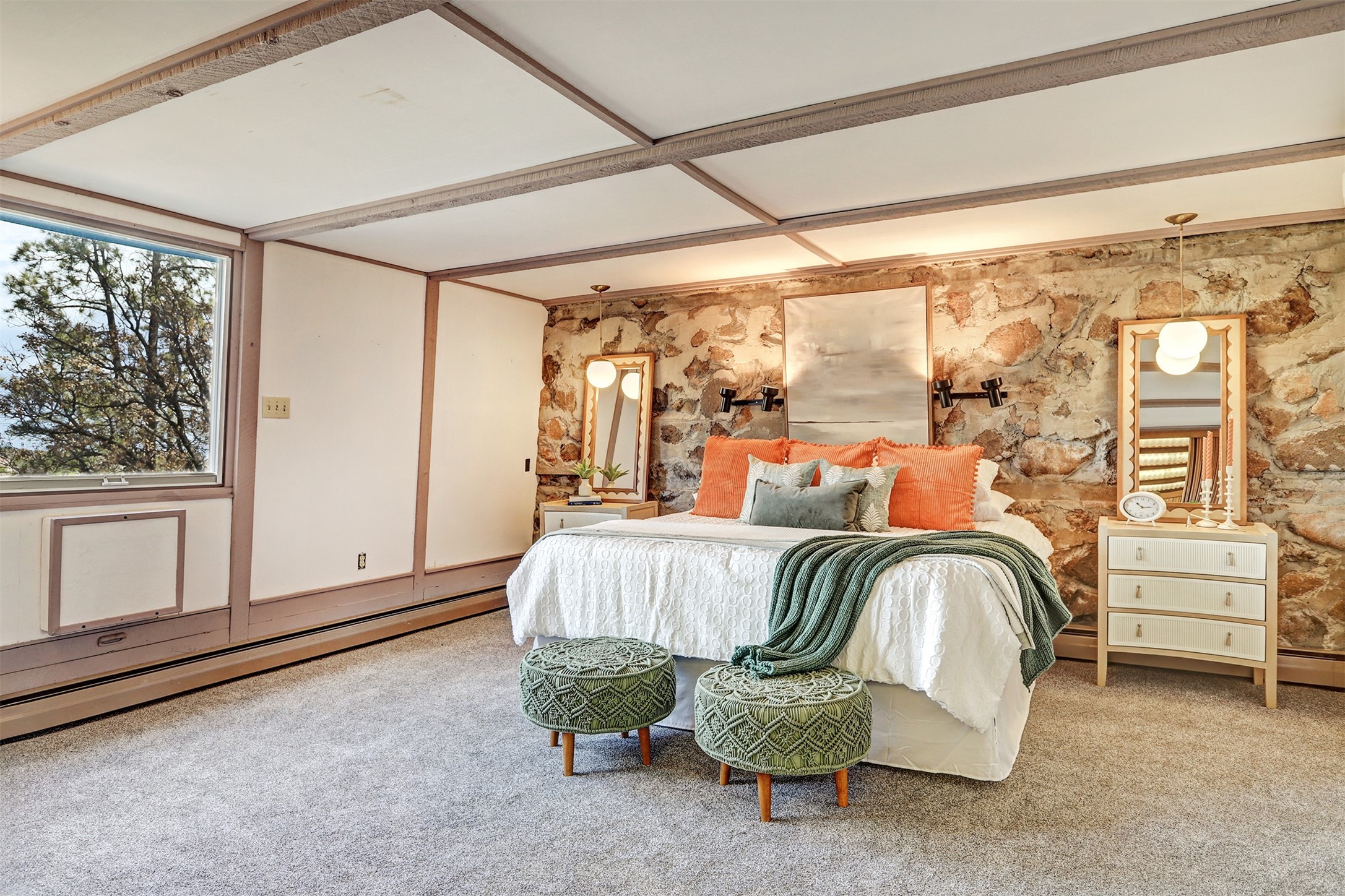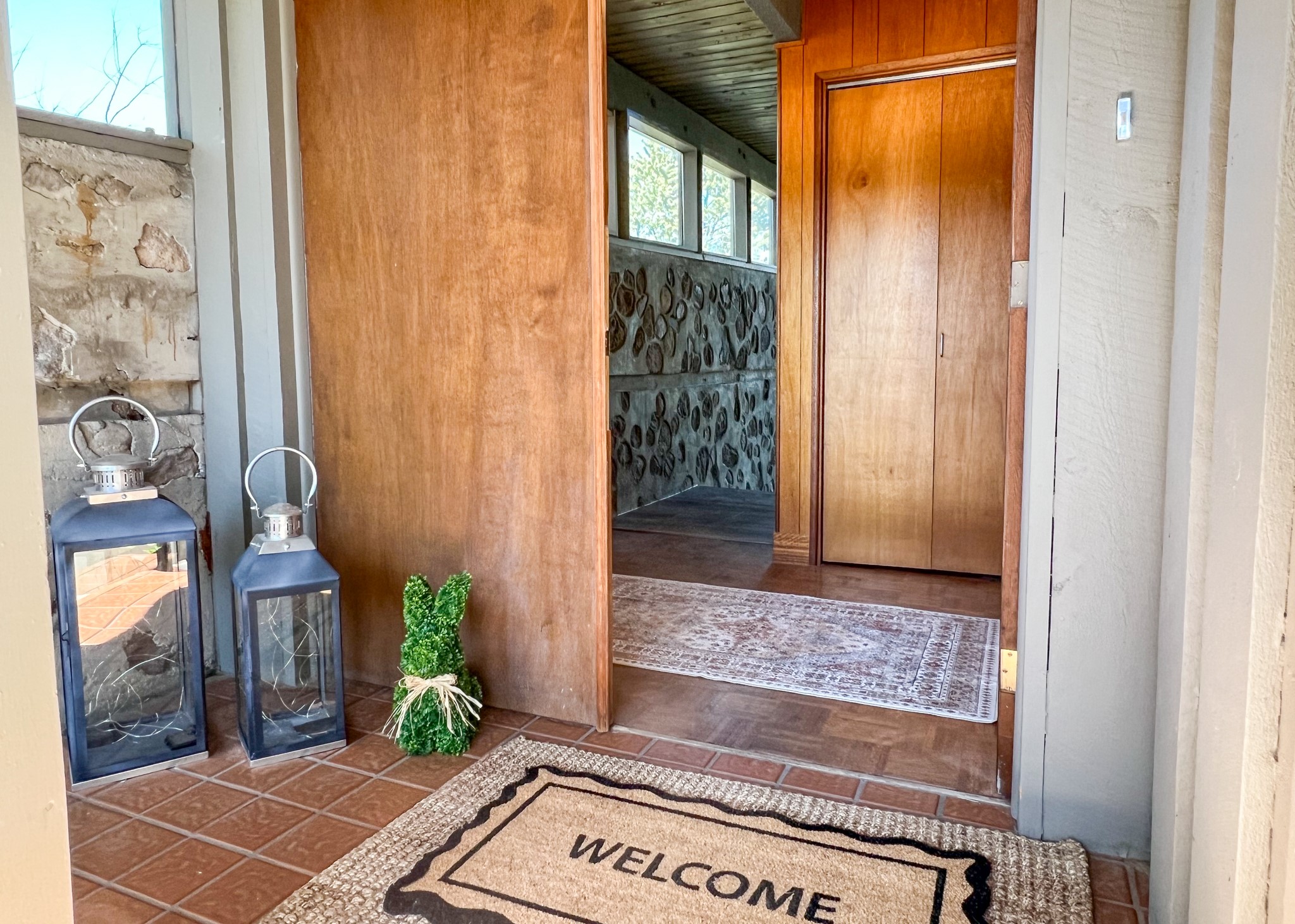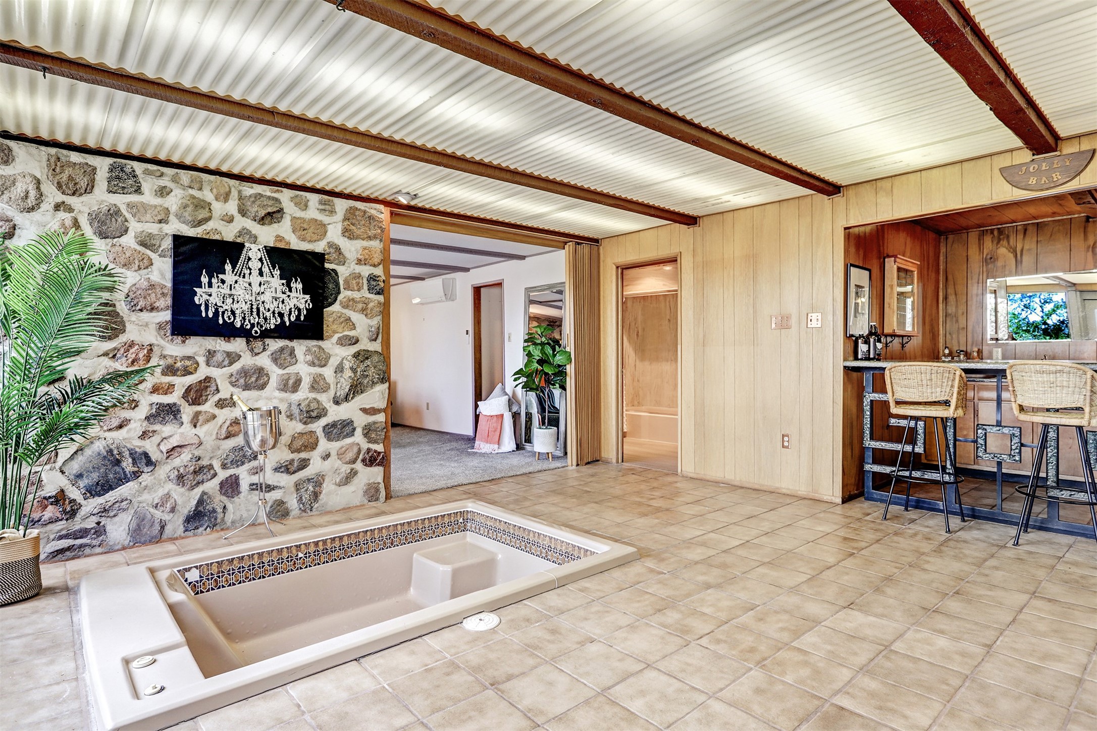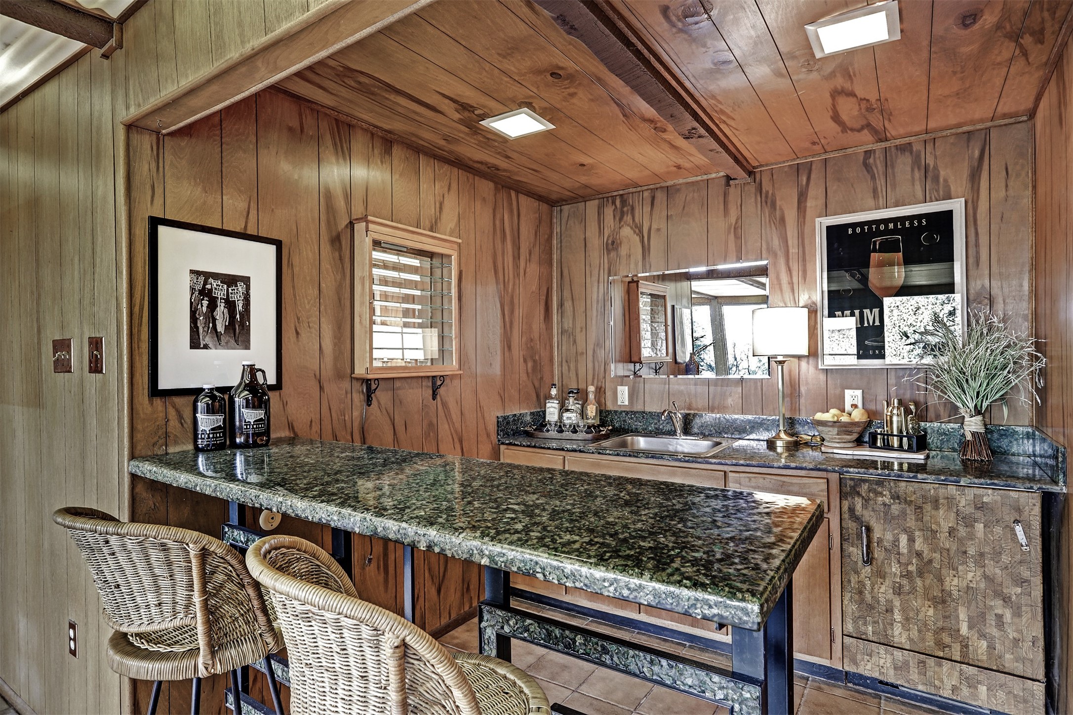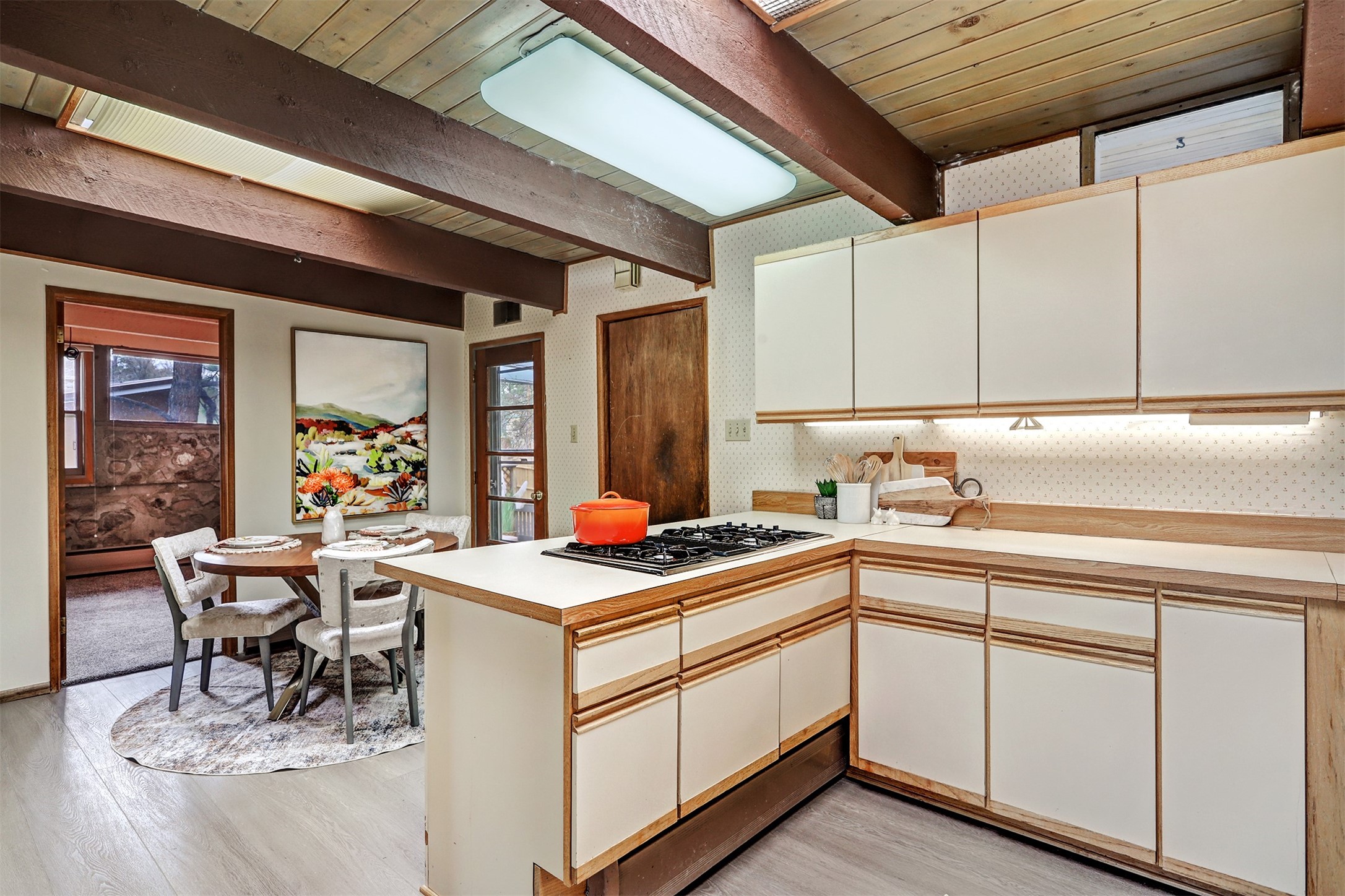 Perched on the picturesque Rendija Canyon, this stunning property with a biophilic architectural design seamlessly brings nature's qualities indoors. This remarkable property incorporates the New Mexico landscape by utilizing ponderosa, pion, and oak woods, as well as native rocks and minerals. Upon entry, you'll be met with views of the National Forest through massive two-story windows. Take the catwalk to the dining room, where the endless views continue. Your guests are sure to be awed by the organic splendor this area invokes. This level includes three guest rooms and a versatile flex room complete with a bathroom featuring fun swan fixtures. The kitchen offers convenient access to an outdoor patio and barbecue area as well as a laundry room and a two-car garage. Descend to the lower level to a spacious family room featuring Midcentury accents, such as the fireplace hood, floating hearth, and a Sputnik chandelier. This area includes a hot tub and wet bar with direct access to the back patio. The primary suite features a walk-in closet and an expansive bathroom adorned with a unique clamshell sink and koi-themed fixtures. Additionally, this level houses a large study with built-in bookshelves and a utility room providing ample storage. Stepping outside, you'll have a nice-sized, fenced yard before reaching the canyon and National Forest. This exceptional one-of-a-kind home combines modern amenities, striking design, and an immersive connection to nature. Don't miss your chance to experience this one-of-a-kind property. Schedule a showing today!