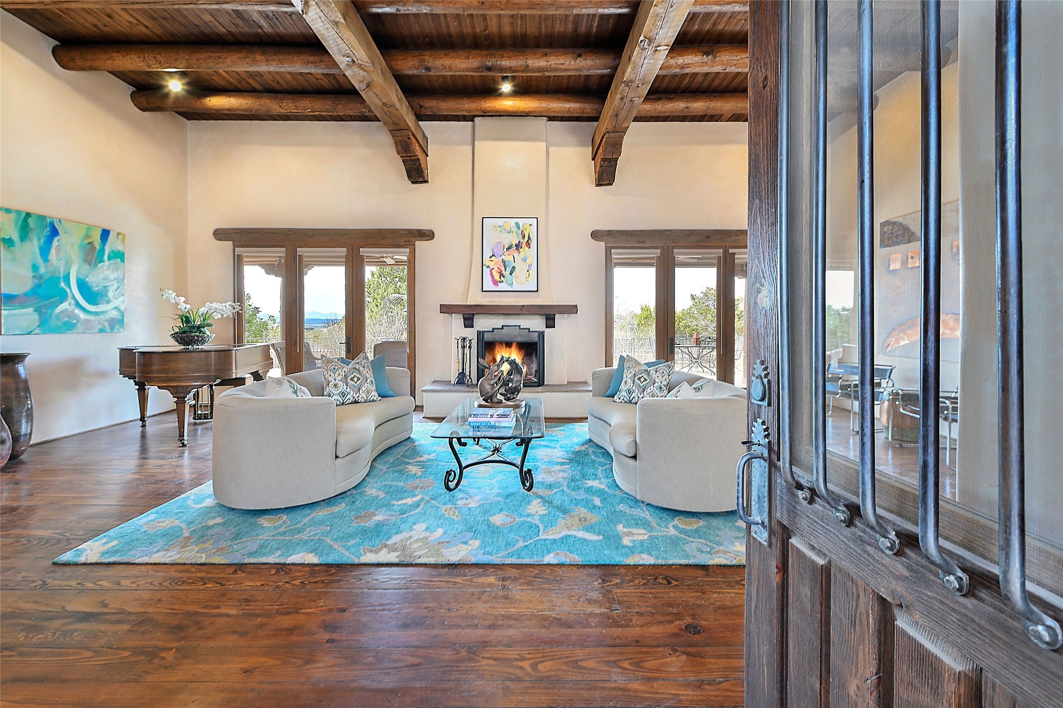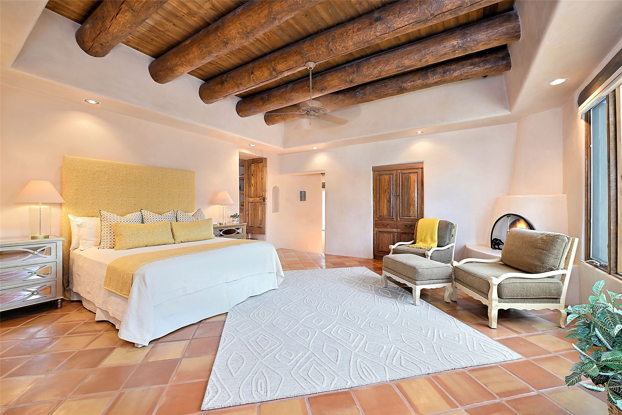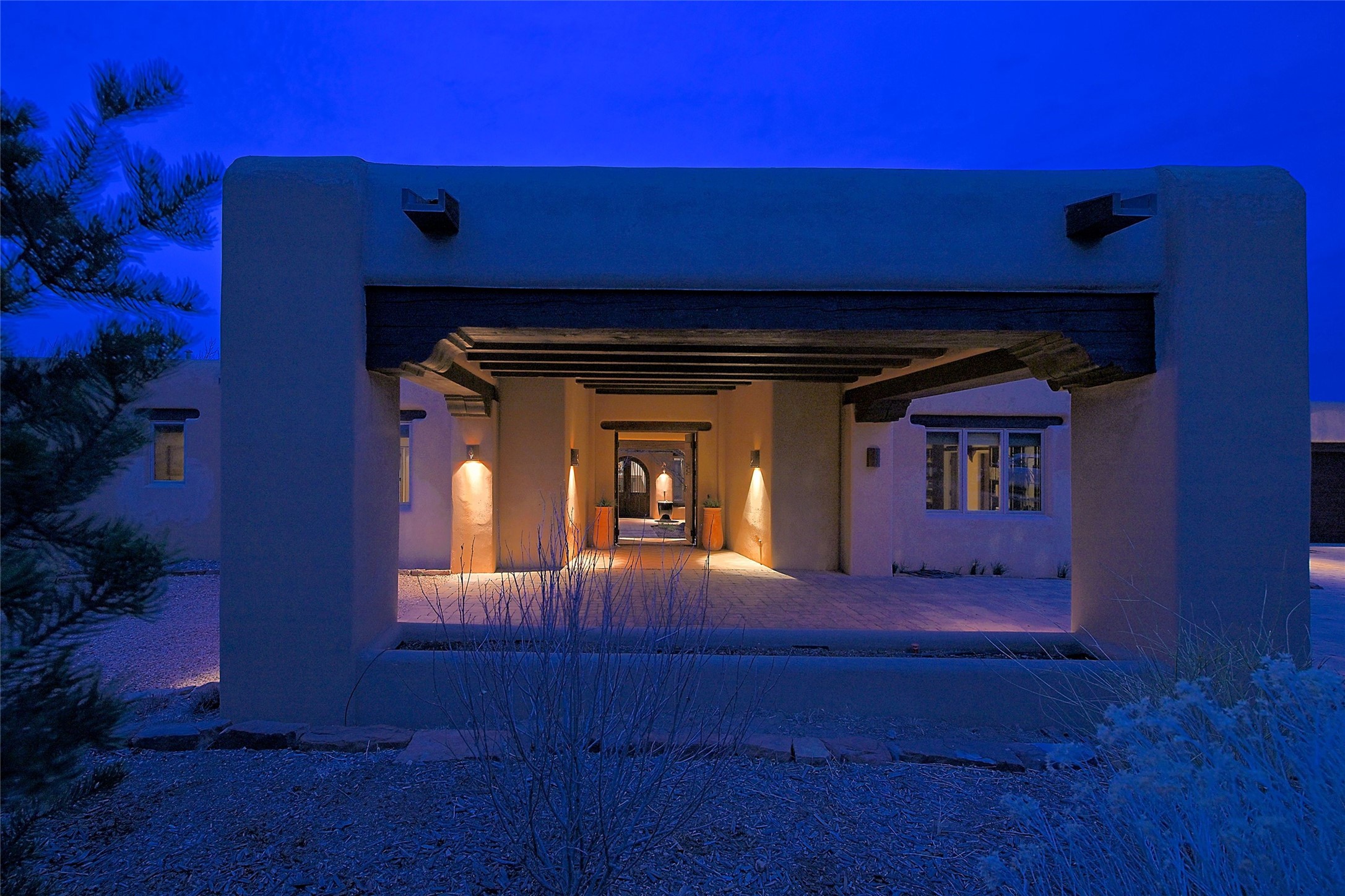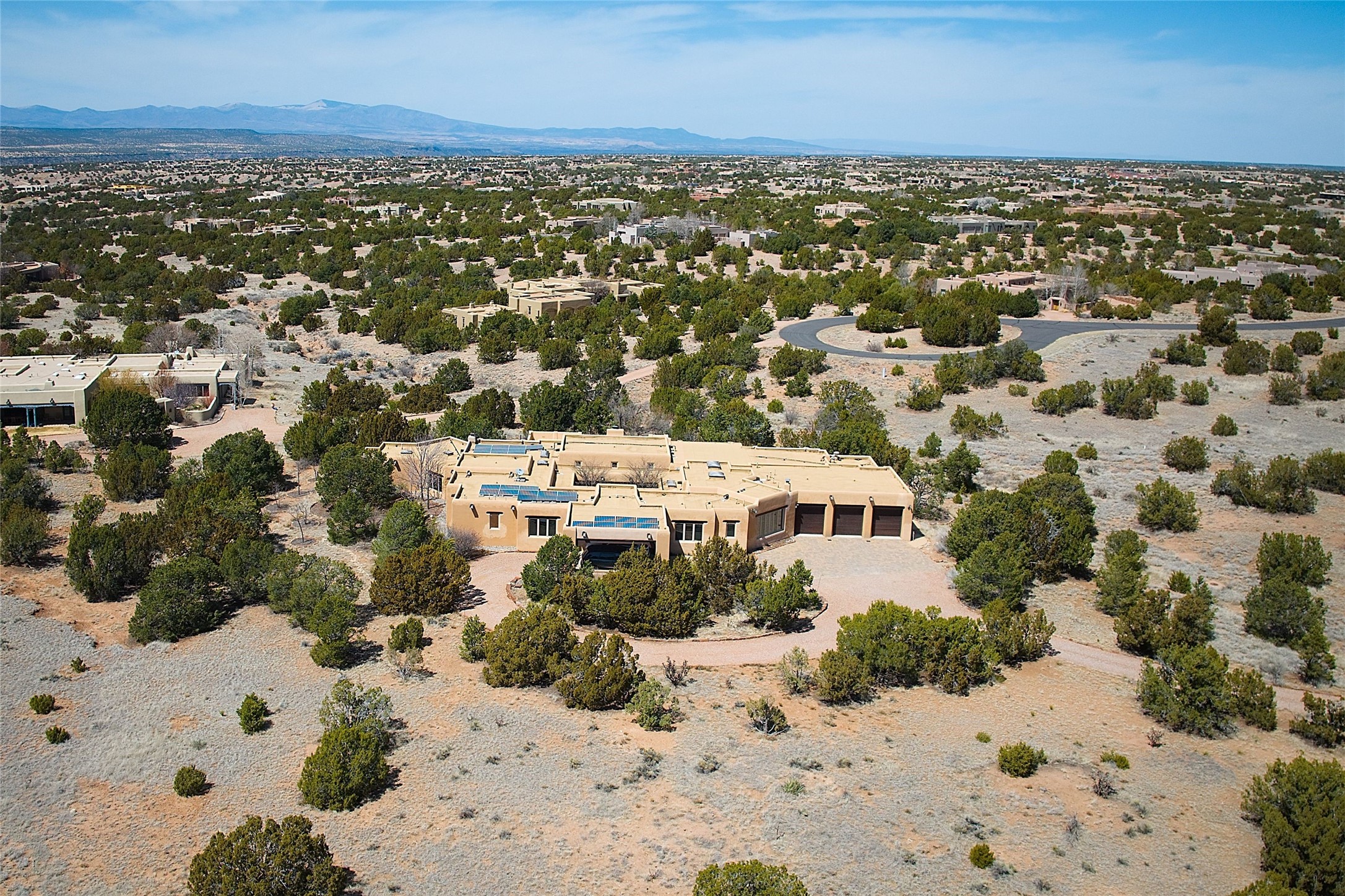 The Grande Dame of las Campanas. Set on an expansive 5 acre double lot, this property offers unparalleled privacy and security. Substantial gates open to reveal a stunning courtyard meticulously designed to create a welcoming impression with natural, elegant landscaping. Stepping through the stately front doors you're greeted by the soaring ceilings of the expansive great room seamlessly connecting to the vast patio beyond. Adjacent to the great room lies the charming formal dining room. A step beyond is the extra-large game and media room. The kitchen has enough room for two to cook and friends to gather, with a charming breakfast nook opening to the courtyard. The estate boasts four bedrooms each with en-suite baths. The primary bedroom is a private retreat with accompanying bath and an extensive two sides walk-in closet. Steps away is the home's library ready for a collection of books or artifacts. the comfortable seating area offers a peaceful place to read, work or just relax. For those who opt to join the club at Las Campanas with its world class amenities, memberships are available. Or just enjoy the serenity of a beautifully cared for community.