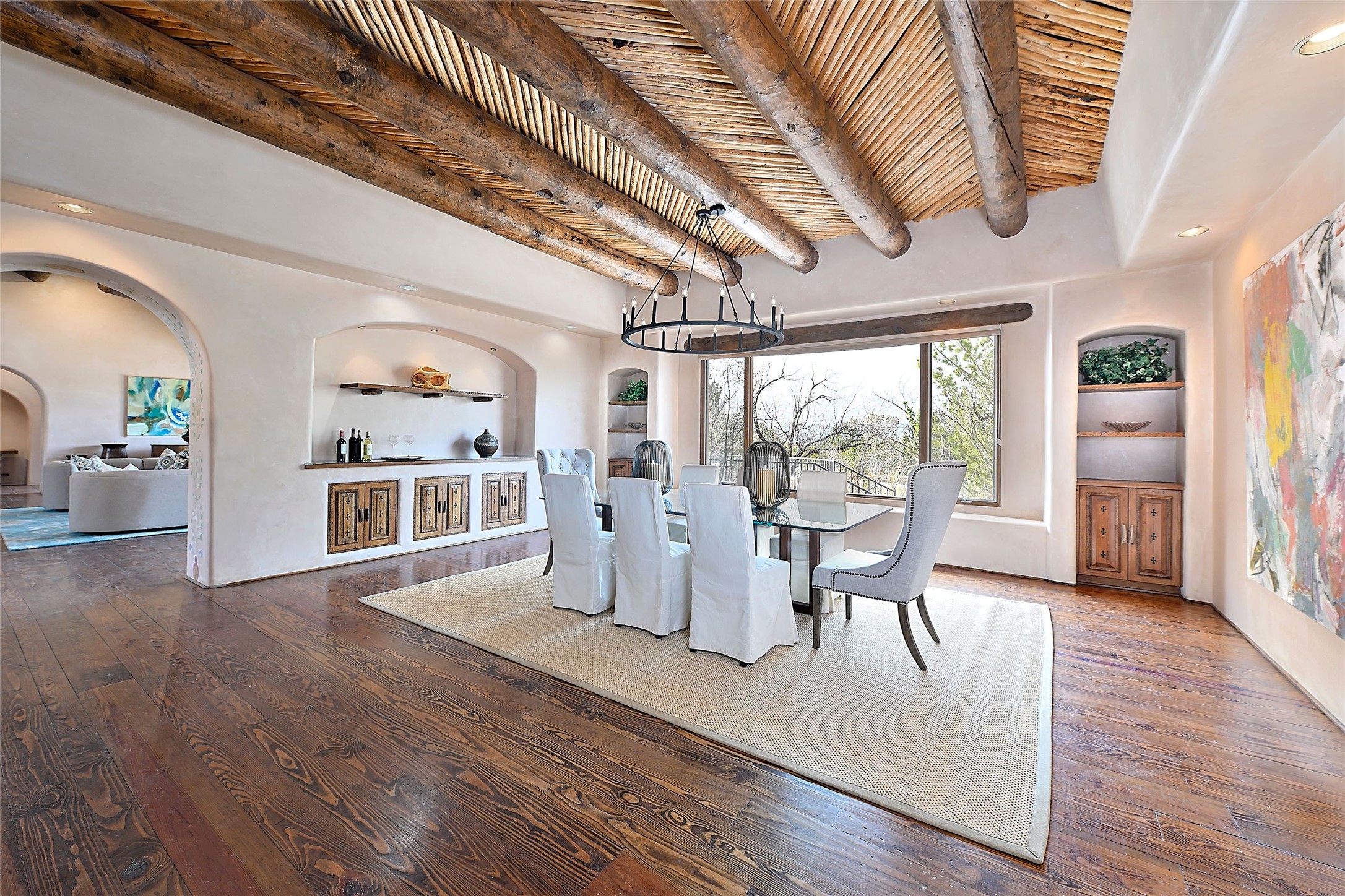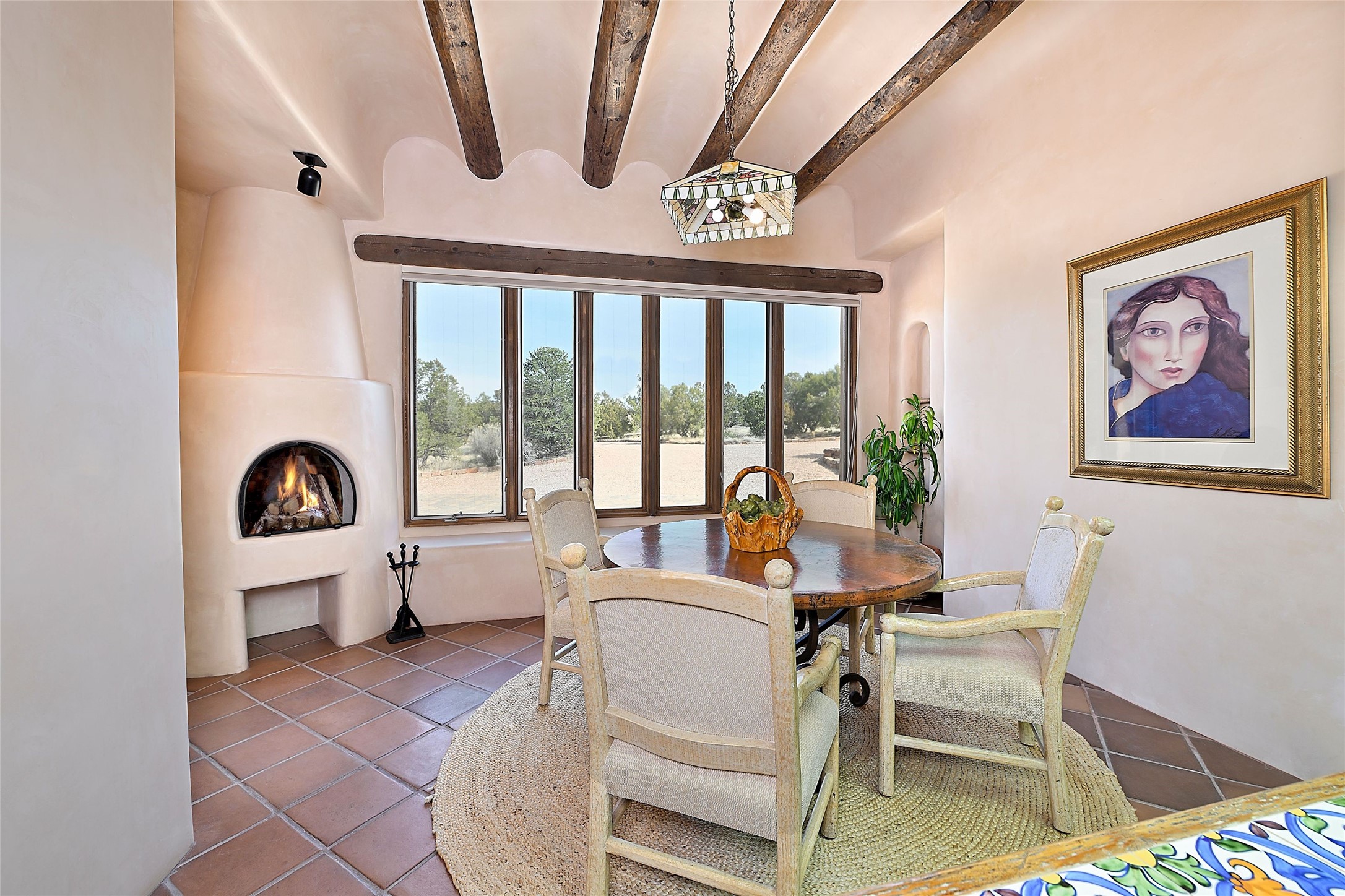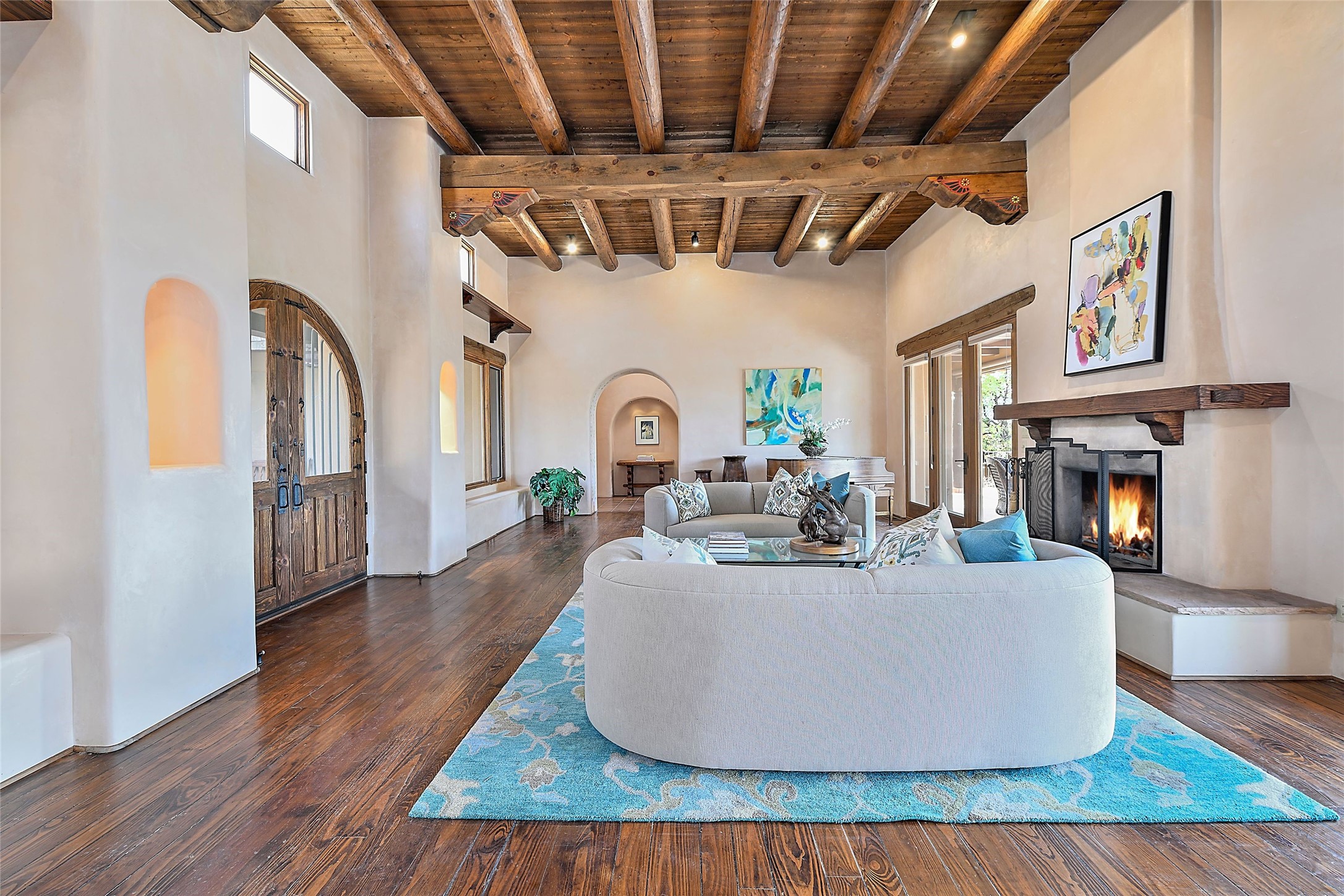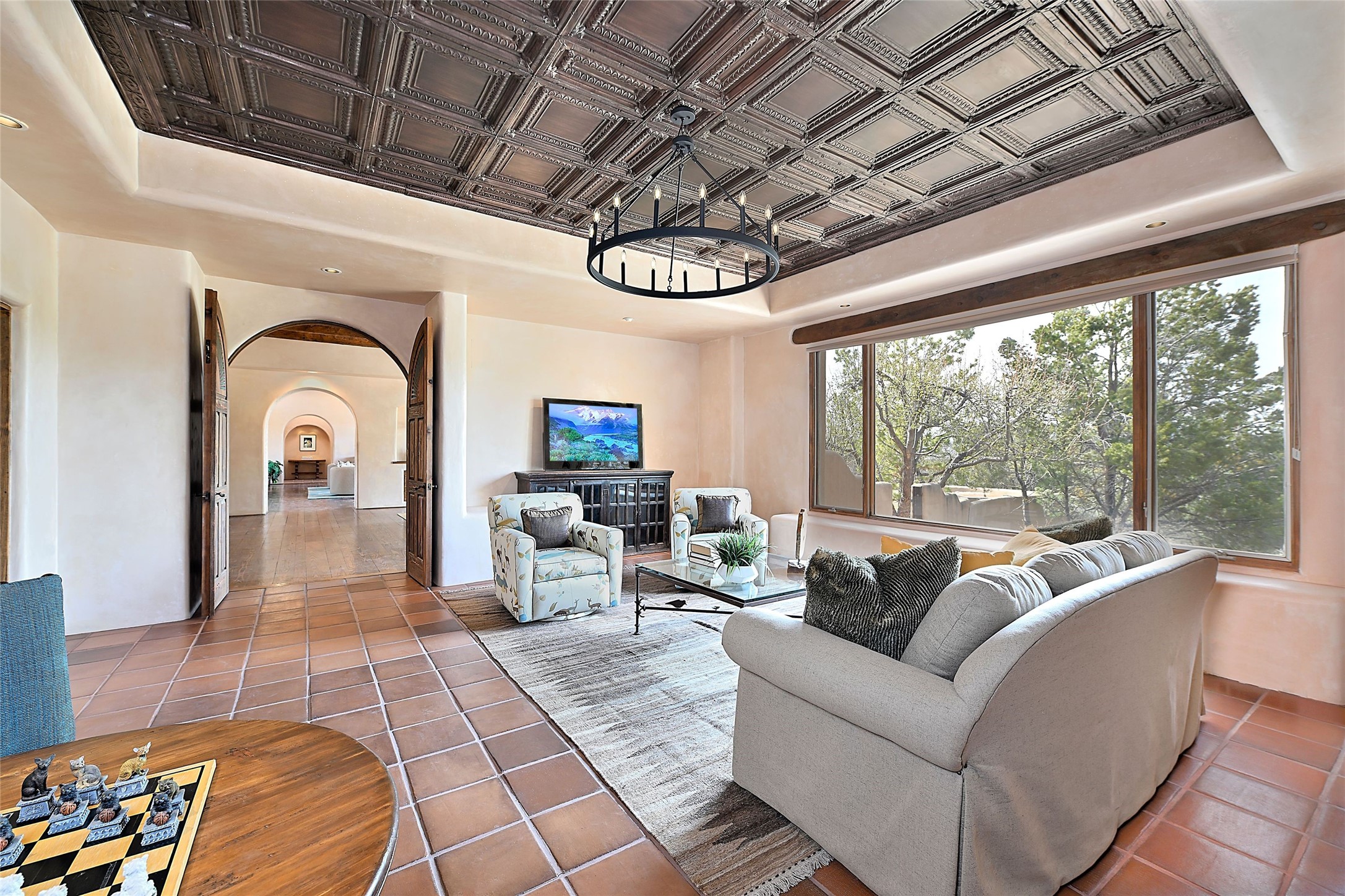 The Grande Dame of las Campanas. Set on an expansive 5 acre double lot, this property offers unparalleled privacy and security. Substantial gates open to reveal a stunning courtyard meticulously designed to create a welcoming impression with natural, elegant landscaping. Stepping through the stately front doors you're greeted by the soaring ceilings of the expansive great room seamlessly connecting to the vast patio beyond. Adjacent to the great room lies the charming formal dining room. A step beyond is the extra-large game and media room. The kitchen has enough room for two to cook and friends to gather, with a charming breakfast nook opening to the courtyard. The estate boasts four bedrooms each with en-suite baths. The primary bedroom is a private retreat with accompanying bath and an extensive two sides walk-in closet. Steps away is the home's library ready for a collection of books or artifacts. the comfortable seating area offers a peaceful place to read, work or just relax. For those who opt to join the club at Las Campanas with its world class amenities, memberships are available. Or just enjoy the serenity of a beautifully cared for community.