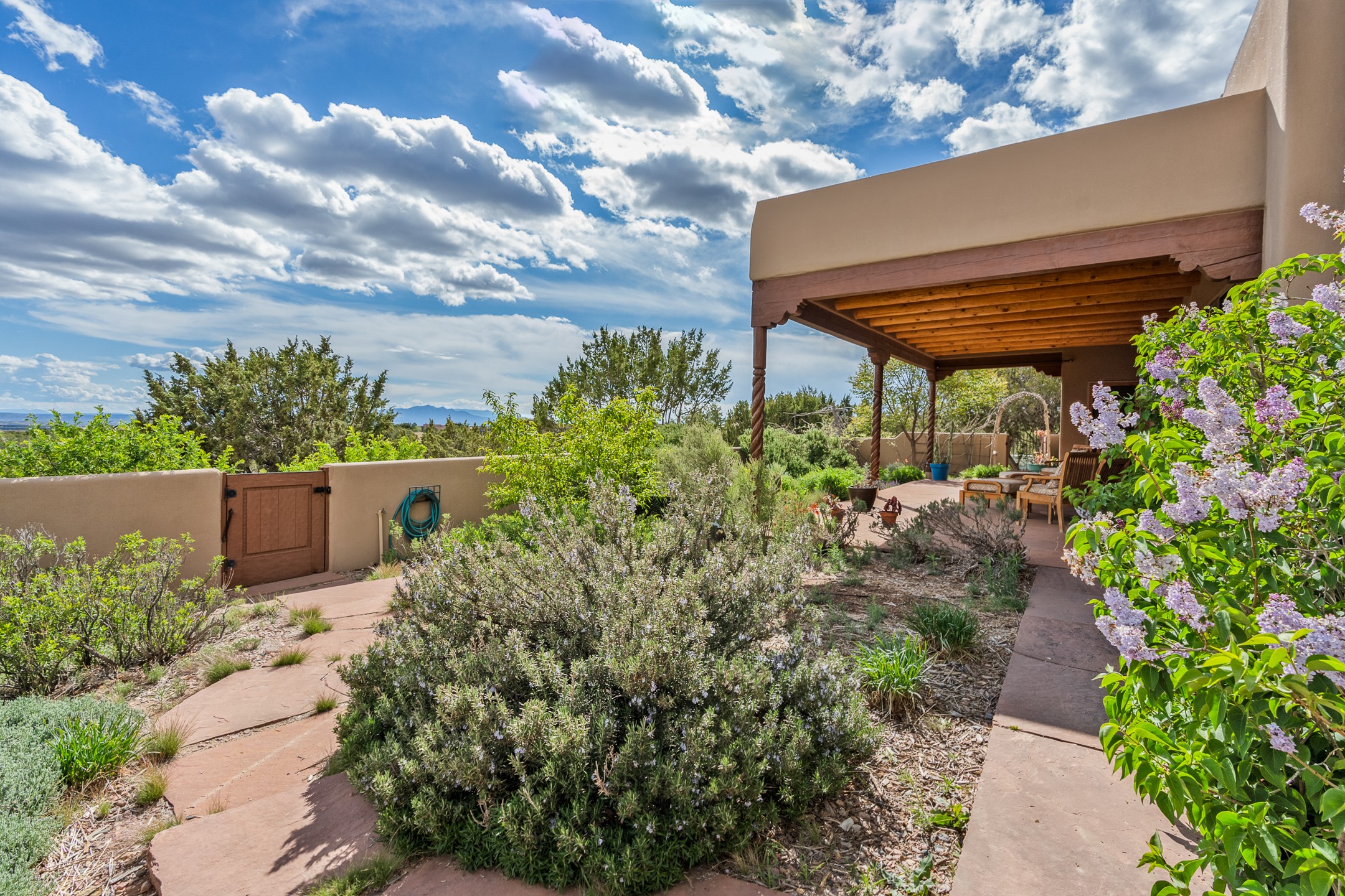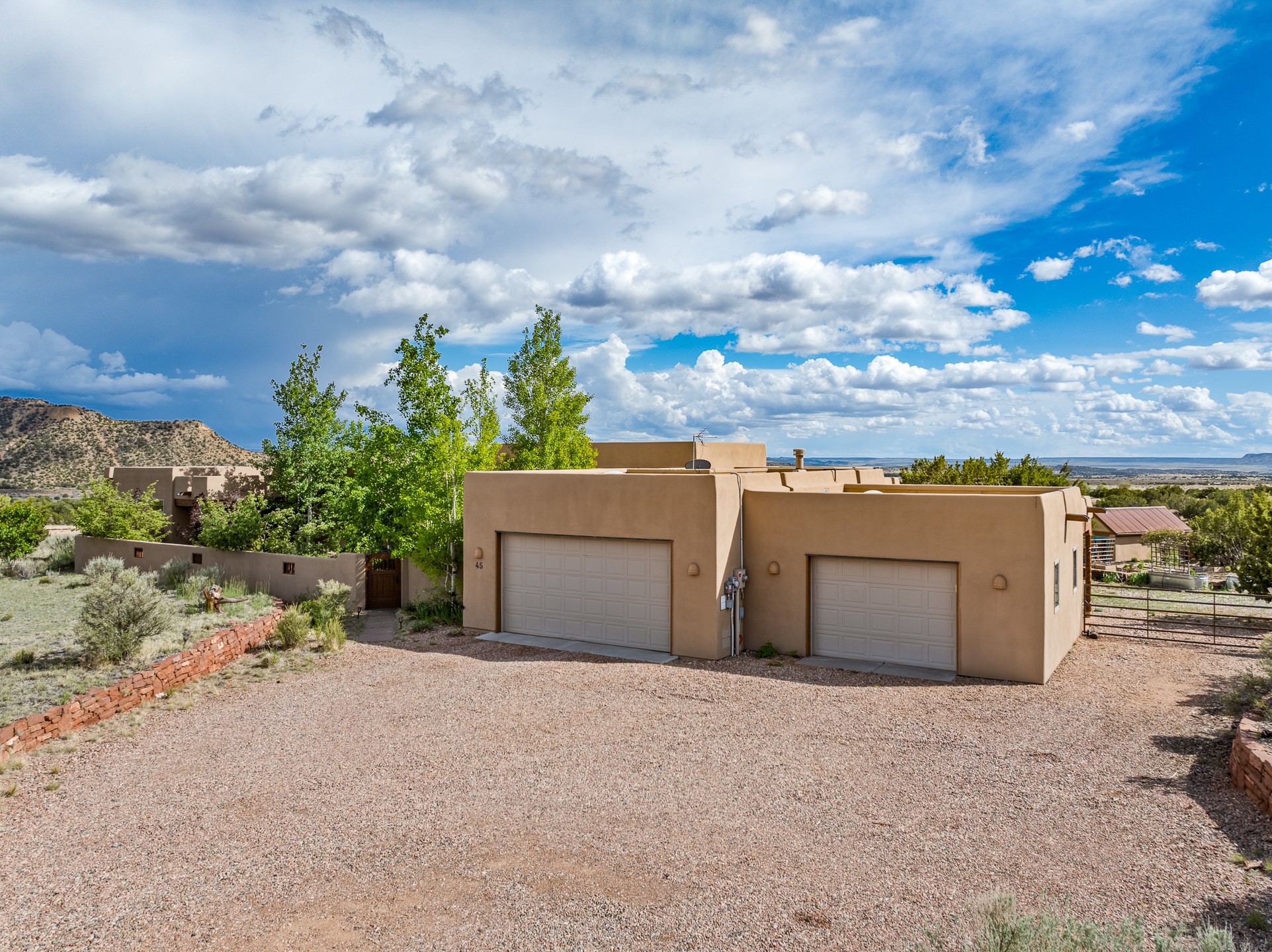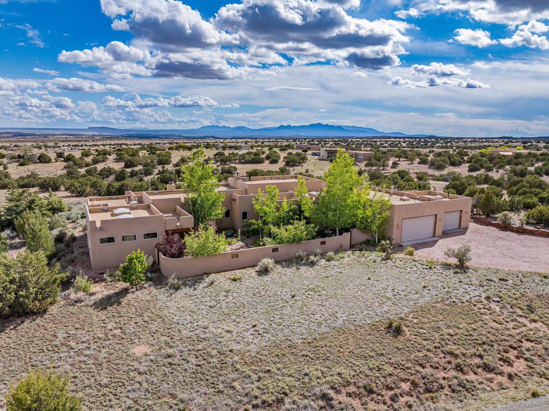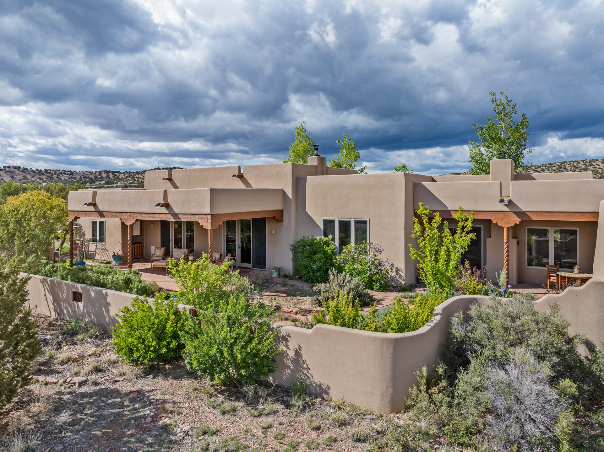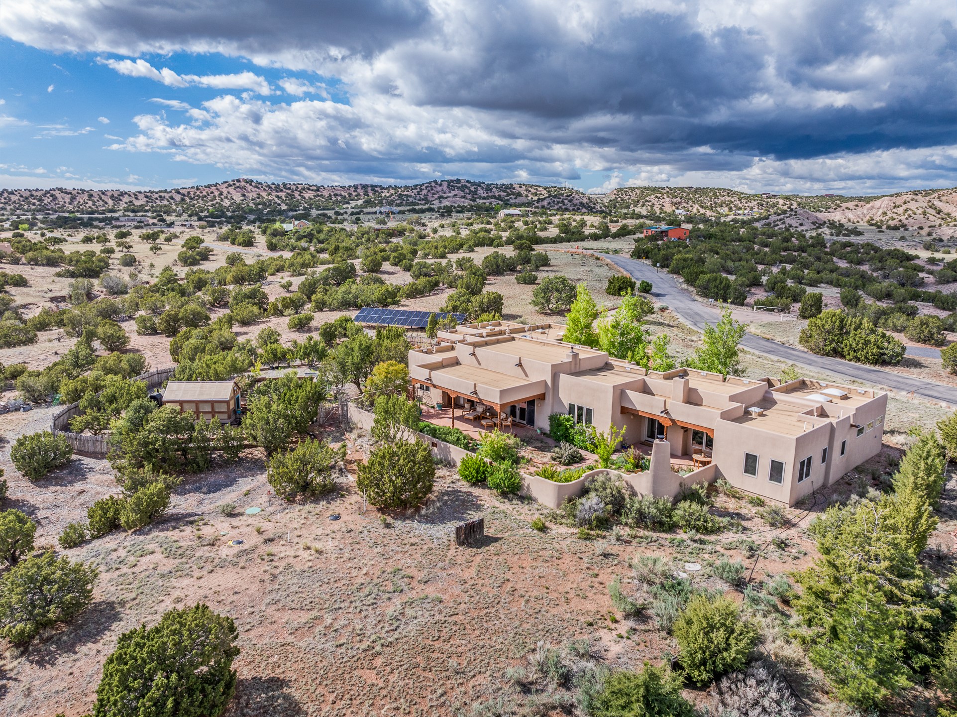Nestled atop a quiet 3.79-acre ridge in the exclusive Spirit Wind Ranch, 45 Cerro Alto is more than a home--it's a way of life. With 3,600 square feet of beautifully crafted Santa Fe-style architecture and sweeping views of the Galisteo Basin, this private haven blends sustainability, self-sufficiency, and serene luxury in perfect harmony. From the moment you enter the aspen-lined courtyard, you're greeted by nature's quiet abundance. Mature, fruit-bearing trees--apple, jujube, and peach--offer seasonal bounty, while young apricot, pear, and plum trees promise years of harvests. For the passionate gardener, an adobe-walled greenhouse sits beside raised beds with drip irrigation, all nurtured organically for nearly a decade. A 3,000-gallon underground rainwater collection system supports irrigation, ensuring both sustainability and simplicity. This is a retreat designed for mindful living. A 10 kW ground-mounted solar array (installed in 2017) powers the home, eliminating electric bills. A Regency Hearth Heater wood stove offers cozy, efficient warmth, reducing reliance on the propane-powered radiant floor system. Enjoy filtered instant hot water throughout, thanks to a whole-house circulation and RO system. Inside, Santa Fe's timeless character shines through hand-hewn vigas, tile and hardwood floors, and three fireplaces that warm both heart and home. The main residence features three bedrooms, a sun-filled library, and a generous primary suite with its own fireplace. A detached casita offers flexibility for guests, a studio, or a private retreat. Deep portals invite you outdoors--to relax in the shade, dine al fresco, or simply lose yourself in the golden light dancing across the landscape. Every corner of this property invites reflection, creation, and connection to the land. A spacious three-car garage with an attached workshop completes this remarkable offering--ready for your tools, hobbies, or dreams, with paved access, total privacy, and unmatched natural beauty.