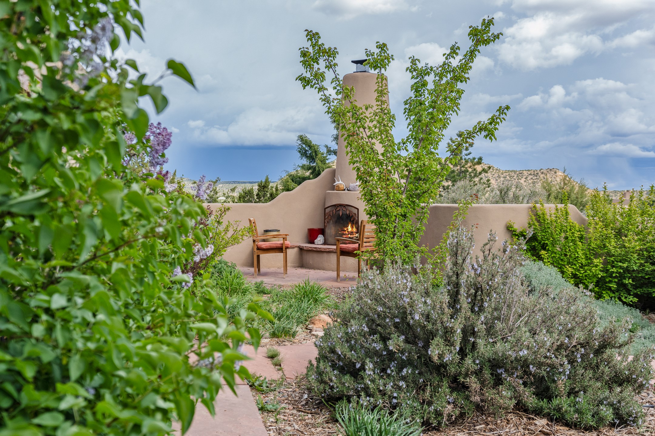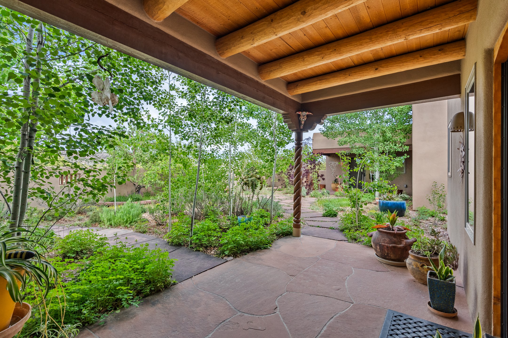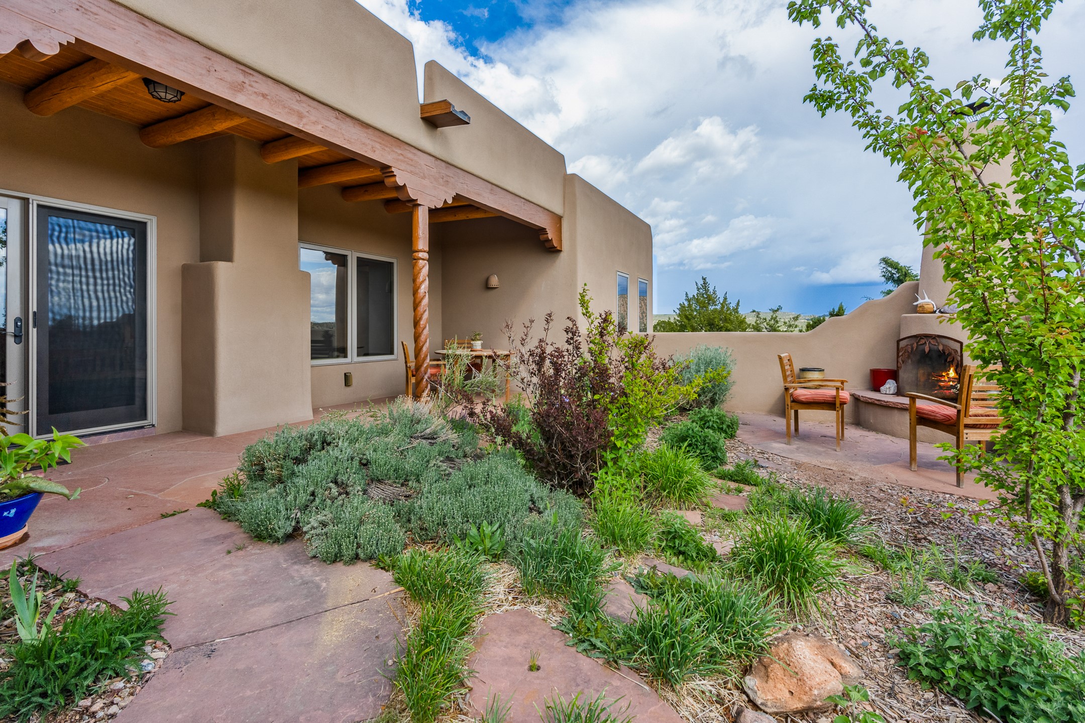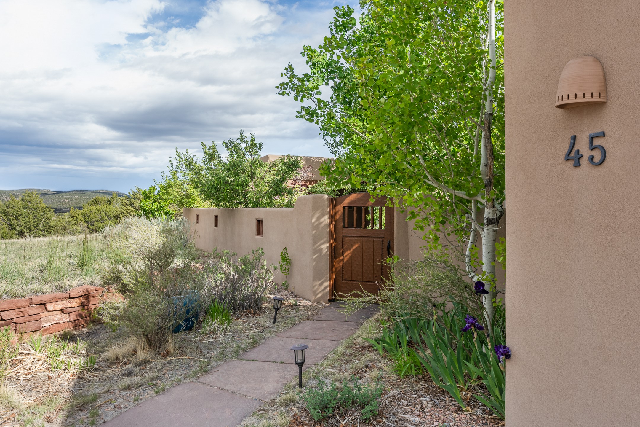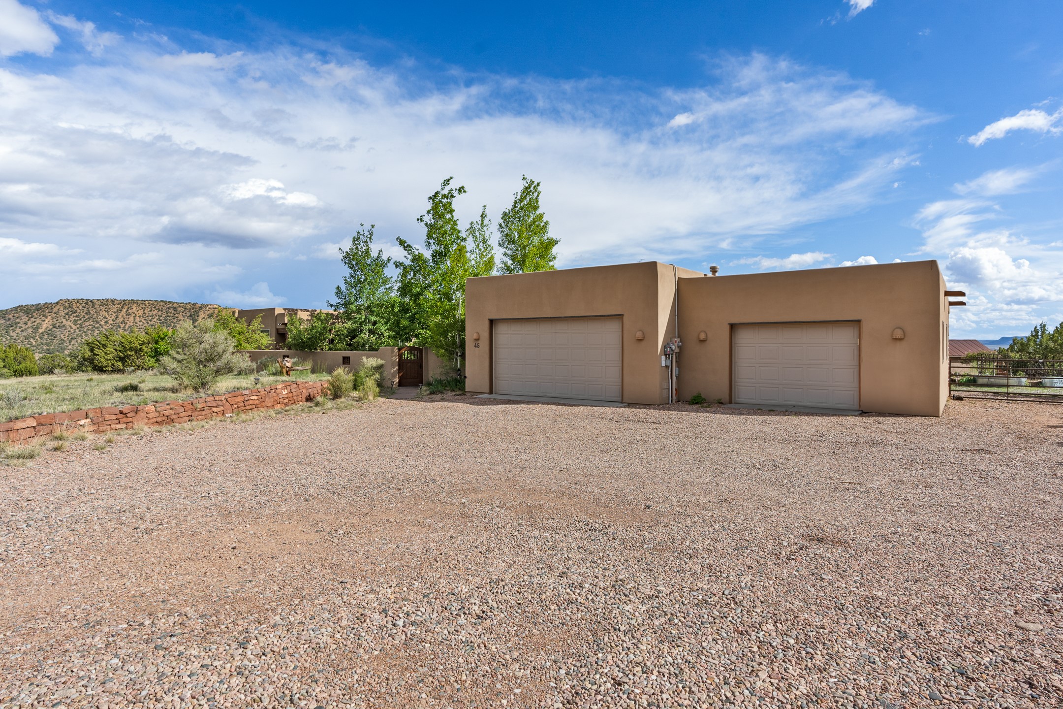 Nestled atop a quiet 3.79-acre ridge in the exclusive Spirit Wind Ranch, 45 Cerro Alto is more than a home--it's a way of life. With 3,600 square feet of beautifully crafted Santa Fe-style architecture and sweeping views of the Galisteo Basin, this private haven blends sustainability, self-sufficiency, and serene luxury in perfect harmony. From the moment you enter the aspen-lined courtyard, you're greeted by nature's quiet abundance. Mature, fruit-bearing trees--apple, jujube, and peach--offer seasonal bounty, while young apricot, pear, and plum trees promise years of harvests. For the passionate gardener, an adobe-walled greenhouse sits beside raised beds with drip irrigation, all nurtured organically for nearly a decade. A 3,000-gallon underground rainwater collection system supports irrigation, ensuring both sustainability and simplicity. This is a retreat designed for mindful living. A 10 kW ground-mounted solar array (installed in 2017) powers the home, eliminating electric bills. A Regency Hearth Heater wood stove offers cozy, efficient warmth, reducing reliance on the propane-powered radiant floor system. Enjoy filtered instant hot water throughout, thanks to a whole-house circulation and RO system. Inside, Santa Fe's timeless character shines through hand-hewn vigas, tile and hardwood floors, and three fireplaces that warm both heart and home. The main residence features three bedrooms, a sun-filled library, and a generous primary suite with its own fireplace. A detached casita offers flexibility for guests, a studio, or a private retreat. Deep portals invite you outdoors--to relax in the shade, dine al fresco, or simply lose yourself in the golden light dancing across the landscape. Every corner of this property invites reflection, creation, and connection to the land. A spacious three-car garage with an attached workshop completes this remarkable offering--ready for your tools, hobbies, or dreams, with paved access, total privacy, and unmatched natural beauty.