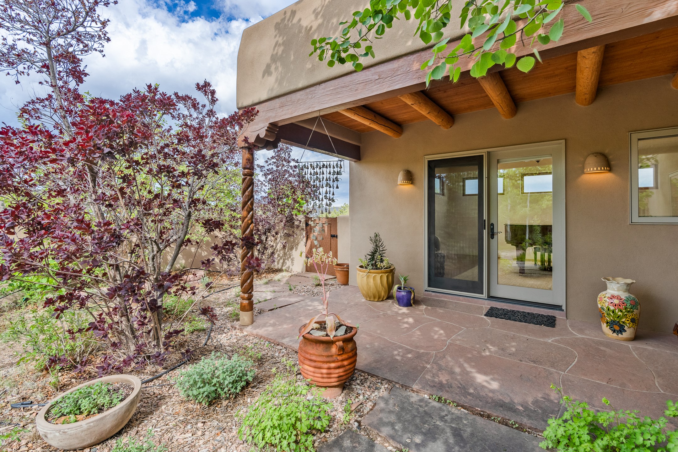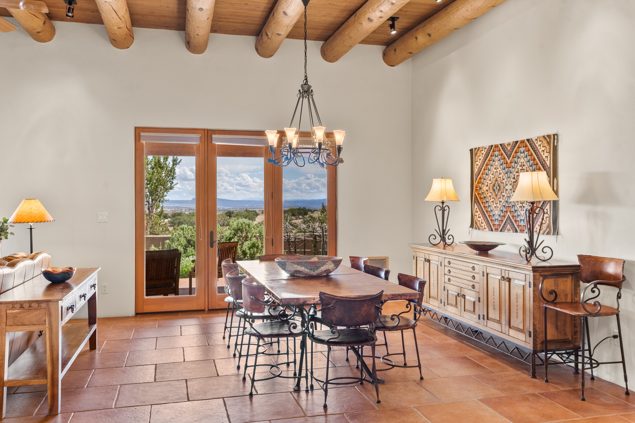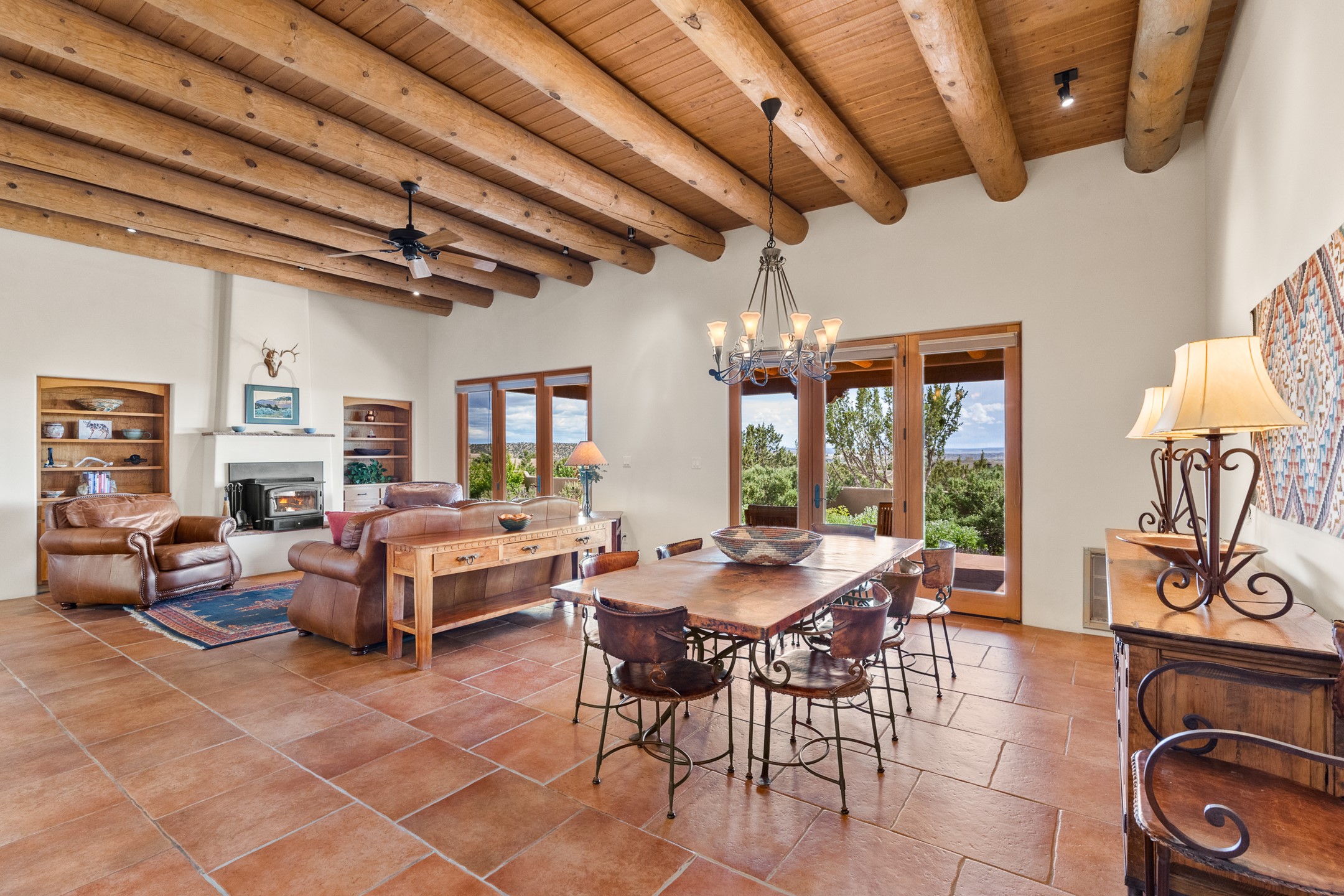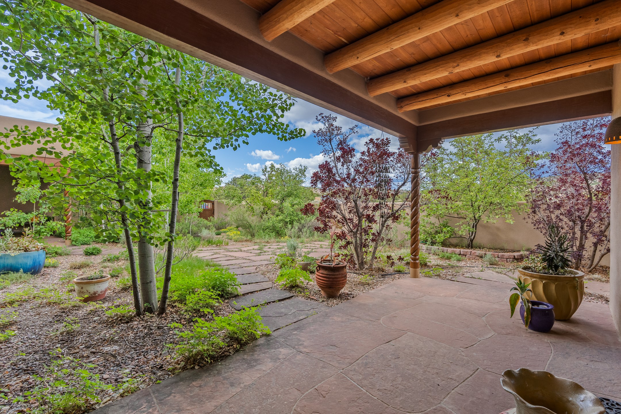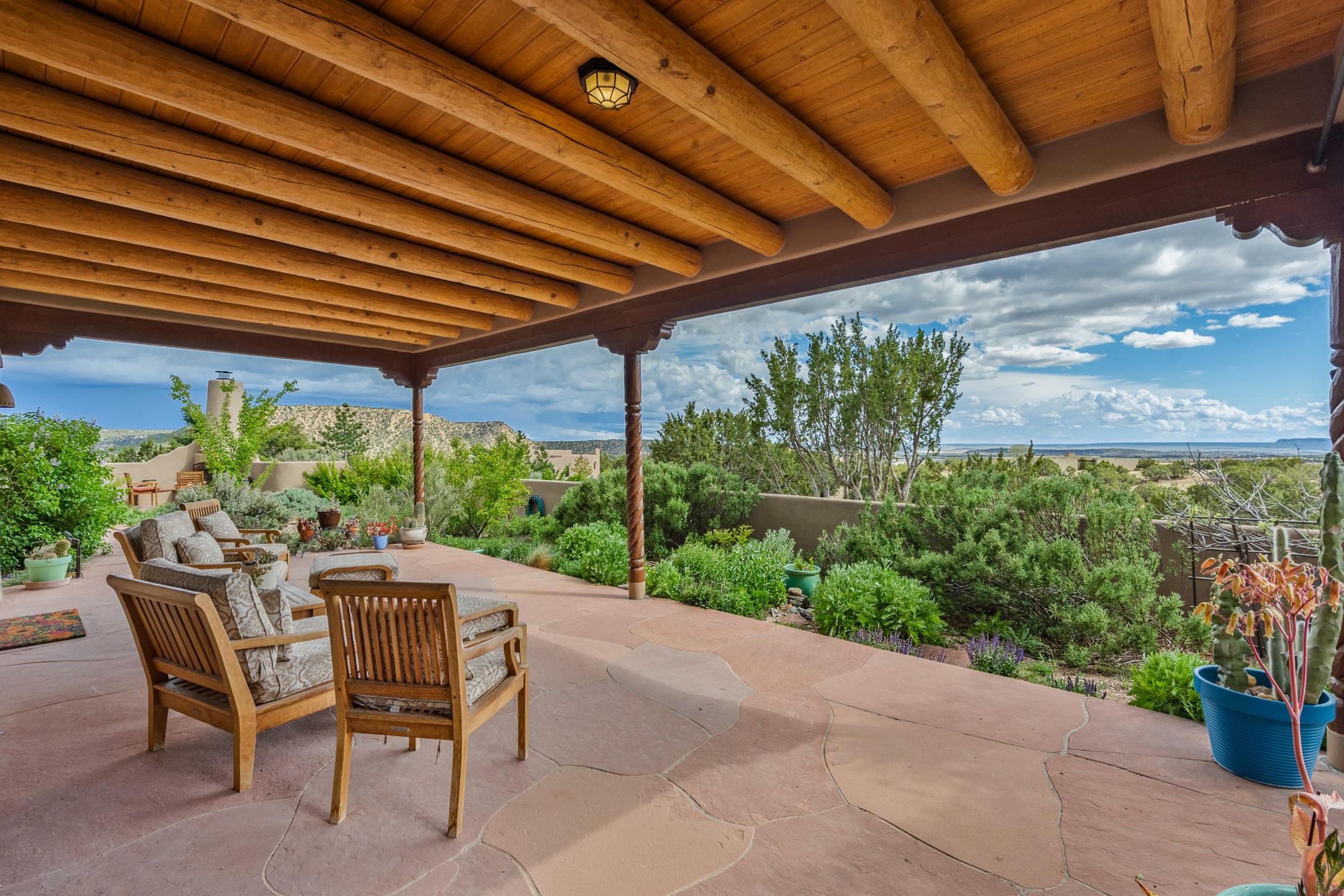 Nestled atop a quiet 3.79-acre ridge in the exclusive Spirit Wind Ranch, 45 Cerro Alto is more than a home--it's a way of life. With 3,600 square feet of beautifully crafted Santa Fe-style architecture and sweeping views of the Galisteo Basin, this private haven blends sustainability, self-sufficiency, and serene luxury in perfect harmony. From the moment you enter the aspen-lined courtyard, you're greeted by nature's quiet abundance. Mature, fruit-bearing trees--apple, jujube, and peach--offer seasonal bounty, while young apricot, pear, and plum trees promise years of harvests. For the passionate gardener, an adobe-walled greenhouse sits beside raised beds with drip irrigation, all nurtured organically for nearly a decade. A 3,000-gallon underground rainwater collection system supports irrigation, ensuring both sustainability and simplicity. This is a retreat designed for mindful living. A 10 kW ground-mounted solar array (installed in 2017) powers the home, eliminating electric bills. A Regency Hearth Heater wood stove offers cozy, efficient warmth, reducing reliance on the propane-powered radiant floor system. Enjoy filtered instant hot water throughout, thanks to a whole-house circulation and RO system. Inside, Santa Fe's timeless character shines through hand-hewn vigas, tile and hardwood floors, and three fireplaces that warm both heart and home. The main residence features three bedrooms, a sun-filled library, and a generous primary suite with its own fireplace. A detached casita offers flexibility for guests, a studio, or a private retreat. Deep portals invite you outdoors--to relax in the shade, dine al fresco, or simply lose yourself in the golden light dancing across the landscape. Every corner of this property invites reflection, creation, and connection to the land. A spacious three-car garage with an attached workshop completes this remarkable offering--ready for your tools, hobbies, or dreams, with paved access, total privacy, and unmatched natural beauty.