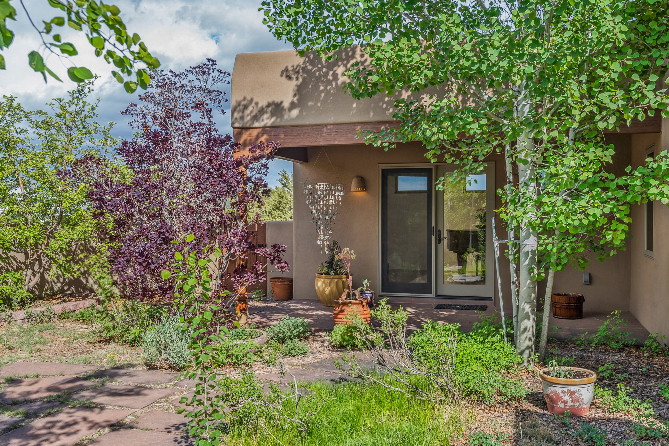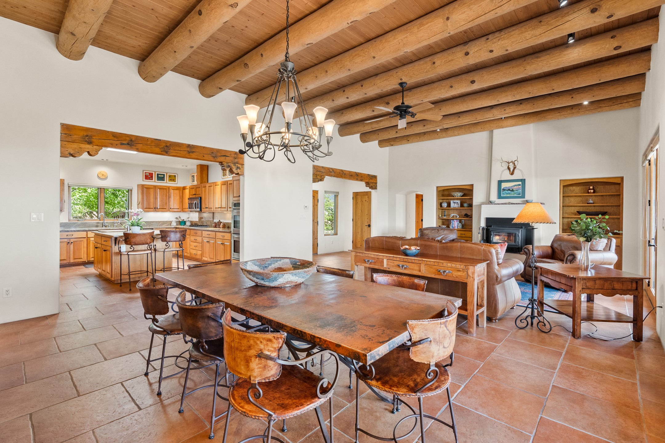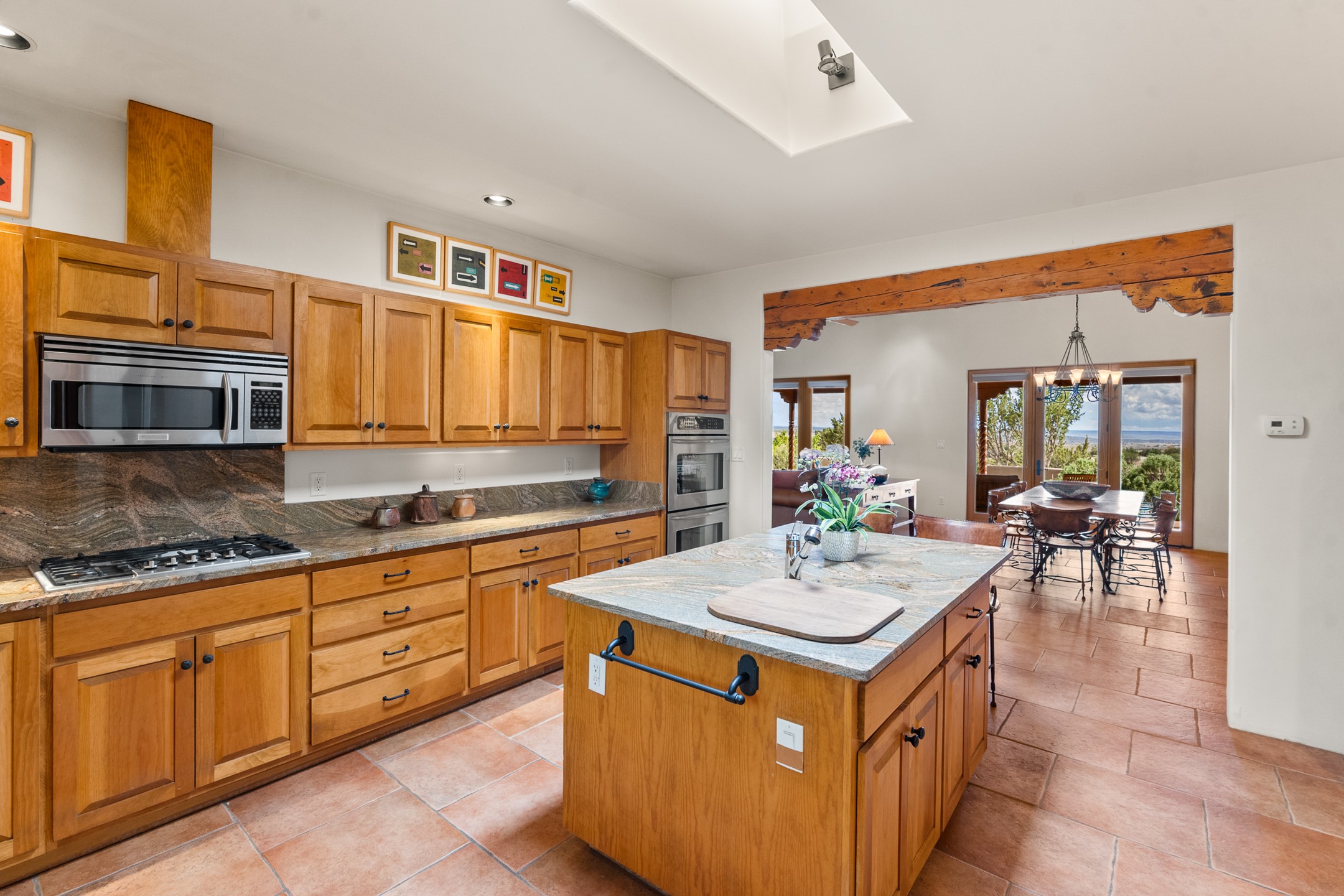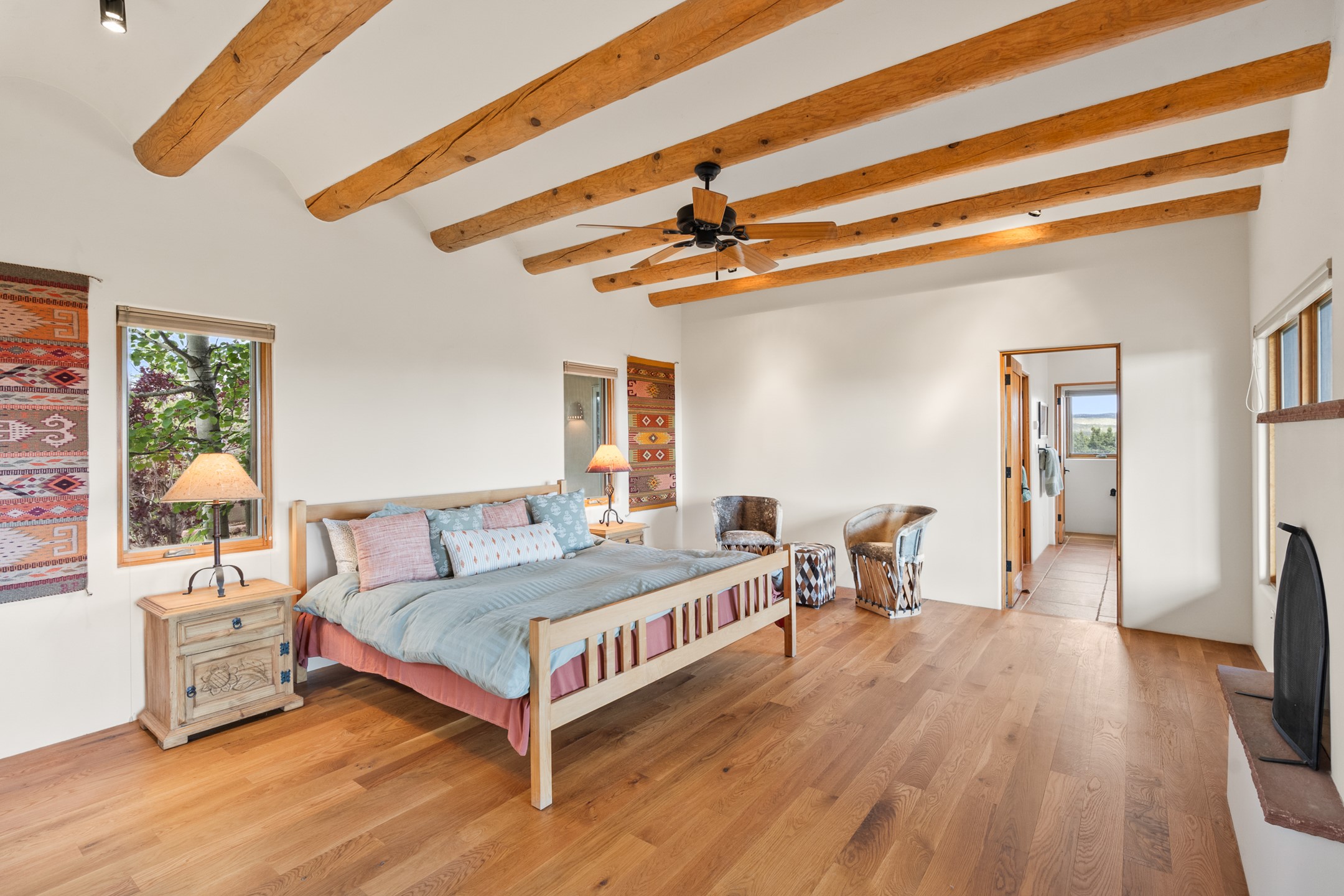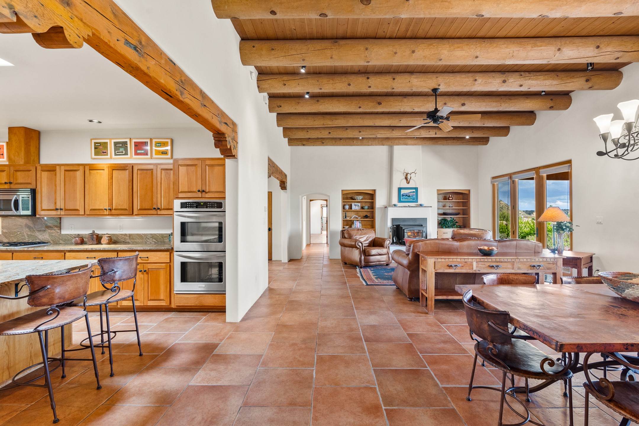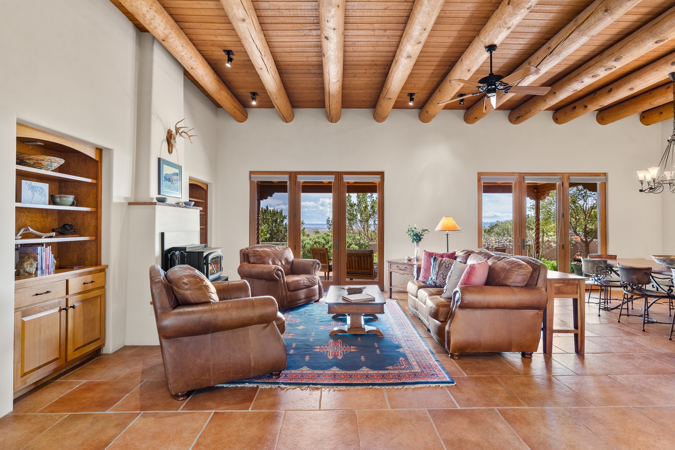 Nestled atop a quiet 3.79-acre ridge in the exclusive Spirit Wind Ranch, 45 Cerro Alto is more than a home--it's a way of life. With 3,600 square feet of beautifully crafted Santa Fe-style architecture and sweeping views of the Galisteo Basin, this private haven blends sustainability, self-sufficiency, and serene luxury in perfect harmony. From the moment you enter the aspen-lined courtyard, you're greeted by nature's quiet abundance. Mature, fruit-bearing trees--apple, jujube, and peach--offer seasonal bounty, while young apricot, pear, and plum trees promise years of harvests. For the passionate gardener, an adobe-walled greenhouse sits beside raised beds with drip irrigation, all nurtured organically for nearly a decade. A 3,000-gallon underground rainwater collection system supports irrigation, ensuring both sustainability and simplicity. This is a retreat designed for mindful living. A 10 kW ground-mounted solar array (installed in 2017) powers the home, eliminating electric bills. A Regency Hearth Heater wood stove offers cozy, efficient warmth, reducing reliance on the propane-powered radiant floor system. Enjoy filtered instant hot water throughout, thanks to a whole-house circulation and RO system. Inside, Santa Fe's timeless character shines through hand-hewn vigas, tile and hardwood floors, and three fireplaces that warm both heart and home. The main residence features three bedrooms, a sun-filled library, and a generous primary suite with its own fireplace. A detached casita offers flexibility for guests, a studio, or a private retreat. Deep portals invite you outdoors--to relax in the shade, dine al fresco, or simply lose yourself in the golden light dancing across the landscape. Every corner of this property invites reflection, creation, and connection to the land. A spacious three-car garage with an attached workshop completes this remarkable offering--ready for your tools, hobbies, or dreams, with paved access, total privacy, and unmatched natural beauty.