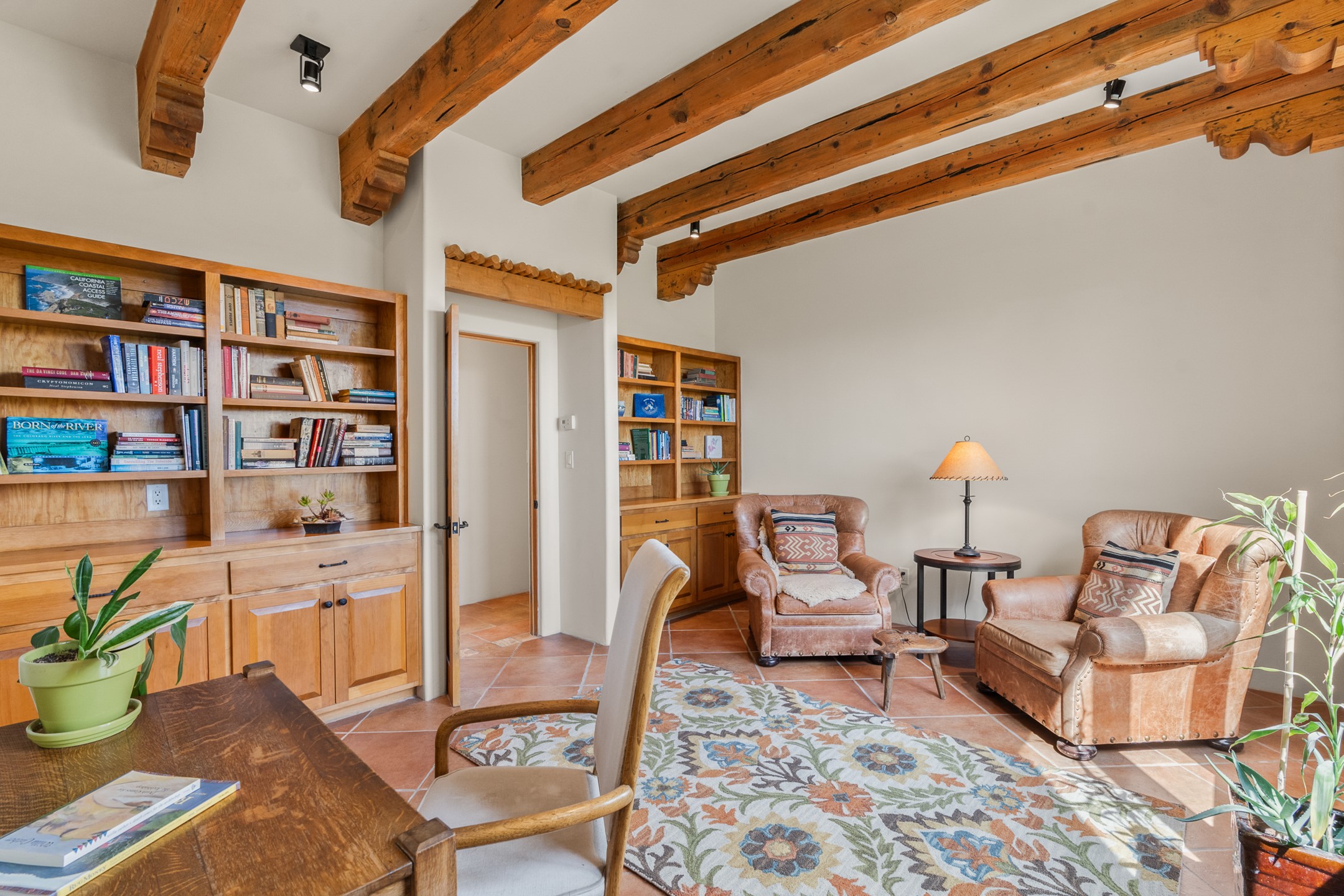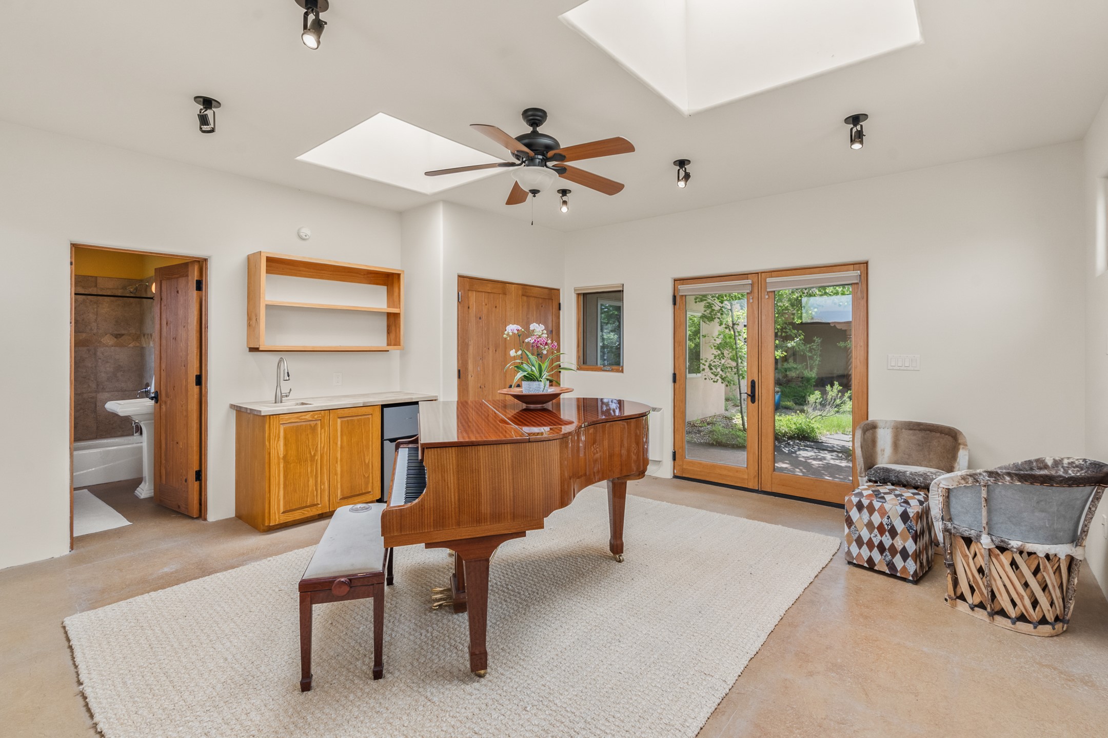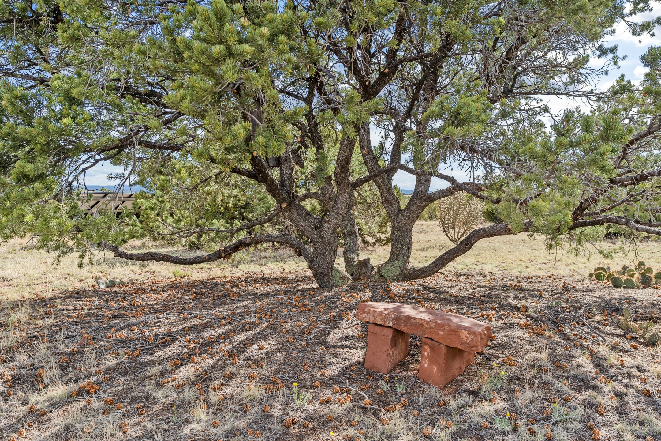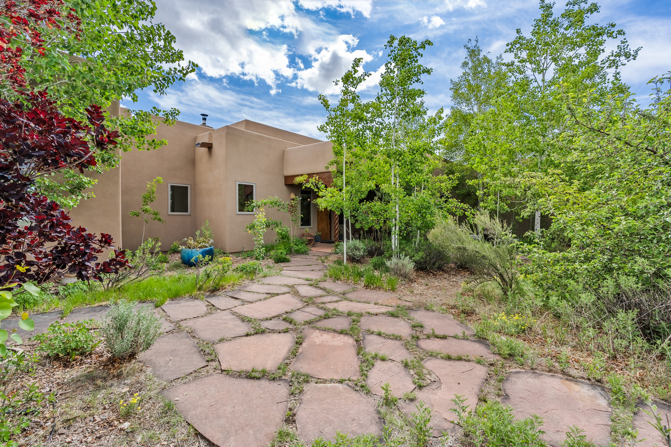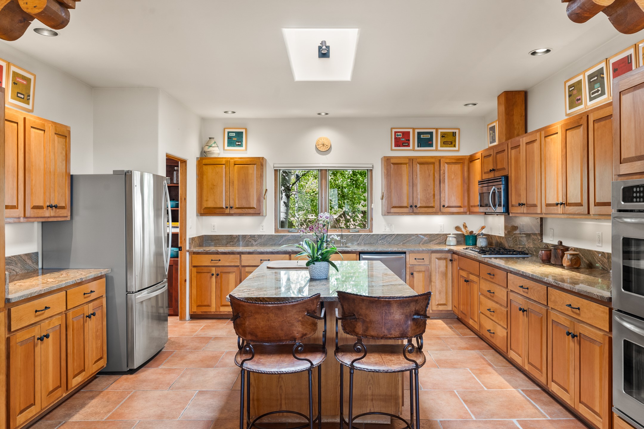 Nestled atop a quiet 3.79-acre ridge in the exclusive Spirit Wind Ranch, 45 Cerro Alto is more than a home--it's a way of life. With 3,600 square feet of beautifully crafted Santa Fe-style architecture and sweeping views of the Galisteo Basin, this private haven blends sustainability, self-sufficiency, and serene luxury in perfect harmony. From the moment you enter the aspen-lined courtyard, you're greeted by nature's quiet abundance. Mature, fruit-bearing trees--apple, jujube, and peach--offer seasonal bounty, while young apricot, pear, and plum trees promise years of harvests. For the passionate gardener, an adobe-walled greenhouse sits beside raised beds with drip irrigation, all nurtured organically for nearly a decade. A 3,000-gallon underground rainwater collection system supports irrigation, ensuring both sustainability and simplicity. This is a retreat designed for mindful living. A 10 kW ground-mounted solar array (installed in 2017) powers the home, eliminating electric bills. A Regency Hearth Heater wood stove offers cozy, efficient warmth, reducing reliance on the propane-powered radiant floor system. Enjoy filtered instant hot water throughout, thanks to a whole-house circulation and RO system. Inside, Santa Fe's timeless character shines through hand-hewn vigas, tile and hardwood floors, and three fireplaces that warm both heart and home. The main residence features three bedrooms, a sun-filled library, and a generous primary suite with its own fireplace. A detached casita offers flexibility for guests, a studio, or a private retreat. Deep portals invite you outdoors--to relax in the shade, dine al fresco, or simply lose yourself in the golden light dancing across the landscape. Every corner of this property invites reflection, creation, and connection to the land. A spacious three-car garage with an attached workshop completes this remarkable offering--ready for your tools, hobbies, or dreams, with paved access, total privacy, and unmatched natural beauty.