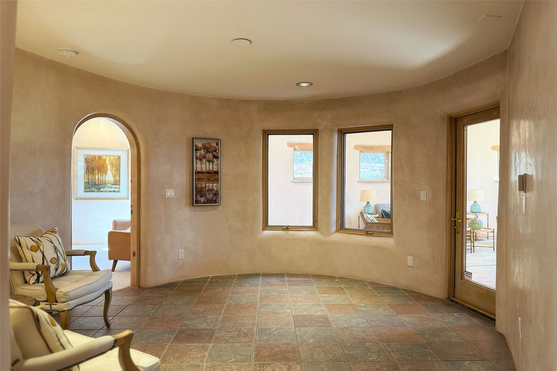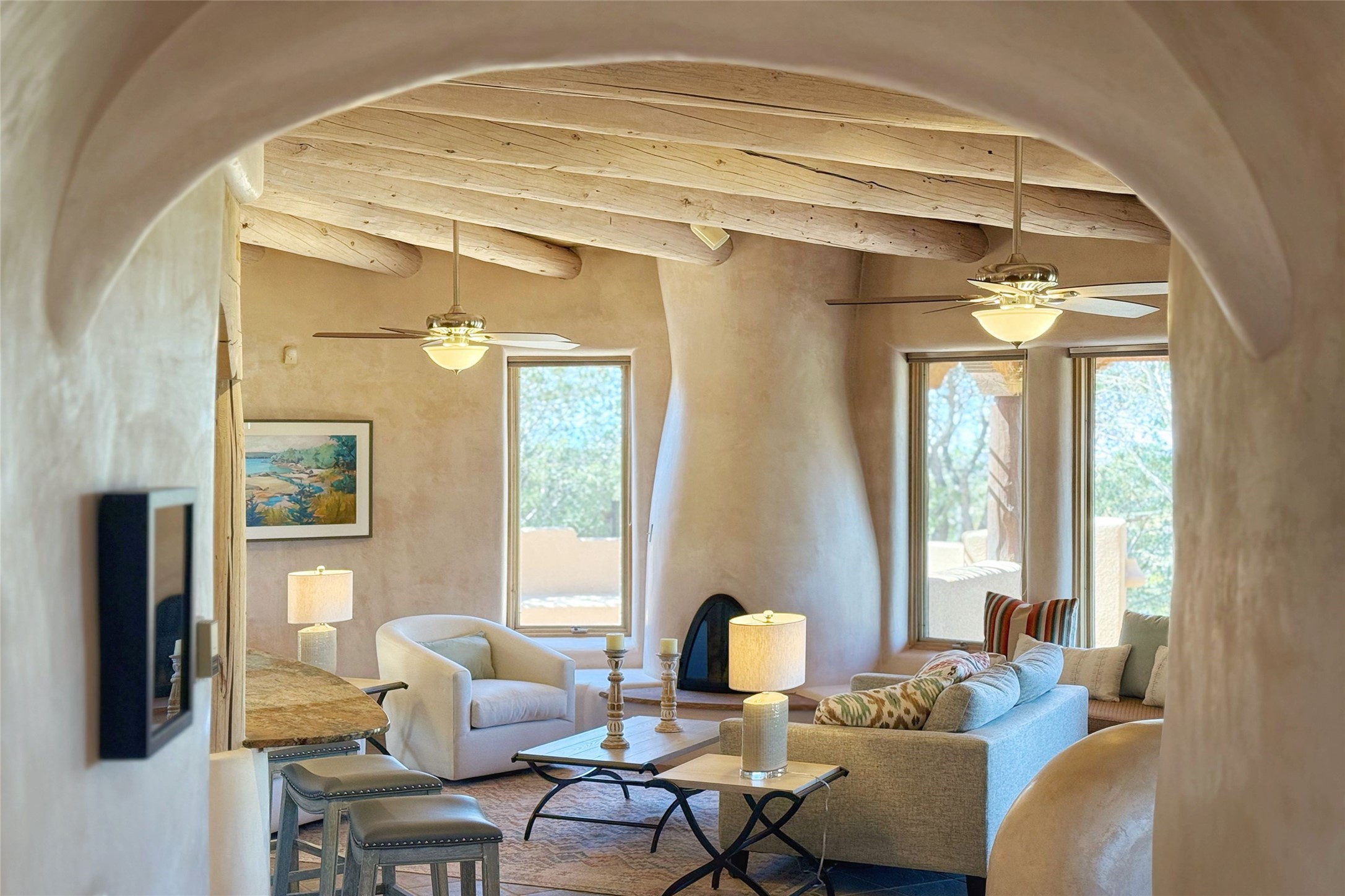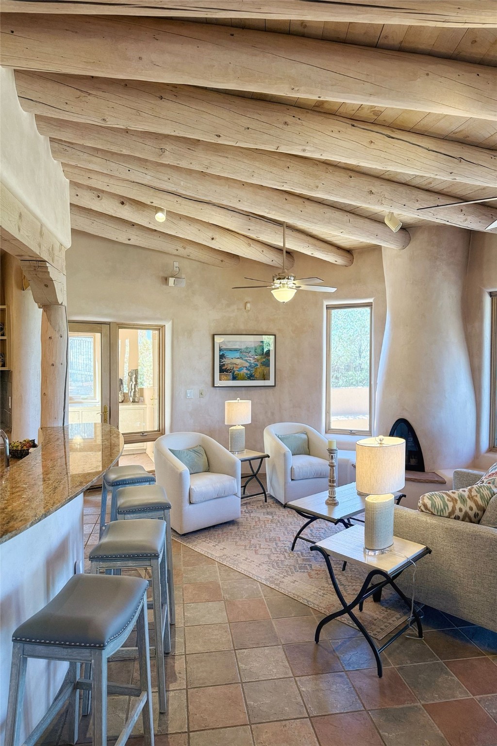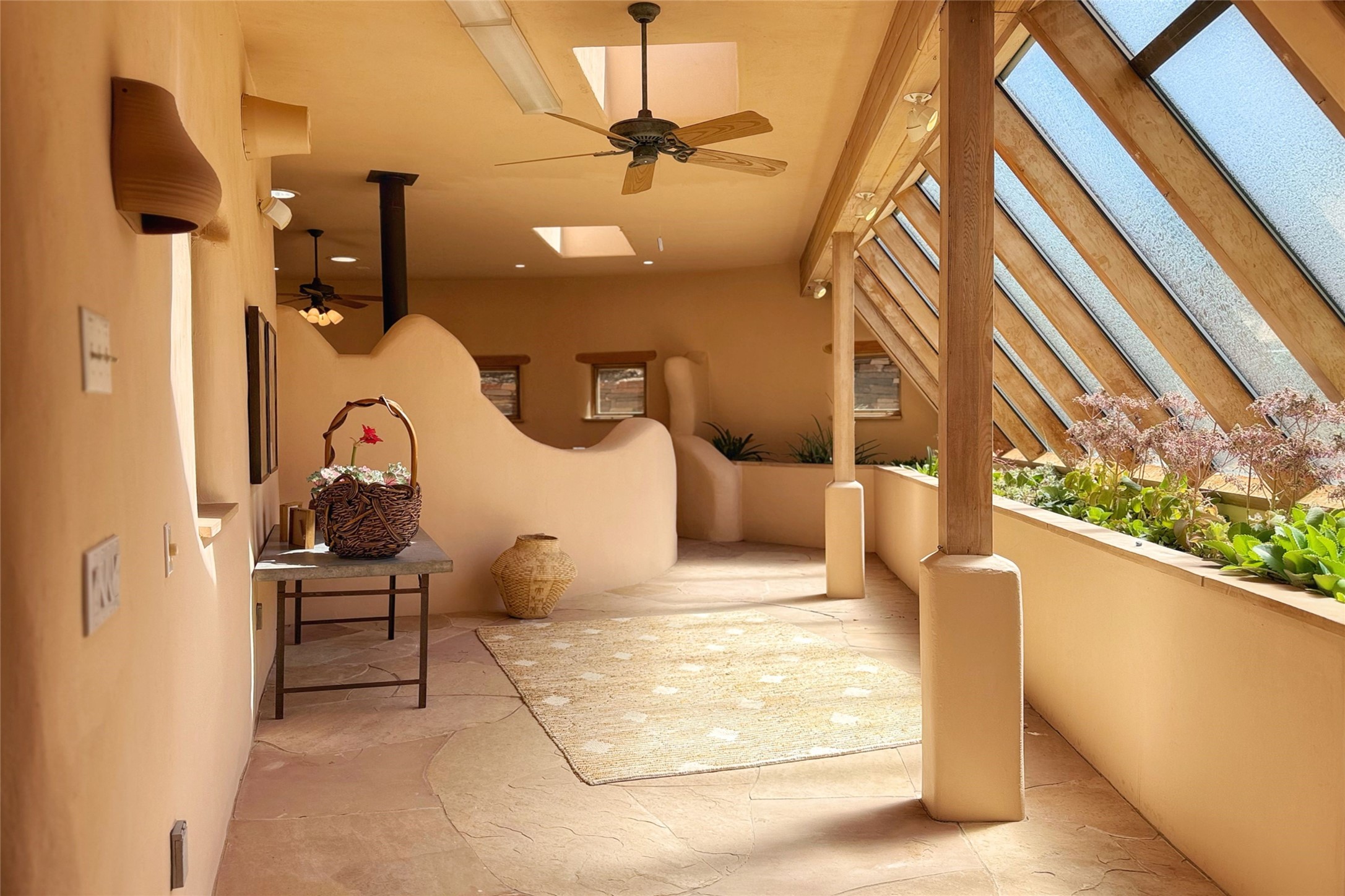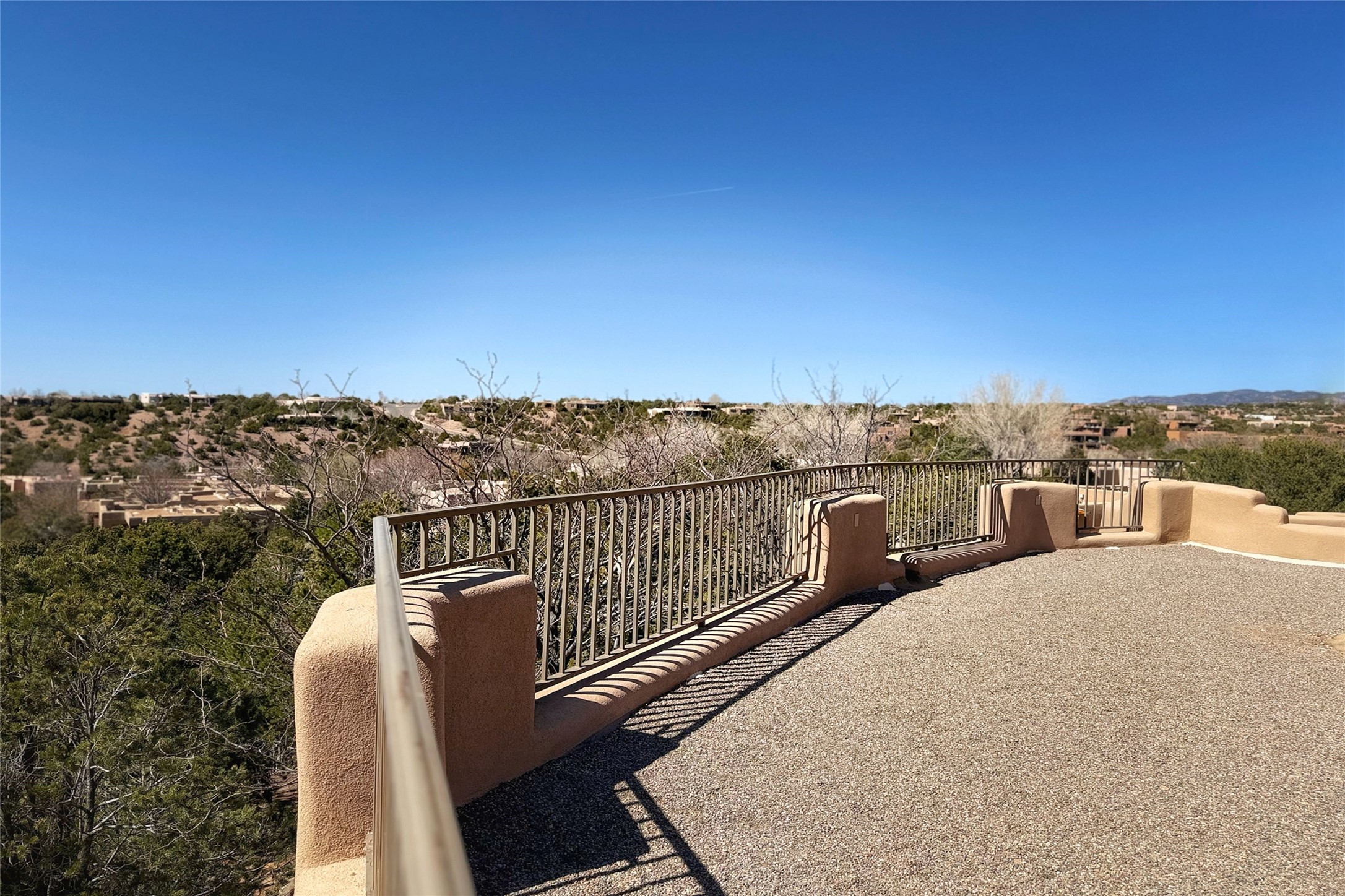 Stunning custom home with circular floor plan, archways and designer touches throughout. The spacious kitchen includes granite countertops, bar seating, walk-in butler's pantry and two new gas ranges. The light filled living area features a gas fireplace and large windows, with adjoining dining room. The primary suite offers a private retreat with a sitting room, soaking tub, bidet, and walk-in shower along with massive closet with built in storage. The best part is the massive sunroom with flagstone floors and a gas fireplace. A plant-lover's dream. Just two minutes to the plaza, yet surrounded by pion, the terraced outdoor landscaping offers nature and seclusion. While the large shaded portal boasts banco seating. Plus a rooftop terrace provides 360 views. Additional highlights include radiant floor heating, a bonus studio/home gym, a Murphy bed in the media roomLocated near walking paths, parks, dining, shops and world renowned galleries, this home combines comfort, style, and convenience. Don't miss this one-of-a-kind property!