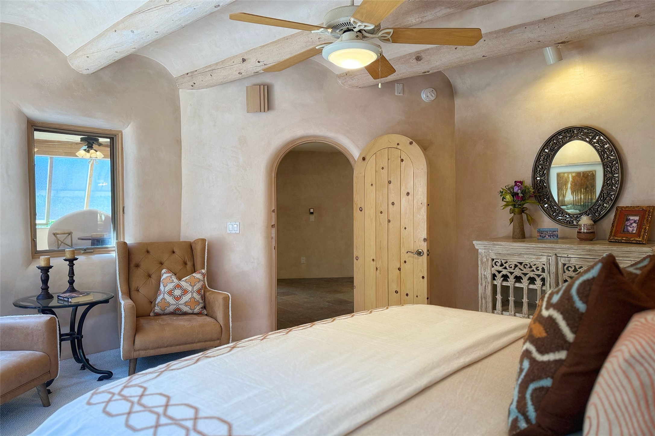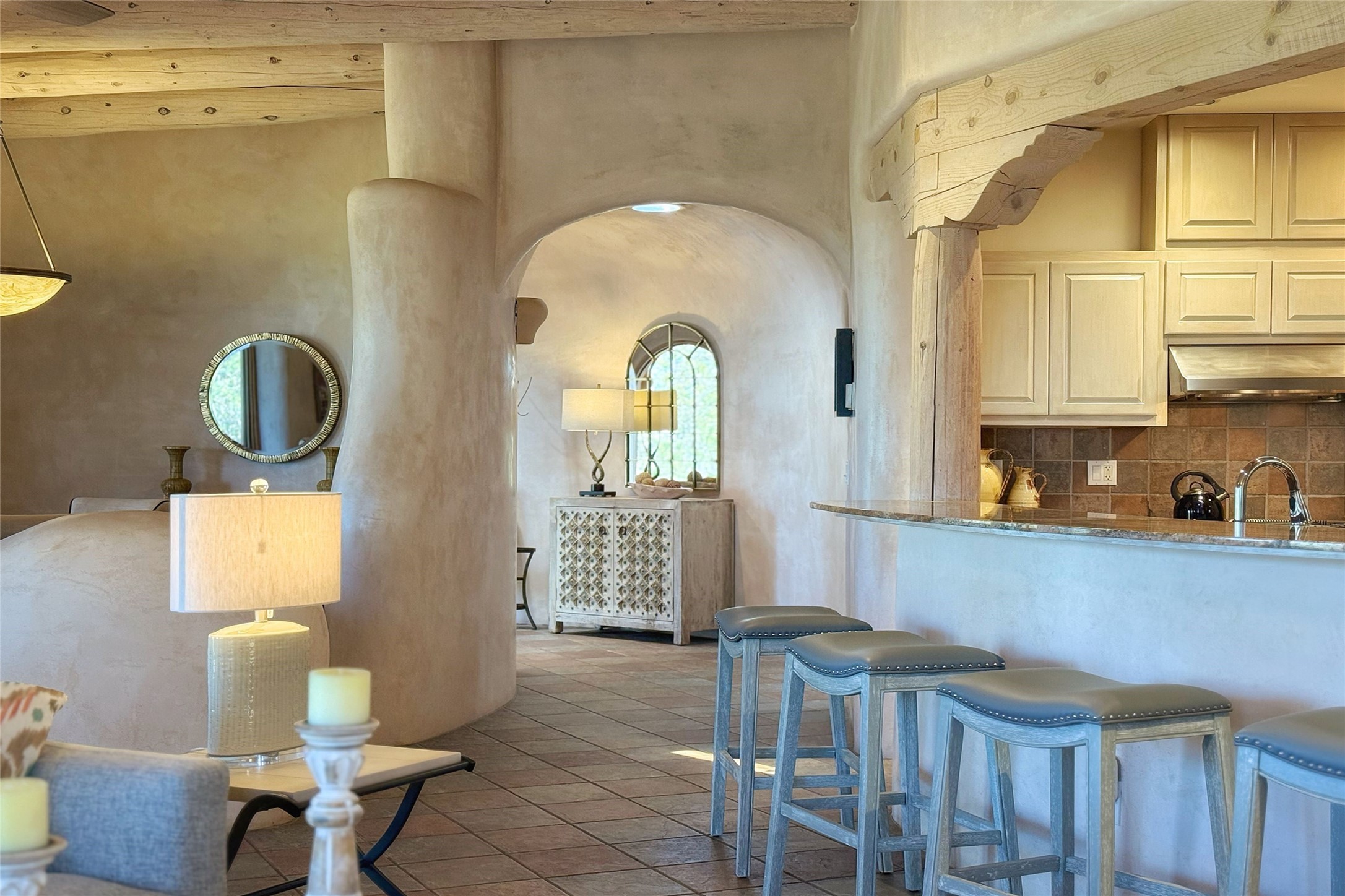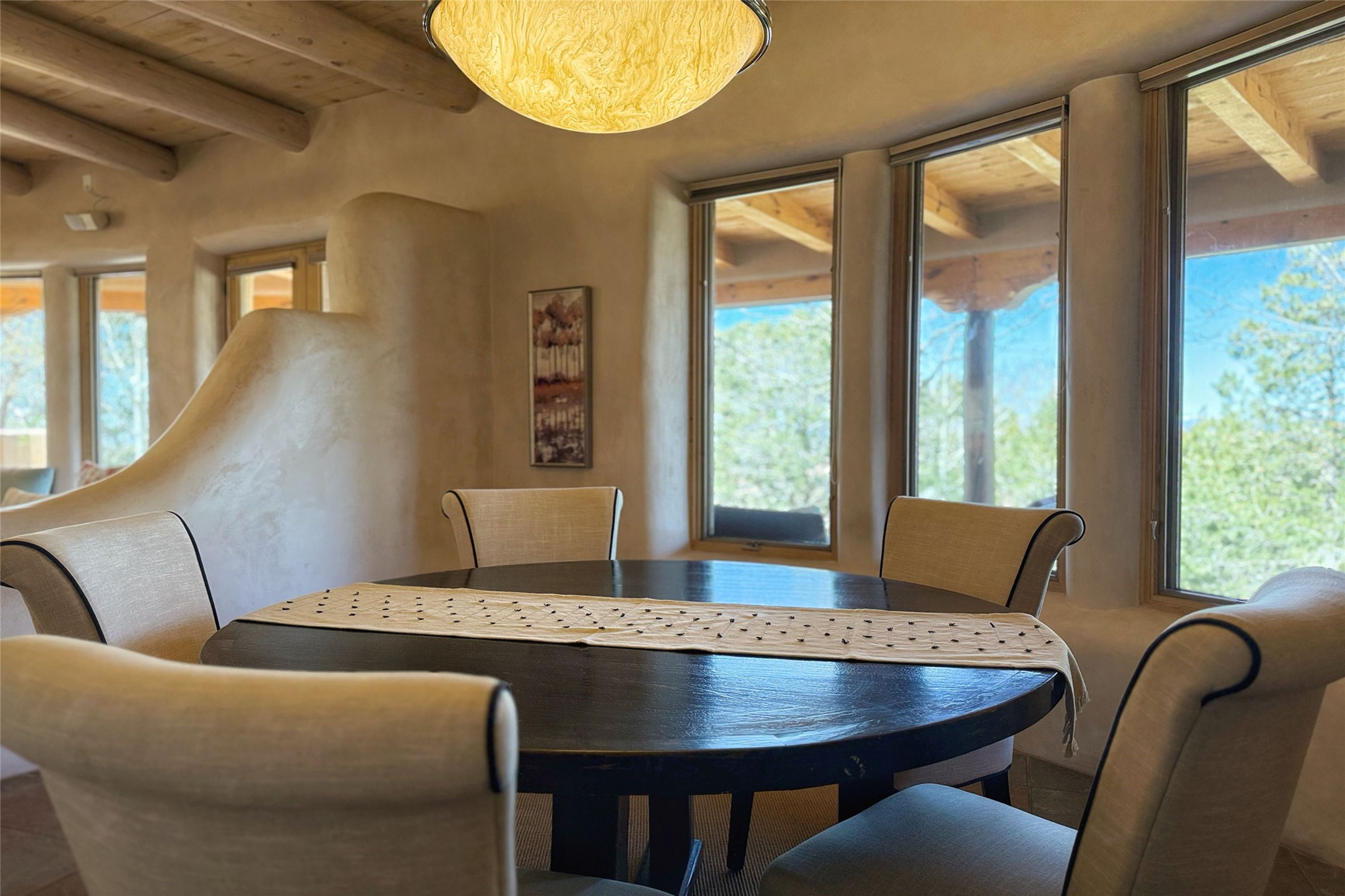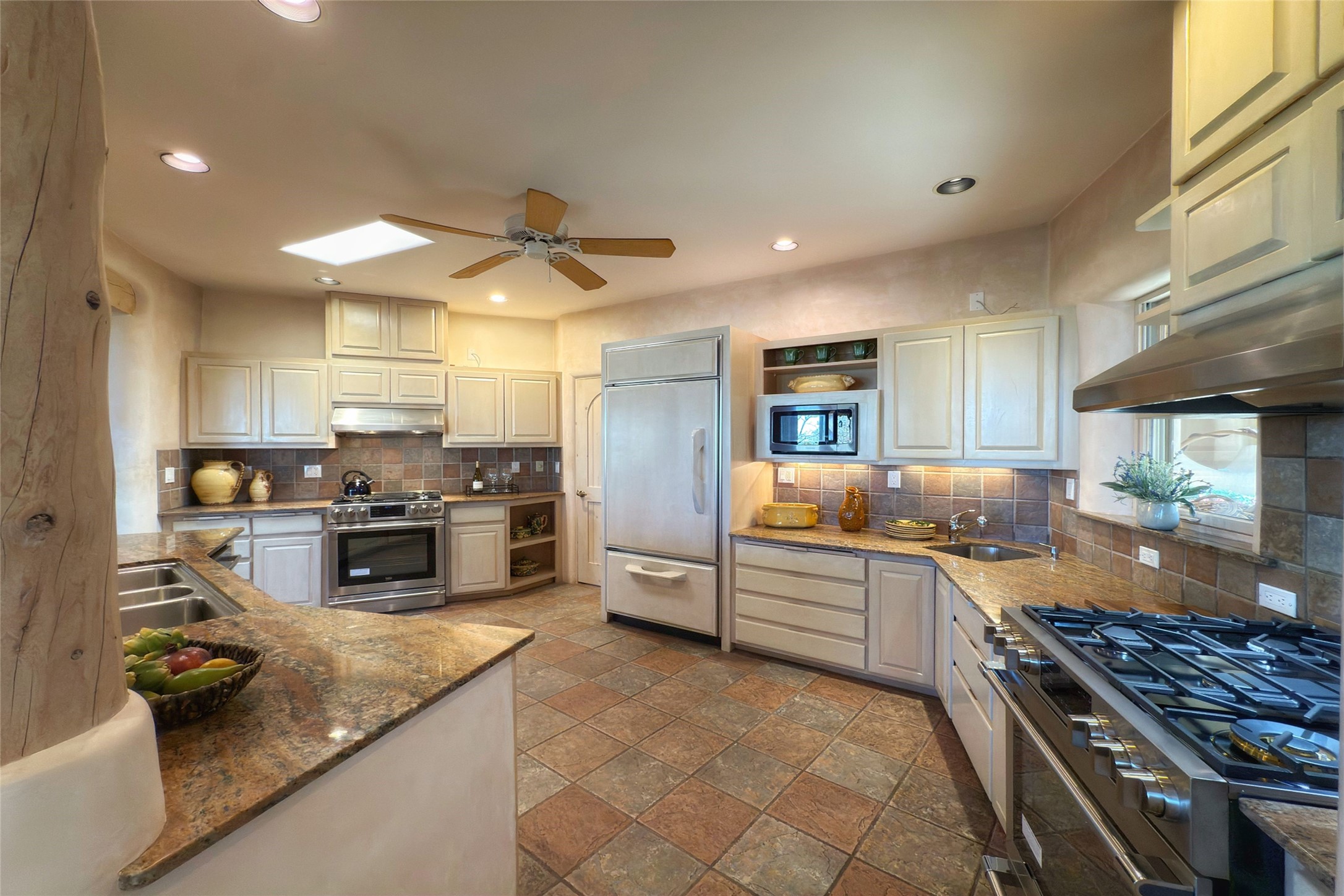 Stunning custom home with circular floor plan, archways and designer touches throughout. The spacious kitchen includes granite countertops, bar seating, walk-in butler's pantry and two new gas ranges. The light filled living area features a gas fireplace and large windows, with adjoining dining room. The primary suite offers a private retreat with a sitting room, soaking tub, bidet, and walk-in shower along with massive closet with built in storage. The best part is the massive sunroom with flagstone floors and a gas fireplace. A plant-lover's dream. Just two minutes to the plaza, yet surrounded by pion, the terraced outdoor landscaping offers nature and seclusion. While the large shaded portal boasts banco seating. Plus a rooftop terrace provides 360 views. Additional highlights include radiant floor heating, a bonus studio/home gym, a Murphy bed in the media roomLocated near walking paths, parks, dining, shops and world renowned galleries, this home combines comfort, style, and convenience. Don't miss this one-of-a-kind property!