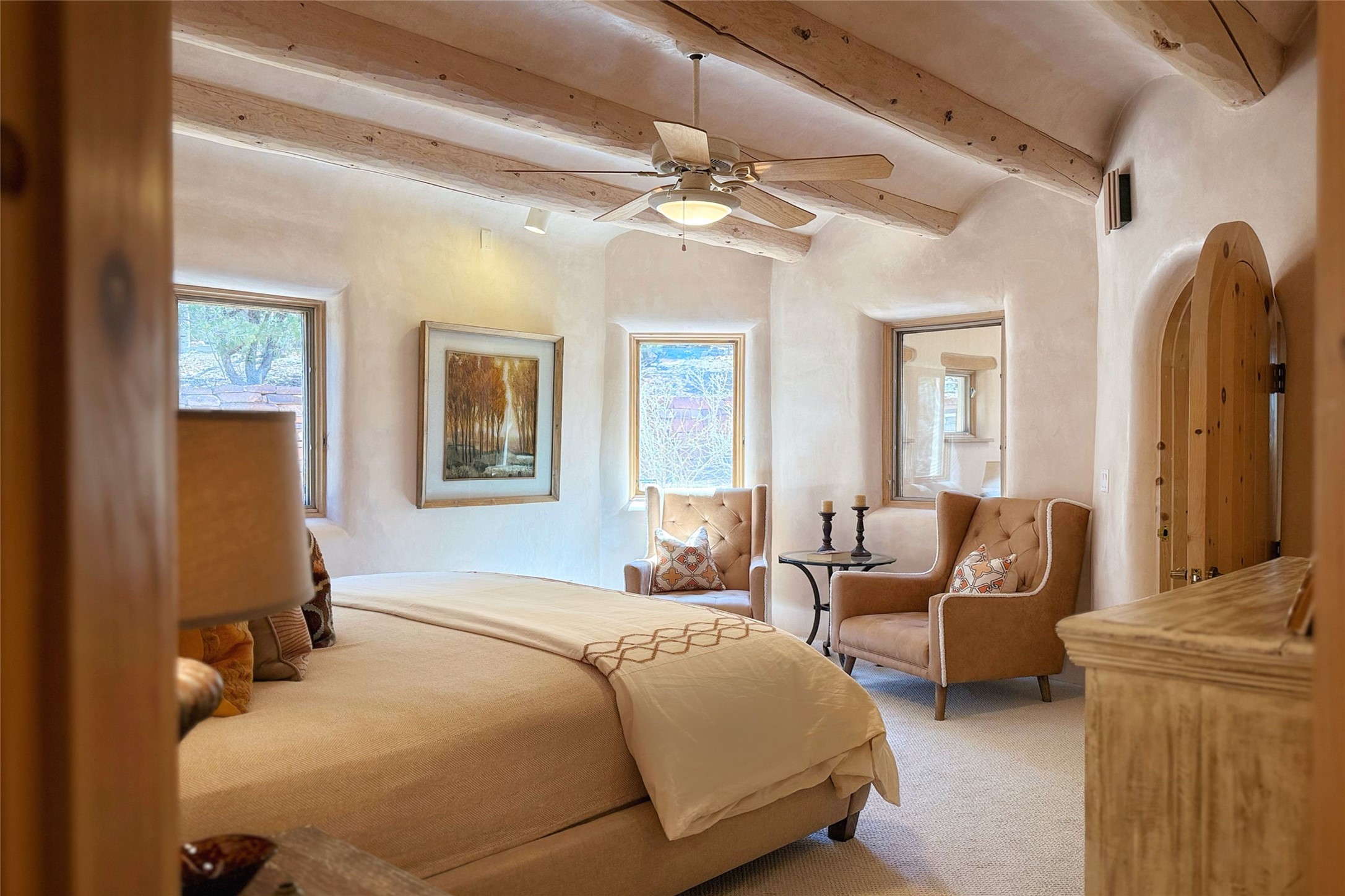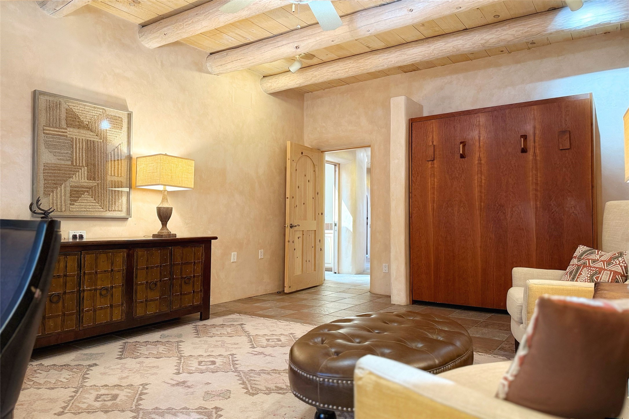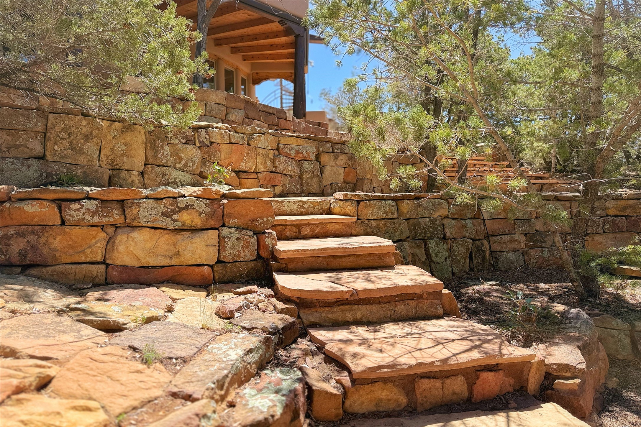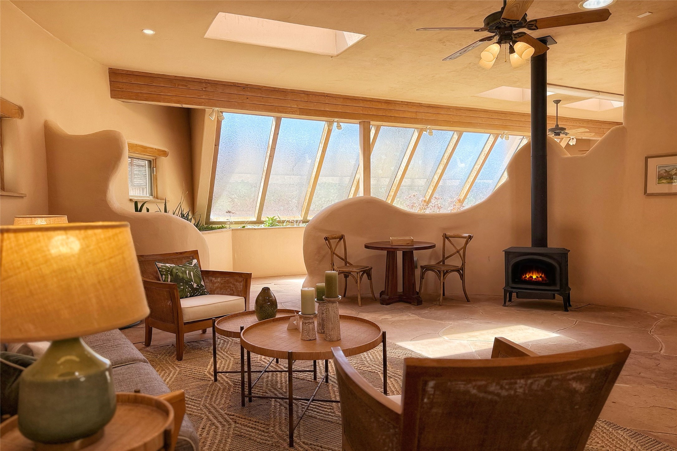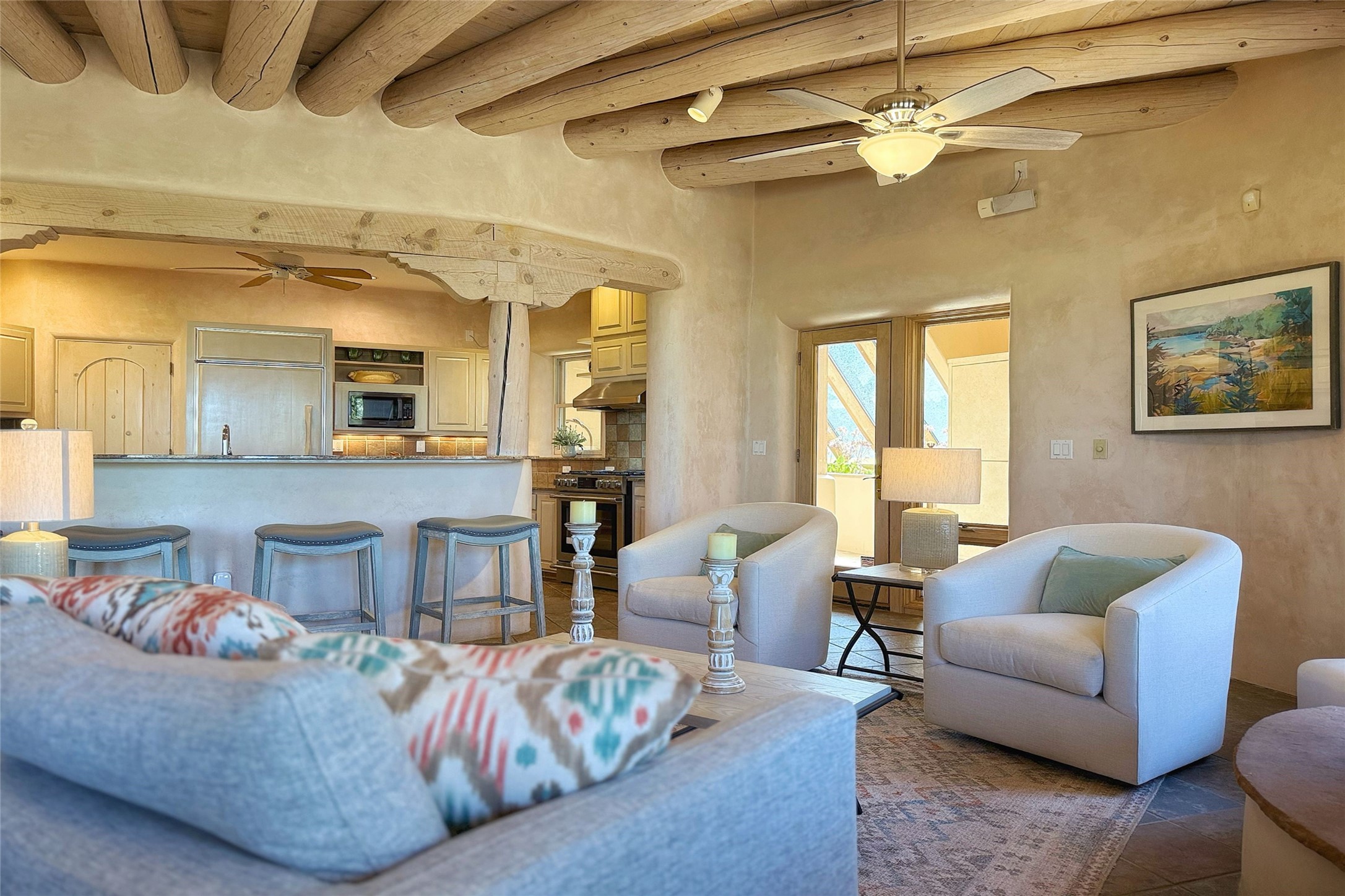 Stunning custom home with circular floor plan, archways and designer touches throughout. The spacious kitchen includes granite countertops, bar seating, walk-in butler's pantry and two new gas ranges. The light filled living area features a gas fireplace and large windows, with adjoining dining room. The primary suite offers a private retreat with a sitting room, soaking tub, bidet, and walk-in shower along with massive closet with built in storage. The best part is the massive sunroom with flagstone floors and a gas fireplace. A plant-lover's dream. Just two minutes to the plaza, yet surrounded by pion, the terraced outdoor landscaping offers nature and seclusion. While the large shaded portal boasts banco seating. Plus a rooftop terrace provides 360 views. Additional highlights include radiant floor heating, a bonus studio/home gym, a Murphy bed in the media roomLocated near walking paths, parks, dining, shops and world renowned galleries, this home combines comfort, style, and convenience. Don't miss this one-of-a-kind property!