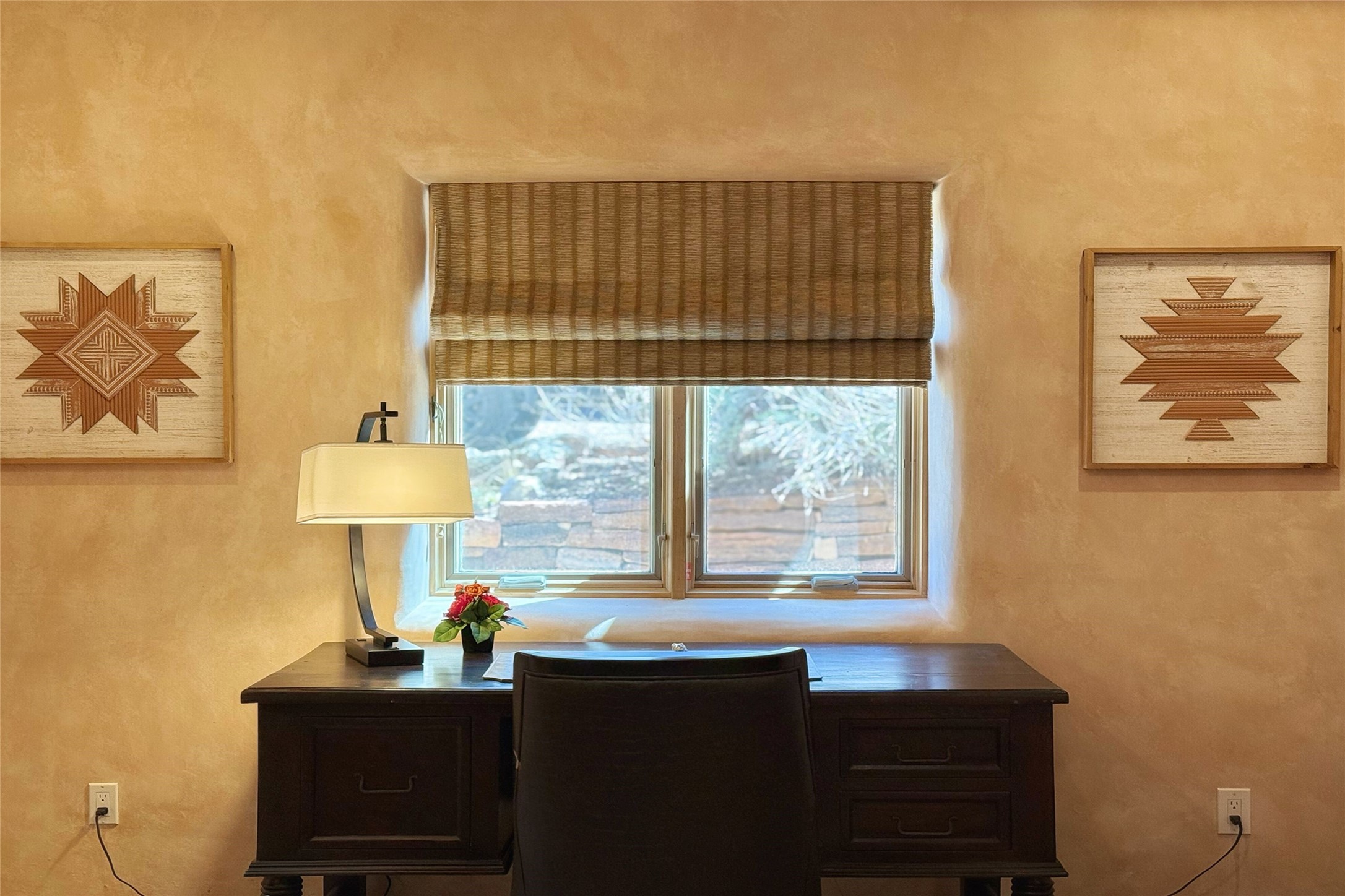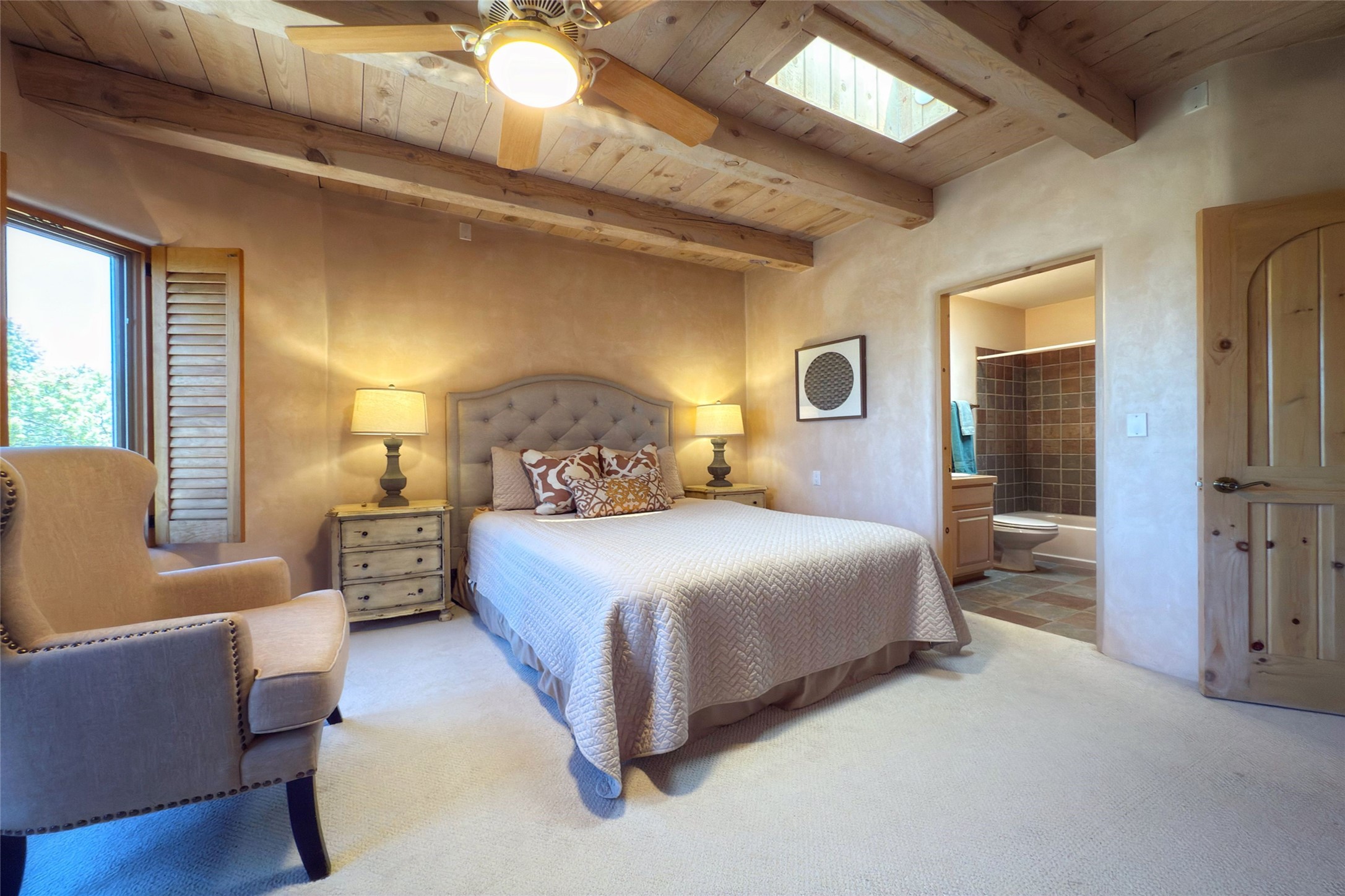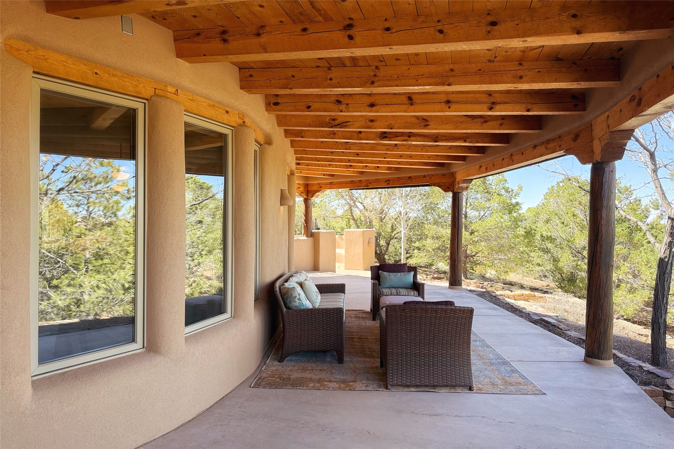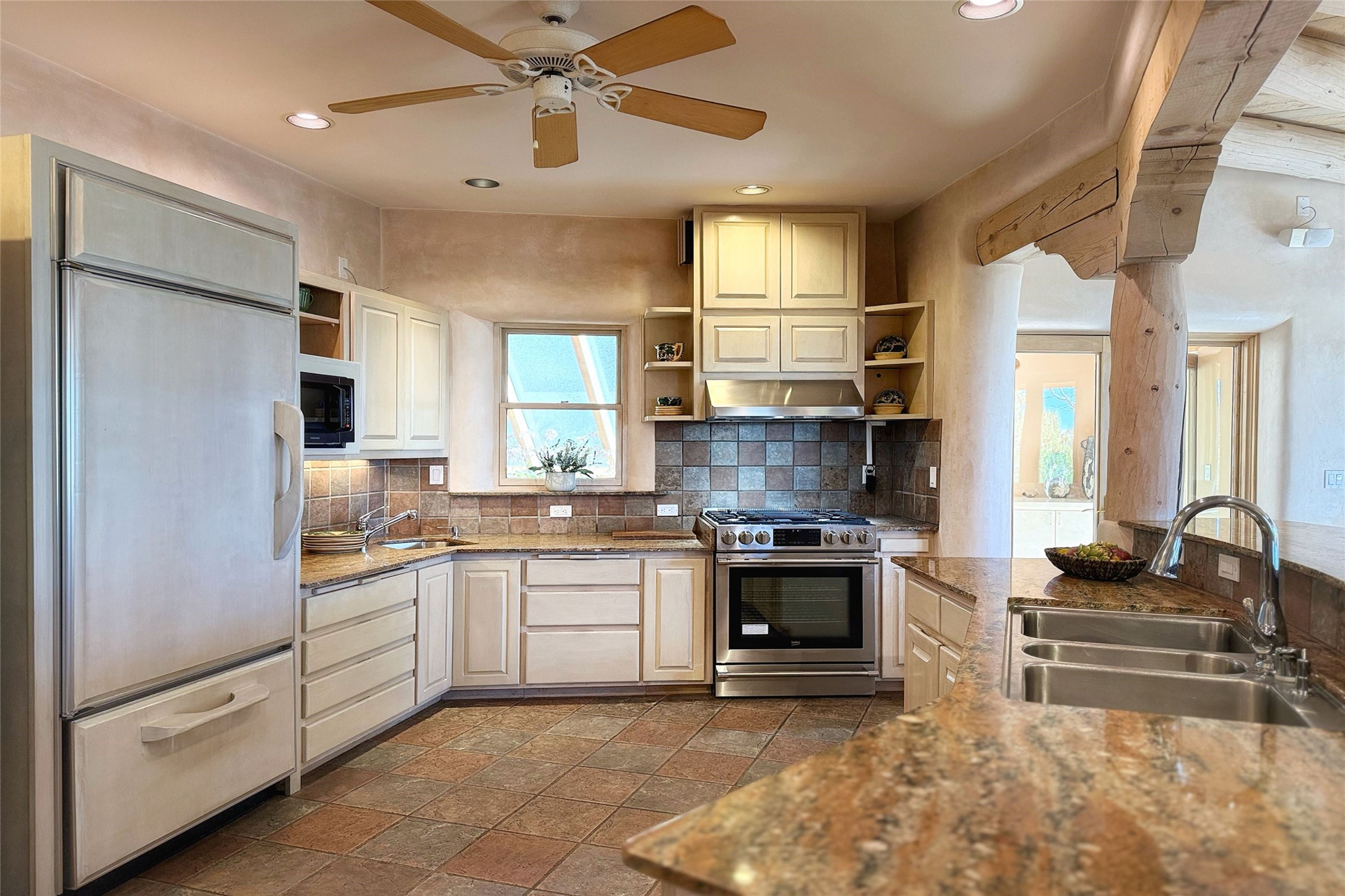 Stunning custom home with circular floor plan, archways and designer touches throughout. The spacious kitchen includes granite countertops, bar seating, walk-in butler's pantry and two new gas ranges. The light filled living area features a gas fireplace and large windows, with adjoining dining room. The primary suite offers a private retreat with a sitting room, soaking tub, bidet, and walk-in shower along with massive closet with built in storage. The best part is the massive sunroom with flagstone floors and a gas fireplace. A plant-lover's dream. Just two minutes to the plaza, yet surrounded by pion, the terraced outdoor landscaping offers nature and seclusion. While the large shaded portal boasts banco seating. Plus a rooftop terrace provides 360 views. Additional highlights include radiant floor heating, a bonus studio/home gym, a Murphy bed in the media roomLocated near walking paths, parks, dining, shops and world renowned galleries, this home combines comfort, style, and convenience. Don't miss this one-of-a-kind property!