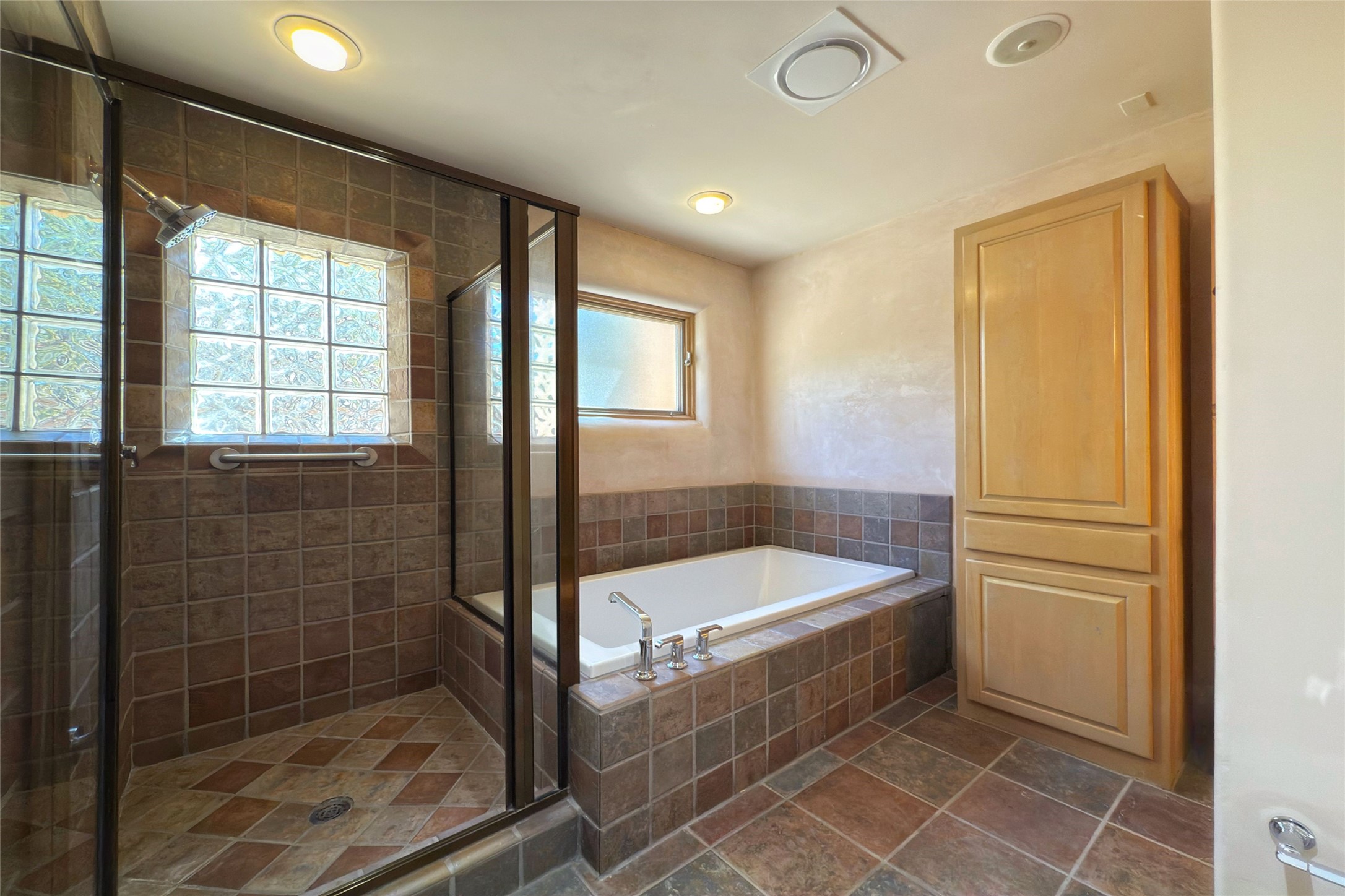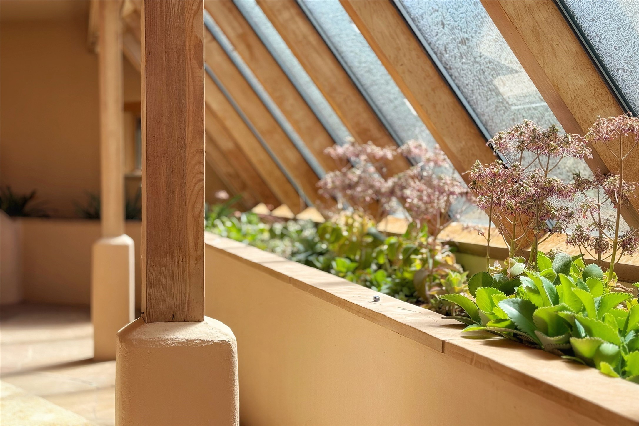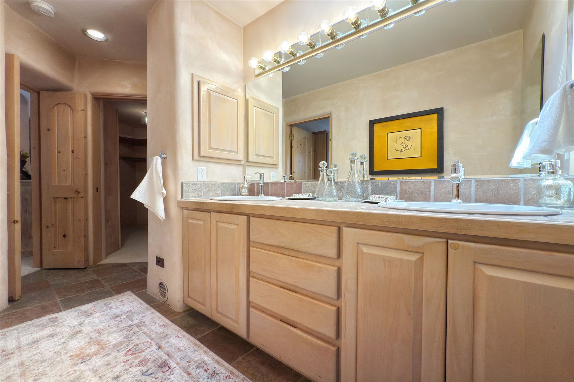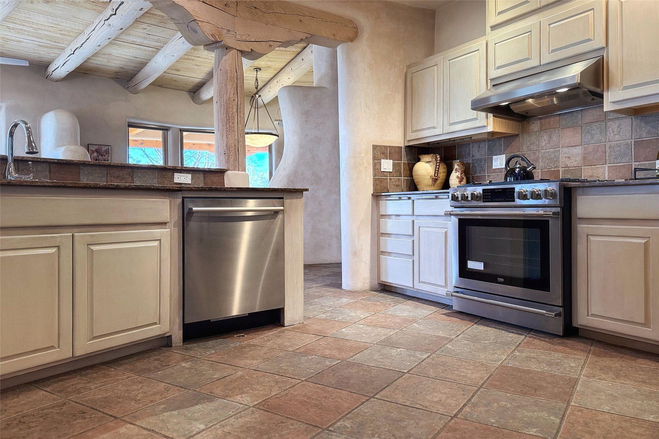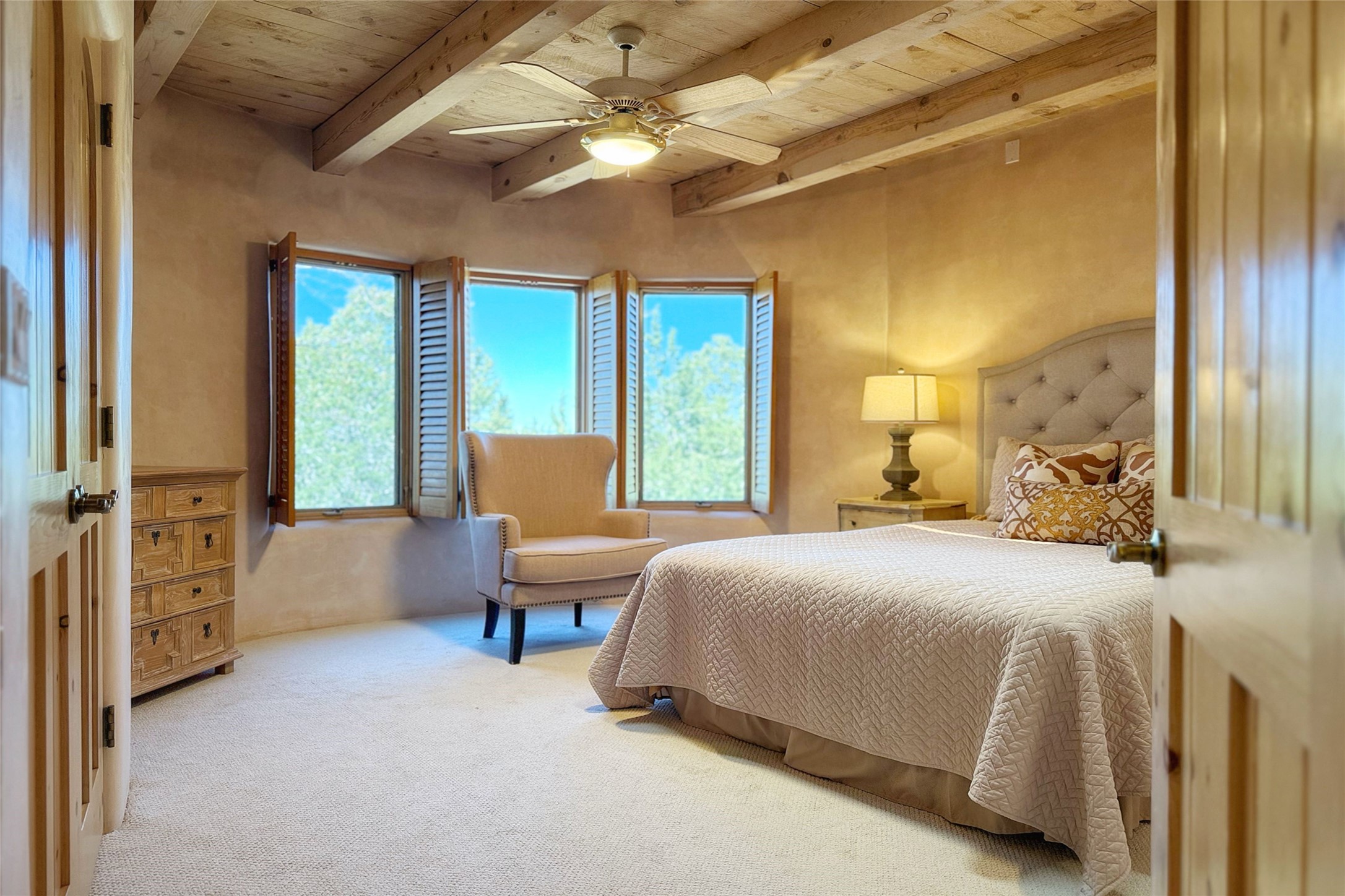 Stunning custom home with circular floor plan, archways and designer touches throughout. The spacious kitchen includes granite countertops, bar seating, walk-in butler's pantry and two new gas ranges. The light filled living area features a gas fireplace and large windows, with adjoining dining room. The primary suite offers a private retreat with a sitting room, soaking tub, bidet, and walk-in shower along with massive closet with built in storage. The best part is the massive sunroom with flagstone floors and a gas fireplace. A plant-lover's dream. Just two minutes to the plaza, yet surrounded by pion, the terraced outdoor landscaping offers nature and seclusion. While the large shaded portal boasts banco seating. Plus a rooftop terrace provides 360 views. Additional highlights include radiant floor heating, a bonus studio/home gym, a Murphy bed in the media roomLocated near walking paths, parks, dining, shops and world renowned galleries, this home combines comfort, style, and convenience. Don't miss this one-of-a-kind property!