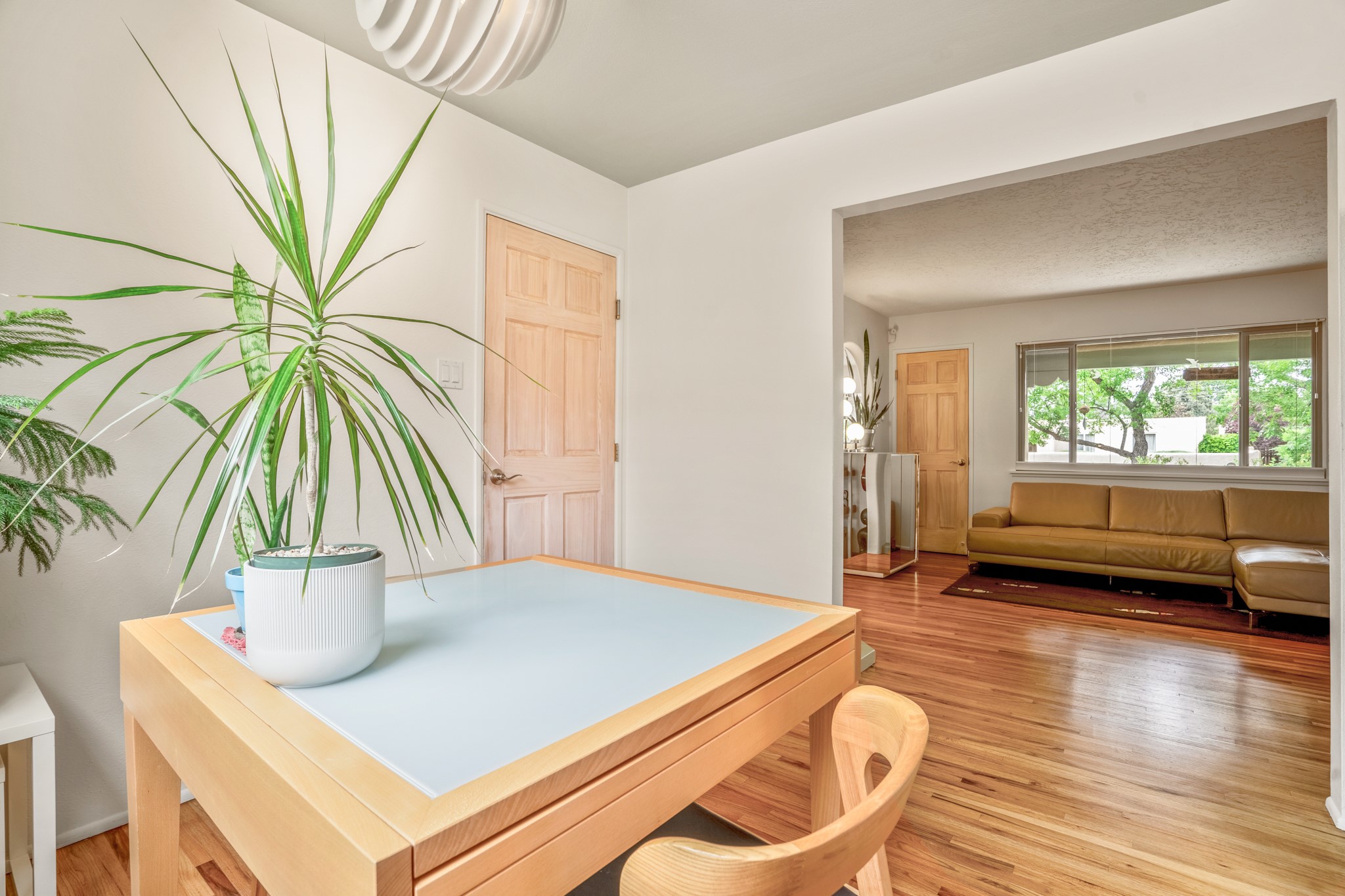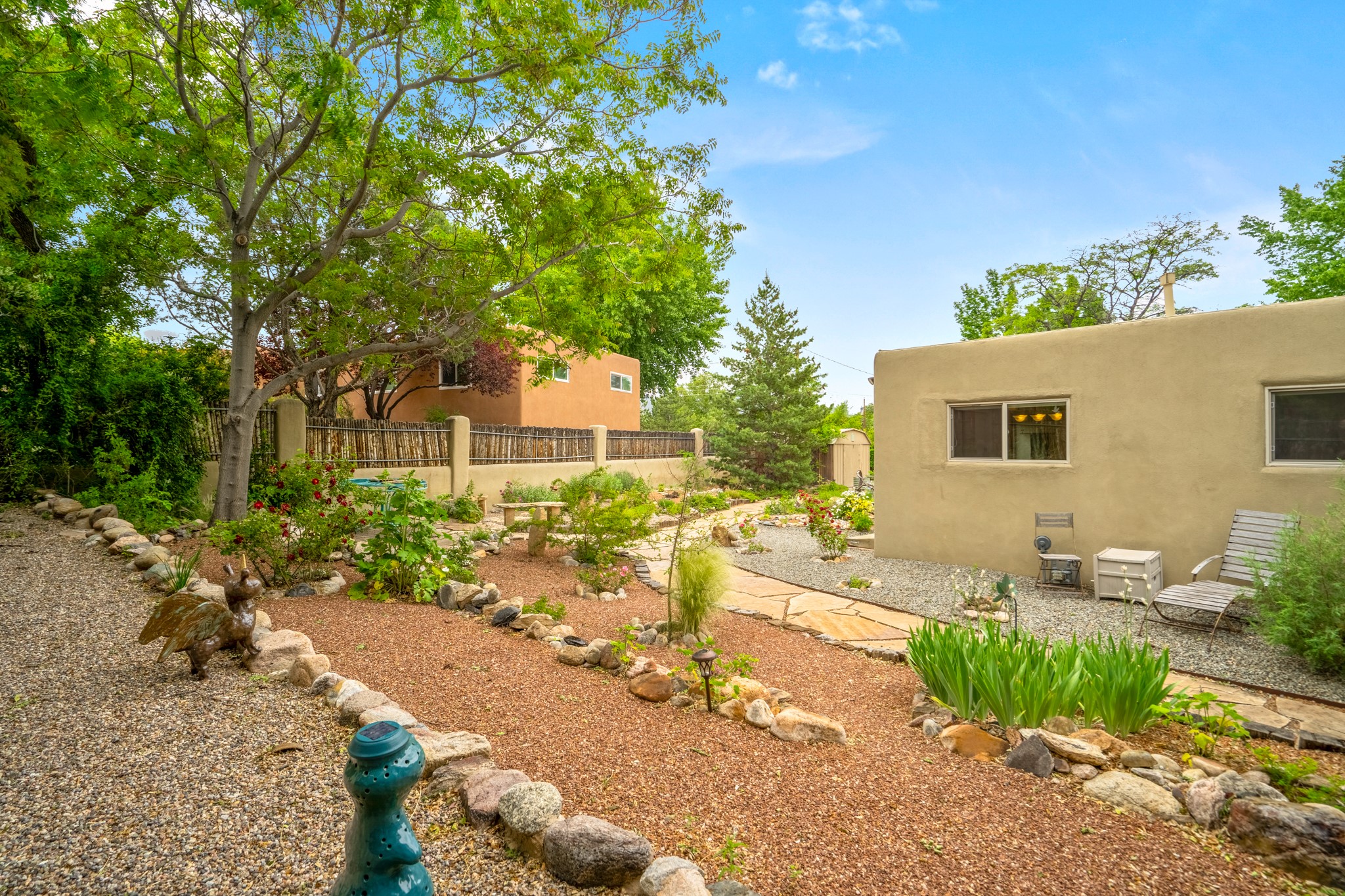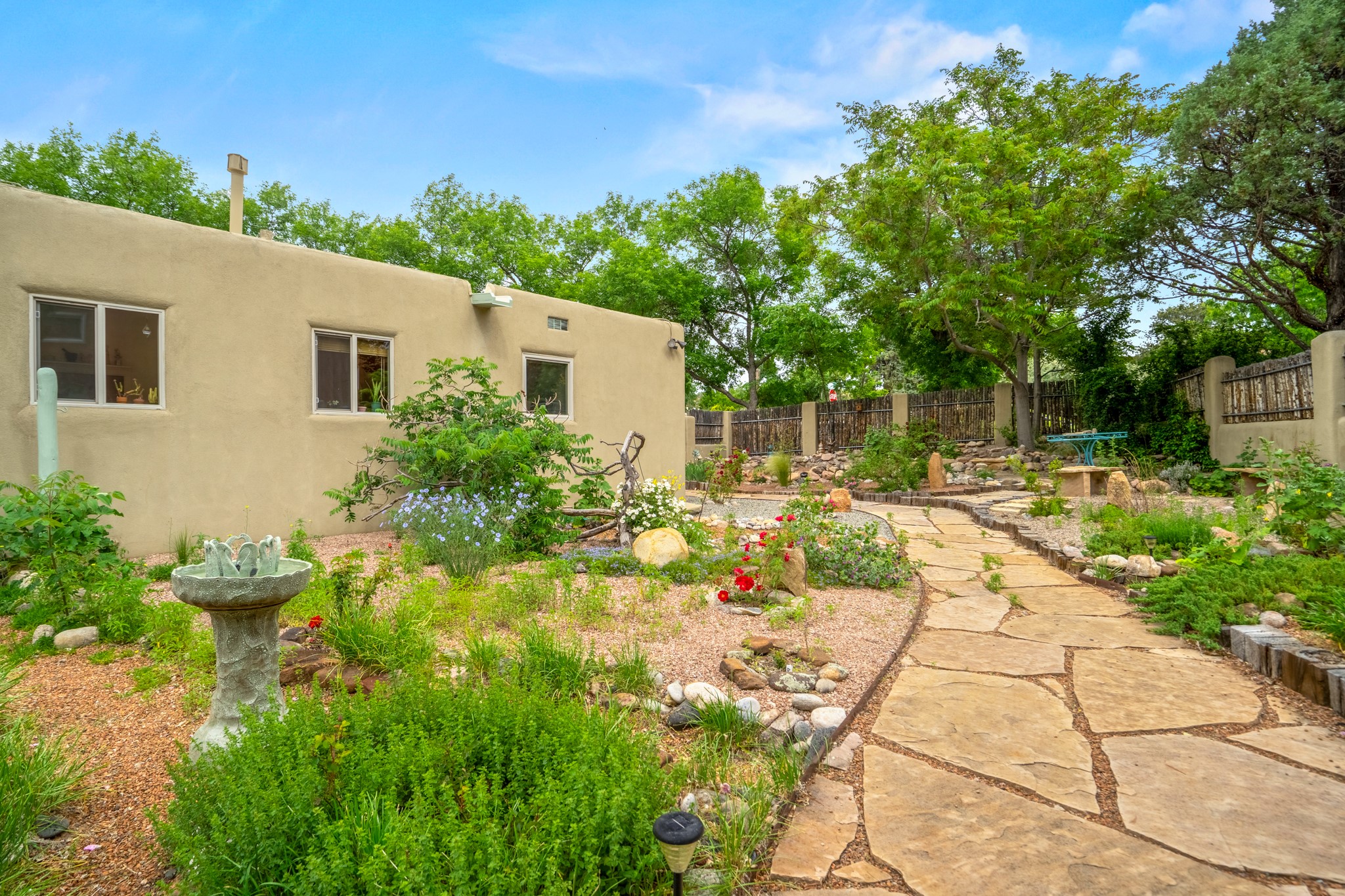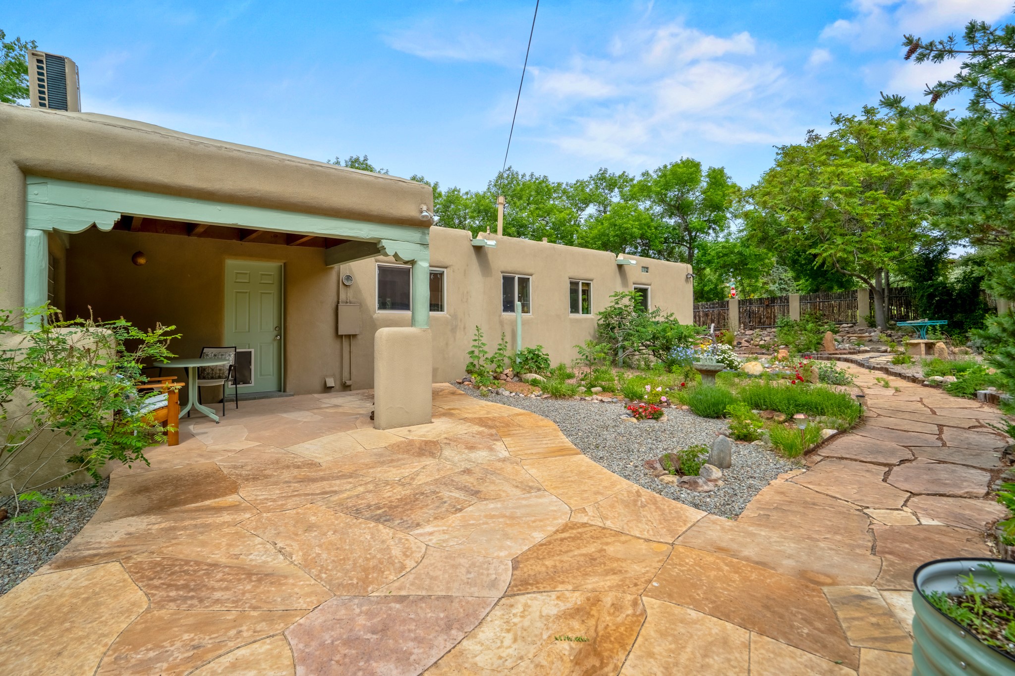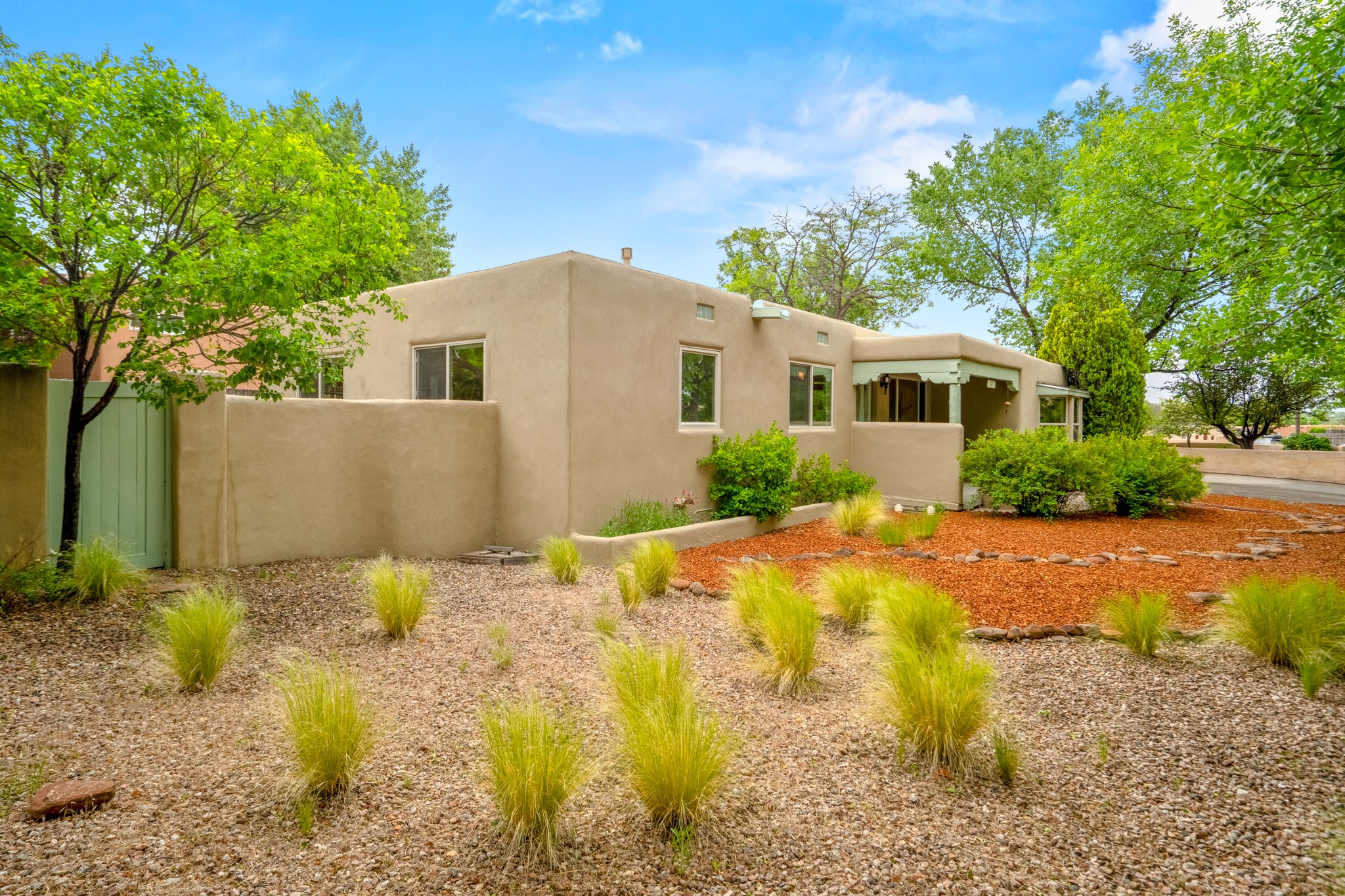 This charming Stamm home in Casa Solana offers a blend of classic character and modern updates, and is mere minutes from the Santa Fe Plaza. Beautifully cared for oak floors flow through thoughtfully updated interiors. There is also a brand-new TPO roof topped with owned and completely paid for solar panels. The bright living room features a cozy Kiva fireplace, and extends into a second living space with a beautiful bay window, creating a welcoming gathering space. The cheery kitchen features stainless steel appliances and a sunny dining nook for informal dining. The primary suite, tucked at the end of the hall, boasts a private bath, while a second bedroom and full bath are thoughtfully placed nearby. There is a soundproof music studio on the other end of the home with it's own private entrance that can easily transform into a third bedroom or office. Situated on an oversized corner lot with lush landscaping watered by an underground rainwater tank, this home is move-in ready, full of warmth and perfectly balanced for comfort and style.
