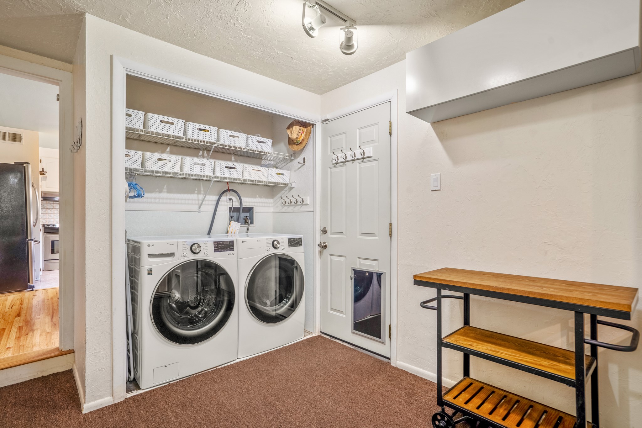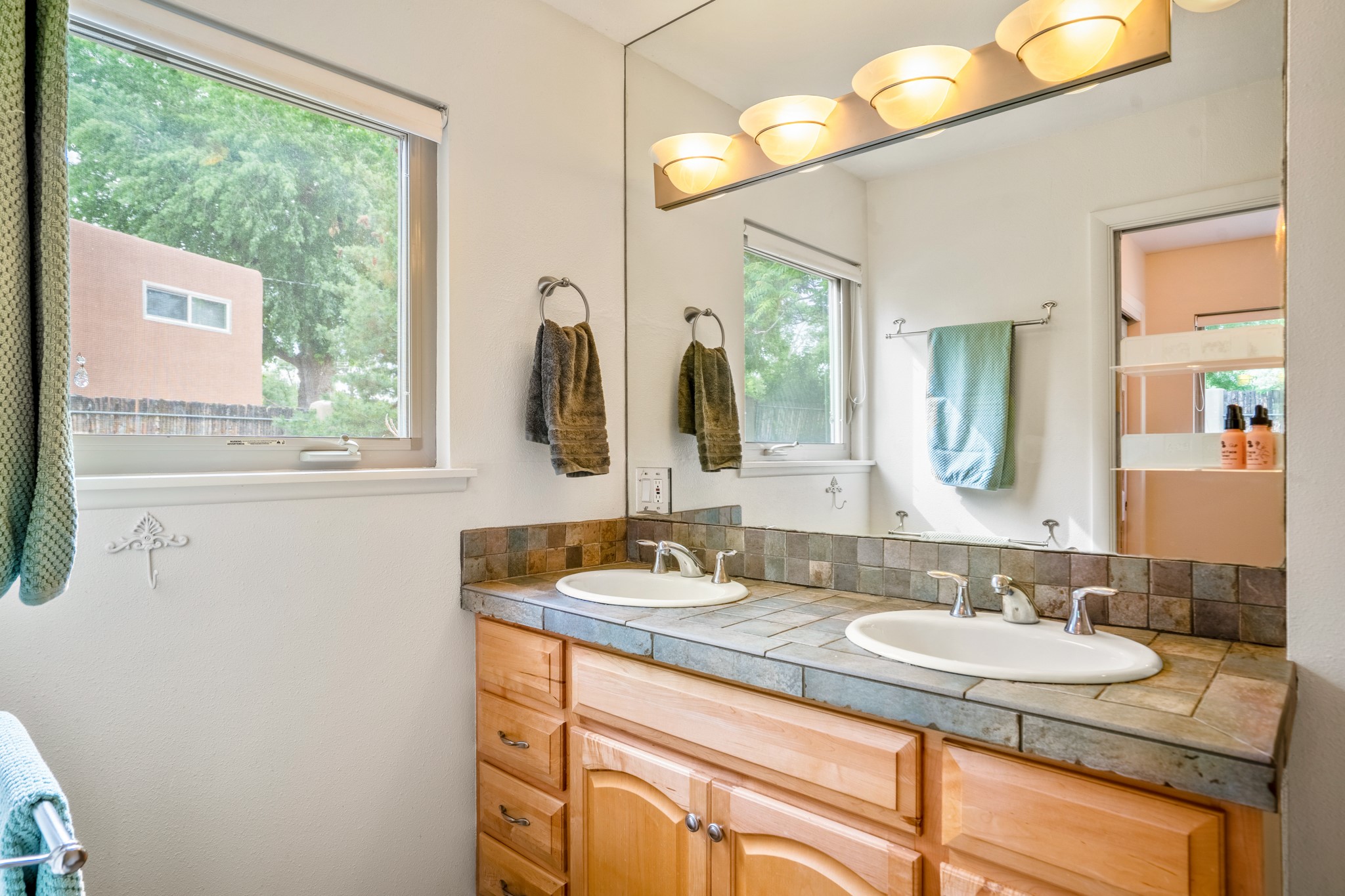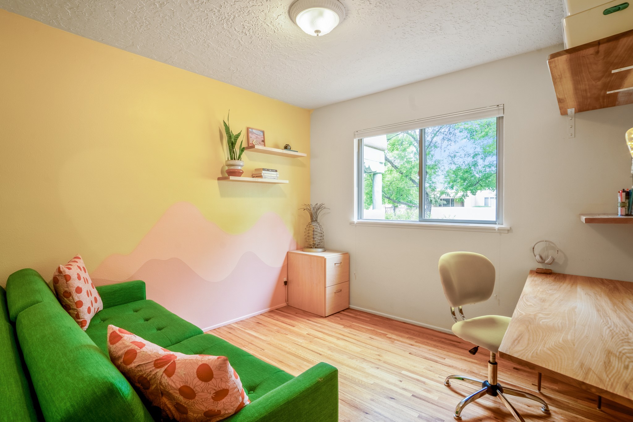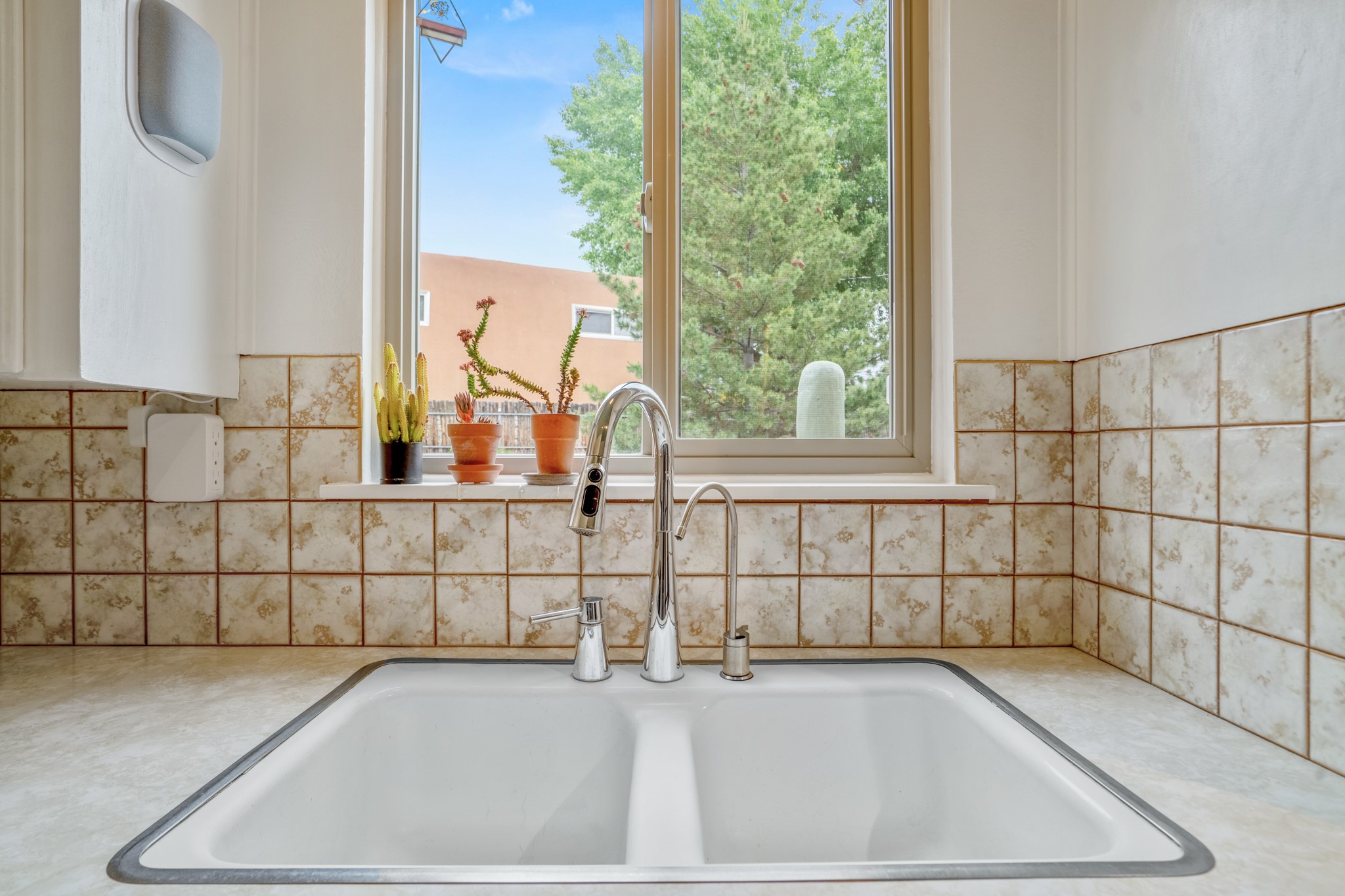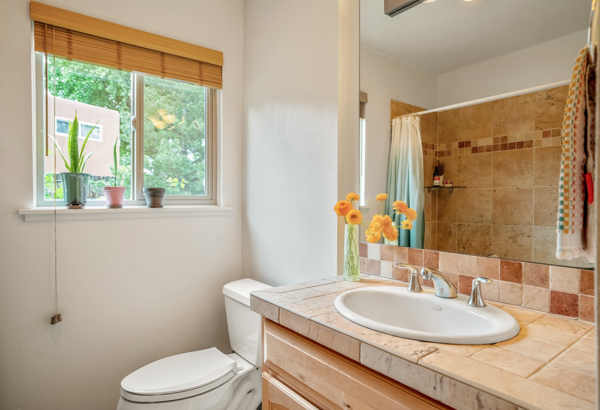 This charming Stamm home in Casa Solana offers a blend of classic character and modern updates, and is mere minutes from the Santa Fe Plaza. Beautifully cared for oak floors flow through thoughtfully updated interiors. There is also a brand-new TPO roof topped with owned and completely paid for solar panels. The bright living room features a cozy Kiva fireplace, and extends into a second living space with a beautiful bay window, creating a welcoming gathering space. The cheery kitchen features stainless steel appliances and a sunny dining nook for informal dining. The primary suite, tucked at the end of the hall, boasts a private bath, while a second bedroom and full bath are thoughtfully placed nearby. There is a soundproof music studio on the other end of the home with it's own private entrance that can easily transform into a third bedroom or office. Situated on an oversized corner lot with lush landscaping watered by an underground rainwater tank, this home is move-in ready, full of warmth and perfectly balanced for comfort and style.