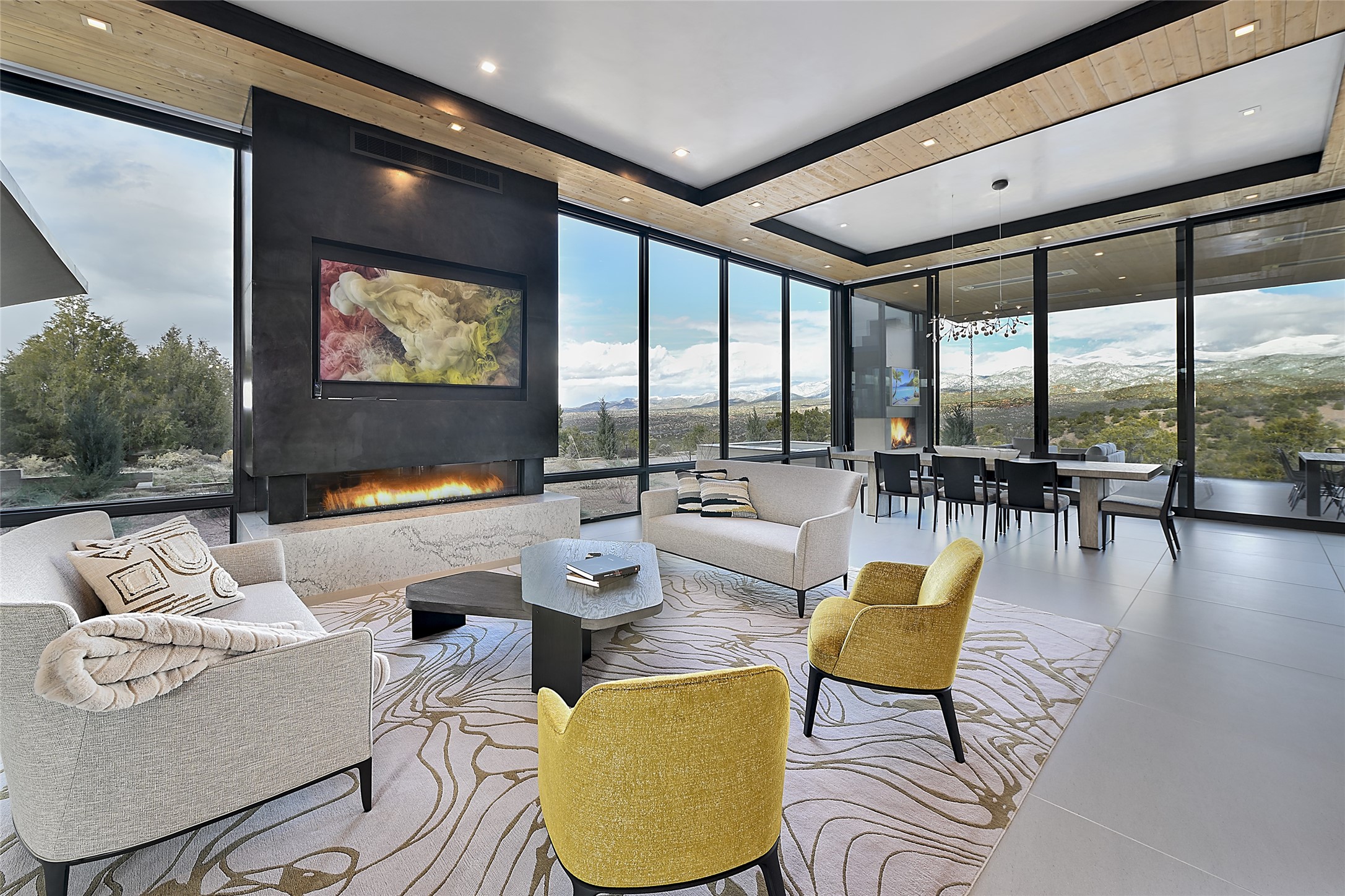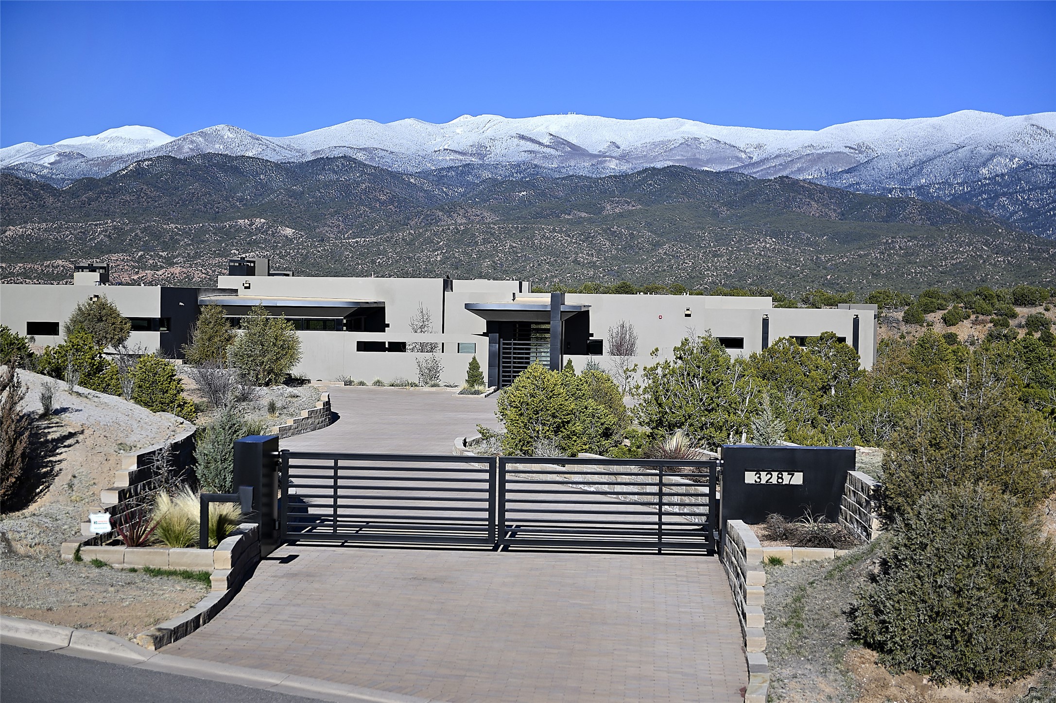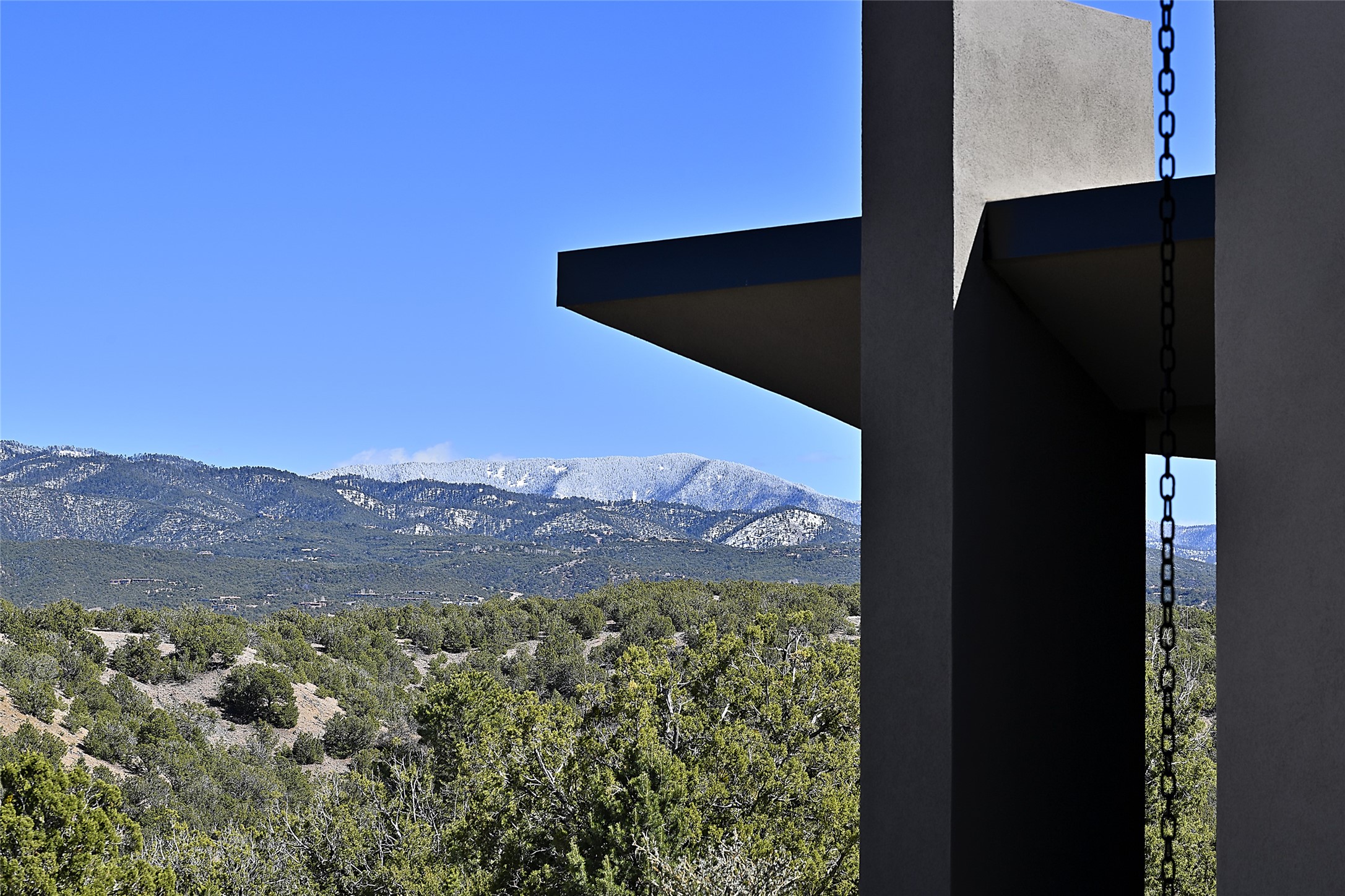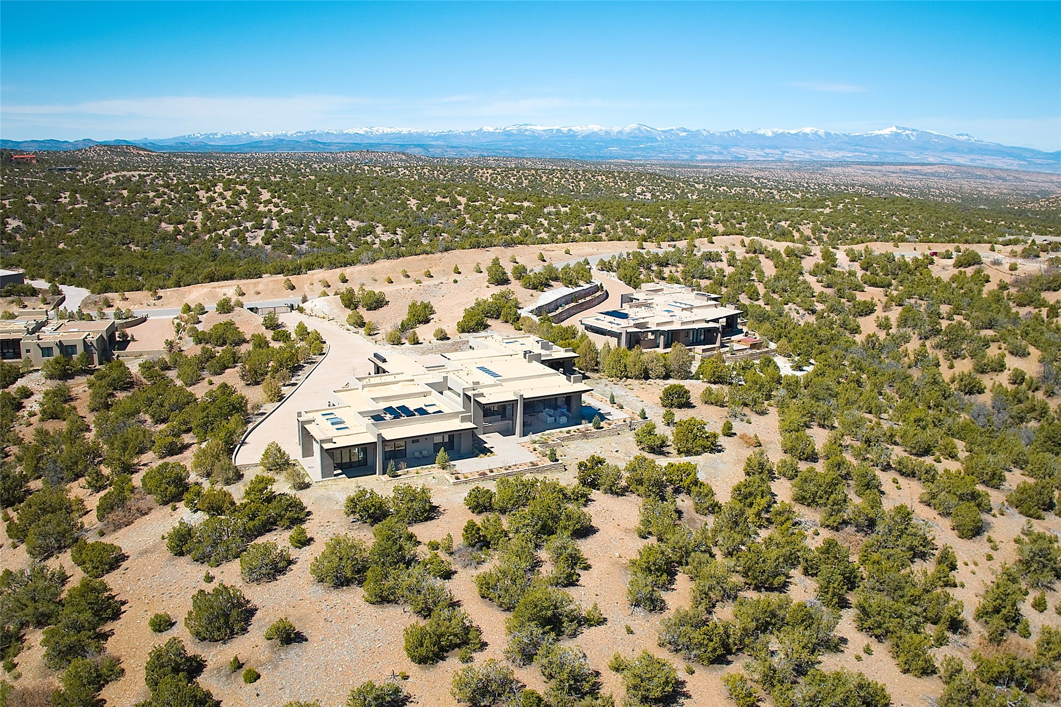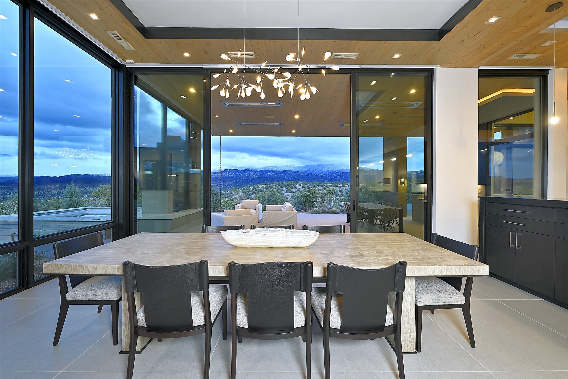 Monte Sereno Masterpiece. Sculpted by builder Kim Dressel and architect Rad Acton from cutting edge contemporary building materials, glass, and stone, the East-Facing classic one-level home delivers on every level - starting the enormous views of the Sangre de Cristo Mountains to the east and the Badlands to the north. Enter through a private gate to the motor court with pavers, then the pivot gate & private garden - to a view sequence matched by few other properties in all of Santa Fe. Completed in 2022, the soaring ceilings and walls of glass are complemented by a wonderful open floor plan which meshes the living room/dining room/kitchen/wine bar into one graceful glowing space. Top-of-the-line appliance package and views galore make the kitchen a true centerpiece of the home, with a full butler's pantry and cozy banco seating area. The media room/office area are state-of-the art on every level, with an oversized TV screen and partitioning for privacy. The outdoor portal space retains the high ceilings, and the space is replete with a pool/spa feature that is fully programmable, a well equipped outdoor kitchen, and in ceiling radiant heaters to take the edge off Santa Fe's cool evenings while taking in the views. The primary suite is cloistered away from the rest of the home and enjoys spectacular views and a luxurious bathroom suite and separate closets. The other bedrooms all enjoy the same views and ensuite baths. There is a separate exercise room on the south end of the home which also retains the views and lots of sunlight - could also be a great artist's studio.