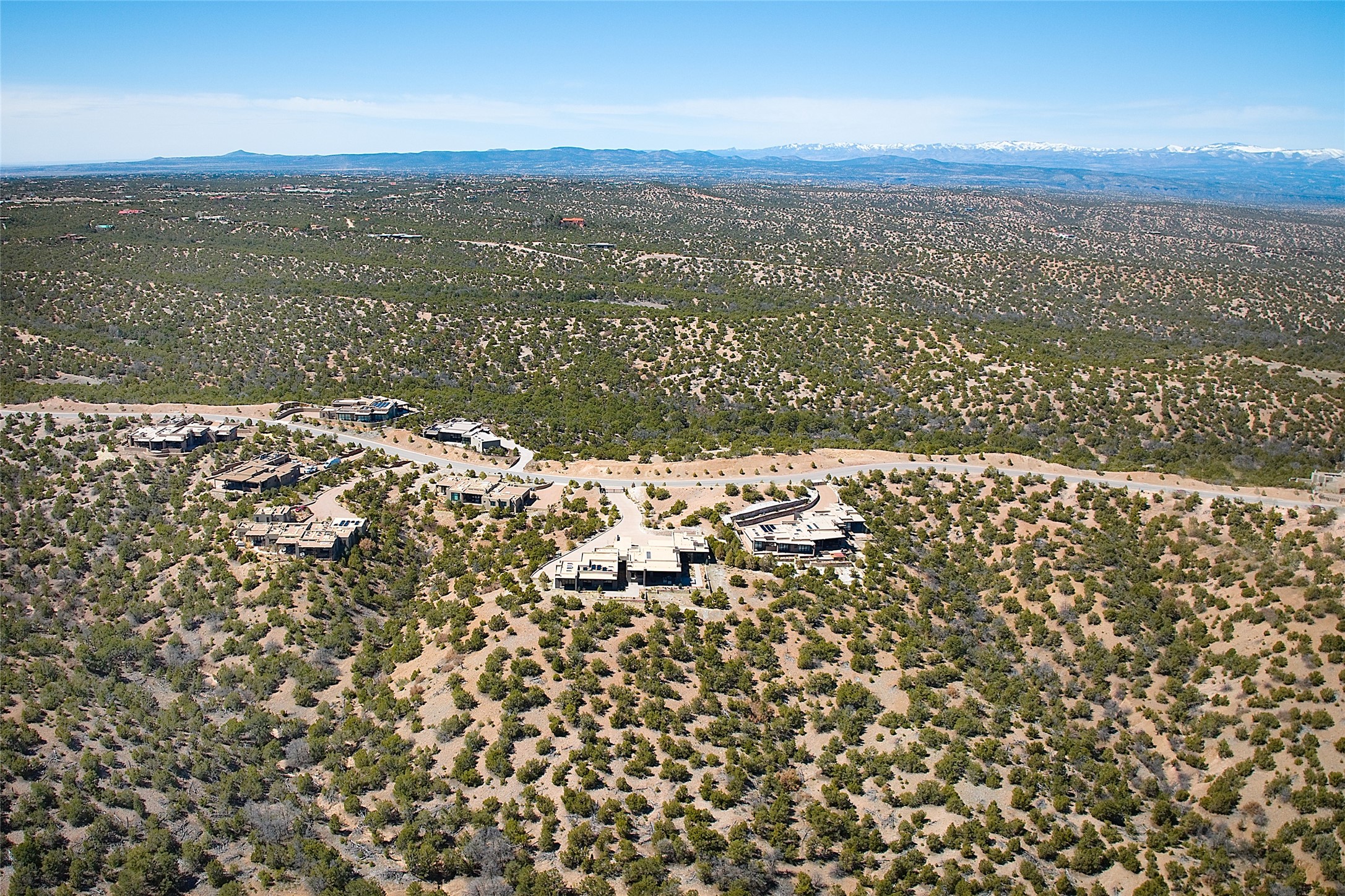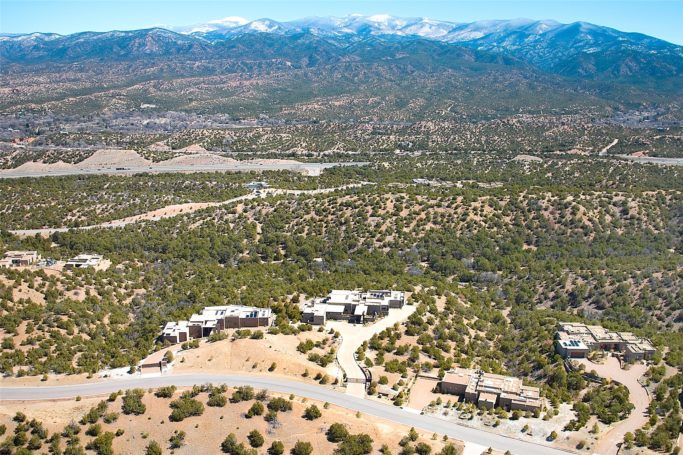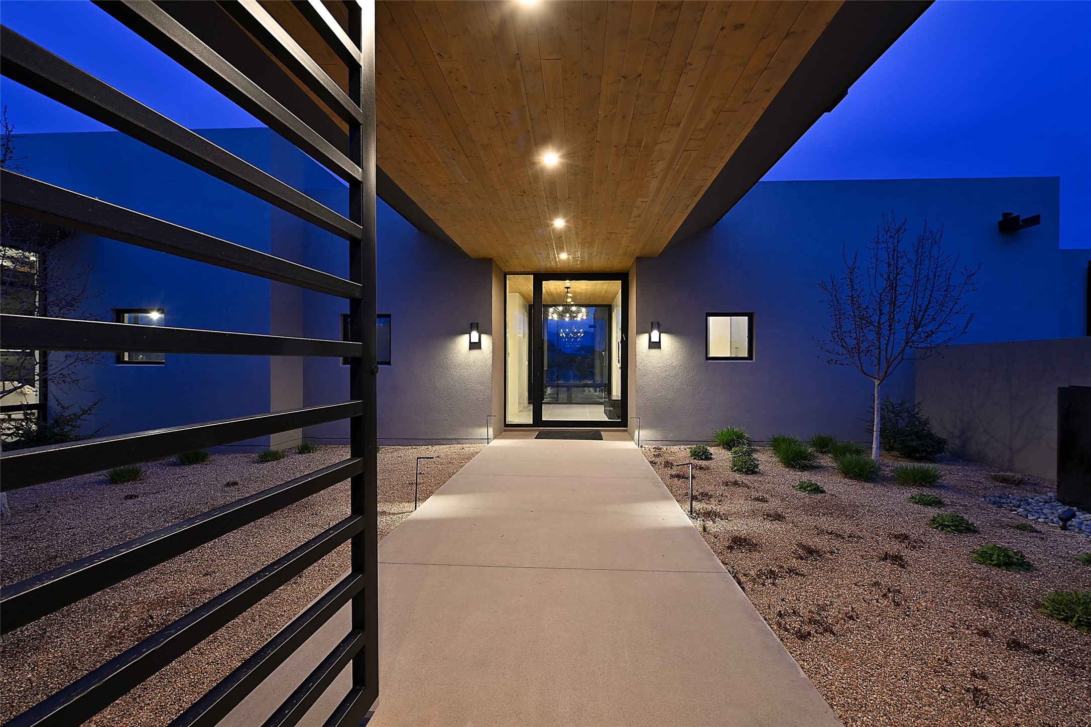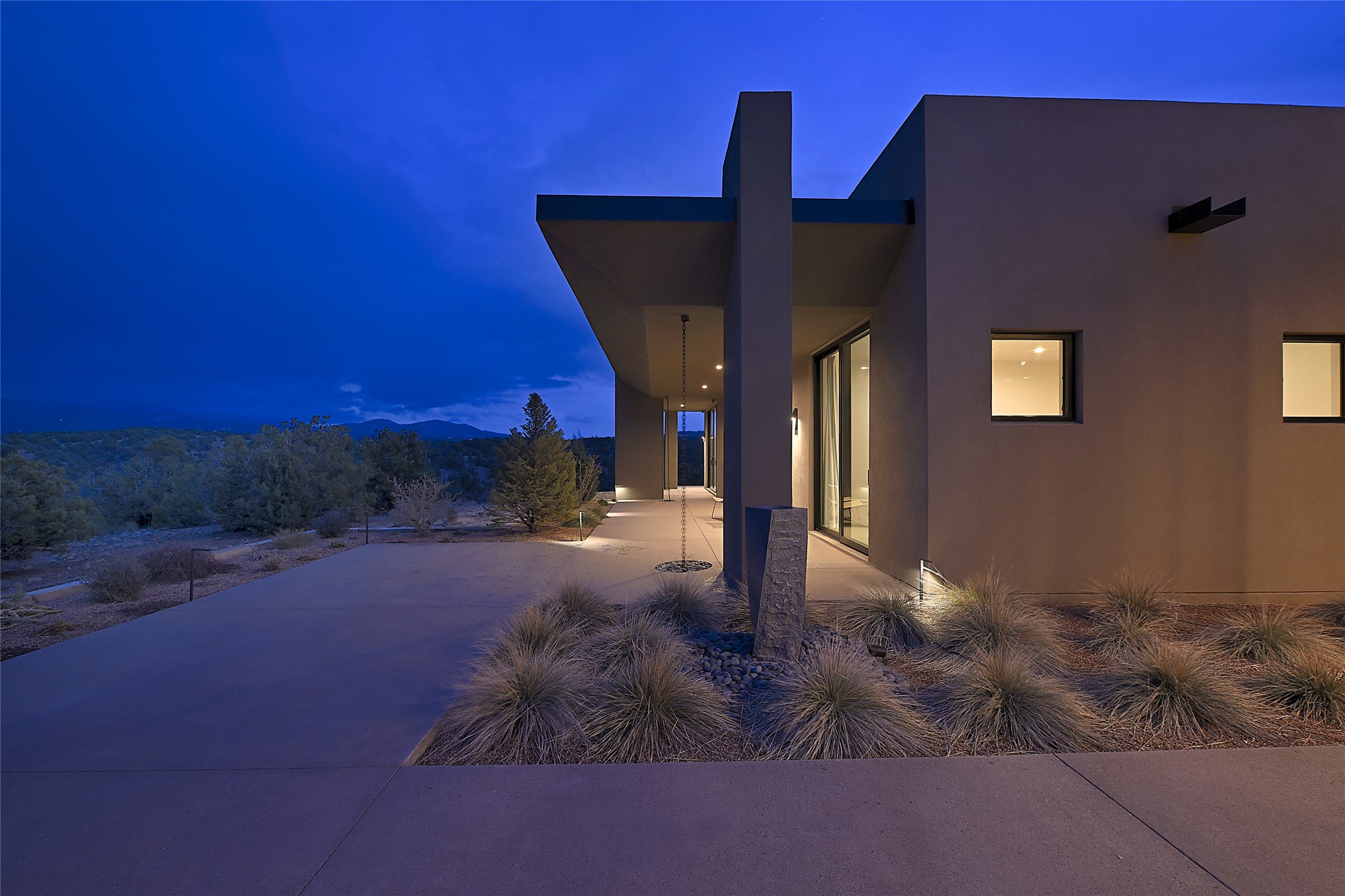 Monte Sereno Masterpiece. Sculpted by builder Kim Dressel and architect Rad Acton from cutting edge contemporary building materials, glass, and stone, the East-Facing classic one-level home delivers on every level - starting the enormous views of the Sangre de Cristo Mountains to the east and the Badlands to the north. Enter through a private gate to the motor court with pavers, then the pivot gate & private garden - to a view sequence matched by few other properties in all of Santa Fe. Completed in 2022, the soaring ceilings and walls of glass are complemented by a wonderful open floor plan which meshes the living room/dining room/kitchen/wine bar into one graceful glowing space. Top-of-the-line appliance package and views galore make the kitchen a true centerpiece of the home, with a full butler's pantry and cozy banco seating area. The media room/office area are state-of-the art on every level, with an oversized TV screen and partitioning for privacy. The outdoor portal space retains the high ceilings, and the space is replete with a pool/spa feature that is fully programmable, a well equipped outdoor kitchen, and in ceiling radiant heaters to take the edge off Santa Fe's cool evenings while taking in the views. The primary suite is cloistered away from the rest of the home and enjoys spectacular views and a luxurious bathroom suite and separate closets. The other bedrooms all enjoy the same views and ensuite baths. There is a separate exercise room on the south end of the home which also retains the views and lots of sunlight - could also be a great artist's studio.