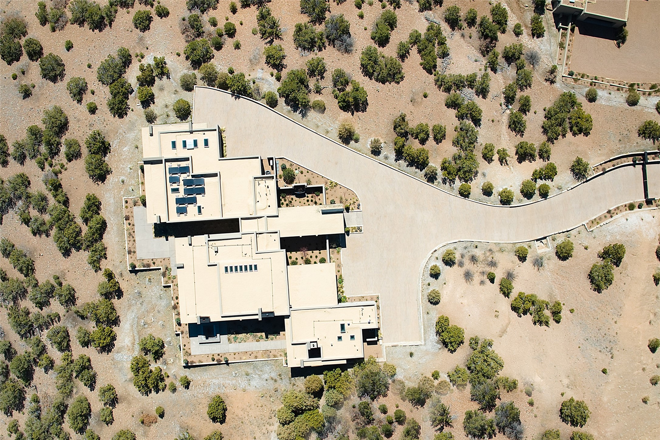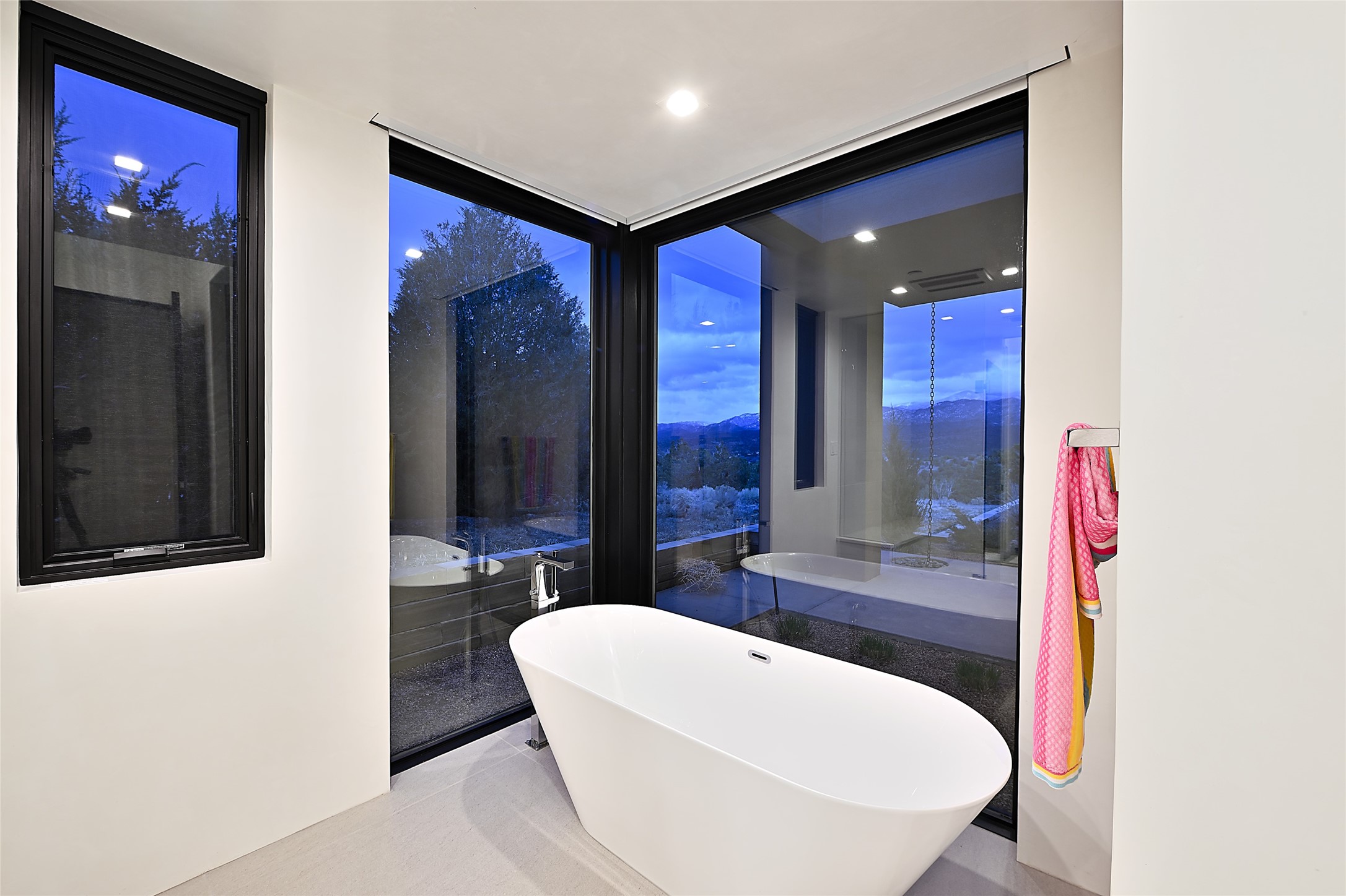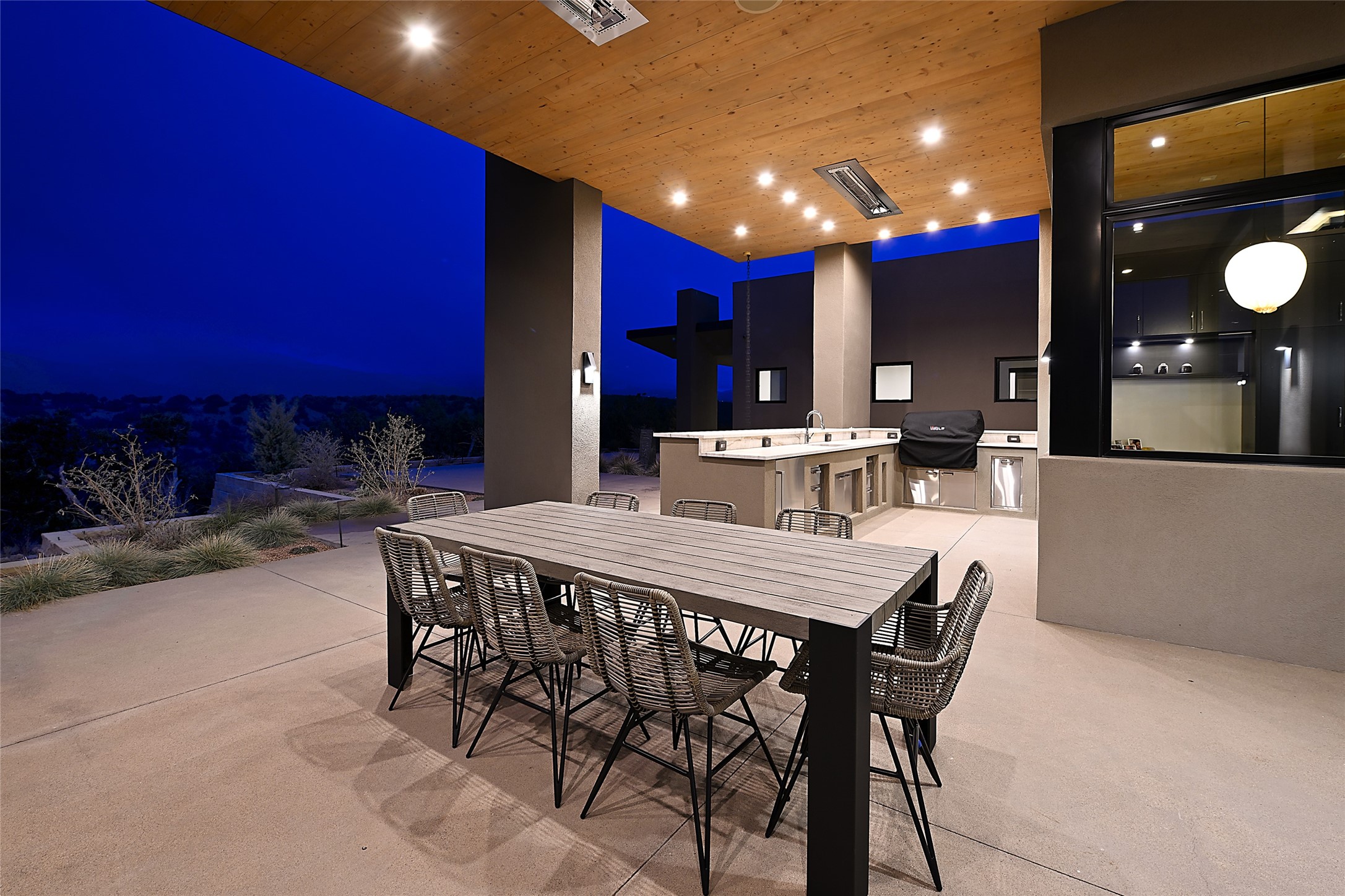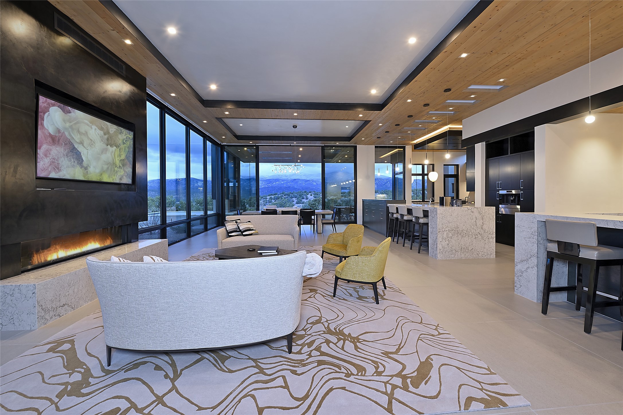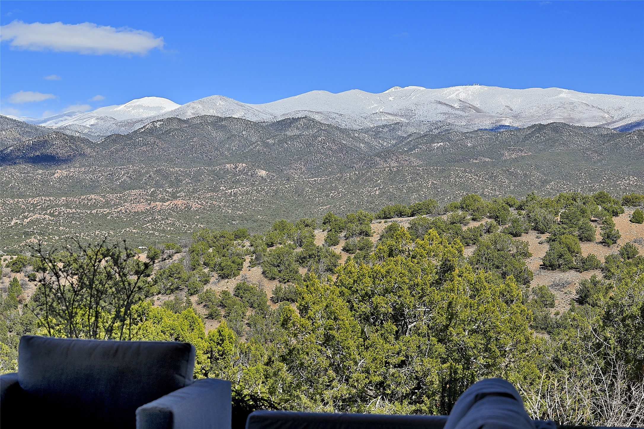 Monte Sereno Masterpiece. Sculpted by builder Kim Dressel and architect Rad Acton from cutting edge contemporary building materials, glass, and stone, the East-Facing classic one-level home delivers on every level - starting the enormous views of the Sangre de Cristo Mountains to the east and the Badlands to the north. Enter through a private gate to the motor court with pavers, then the pivot gate & private garden - to a view sequence matched by few other properties in all of Santa Fe. Completed in 2022, the soaring ceilings and walls of glass are complemented by a wonderful open floor plan which meshes the living room/dining room/kitchen/wine bar into one graceful glowing space. Top-of-the-line appliance package and views galore make the kitchen a true centerpiece of the home, with a full butler's pantry and cozy banco seating area. The media room/office area are state-of-the art on every level, with an oversized TV screen and partitioning for privacy. The outdoor portal space retains the high ceilings, and the space is replete with a pool/spa feature that is fully programmable, a well equipped outdoor kitchen, and in ceiling radiant heaters to take the edge off Santa Fe's cool evenings while taking in the views. The primary suite is cloistered away from the rest of the home and enjoys spectacular views and a luxurious bathroom suite and separate closets. The other bedrooms all enjoy the same views and ensuite baths. There is a separate exercise room on the south end of the home which also retains the views and lots of sunlight - could also be a great artist's studio.