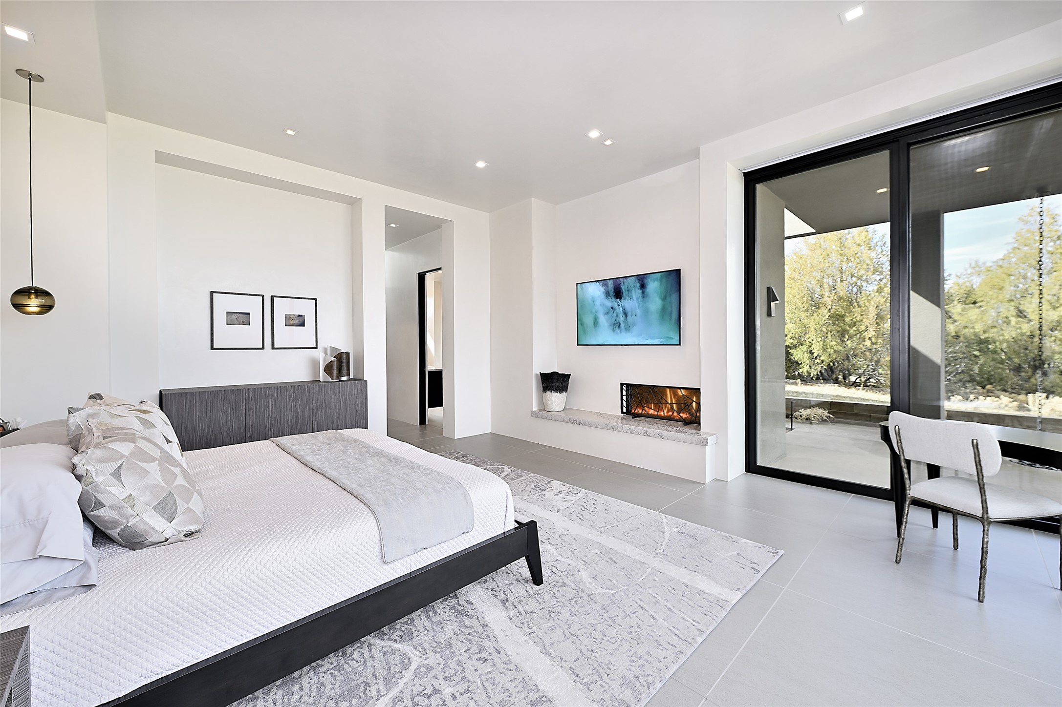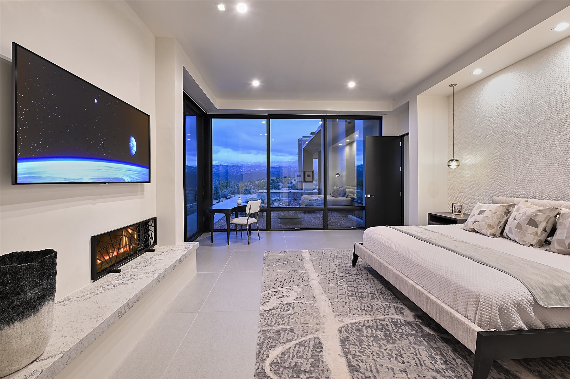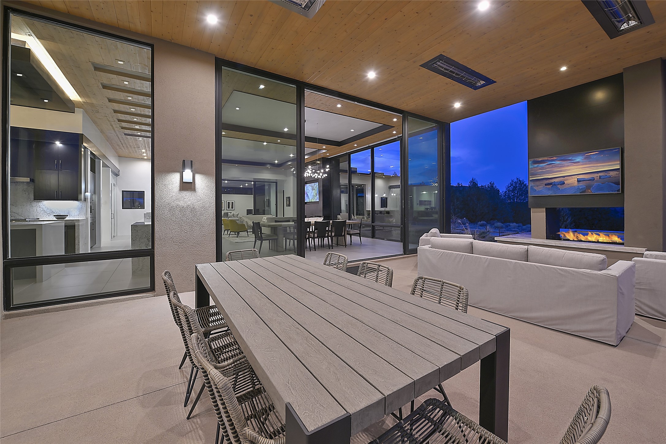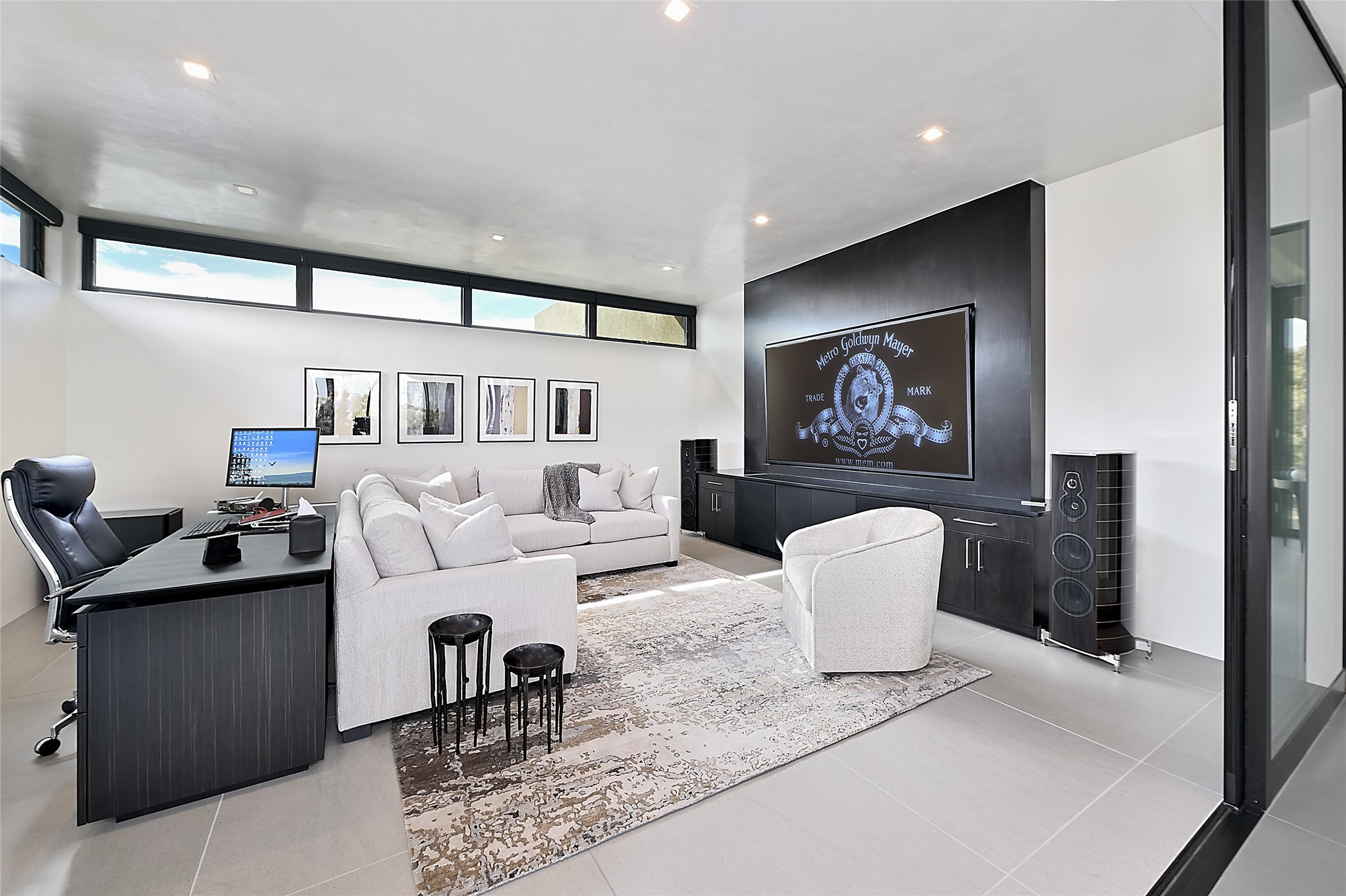 Monte Sereno Masterpiece. Sculpted by builder Kim Dressel and architect Rad Acton from cutting edge contemporary building materials, glass, and stone, the East-Facing classic one-level home delivers on every level - starting the enormous views of the Sangre de Cristo Mountains to the east and the Badlands to the north. Enter through a private gate to the motor court with pavers, then the pivot gate & private garden - to a view sequence matched by few other properties in all of Santa Fe. Completed in 2022, the soaring ceilings and walls of glass are complemented by a wonderful open floor plan which meshes the living room/dining room/kitchen/wine bar into one graceful glowing space. Top-of-the-line appliance package and views galore make the kitchen a true centerpiece of the home, with a full butler's pantry and cozy banco seating area. The media room/office area are state-of-the art on every level, with an oversized TV screen and partitioning for privacy. The outdoor portal space retains the high ceilings, and the space is replete with a pool/spa feature that is fully programmable, a well equipped outdoor kitchen, and in ceiling radiant heaters to take the edge off Santa Fe's cool evenings while taking in the views. The primary suite is cloistered away from the rest of the home and enjoys spectacular views and a luxurious bathroom suite and separate closets. The other bedrooms all enjoy the same views and ensuite baths. There is a separate exercise room on the south end of the home which also retains the views and lots of sunlight - could also be a great artist's studio.