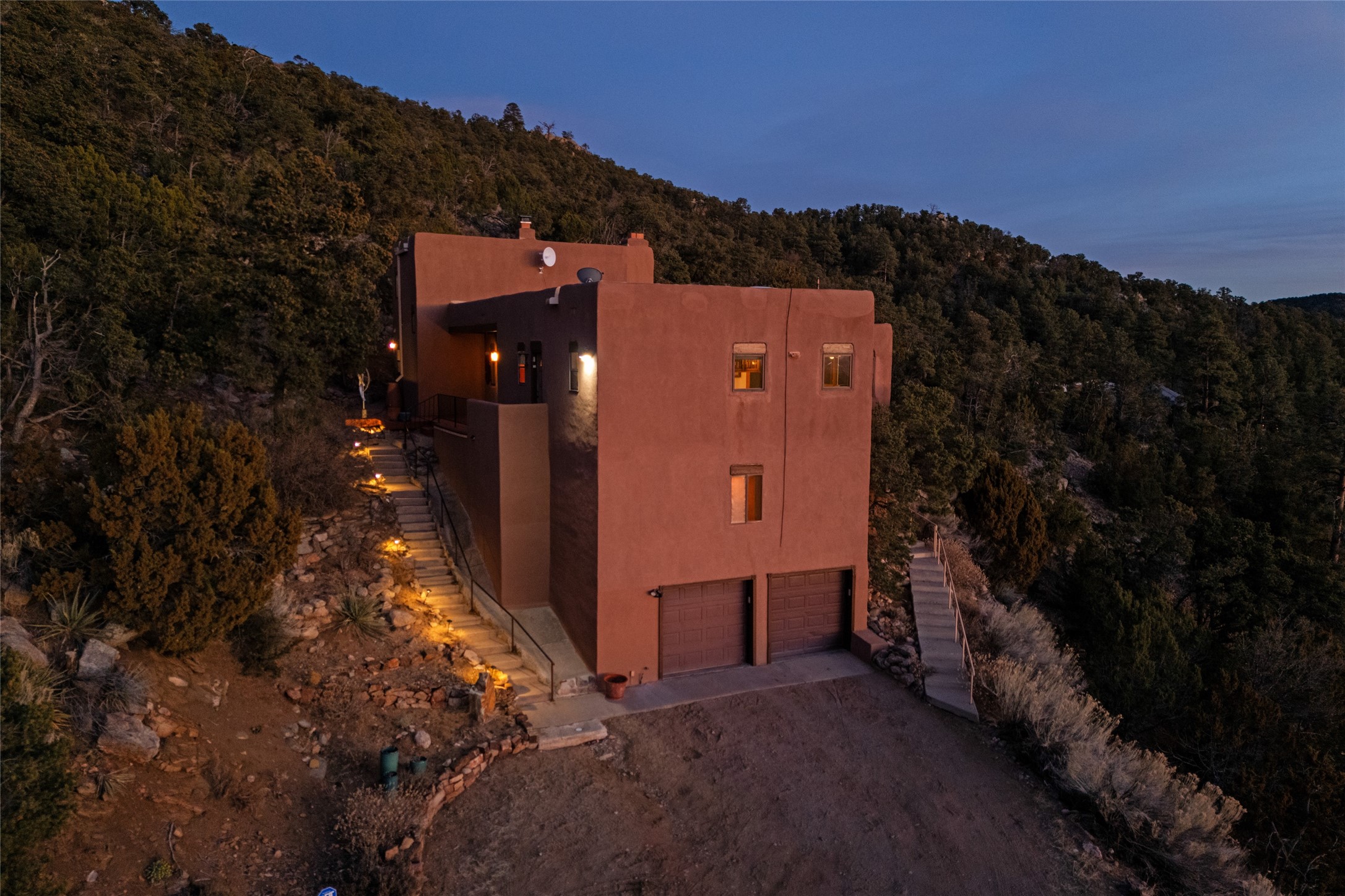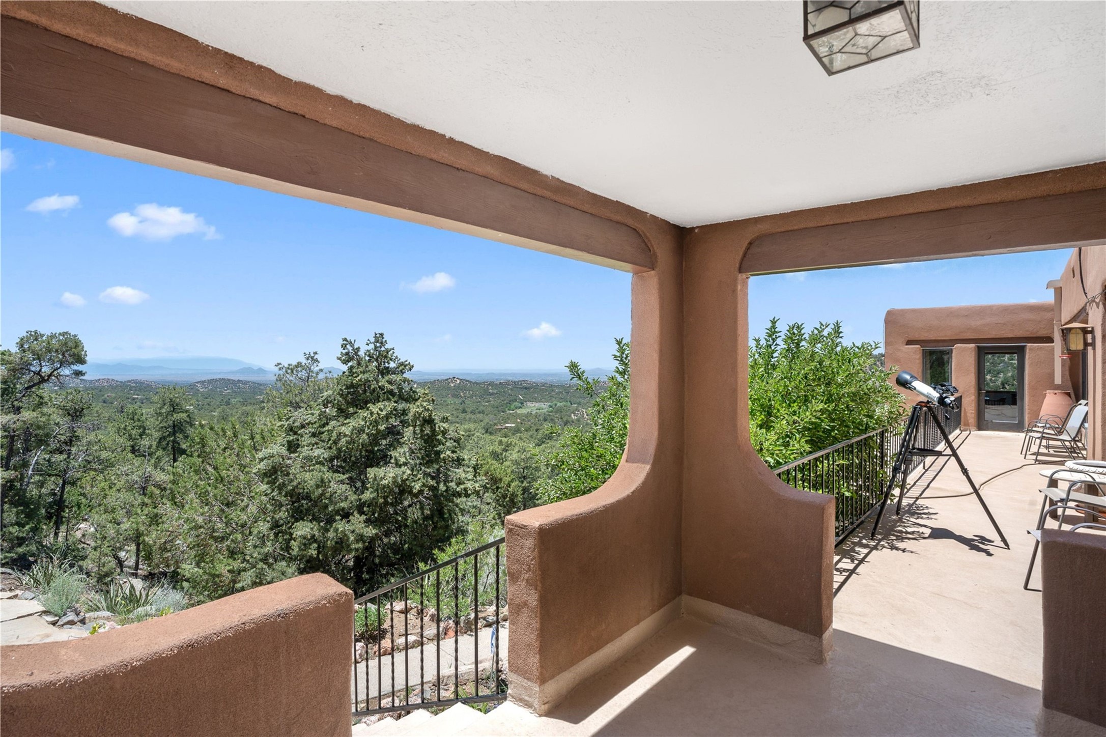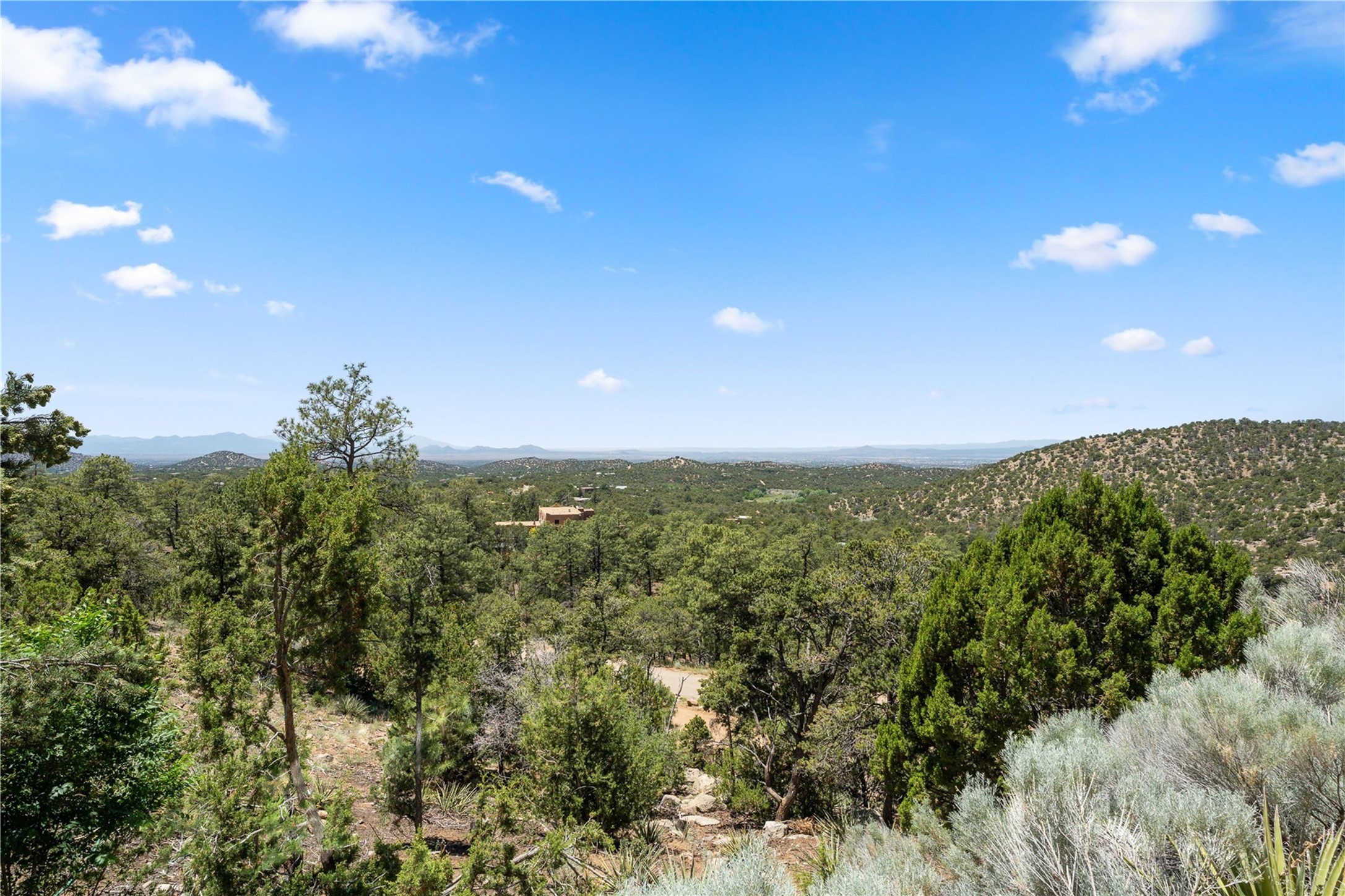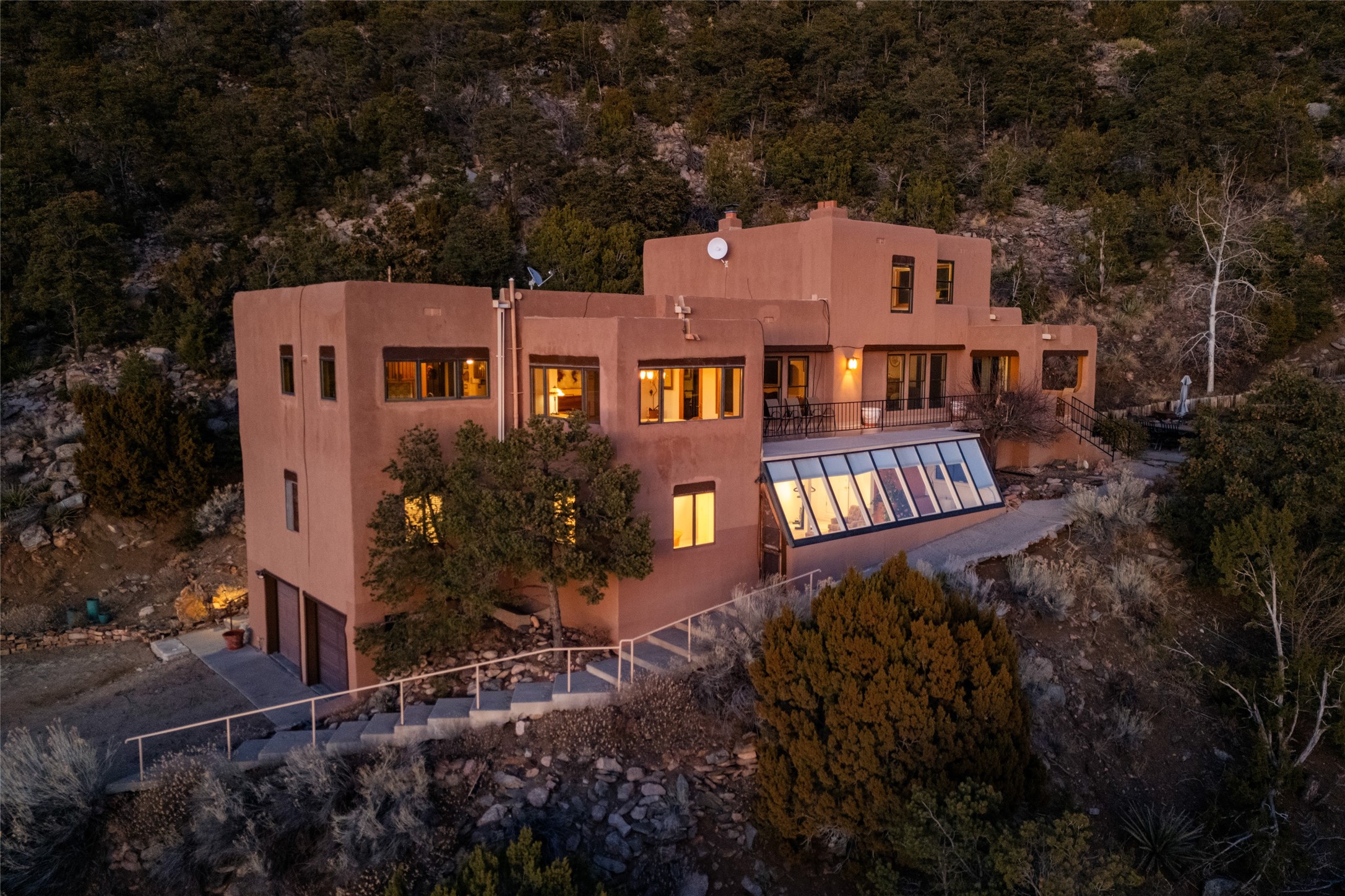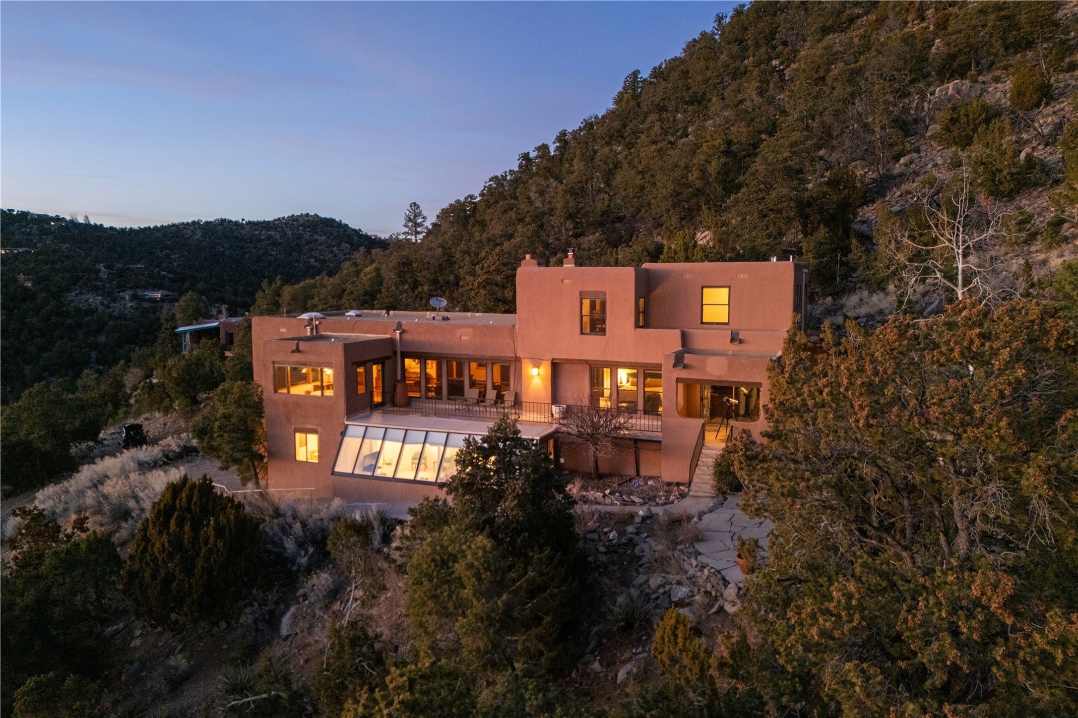 Stunning views, thirteen mountainous acres, an attached guest house, and direct access to boundless trails and National Forest make 39 Overlook an exceptional property. Perched high above Santa Fe just within the gated Overlook subdivision, this multi-level home is designed to savor expansive vistas and inimitable New Mexico sunsets. The over 4,000 square-foot home rises from the mountain side, the 2-car garage at the base, the fully equipped 1BD/1BR casita on the second level, and the main house living levels at the top. Inside the rooms are spacious with oak floors, cherry cabinets, corbels, square cut beams and tongue and groove ceilings. The kitchen enjoys an abundance of natural light with large picture windows framing the expansive basin and mountains beyond. Open to the living room and outfitted with a walk-in pantry and a butler pantry, as well as 6-burner stove, double ovens, counter tops and back splash with artisan tiles, the kitchen will easily accommodate any scale of gathering. The primary bedroom features a corner kiva fireplace and an adjoining sunroom for use as a studio or study, which accesses a covered portal leading to a patio perfect for barbecues and outdoor dining. Two additional rooms on the upper-level function as guest rooms or areas for joint offices, gaming, exercise, art endeavors or study. On the lower level an attached guest house features a wall of glass panels to allow for unobstructed views of the surrounding landscape and passive solar heating. With its own kitchen, dining area, laundry and separate entrance, it is fully self-contained and excellent for guests or as an income generating rental. Here's an opportunity to live in one of the most beautiful settings in Santa Fe. 39 Overlook is peaceful and private - a castle in the air.