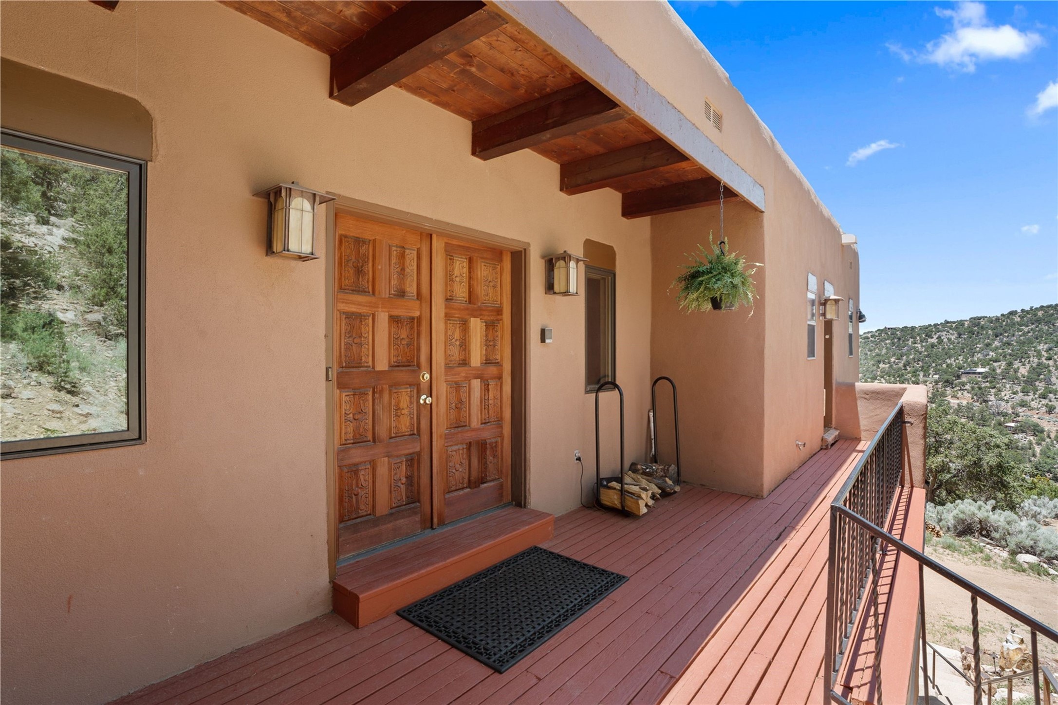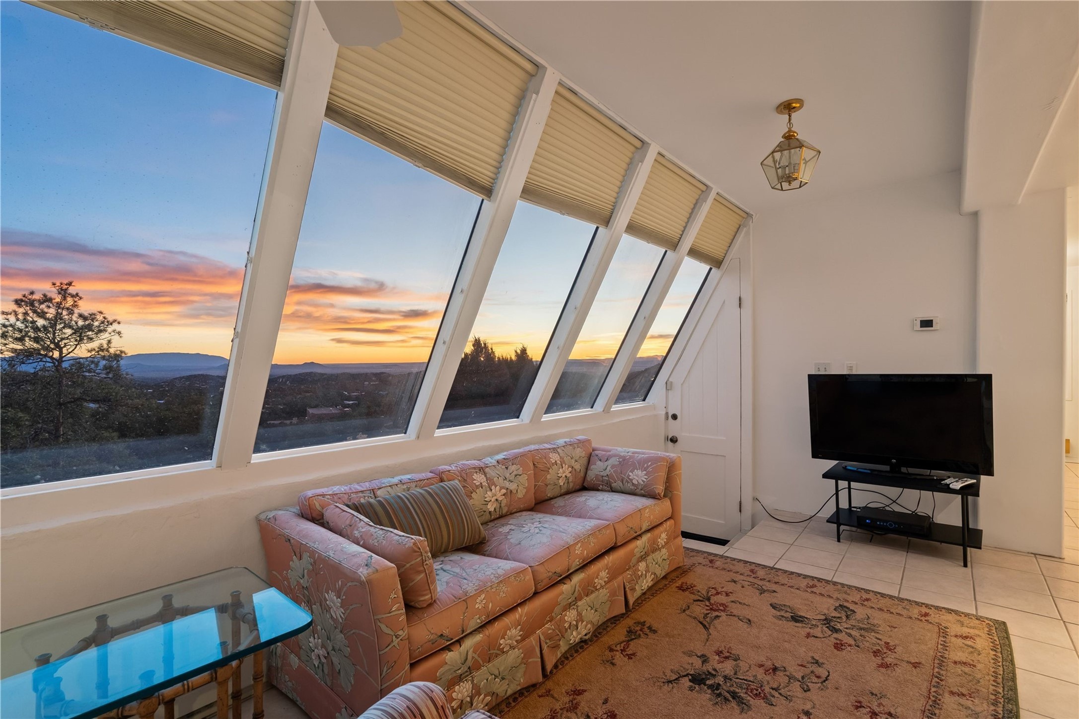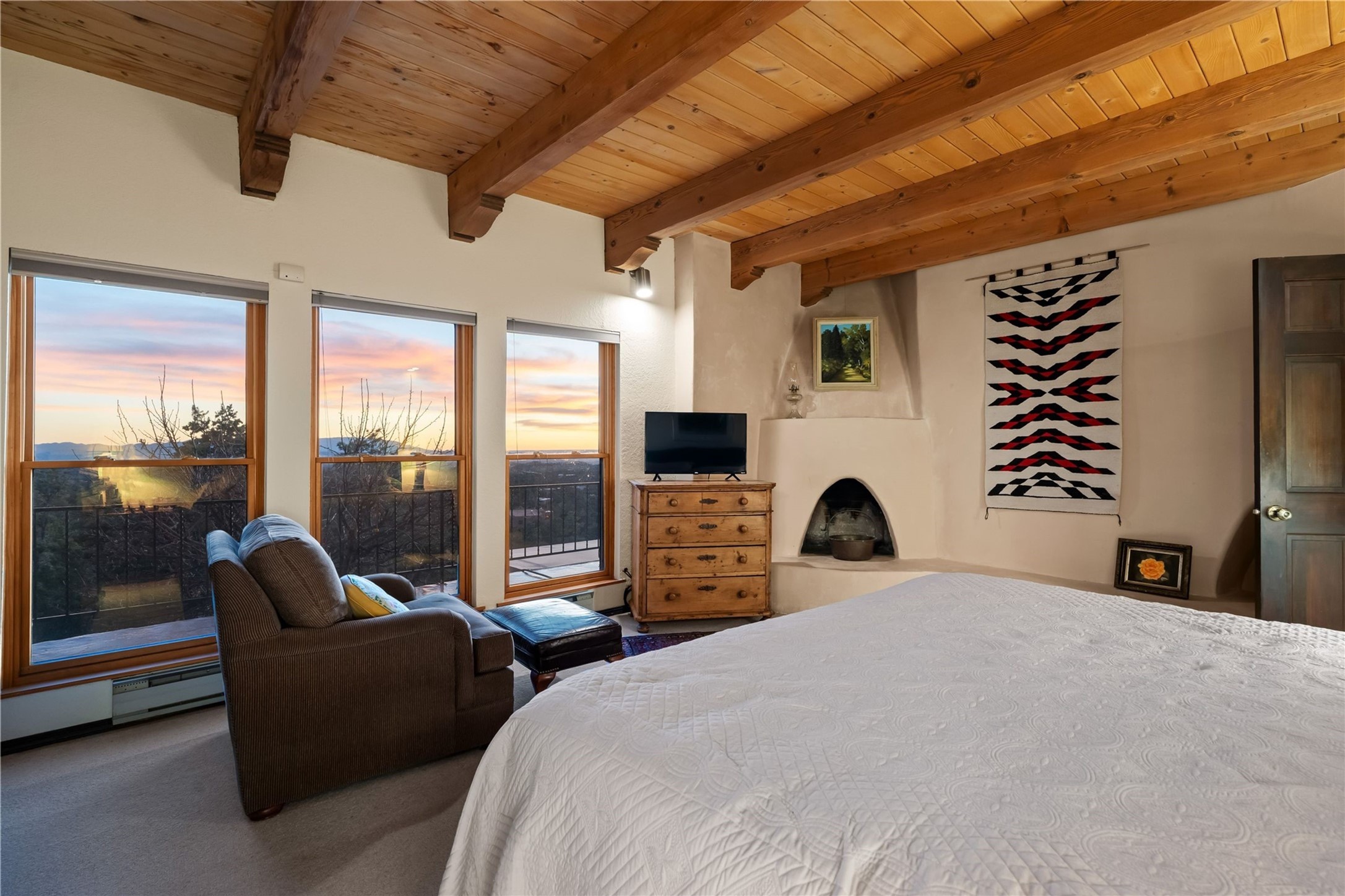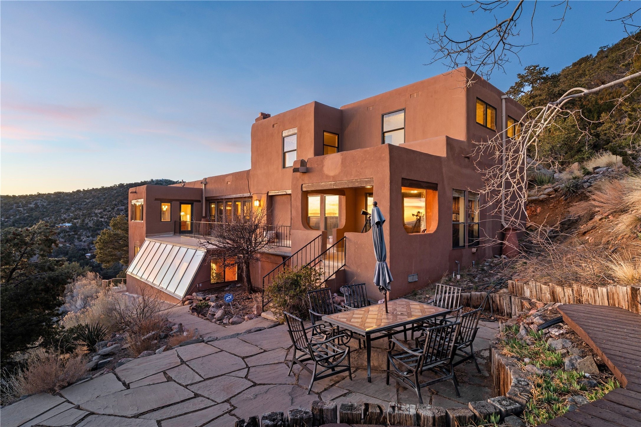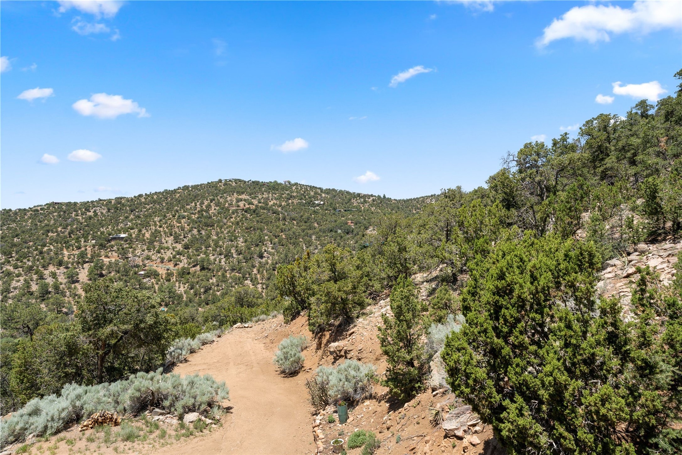 Stunning views, thirteen mountainous acres, an attached guest house, and direct access to boundless trails and National Forest make 39 Overlook an exceptional property. Perched high above Santa Fe just within the gated Overlook subdivision, this multi-level home is designed to savor expansive vistas and inimitable New Mexico sunsets. The over 4,000 square-foot home rises from the mountain side, the 2-car garage at the base, the fully equipped 1BD/1BR casita on the second level, and the main house living levels at the top. Inside the rooms are spacious with oak floors, cherry cabinets, corbels, square cut beams and tongue and groove ceilings. The kitchen enjoys an abundance of natural light with large picture windows framing the expansive basin and mountains beyond. Open to the living room and outfitted with a walk-in pantry and a butler pantry, as well as 6-burner stove, double ovens, counter tops and back splash with artisan tiles, the kitchen will easily accommodate any scale of gathering. The primary bedroom features a corner kiva fireplace and an adjoining sunroom for use as a studio or study, which accesses a covered portal leading to a patio perfect for barbecues and outdoor dining. Two additional rooms on the upper-level function as guest rooms or areas for joint offices, gaming, exercise, art endeavors or study. On the lower level an attached guest house features a wall of glass panels to allow for unobstructed views of the surrounding landscape and passive solar heating. With its own kitchen, dining area, laundry and separate entrance, it is fully self-contained and excellent for guests or as an income generating rental. Here's an opportunity to live in one of the most beautiful settings in Santa Fe. 39 Overlook is peaceful and private - a castle in the air.