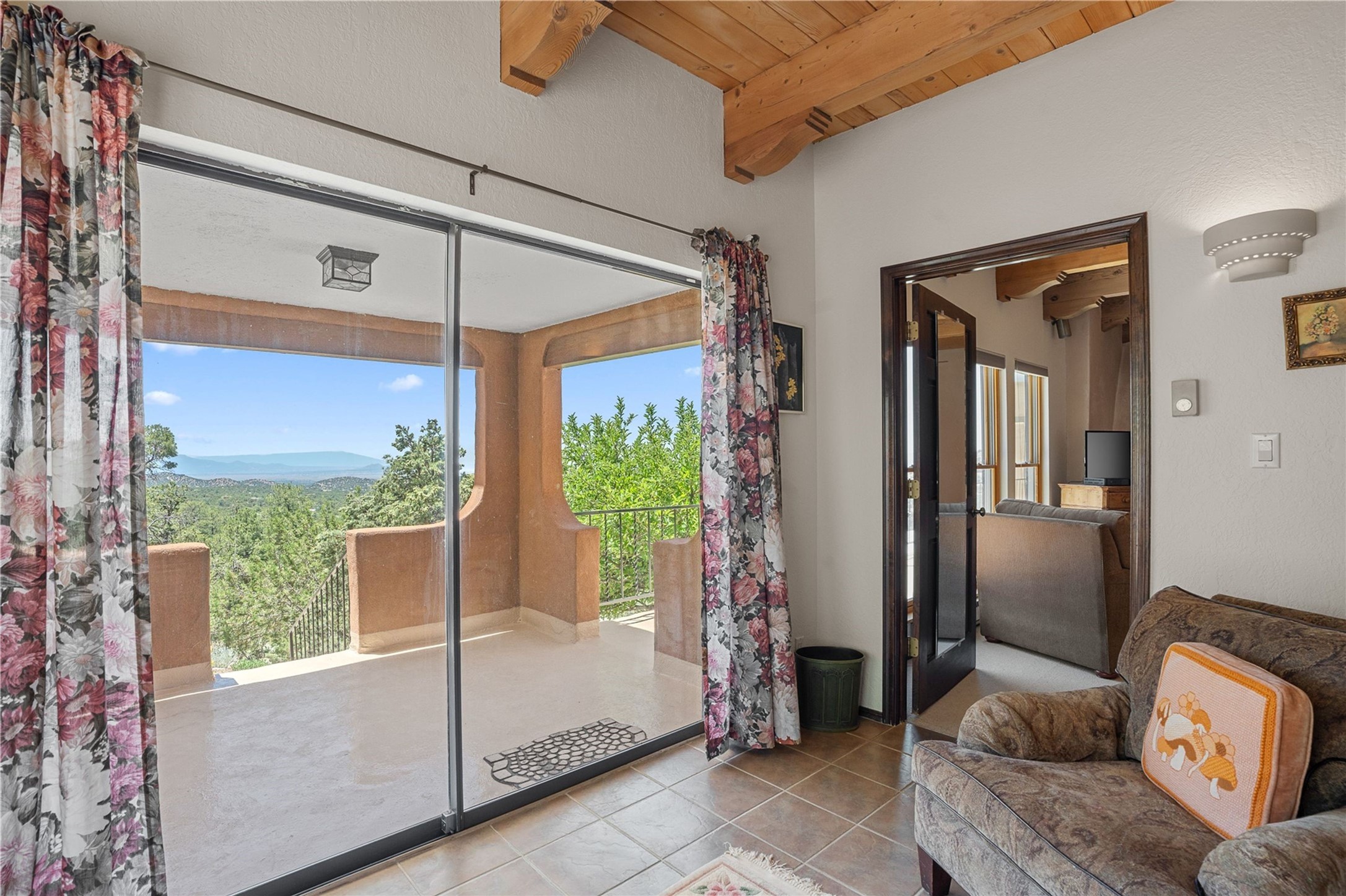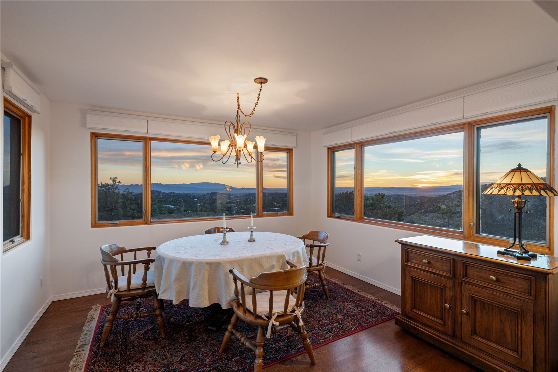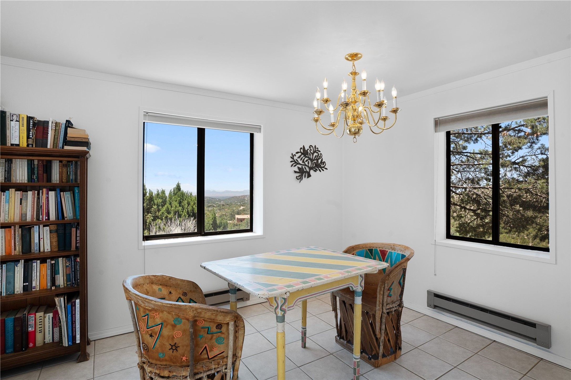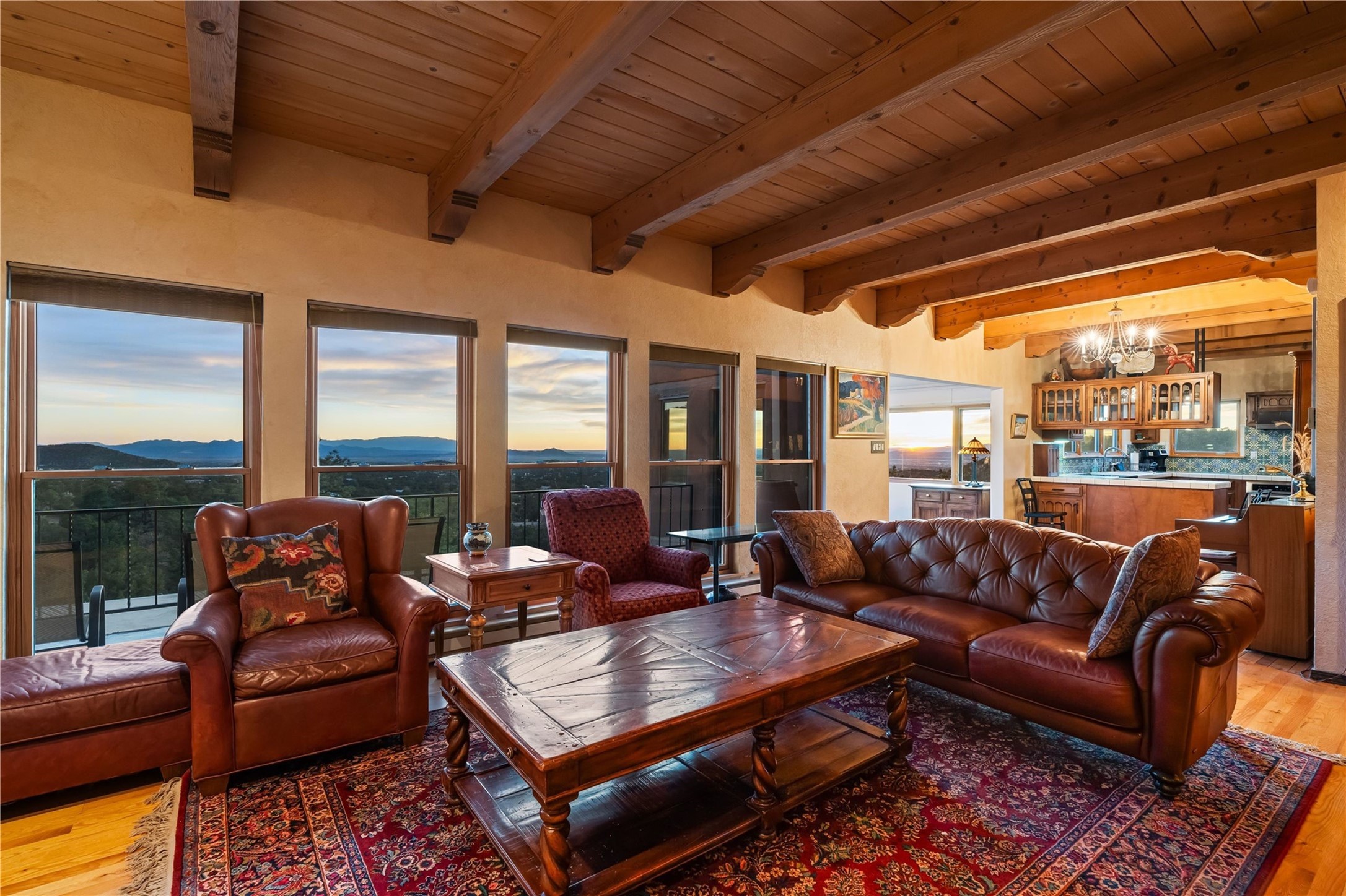 Stunning views, thirteen mountainous acres, an attached guest house, and direct access to boundless trails and National Forest make 39 Overlook an exceptional property. Perched high above Santa Fe just within the gated Overlook subdivision, this multi-level home is designed to savor expansive vistas and inimitable New Mexico sunsets. The over 4,000 square-foot home rises from the mountain side, the 2-car garage at the base, the fully equipped 1BD/1BR casita on the second level, and the main house living levels at the top. Inside the rooms are spacious with oak floors, cherry cabinets, corbels, square cut beams and tongue and groove ceilings. The kitchen enjoys an abundance of natural light with large picture windows framing the expansive basin and mountains beyond. Open to the living room and outfitted with a walk-in pantry and a butler pantry, as well as 6-burner stove, double ovens, counter tops and back splash with artisan tiles, the kitchen will easily accommodate any scale of gathering. The primary bedroom features a corner kiva fireplace and an adjoining sunroom for use as a studio or study, which accesses a covered portal leading to a patio perfect for barbecues and outdoor dining. Two additional rooms on the upper-level function as guest rooms or areas for joint offices, gaming, exercise, art endeavors or study. On the lower level an attached guest house features a wall of glass panels to allow for unobstructed views of the surrounding landscape and passive solar heating. With its own kitchen, dining area, laundry and separate entrance, it is fully self-contained and excellent for guests or as an income generating rental. Here's an opportunity to live in one of the most beautiful settings in Santa Fe. 39 Overlook is peaceful and private - a castle in the air.