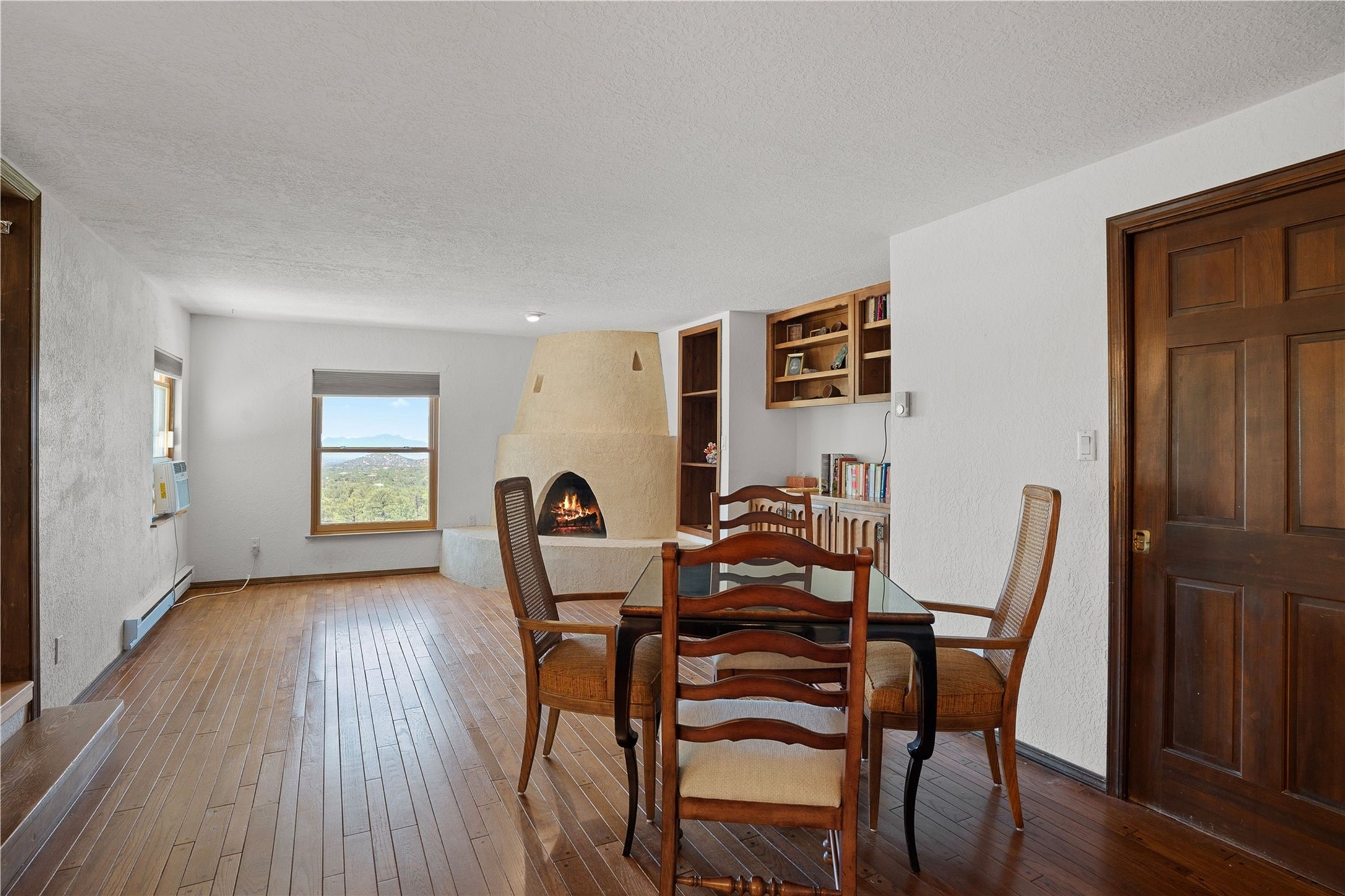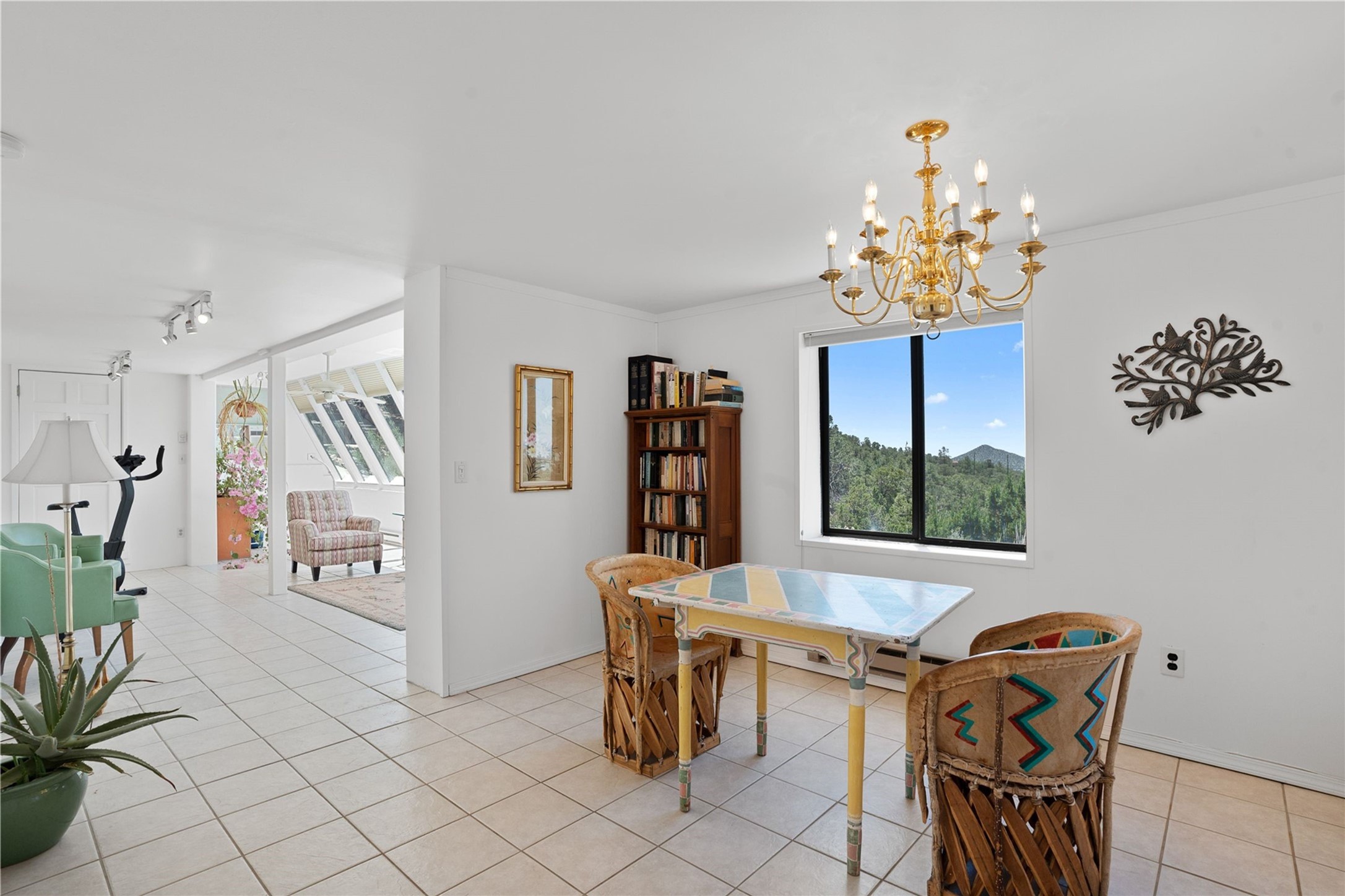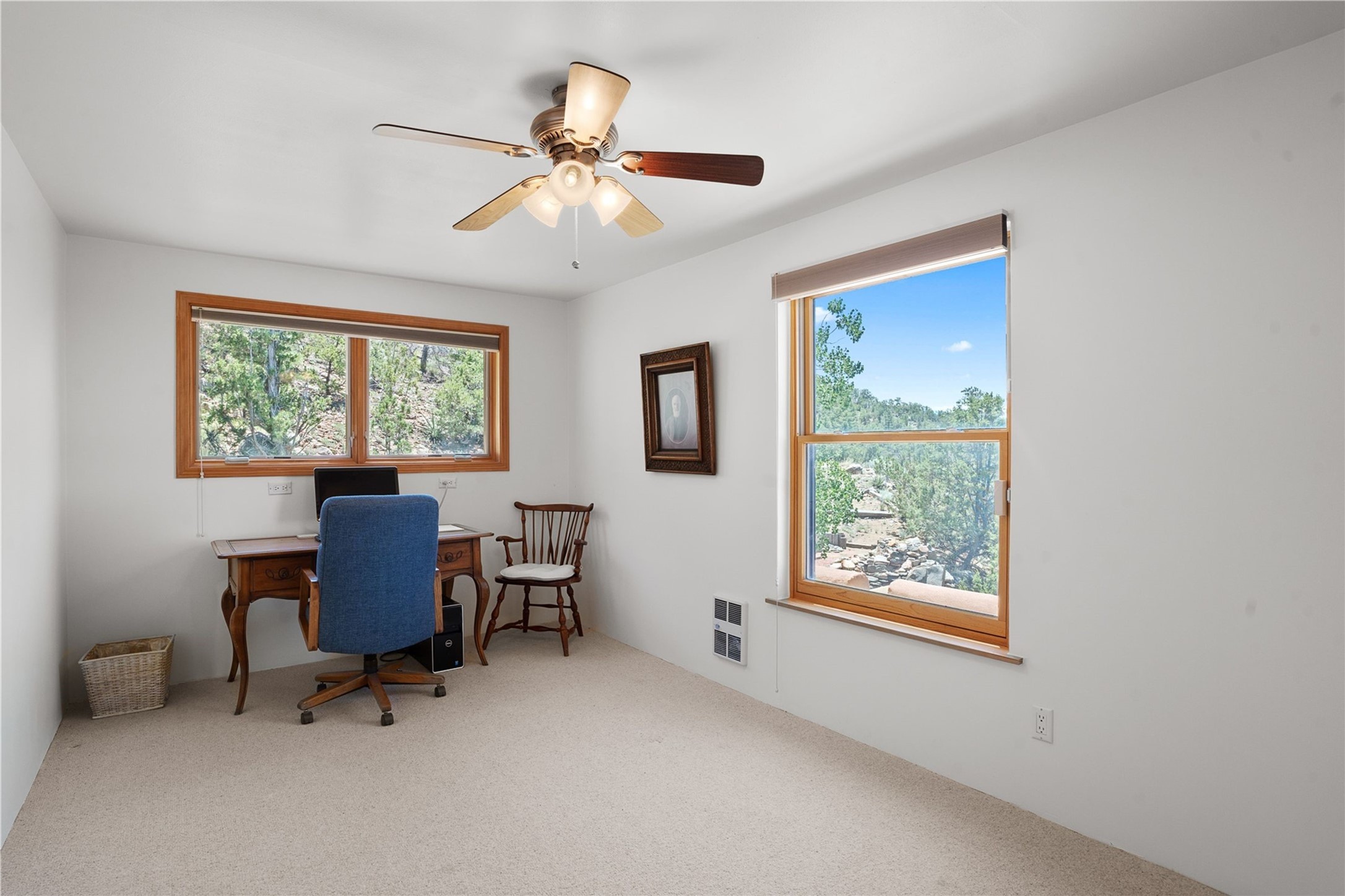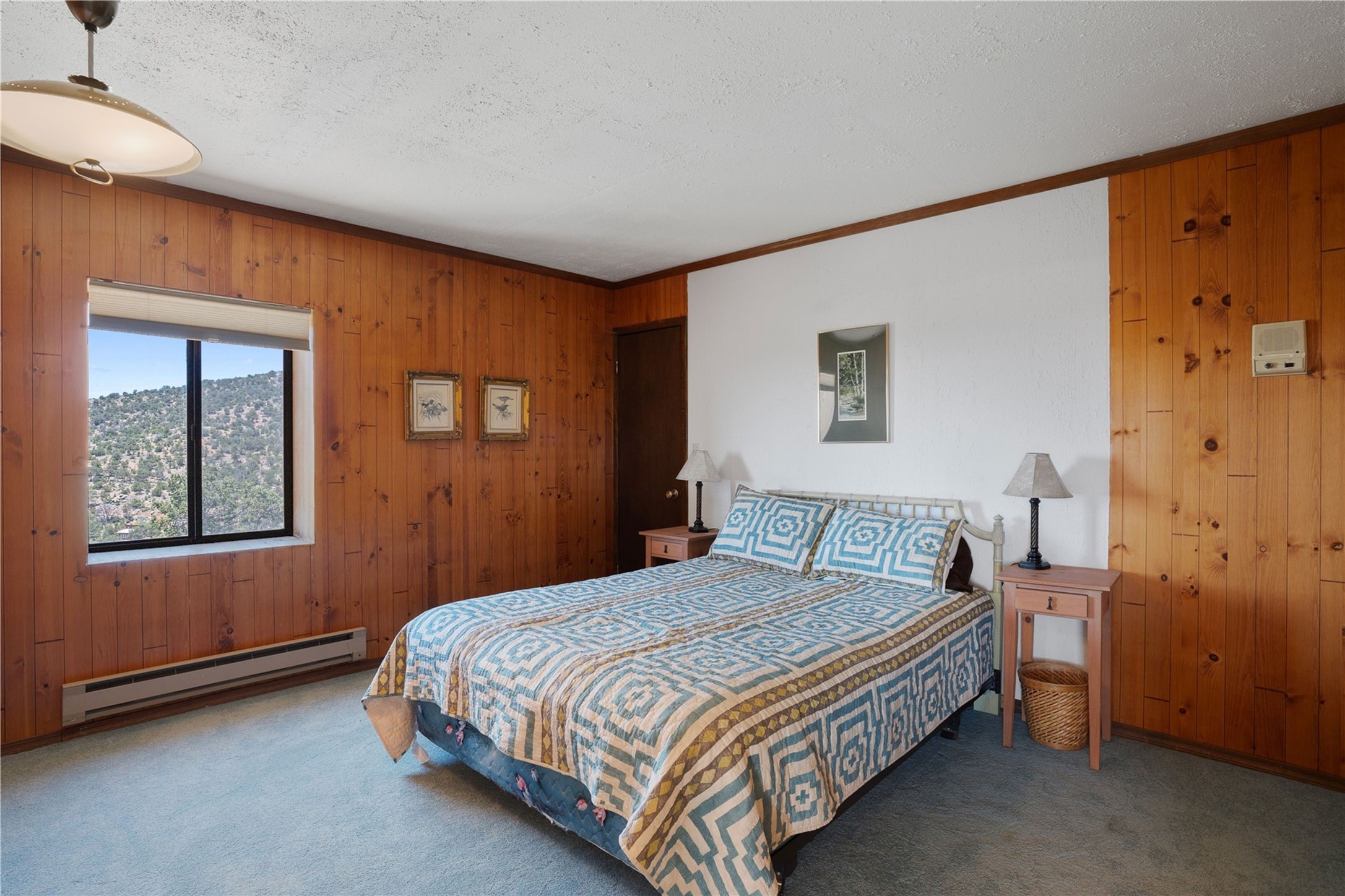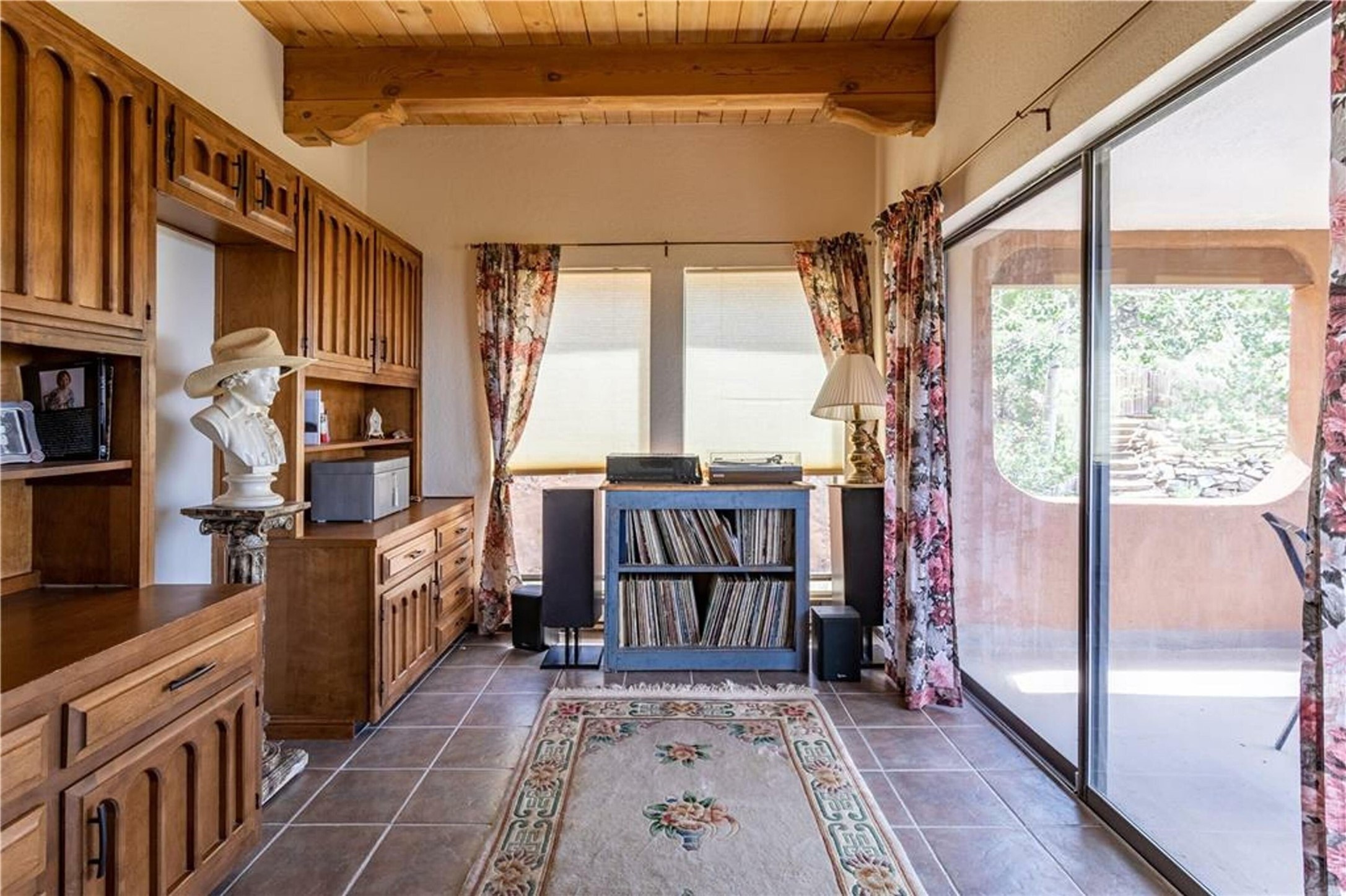 Stunning views, thirteen mountainous acres, an attached guest house, and direct access to boundless trails and National Forest make 39 Overlook an exceptional property. Perched high above Santa Fe just within the gated Overlook subdivision, this multi-level home is designed to savor expansive vistas and inimitable New Mexico sunsets. The over 4,000 square-foot home rises from the mountain side, the 2-car garage at the base, the fully equipped 1BD/1BR casita on the second level, and the main house living levels at the top. Inside the rooms are spacious with oak floors, cherry cabinets, corbels, square cut beams and tongue and groove ceilings. The kitchen enjoys an abundance of natural light with large picture windows framing the expansive basin and mountains beyond. Open to the living room and outfitted with a walk-in pantry and a butler pantry, as well as 6-burner stove, double ovens, counter tops and back splash with artisan tiles, the kitchen will easily accommodate any scale of gathering. The primary bedroom features a corner kiva fireplace and an adjoining sunroom for use as a studio or study, which accesses a covered portal leading to a patio perfect for barbecues and outdoor dining. Two additional rooms on the upper-level function as guest rooms or areas for joint offices, gaming, exercise, art endeavors or study. On the lower level an attached guest house features a wall of glass panels to allow for unobstructed views of the surrounding landscape and passive solar heating. With its own kitchen, dining area, laundry and separate entrance, it is fully self-contained and excellent for guests or as an income generating rental. Here's an opportunity to live in one of the most beautiful settings in Santa Fe. 39 Overlook is peaceful and private - a castle in the air.