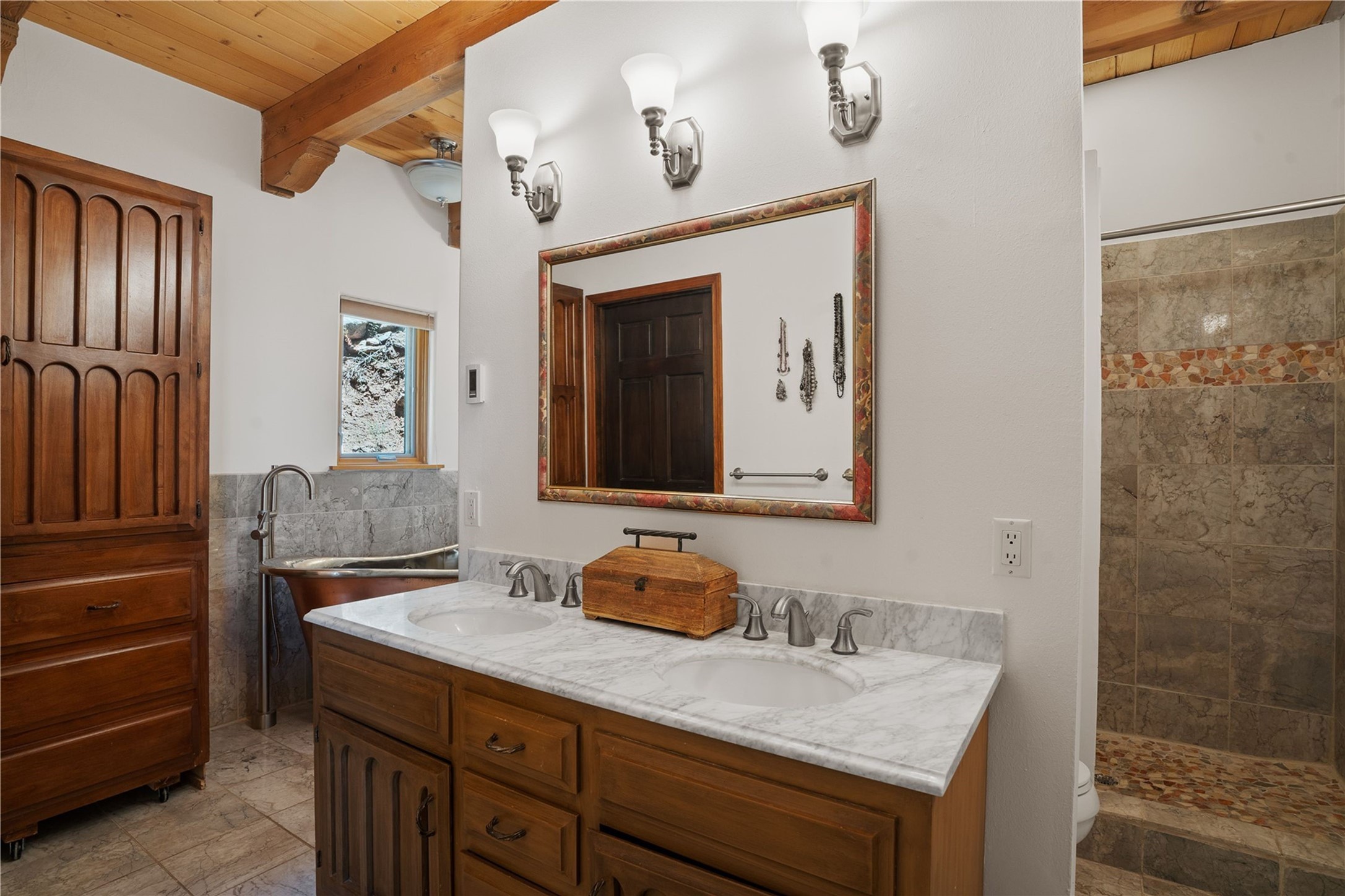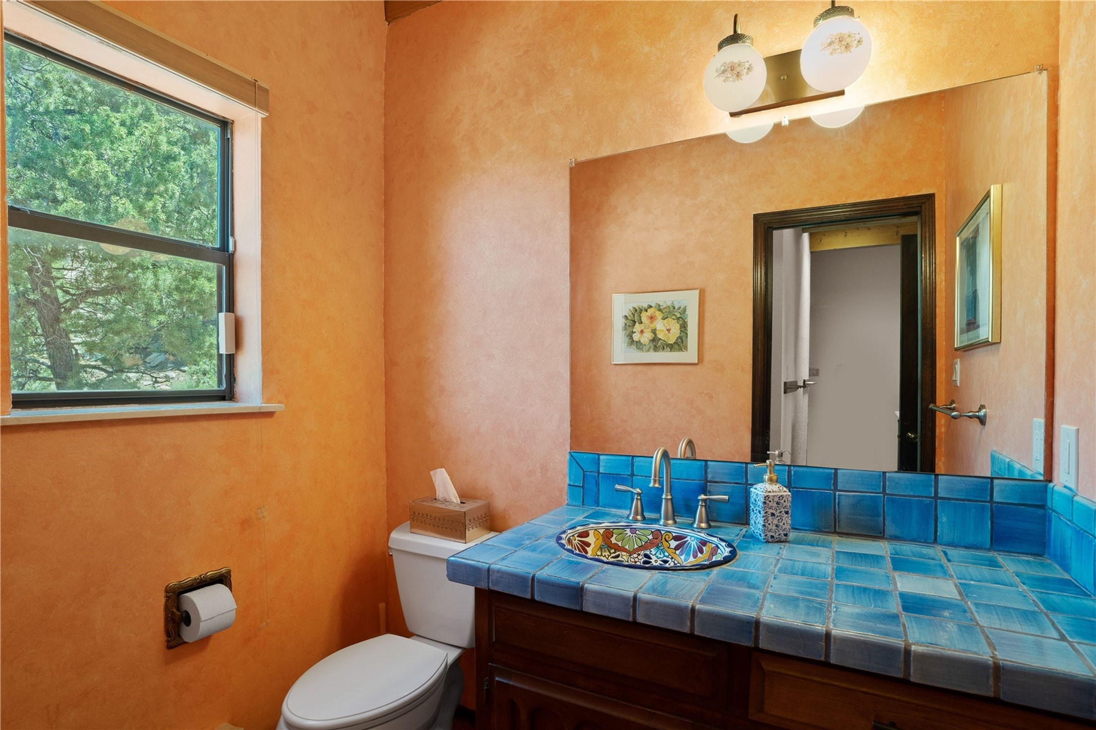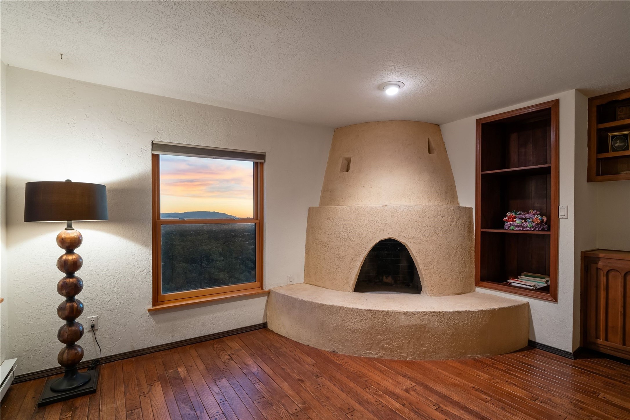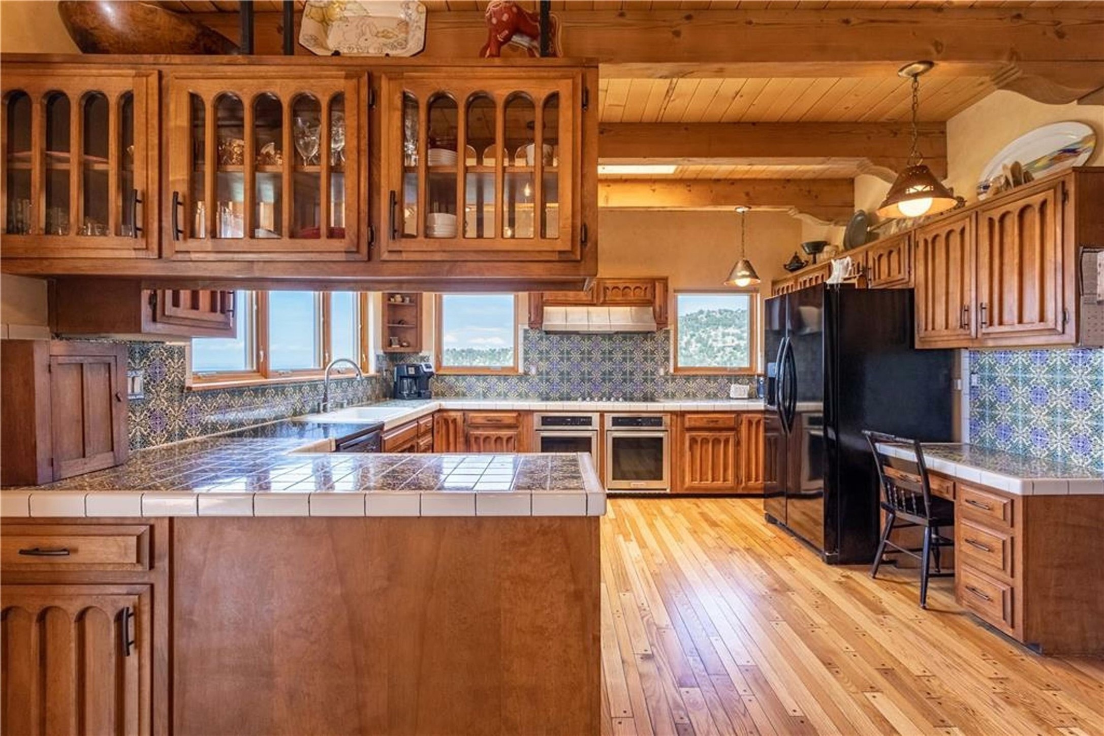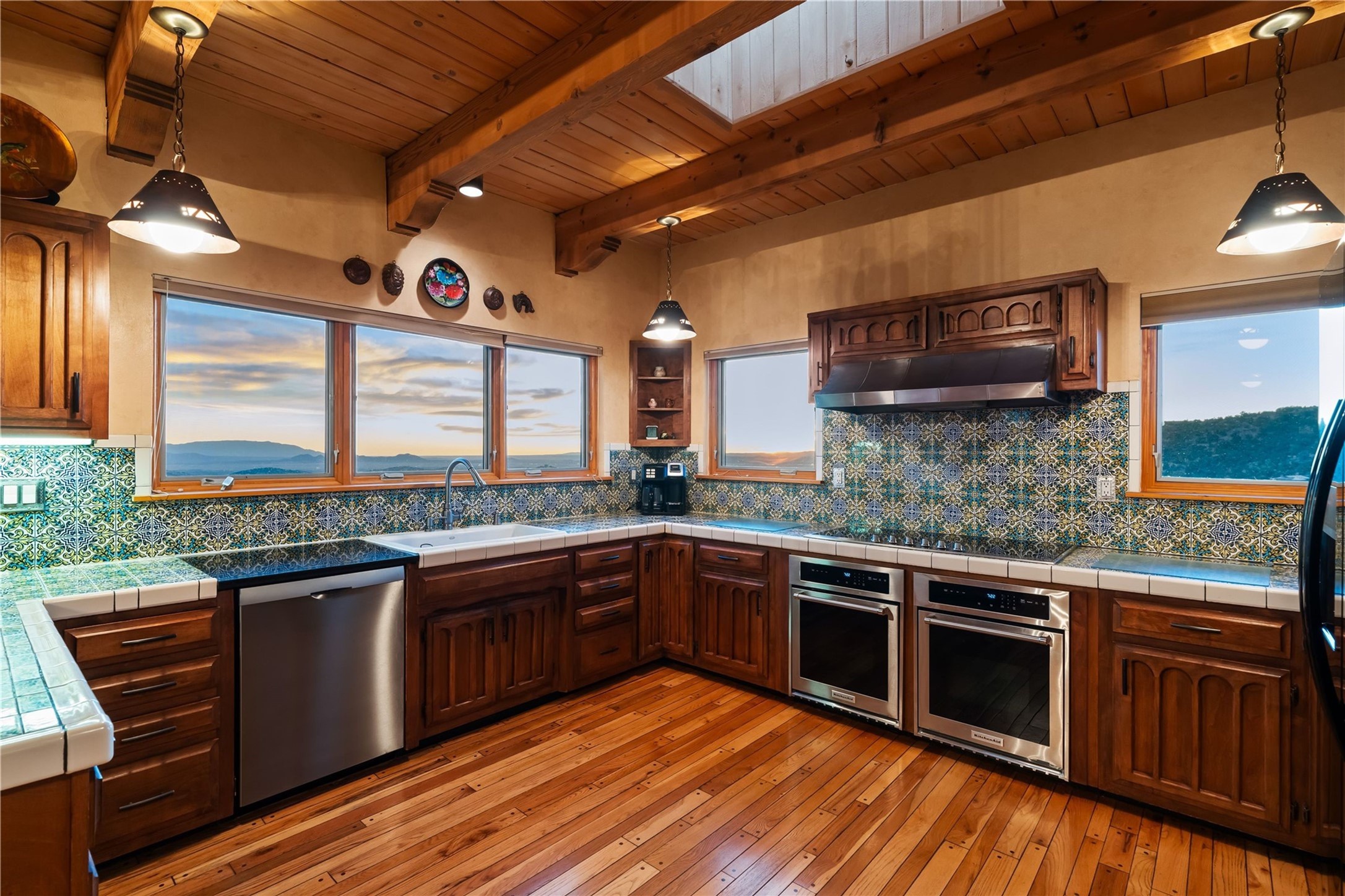 Stunning views, thirteen mountainous acres, an attached guest house, and direct access to boundless trails and National Forest make 39 Overlook an exceptional property. Perched high above Santa Fe just within the gated Overlook subdivision, this multi-level home is designed to savor expansive vistas and inimitable New Mexico sunsets. The over 4,000 square-foot home rises from the mountain side, the 2-car garage at the base, the fully equipped 1BD/1BR casita on the second level, and the main house living levels at the top. Inside the rooms are spacious with oak floors, cherry cabinets, corbels, square cut beams and tongue and groove ceilings. The kitchen enjoys an abundance of natural light with large picture windows framing the expansive basin and mountains beyond. Open to the living room and outfitted with a walk-in pantry and a butler pantry, as well as 6-burner stove, double ovens, counter tops and back splash with artisan tiles, the kitchen will easily accommodate any scale of gathering. The primary bedroom features a corner kiva fireplace and an adjoining sunroom for use as a studio or study, which accesses a covered portal leading to a patio perfect for barbecues and outdoor dining. Two additional rooms on the upper-level function as guest rooms or areas for joint offices, gaming, exercise, art endeavors or study. On the lower level an attached guest house features a wall of glass panels to allow for unobstructed views of the surrounding landscape and passive solar heating. With its own kitchen, dining area, laundry and separate entrance, it is fully self-contained and excellent for guests or as an income generating rental. Here's an opportunity to live in one of the most beautiful settings in Santa Fe. 39 Overlook is peaceful and private - a castle in the air.