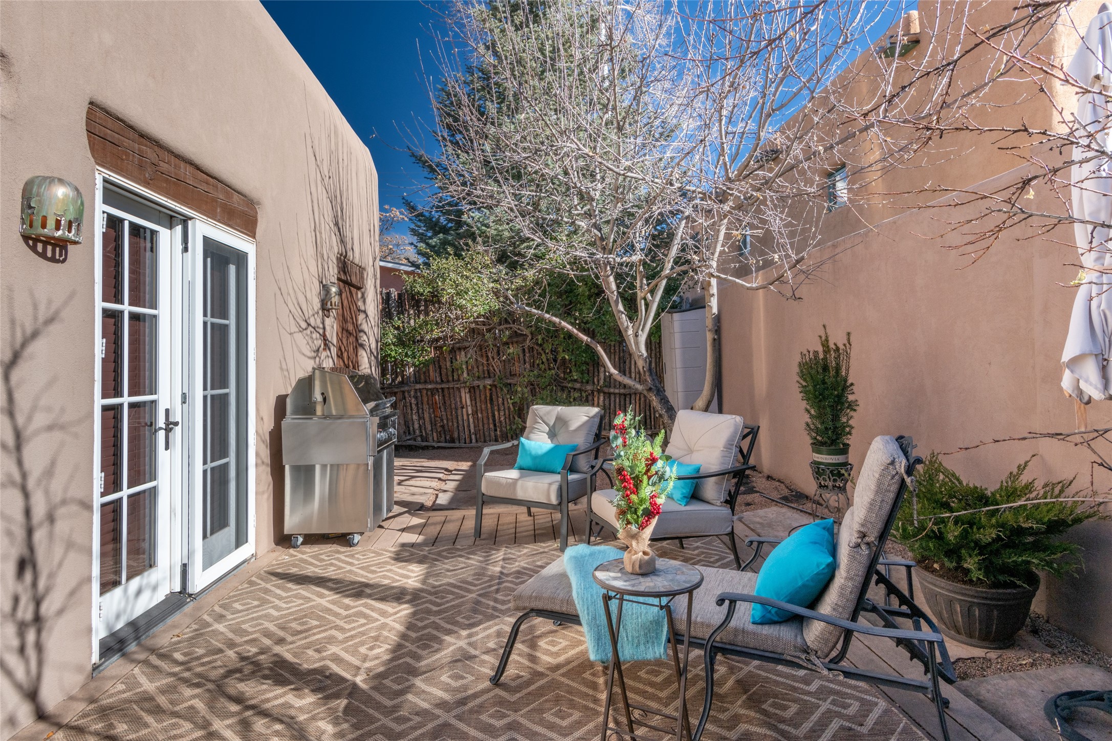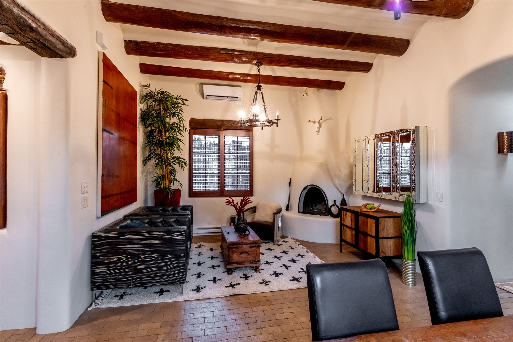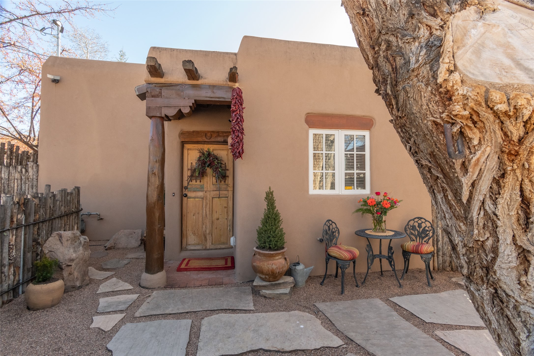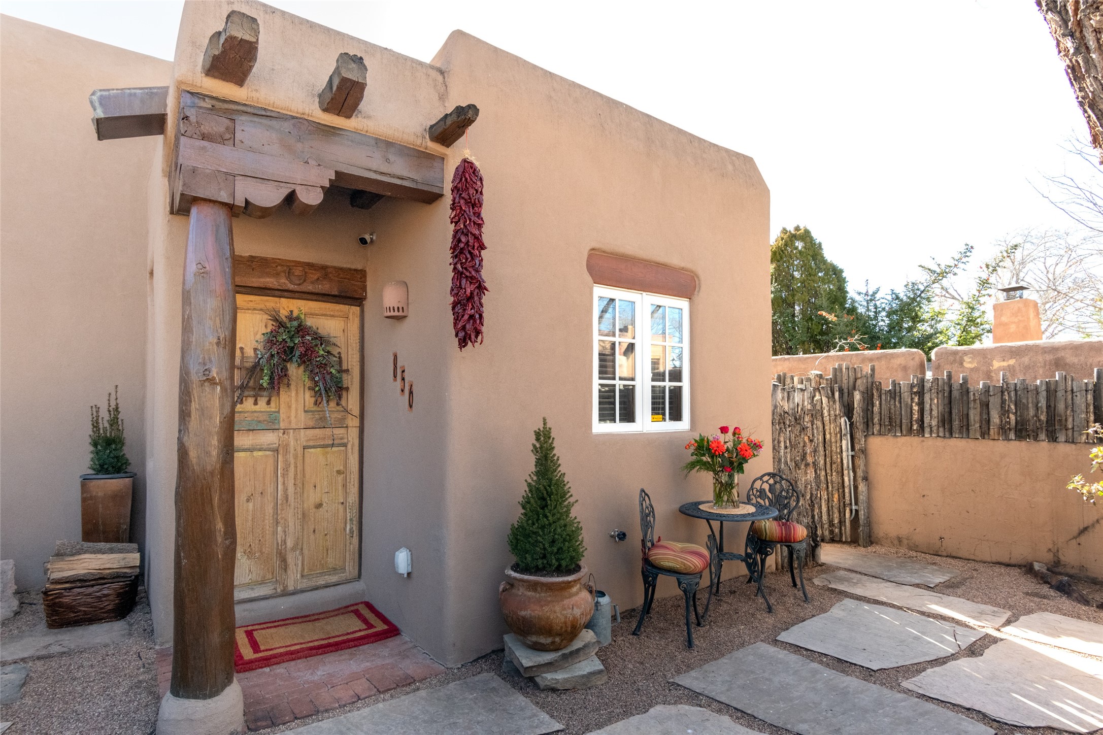 Experience timeless charm on Santa Fe's Historic Palace Avenue, where centuries-old trees frame this dream-come-true freestanding home in the prestigious East Side Neighborhood. Located behind curbside homes, surrounded by hidden courtyards and mature fruit trees, there is an oasis of privacy. At this prime location, enjoy being two blocks from the galleries and restaurants of Canyon Road, taking morning nature walks on the trails of the Santa Fe River Park, and easy access to downtown. This modern adobe-style home boasts beautifully coved high viga ceilings, a kiva fireplace, local brick floors, and hand plastered walls in the living area. Custom reclaimed wood doors open to each room and French doors in the second bedroom or office open to the private courtyards. The kitchen features custom cabinetry, butcher block countertops, Kitchen Aid stainless steel appliances and new Kohler fixtures. In the dual basin bath, there are contemporary slate tiles, new Kohler fixtures, and a new Toto toilet. Other updates include custom wood window coverings, three Fujitsu mini splits, baseboard heaters, a new 50-gallon Rheem water heater, and a new sewer line. This elegant cozy adobe is offered turn-key ready, it is freshly painted with designer curated furnishings, simply inquire if interested (some personal items excluded). No HOA.