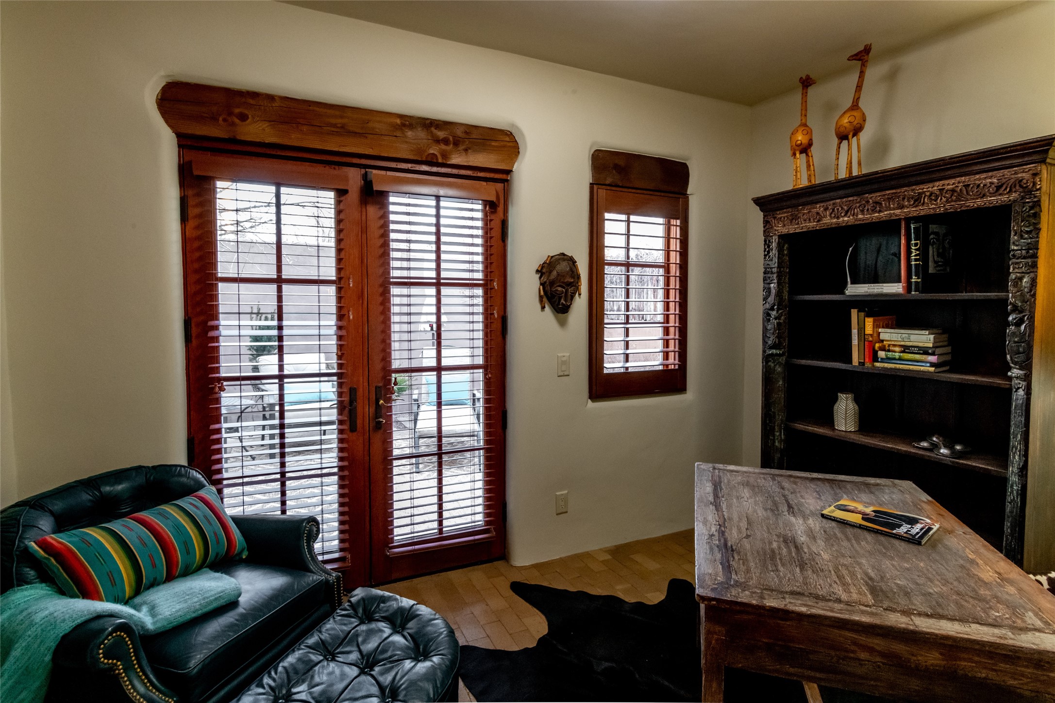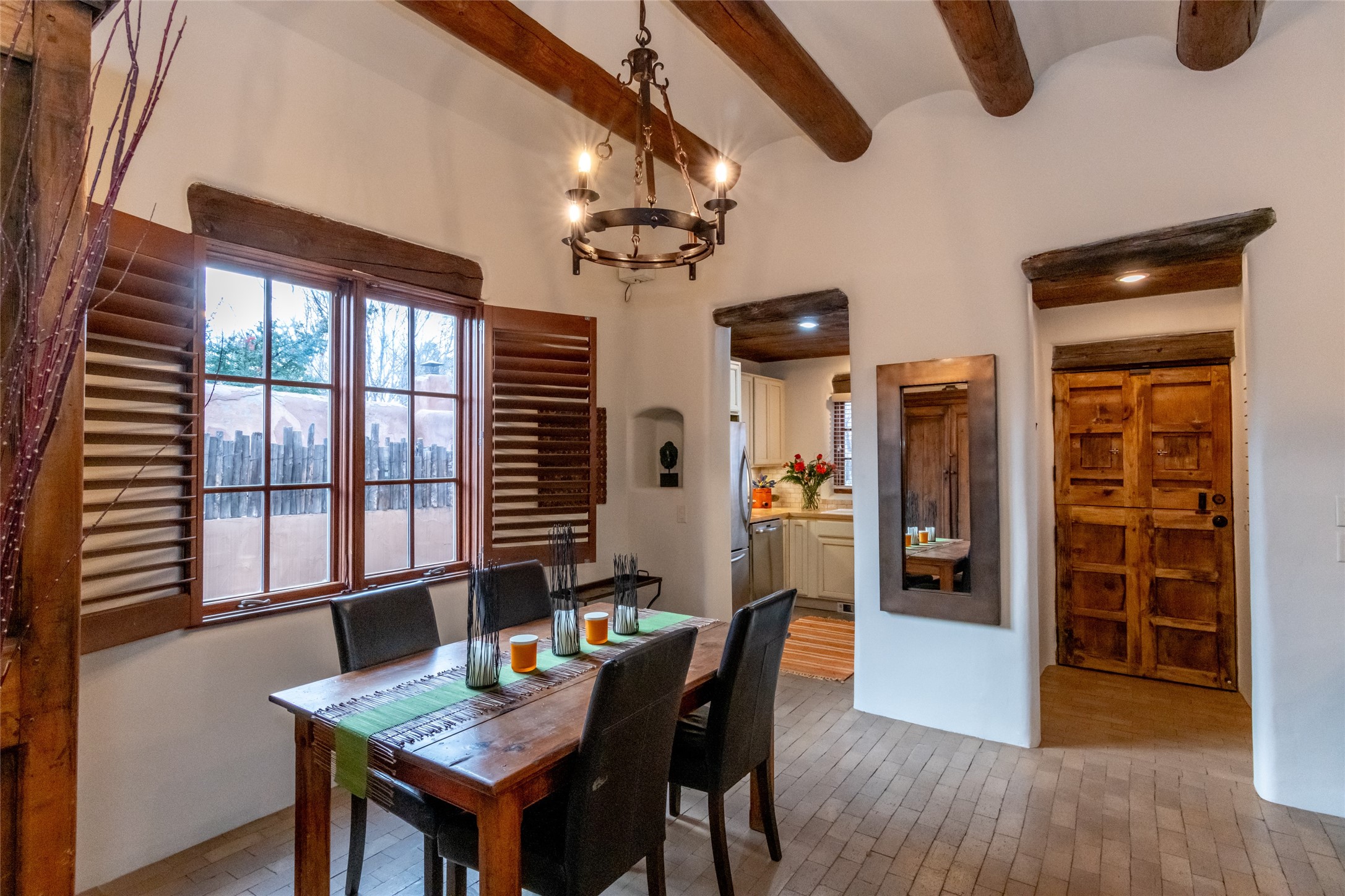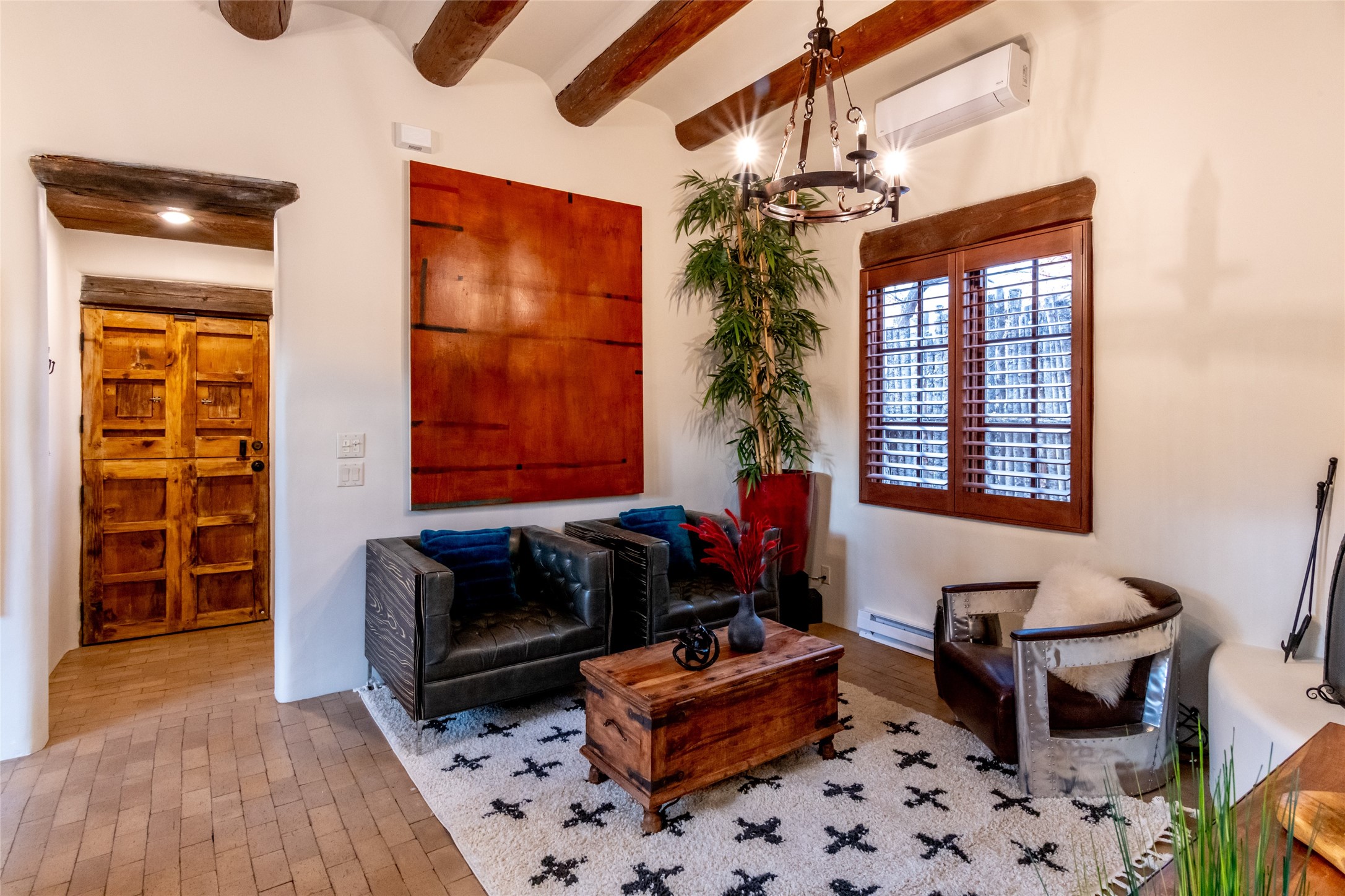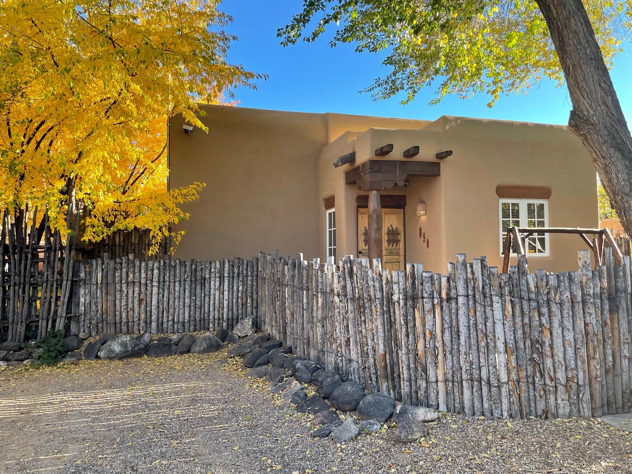 Experience timeless charm on Santa Fe's Historic Palace Avenue, where centuries-old trees frame this dream-come-true freestanding home in the prestigious East Side Neighborhood. Located behind curbside homes, surrounded by hidden courtyards and mature fruit trees, there is an oasis of privacy. At this prime location, enjoy being two blocks from the galleries and restaurants of Canyon Road, taking morning nature walks on the trails of the Santa Fe River Park, and easy access to downtown. This modern adobe-style home boasts beautifully coved high viga ceilings, a kiva fireplace, local brick floors, and hand plastered walls in the living area. Custom reclaimed wood doors open to each room and French doors in the second bedroom or office open to the private courtyards. The kitchen features custom cabinetry, butcher block countertops, Kitchen Aid stainless steel appliances and new Kohler fixtures. In the dual basin bath, there are contemporary slate tiles, new Kohler fixtures, and a new Toto toilet. Other updates include custom wood window coverings, three Fujitsu mini splits, baseboard heaters, a new 50-gallon Rheem water heater, and a new sewer line. This elegant cozy adobe is offered turn-key ready, it is freshly painted with designer curated furnishings, simply inquire if interested (some personal items excluded). No HOA.