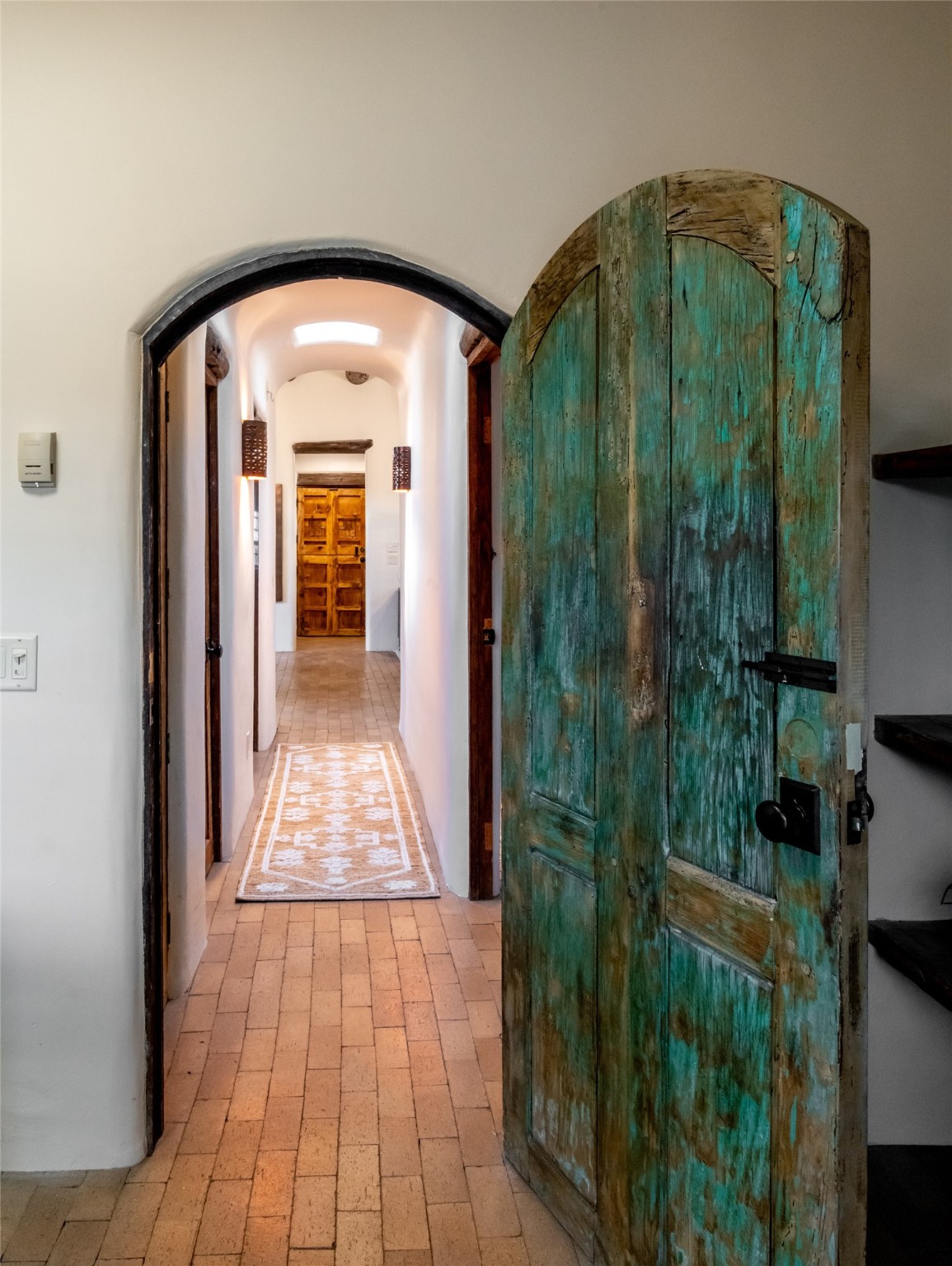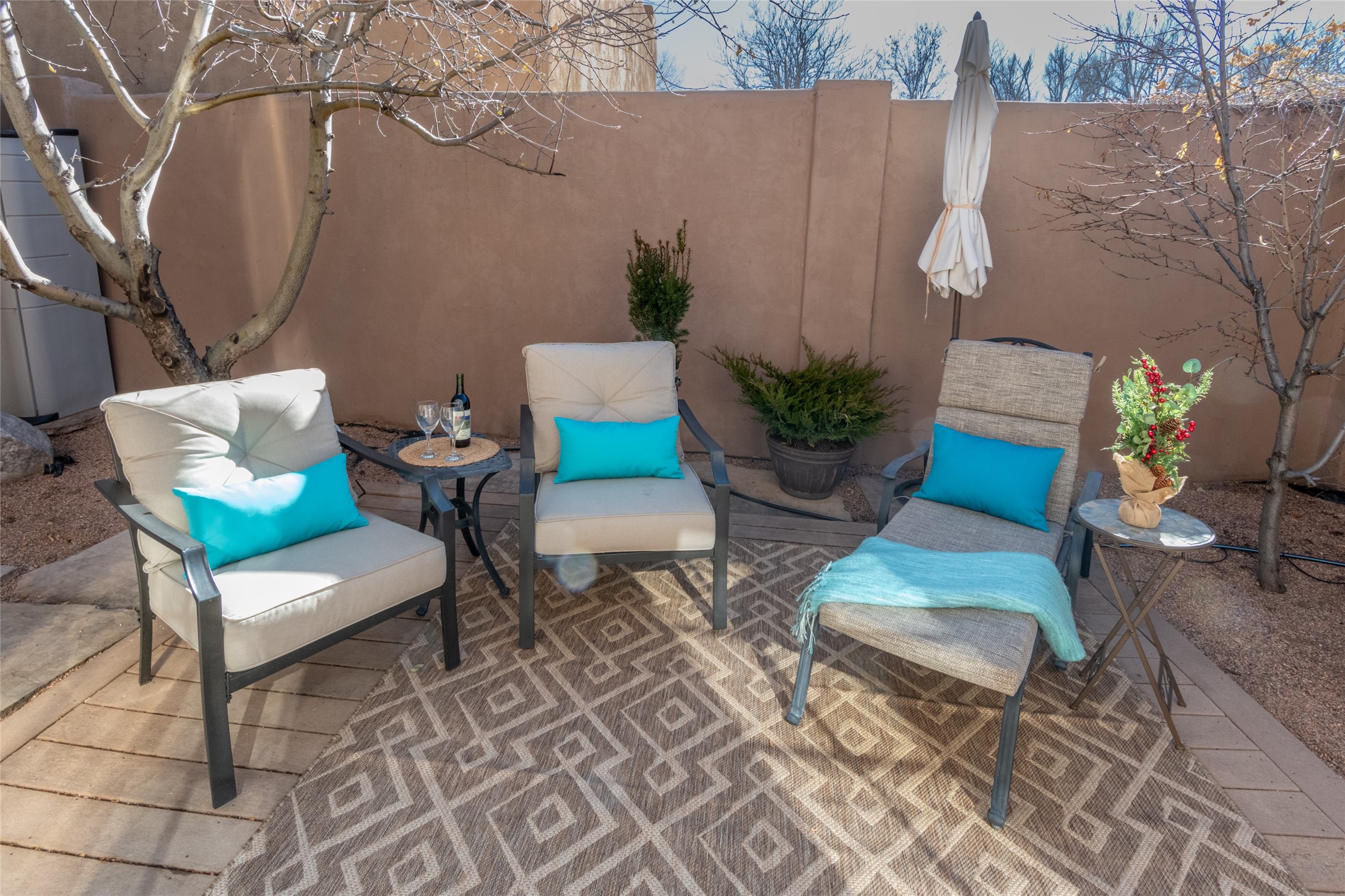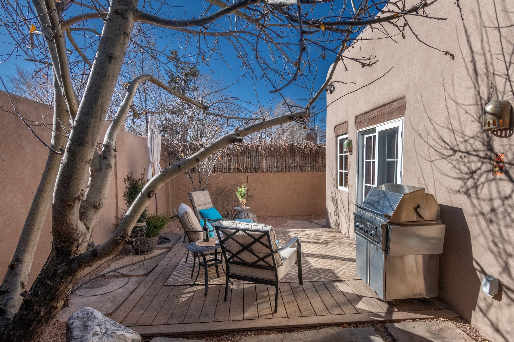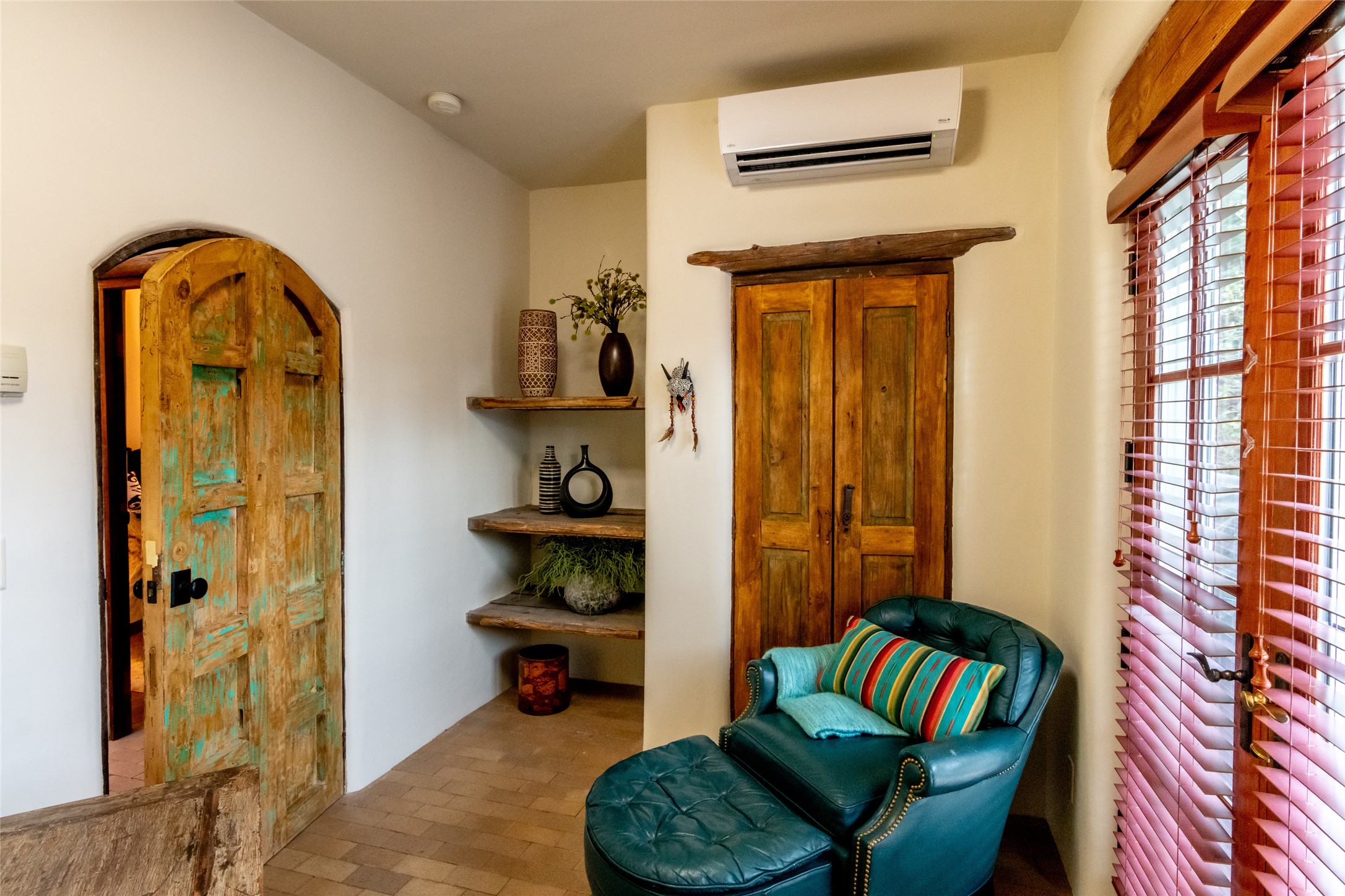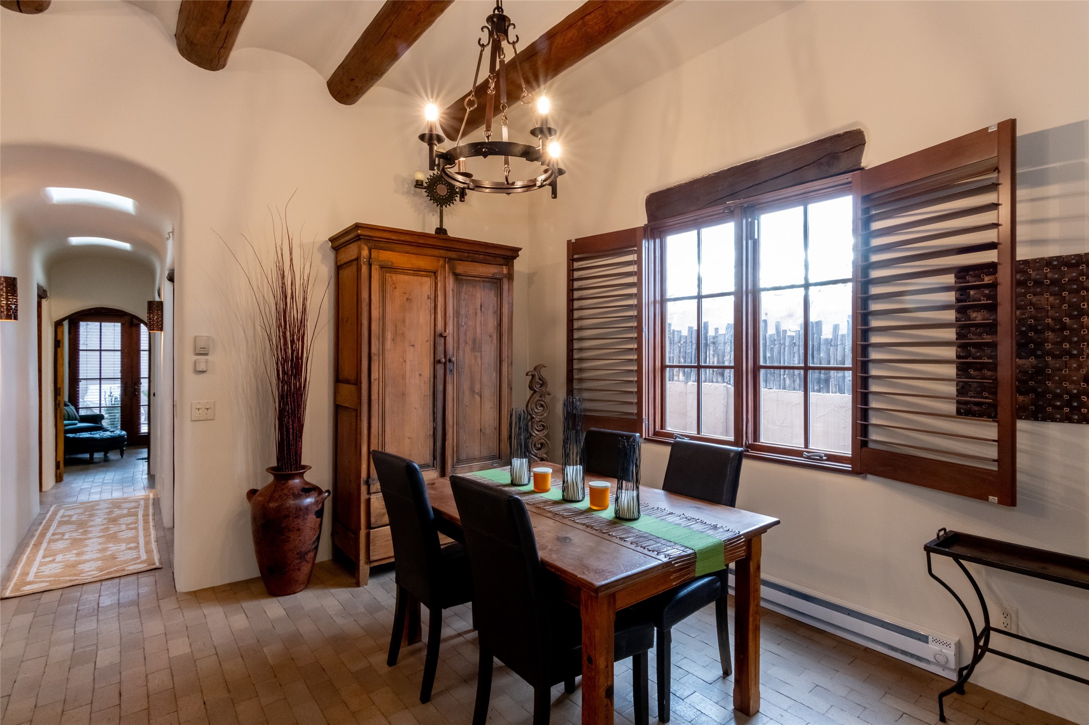 Experience timeless charm on Santa Fe's Historic Palace Avenue, where centuries-old trees frame this dream-come-true freestanding home in the prestigious East Side Neighborhood. Located behind curbside homes, surrounded by hidden courtyards and mature fruit trees, there is an oasis of privacy. At this prime location, enjoy being two blocks from the galleries and restaurants of Canyon Road, taking morning nature walks on the trails of the Santa Fe River Park, and easy access to downtown. This modern adobe-style home boasts beautifully coved high viga ceilings, a kiva fireplace, local brick floors, and hand plastered walls in the living area. Custom reclaimed wood doors open to each room and French doors in the second bedroom or office open to the private courtyards. The kitchen features custom cabinetry, butcher block countertops, Kitchen Aid stainless steel appliances and new Kohler fixtures. In the dual basin bath, there are contemporary slate tiles, new Kohler fixtures, and a new Toto toilet. Other updates include custom wood window coverings, three Fujitsu mini splits, baseboard heaters, a new 50-gallon Rheem water heater, and a new sewer line. This elegant cozy adobe is offered turn-key ready, it is freshly painted with designer curated furnishings, simply inquire if interested (some personal items excluded). No HOA.