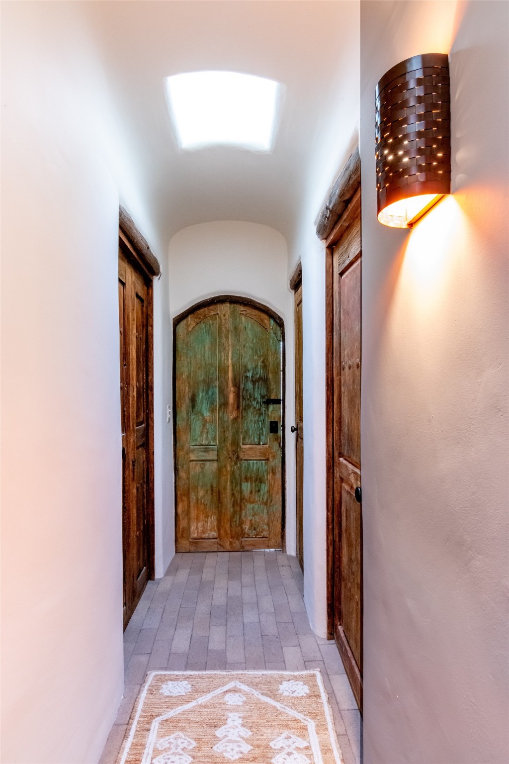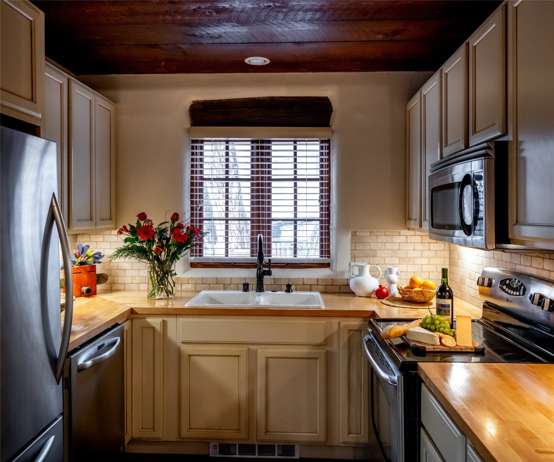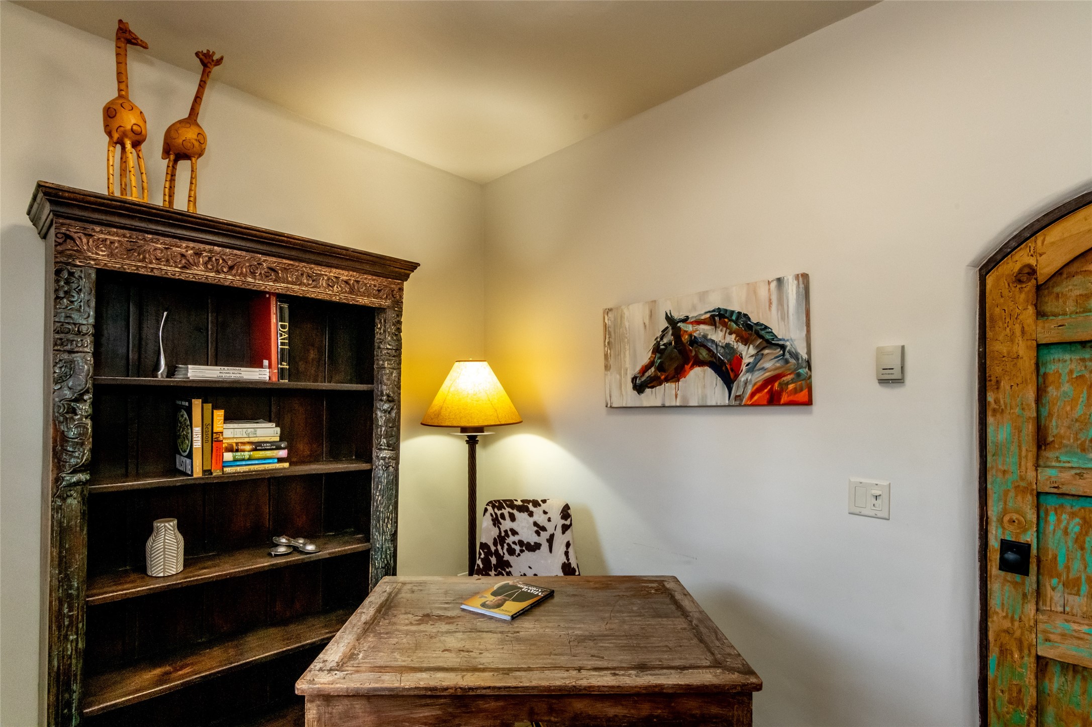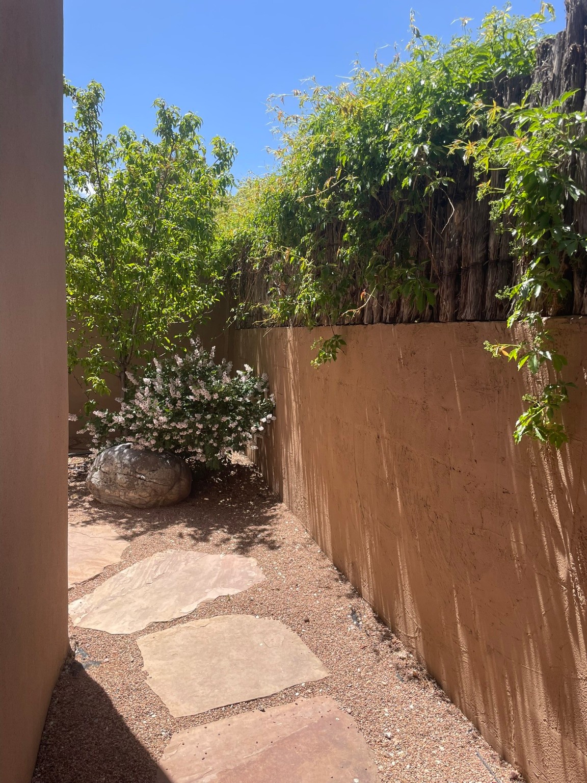 Experience timeless charm on Santa Fe's Historic Palace Avenue, where centuries-old trees frame this dream-come-true freestanding home in the prestigious East Side Neighborhood. Located behind curbside homes, surrounded by hidden courtyards and mature fruit trees, there is an oasis of privacy. At this prime location, enjoy being two blocks from the galleries and restaurants of Canyon Road, taking morning nature walks on the trails of the Santa Fe River Park, and easy access to downtown. This modern adobe-style home boasts beautifully coved high viga ceilings, a kiva fireplace, local brick floors, and hand plastered walls in the living area. Custom reclaimed wood doors open to each room and French doors in the second bedroom or office open to the private courtyards. The kitchen features custom cabinetry, butcher block countertops, Kitchen Aid stainless steel appliances and new Kohler fixtures. In the dual basin bath, there are contemporary slate tiles, new Kohler fixtures, and a new Toto toilet. Other updates include custom wood window coverings, three Fujitsu mini splits, baseboard heaters, a new 50-gallon Rheem water heater, and a new sewer line. This elegant cozy adobe is offered turn-key ready, it is freshly painted with designer curated furnishings, simply inquire if interested (some personal items excluded). No HOA.