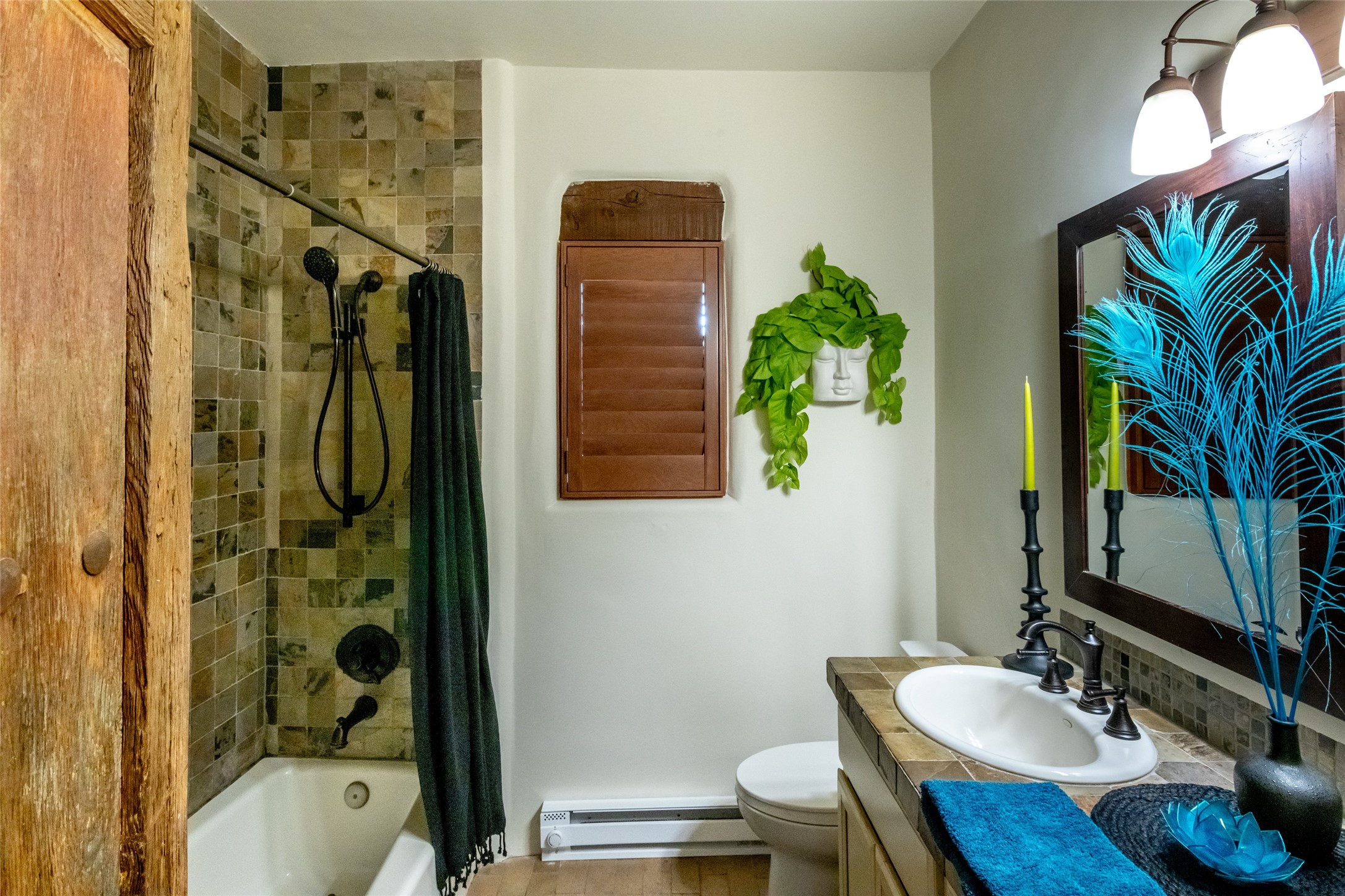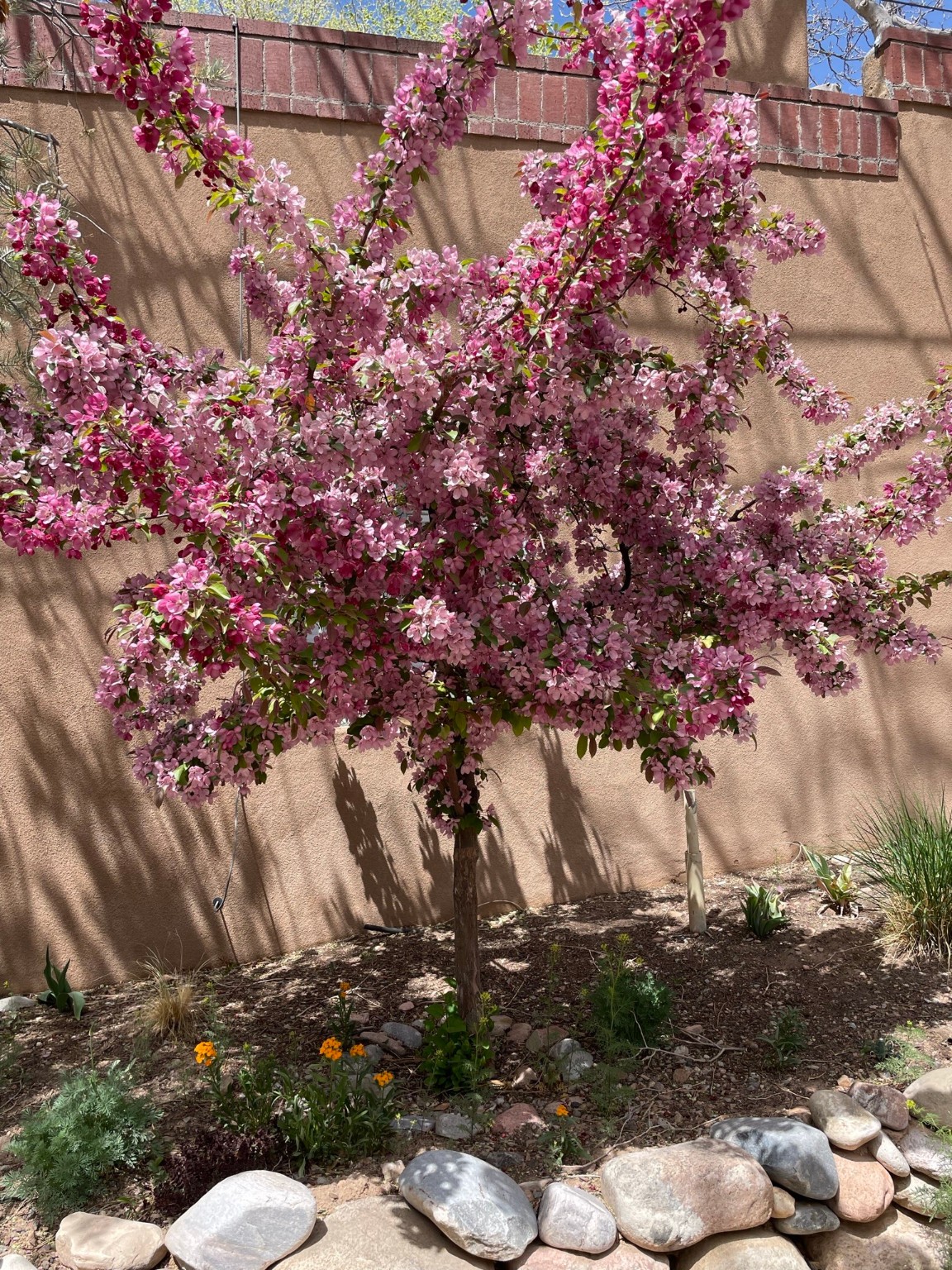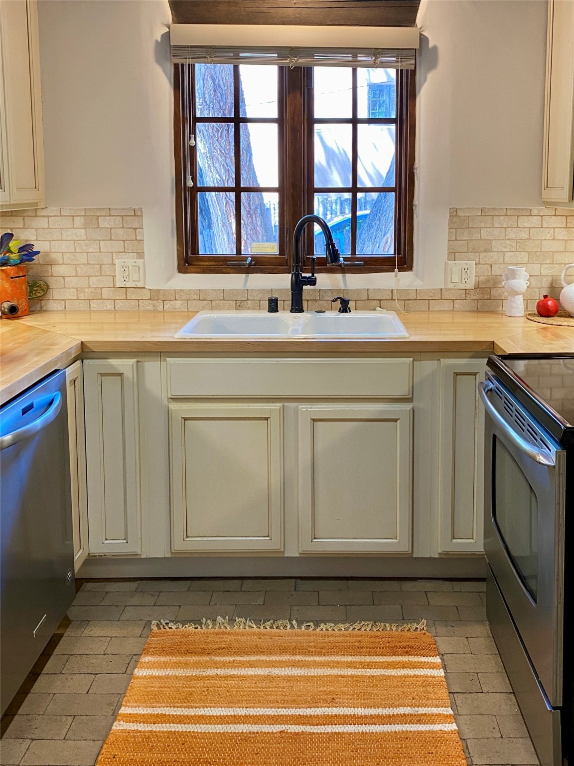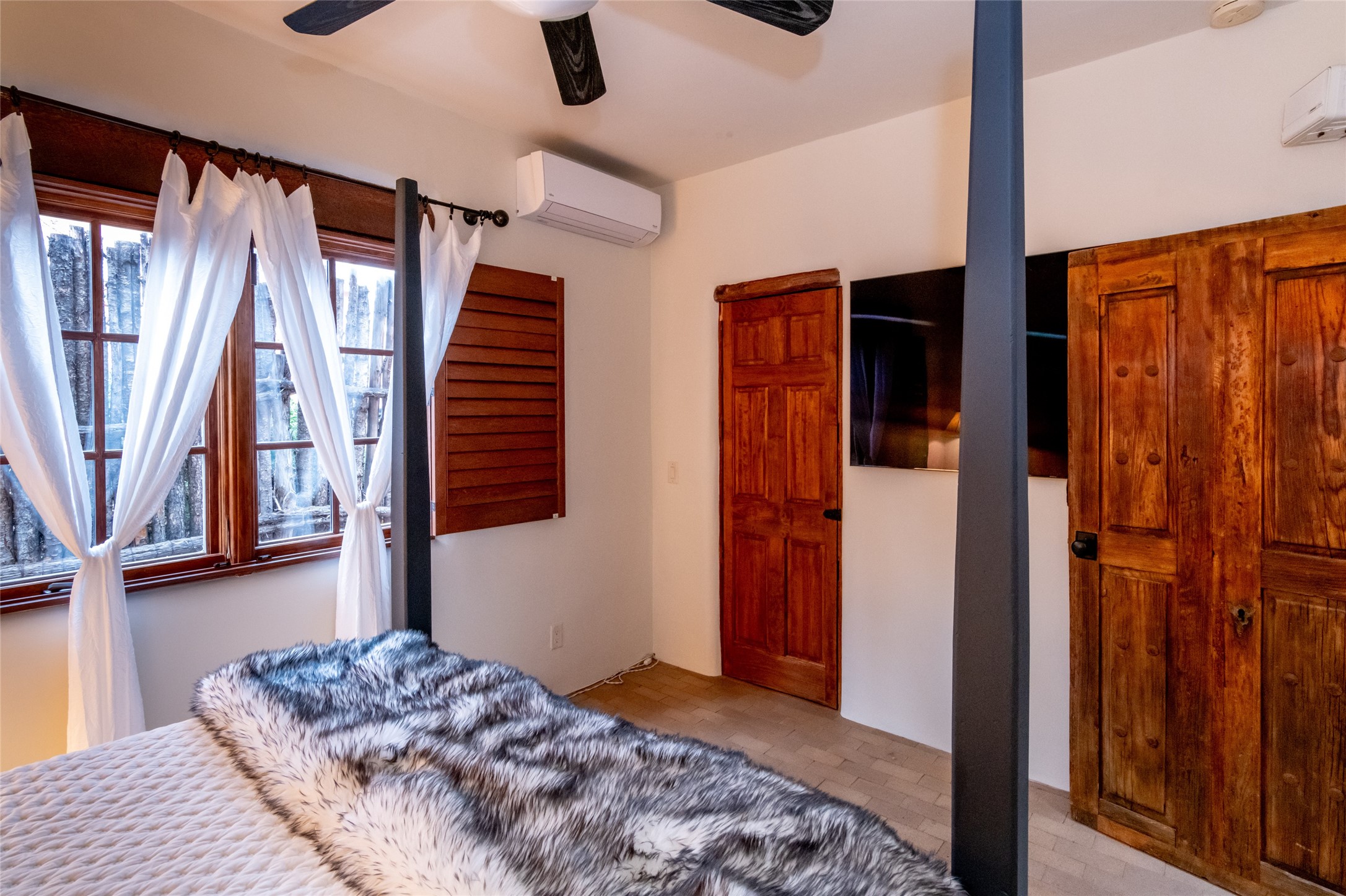 Experience timeless charm on Santa Fe's Historic Palace Avenue, where centuries-old trees frame this dream-come-true freestanding home in the prestigious East Side Neighborhood. Located behind curbside homes, surrounded by hidden courtyards and mature fruit trees, there is an oasis of privacy. At this prime location, enjoy being two blocks from the galleries and restaurants of Canyon Road, taking morning nature walks on the trails of the Santa Fe River Park, and easy access to downtown. This modern adobe-style home boasts beautifully coved high viga ceilings, a kiva fireplace, local brick floors, and hand plastered walls in the living area. Custom reclaimed wood doors open to each room and French doors in the second bedroom or office open to the private courtyards. The kitchen features custom cabinetry, butcher block countertops, Kitchen Aid stainless steel appliances and new Kohler fixtures. In the dual basin bath, there are contemporary slate tiles, new Kohler fixtures, and a new Toto toilet. Other updates include custom wood window coverings, three Fujitsu mini splits, baseboard heaters, a new 50-gallon Rheem water heater, and a new sewer line. This elegant cozy adobe is offered turn-key ready, it is freshly painted with designer curated furnishings, simply inquire if interested (some personal items excluded). No HOA.