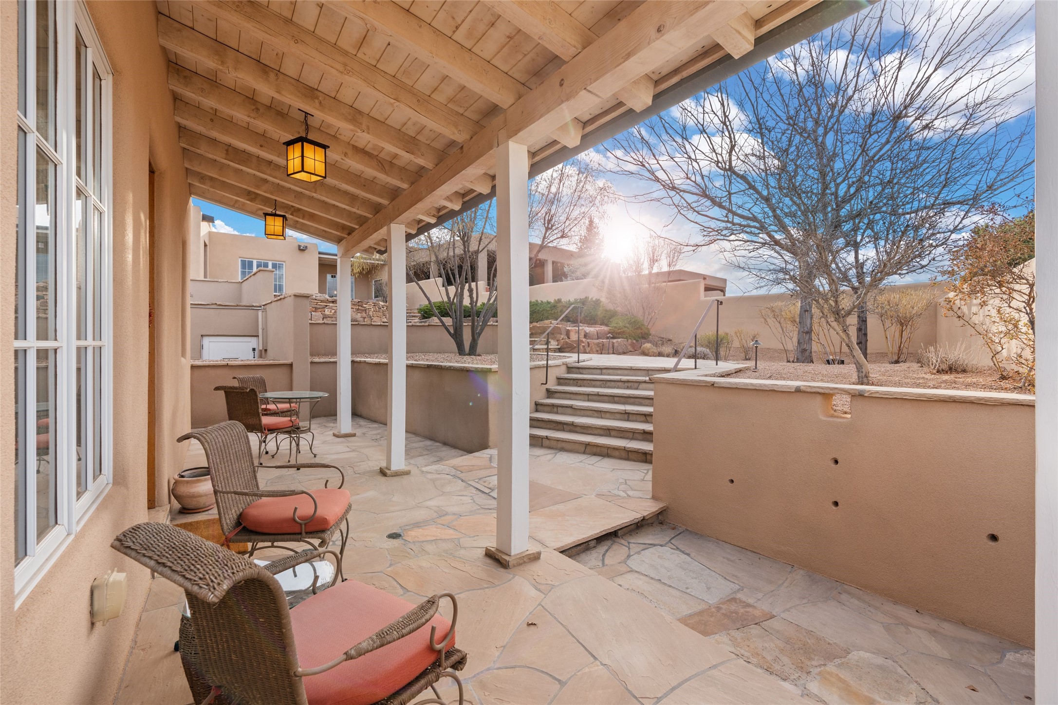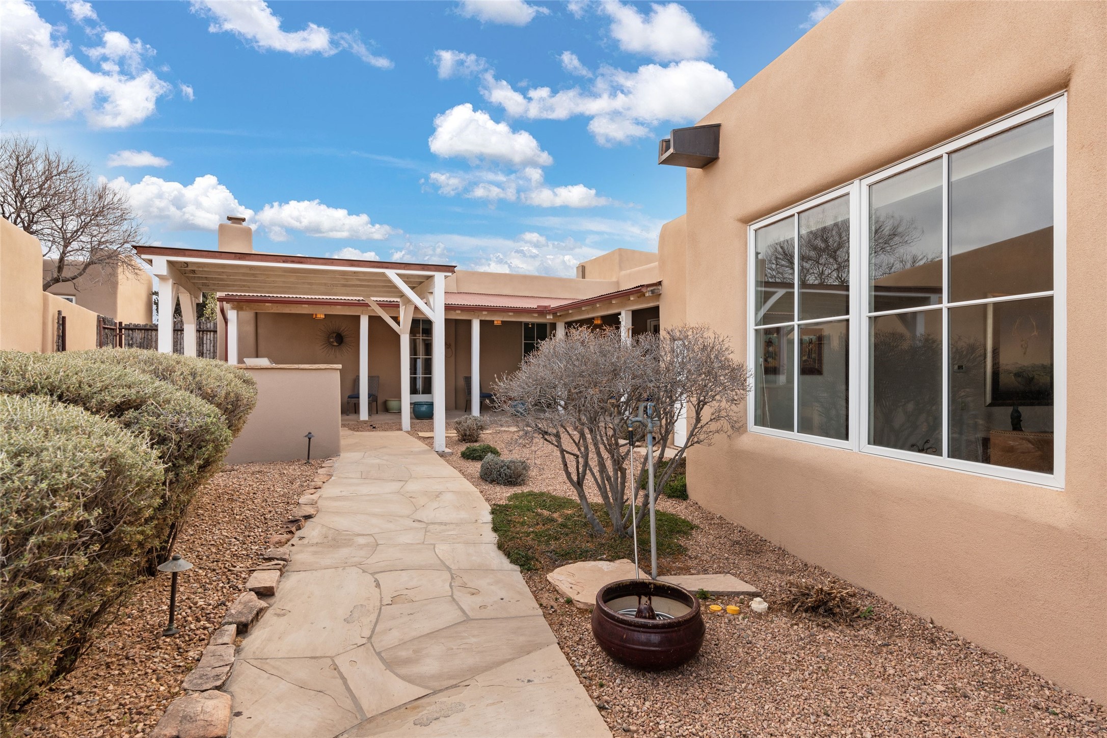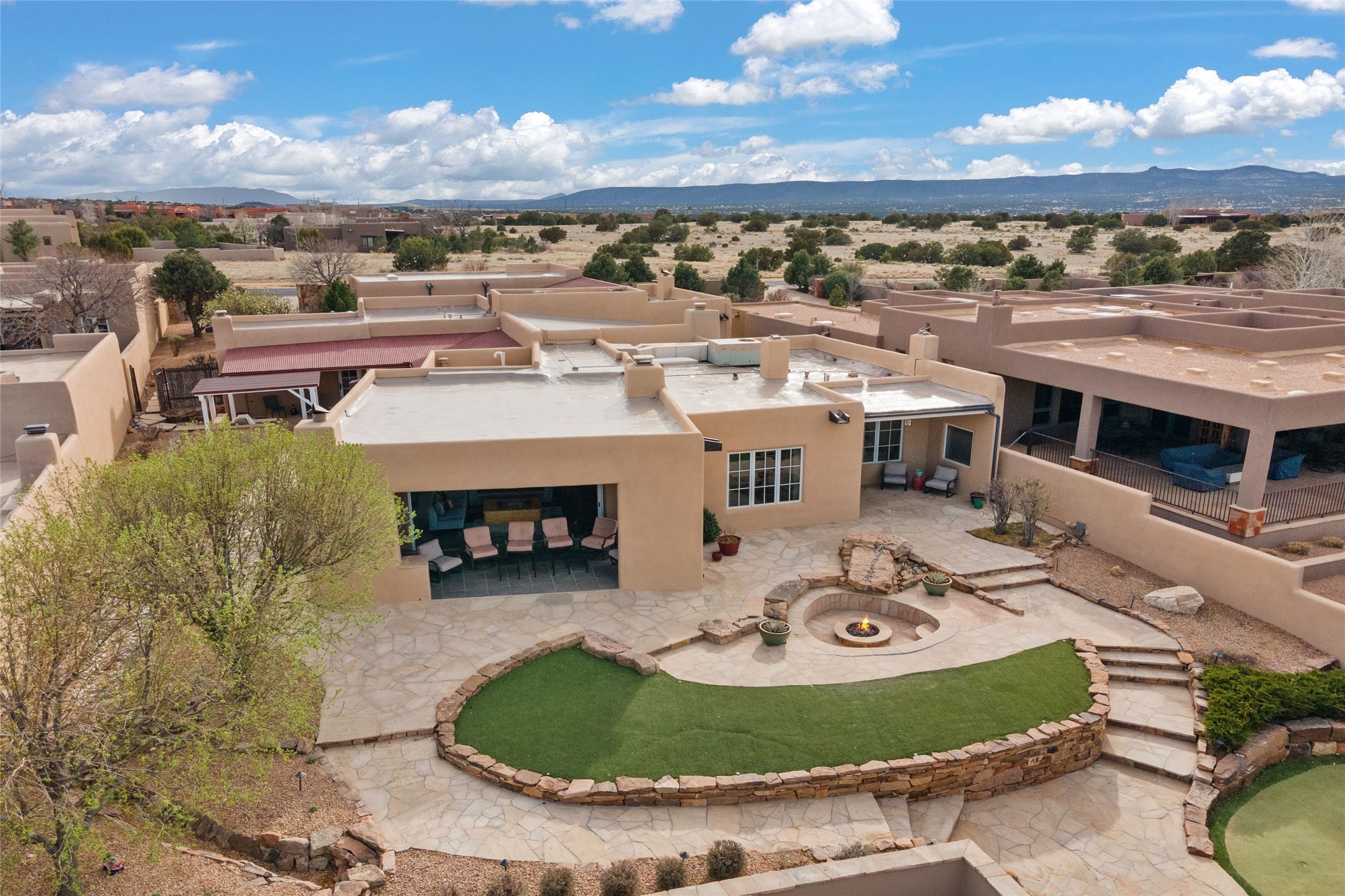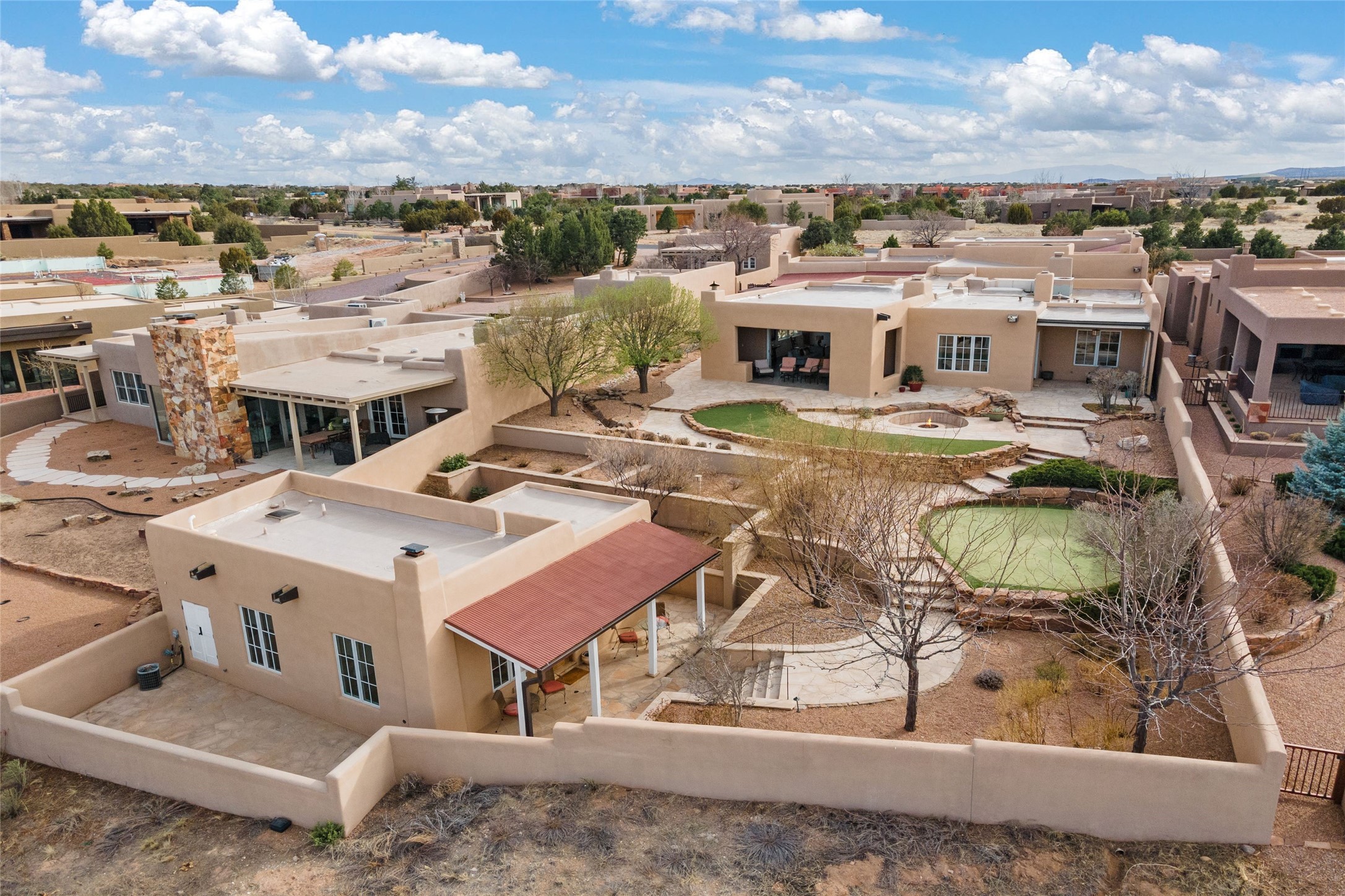 Panoramic Golf Course & Sangre de Cristo Mountain views are yours at this Soft Contemporary Masterpiece in Gated Las Campanas w 3 Bedrooms + Office + Media + 3-1/2 Baths, including a Guest House & 3-Car Garage & 6 Fireplaces. Spacious Living Room features a distinctive fireplace, wet bar & access to the back portal thru 4 glass doors that vanish into the wall, creating a 16-foot opening to the view. The Dining Room has space for 8 & a Chandelier of 6 stunning glass sculptures. The impressive Media Room has 11.2 sound system, refrigerator & reclining sectional couch. Gourmet Kitchen is designed for effortless meal preparation, w Wolf gas range/oven, Vent-a-Hood, Sub-Zero Refrigerator, double dishwasher + 4' x 9' island w prep sink & Insta-Hot water. The cozy Kitchen Nook has a wood-burning fireplace, room for casual dining + 2 lounge chairs.. The Main Bedroom Suite has a wood-burning fireplace, walk-in shower, 16-foot closet & & jetted tub w golf course view. Bedroom 2 is in a separate wing, located near the Den/Office. The free-standing Guest House offers the ultimate in privacy, w a Kitchen, Living area, Bedroom & washer/dryer. This Exquisite Residence has it All - 3 Bedrooms, Office, Media, 3-car garage, free-standing Guest House & recent major Stucco maintenance & GACO Roof Coating..The Outdoor Amenities make it a self-contained resort - Synthetic Putting Green, Fire Pit, Portal for the BBQ plus Golf & Mountain Views - Live the Resort Lifestyle in Las Campanas!