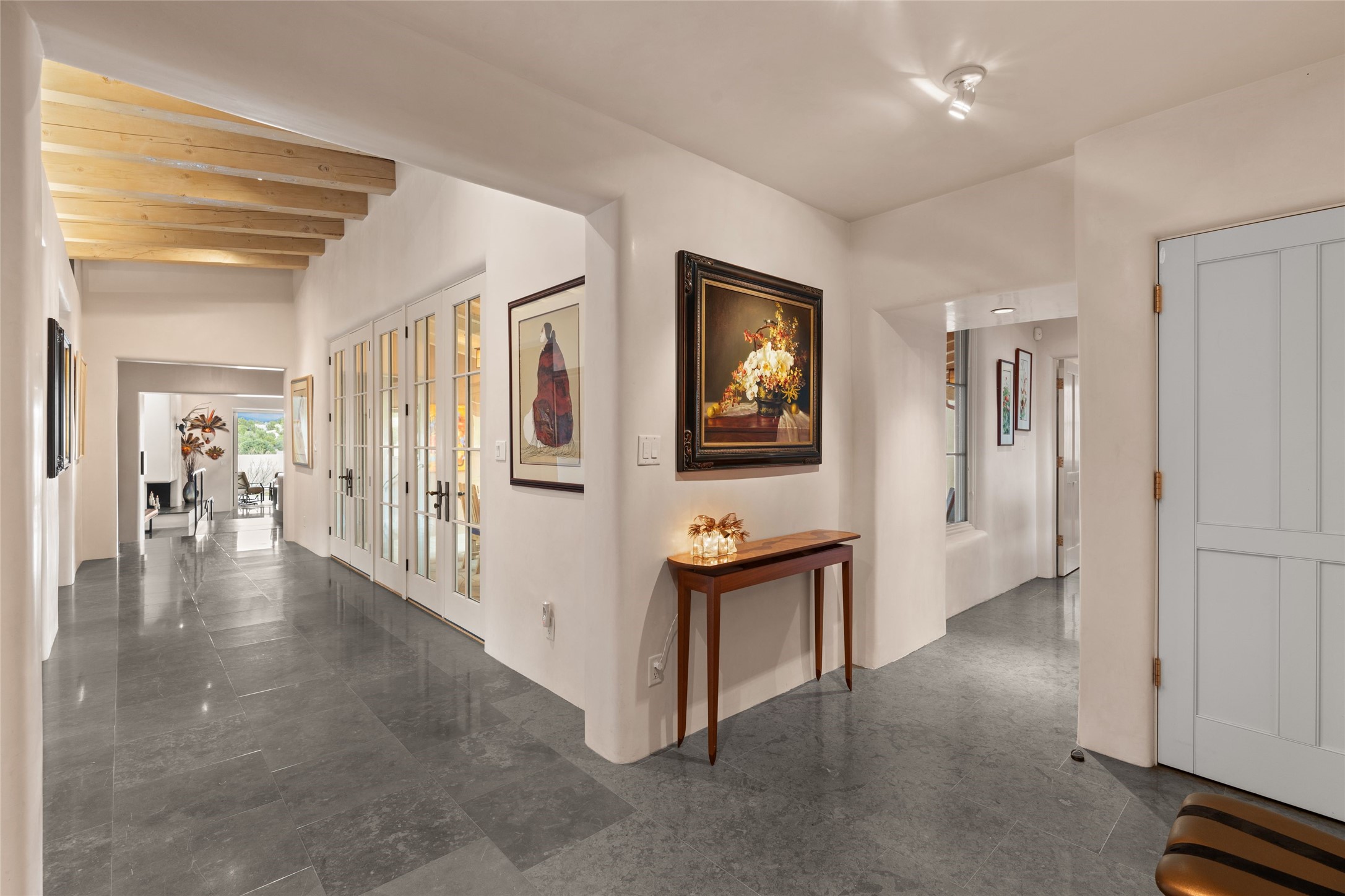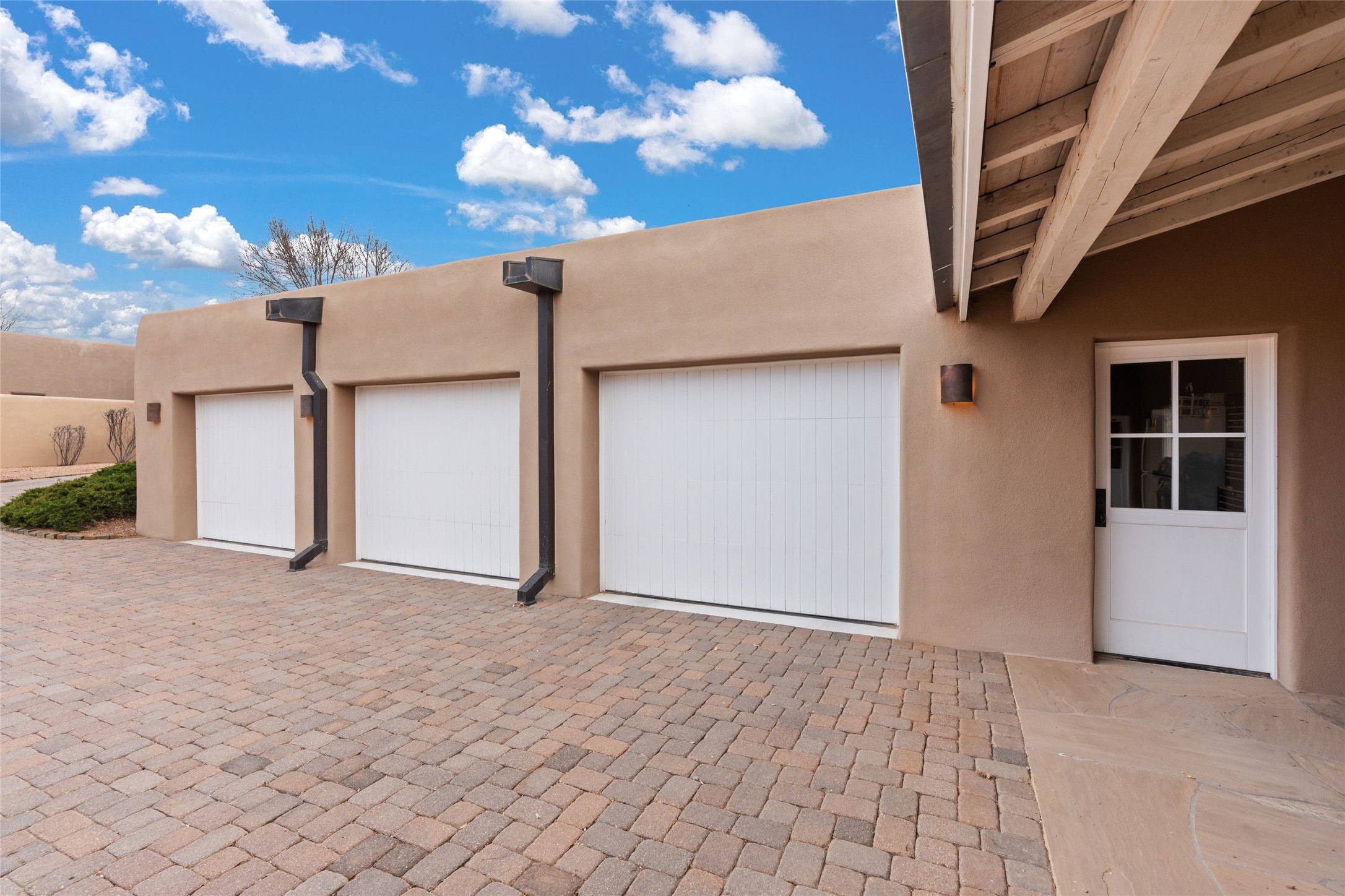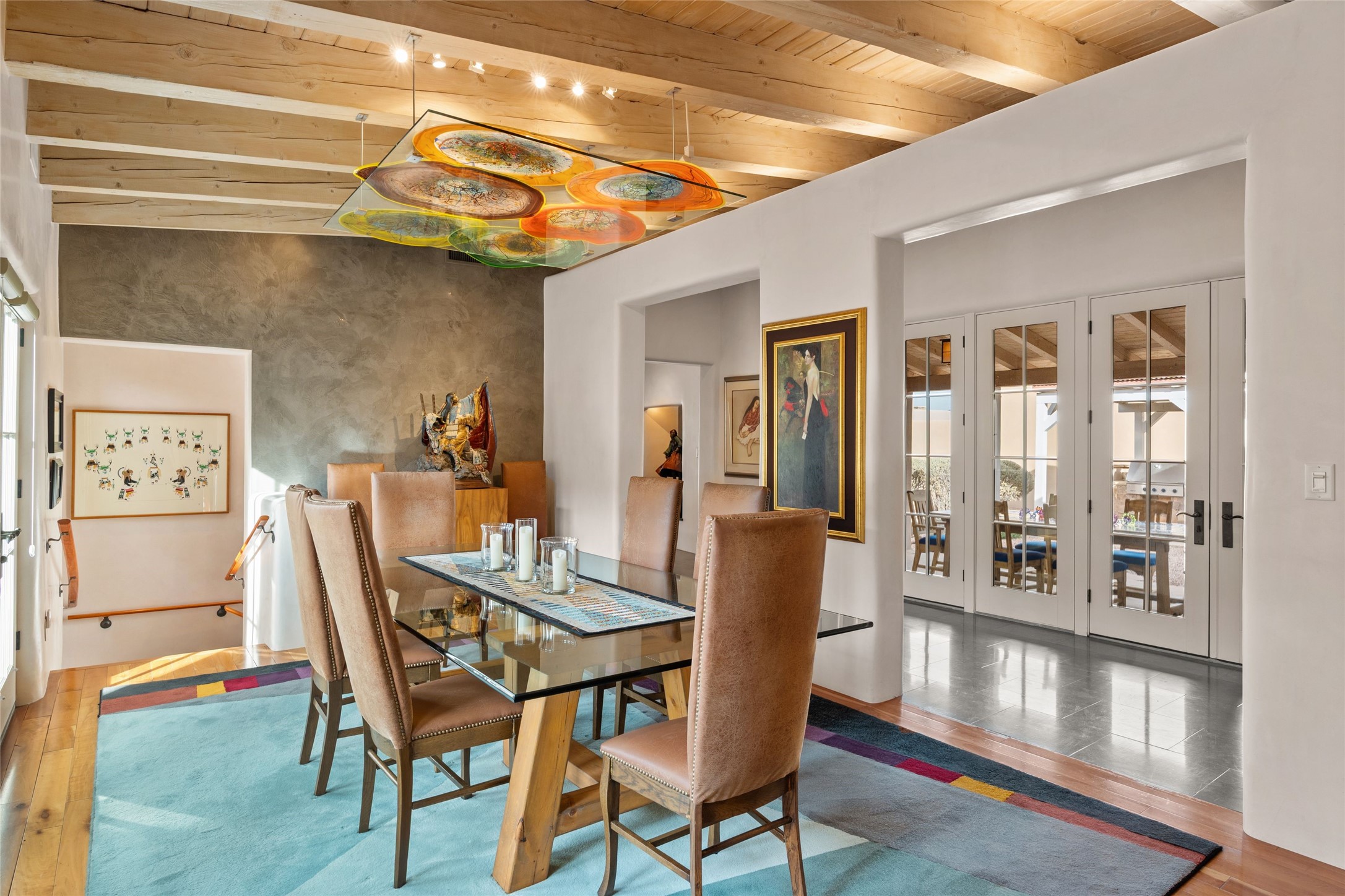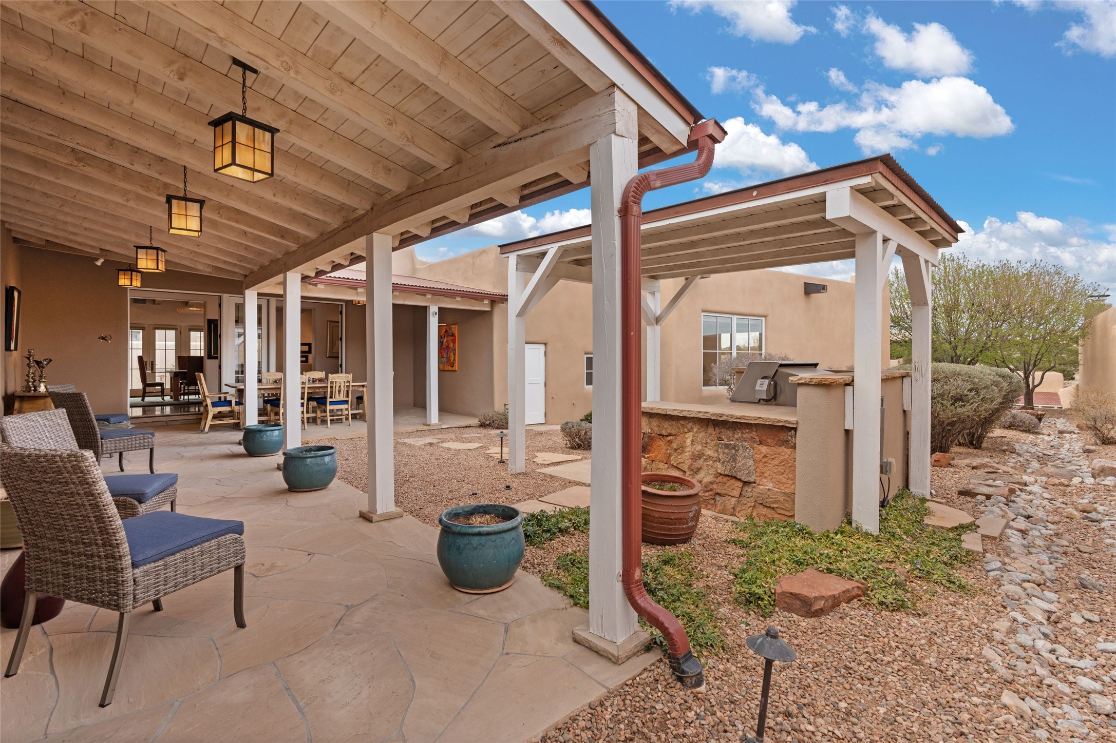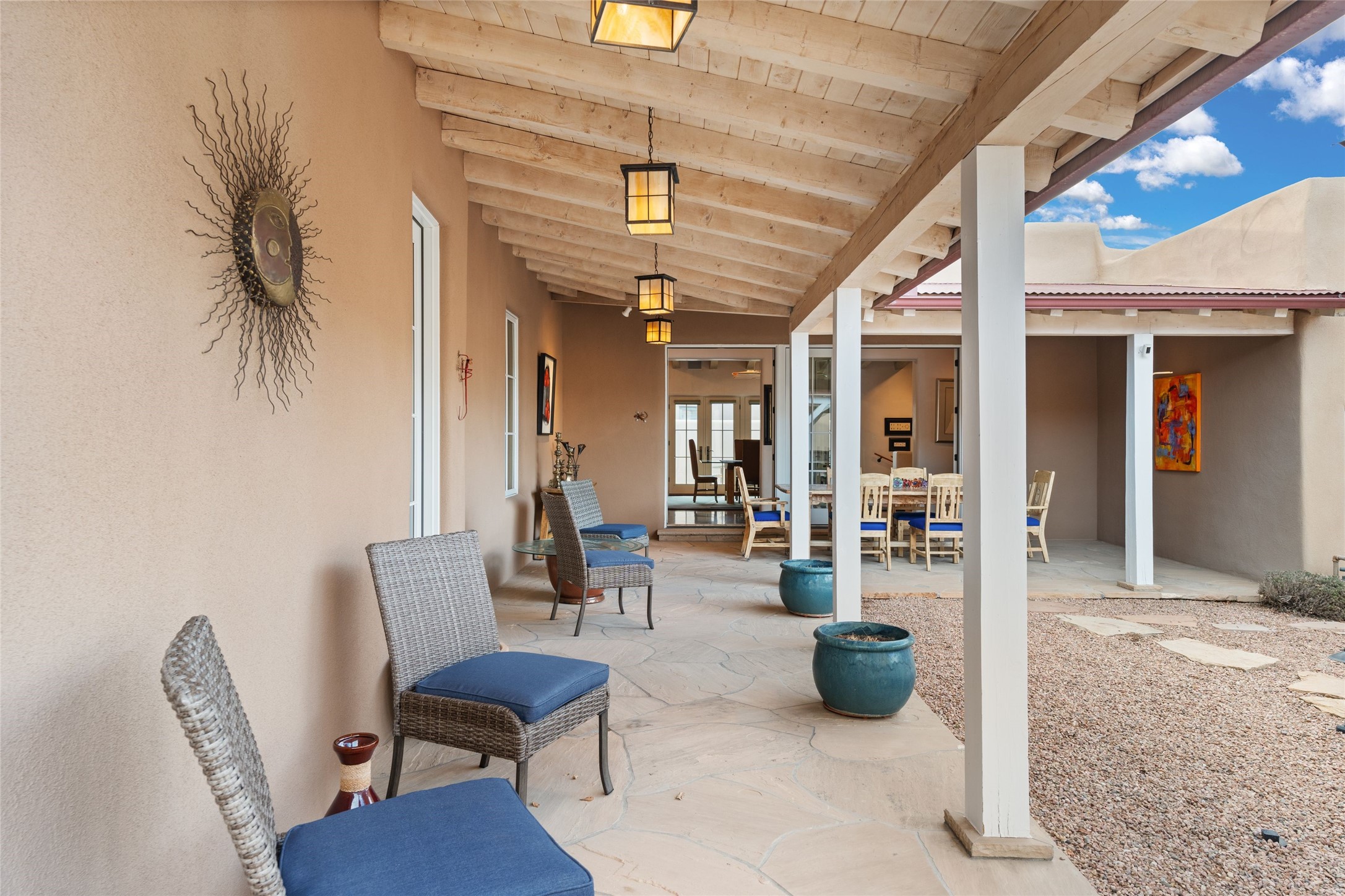 Panoramic Golf Course & Sangre de Cristo Mountain views are yours at this Soft Contemporary Masterpiece in Gated Las Campanas w 3 Bedrooms + Office + Media + 3-1/2 Baths, including a Guest House & 3-Car Garage & 6 Fireplaces. Spacious Living Room features a distinctive fireplace, wet bar & access to the back portal thru 4 glass doors that vanish into the wall, creating a 16-foot opening to the view. The Dining Room has space for 8 & a Chandelier of 6 stunning glass sculptures. The impressive Media Room has 11.2 sound system, refrigerator & reclining sectional couch. Gourmet Kitchen is designed for effortless meal preparation, w Wolf gas range/oven, Vent-a-Hood, Sub-Zero Refrigerator, double dishwasher + 4' x 9' island w prep sink & Insta-Hot water. The cozy Kitchen Nook has a wood-burning fireplace, room for casual dining + 2 lounge chairs.. The Main Bedroom Suite has a wood-burning fireplace, walk-in shower, 16-foot closet & & jetted tub w golf course view. Bedroom 2 is in a separate wing, located near the Den/Office. The free-standing Guest House offers the ultimate in privacy, w a Kitchen, Living area, Bedroom & washer/dryer. This Exquisite Residence has it All - 3 Bedrooms, Office, Media, 3-car garage, free-standing Guest House & recent major Stucco maintenance & GACO Roof Coating..The Outdoor Amenities make it a self-contained resort - Synthetic Putting Green, Fire Pit, Portal for the BBQ plus Golf & Mountain Views - Live the Resort Lifestyle in Las Campanas!