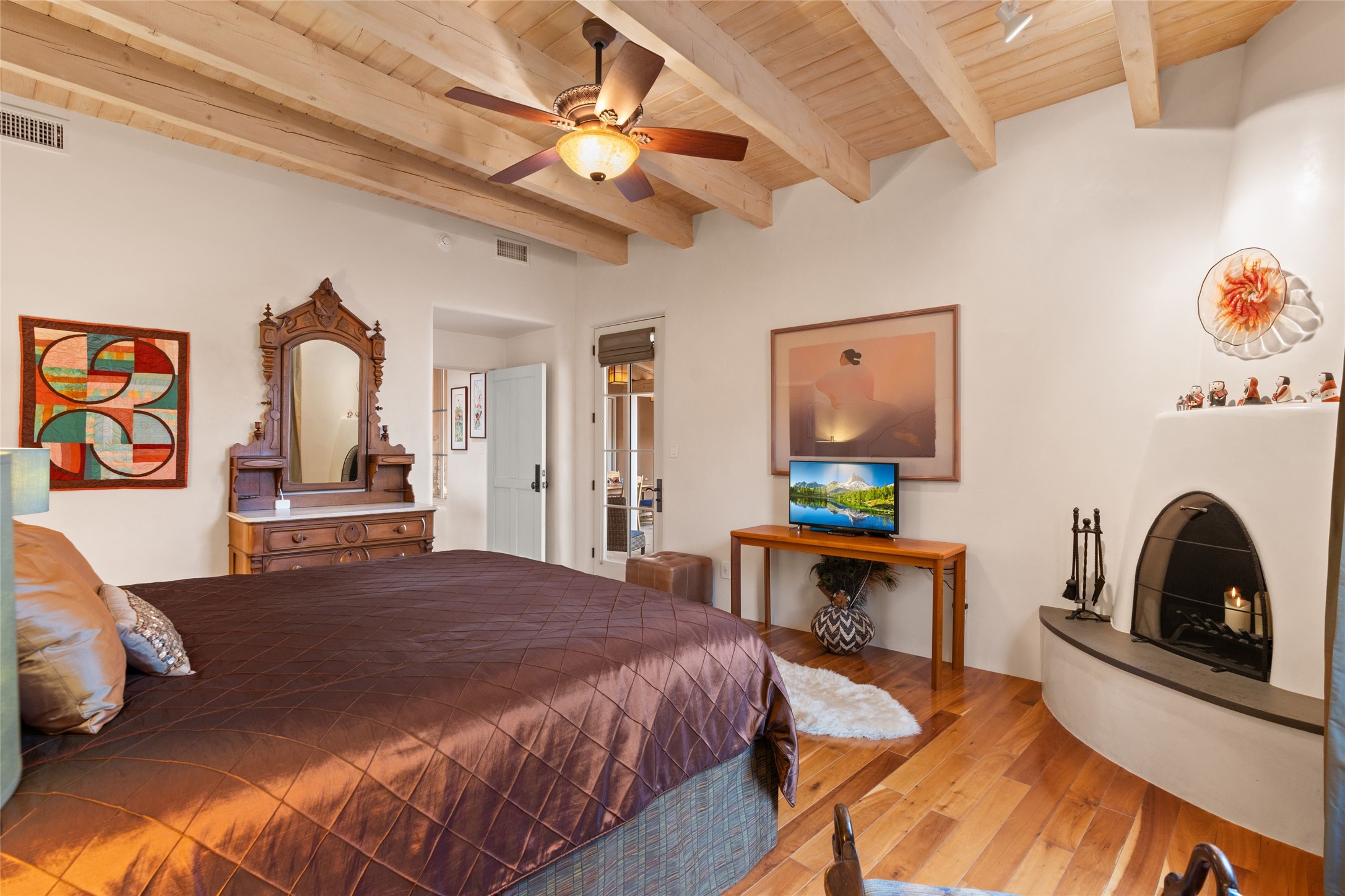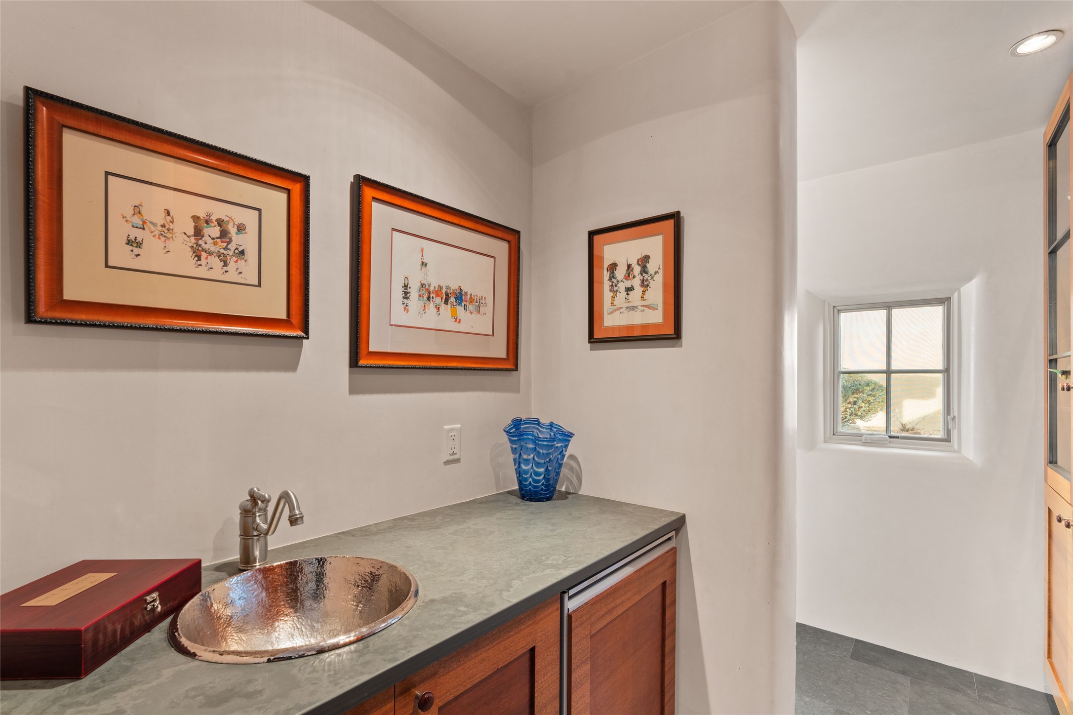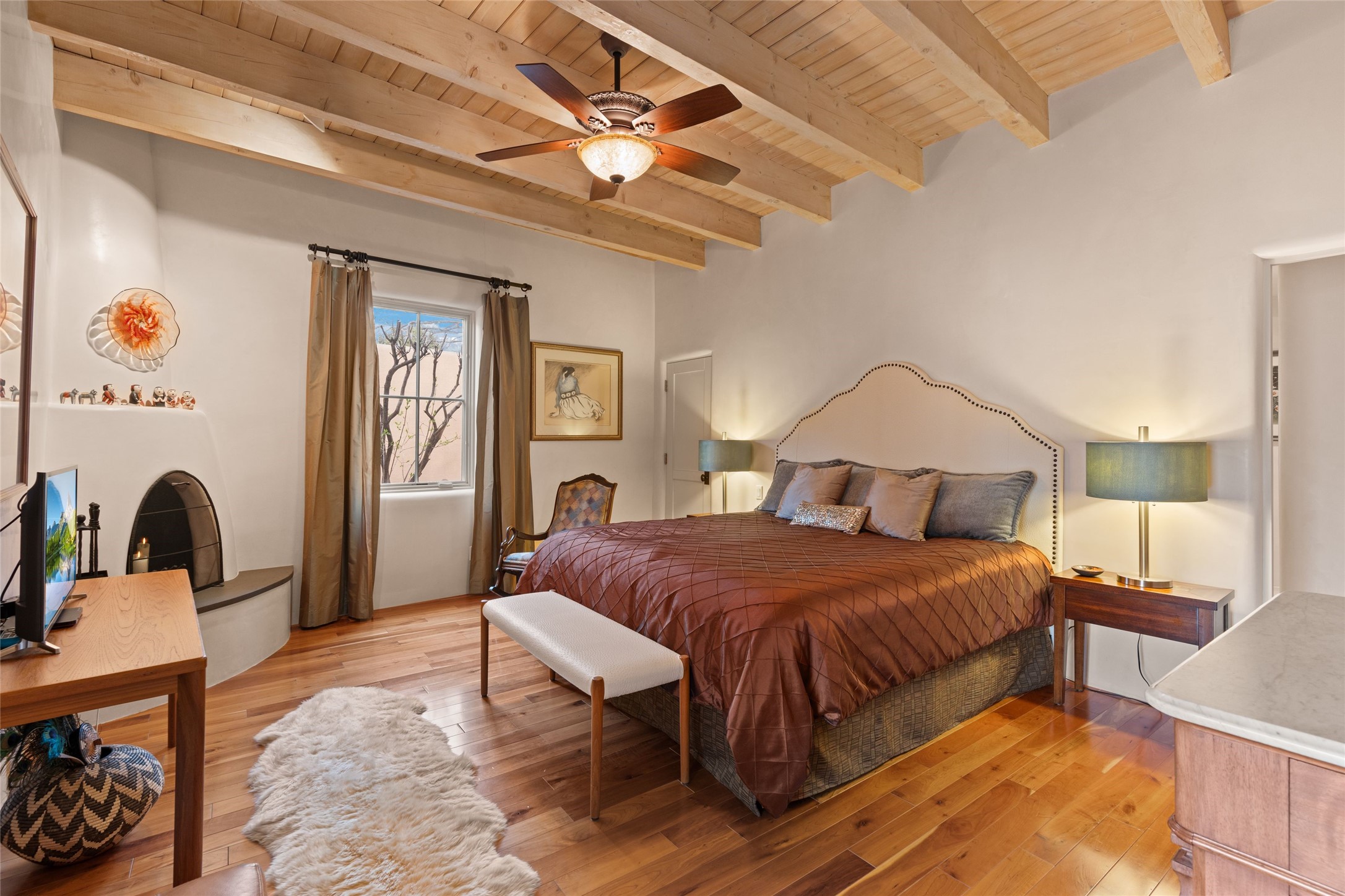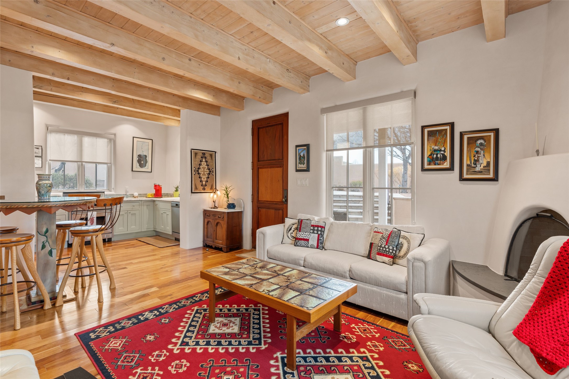 Panoramic Golf Course & Sangre de Cristo Mountain views are yours at this Soft Contemporary Masterpiece in Gated Las Campanas w 3 Bedrooms + Office + Media + 3-1/2 Baths, including a Guest House & 3-Car Garage & 6 Fireplaces. Spacious Living Room features a distinctive fireplace, wet bar & access to the back portal thru 4 glass doors that vanish into the wall, creating a 16-foot opening to the view. The Dining Room has space for 8 & a Chandelier of 6 stunning glass sculptures. The impressive Media Room has 11.2 sound system, refrigerator & reclining sectional couch. Gourmet Kitchen is designed for effortless meal preparation, w Wolf gas range/oven, Vent-a-Hood, Sub-Zero Refrigerator, double dishwasher + 4' x 9' island w prep sink & Insta-Hot water. The cozy Kitchen Nook has a wood-burning fireplace, room for casual dining + 2 lounge chairs.. The Main Bedroom Suite has a wood-burning fireplace, walk-in shower, 16-foot closet & & jetted tub w golf course view. Bedroom 2 is in a separate wing, located near the Den/Office. The free-standing Guest House offers the ultimate in privacy, w a Kitchen, Living area, Bedroom & washer/dryer. This Exquisite Residence has it All - 3 Bedrooms, Office, Media, 3-car garage, free-standing Guest House & recent major Stucco maintenance & GACO Roof Coating..The Outdoor Amenities make it a self-contained resort - Synthetic Putting Green, Fire Pit, Portal for the BBQ plus Golf & Mountain Views - Live the Resort Lifestyle in Las Campanas!
