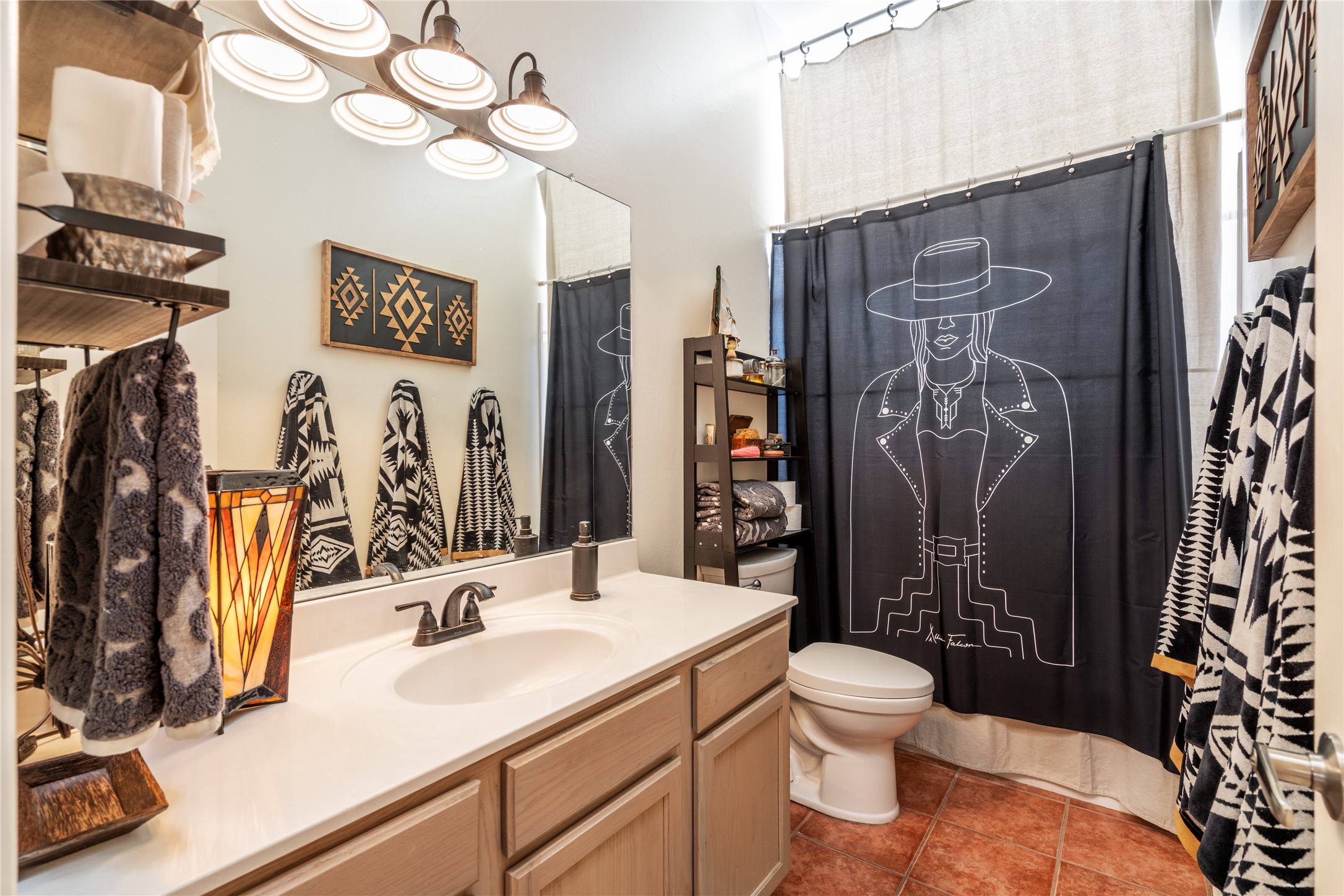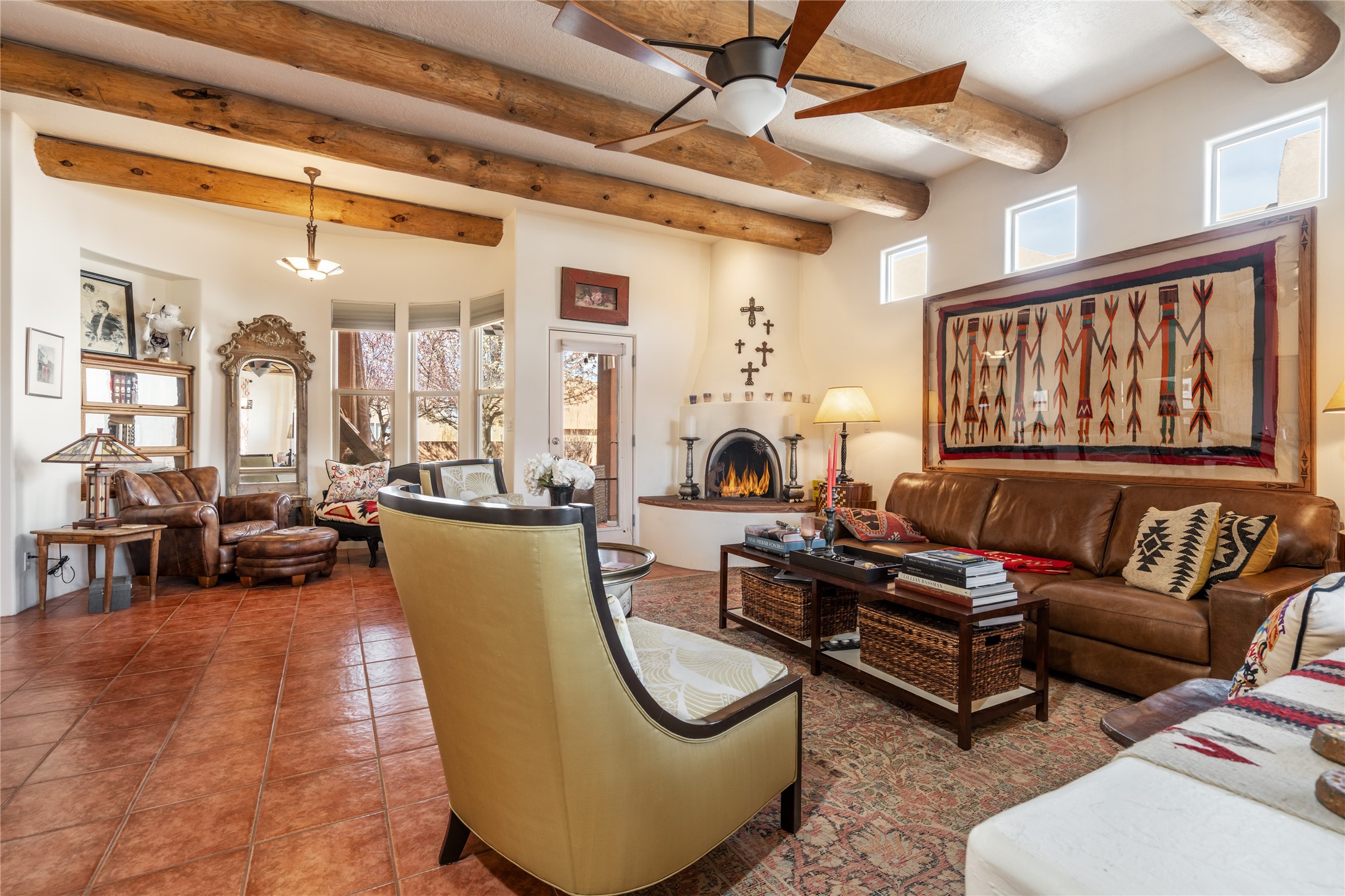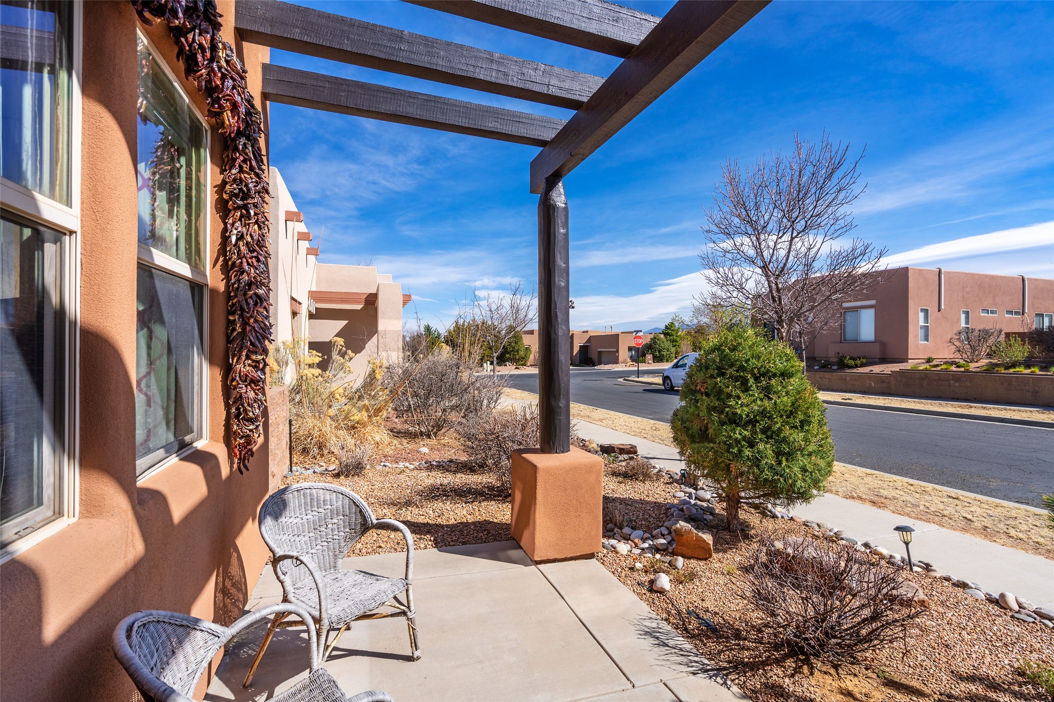 Welcome to 3 Gallina Peak, a beautifully designed home nestled in the sought-after Rancho Viejo community, just 13 miles from the historic Santa Fe Plaza. With a peak of Sangre de Cristo mountain views and a lovely private rear courtyard, this wonderful single-level residence offers both privacy and functionality. Inside, you'll find timeless Southwestern charm with tiled floors throughout, radiant heat, and mini-splits for efficient cooling. The open-concept design enhances modern living, while the wood-burning kiva fireplace and exposed vigas add warmth and character. A pony wall creates separation for the dining room while still allowing the open flow. The kitchen features a large central island and plenty of cabinet space and a pantry for storage. The primary suite is a private retreat, complete with a chic en-suite bath, a soaking tub, a separate shower, and a spacious walk-in closet. Outside, the enclosed backyard is thoughtfully landscaped with native vegetation, providing a serene outdoor space. Unique touches throughout make this home unique. Other upgrades include a high-efficiency tankless system for the radiant heat. Enjoy the Rancho Viejo lifestyle with 15+ miles of paved walking trails, several community parks, and reasonable covenants that help maintain the area's natural beauty.
