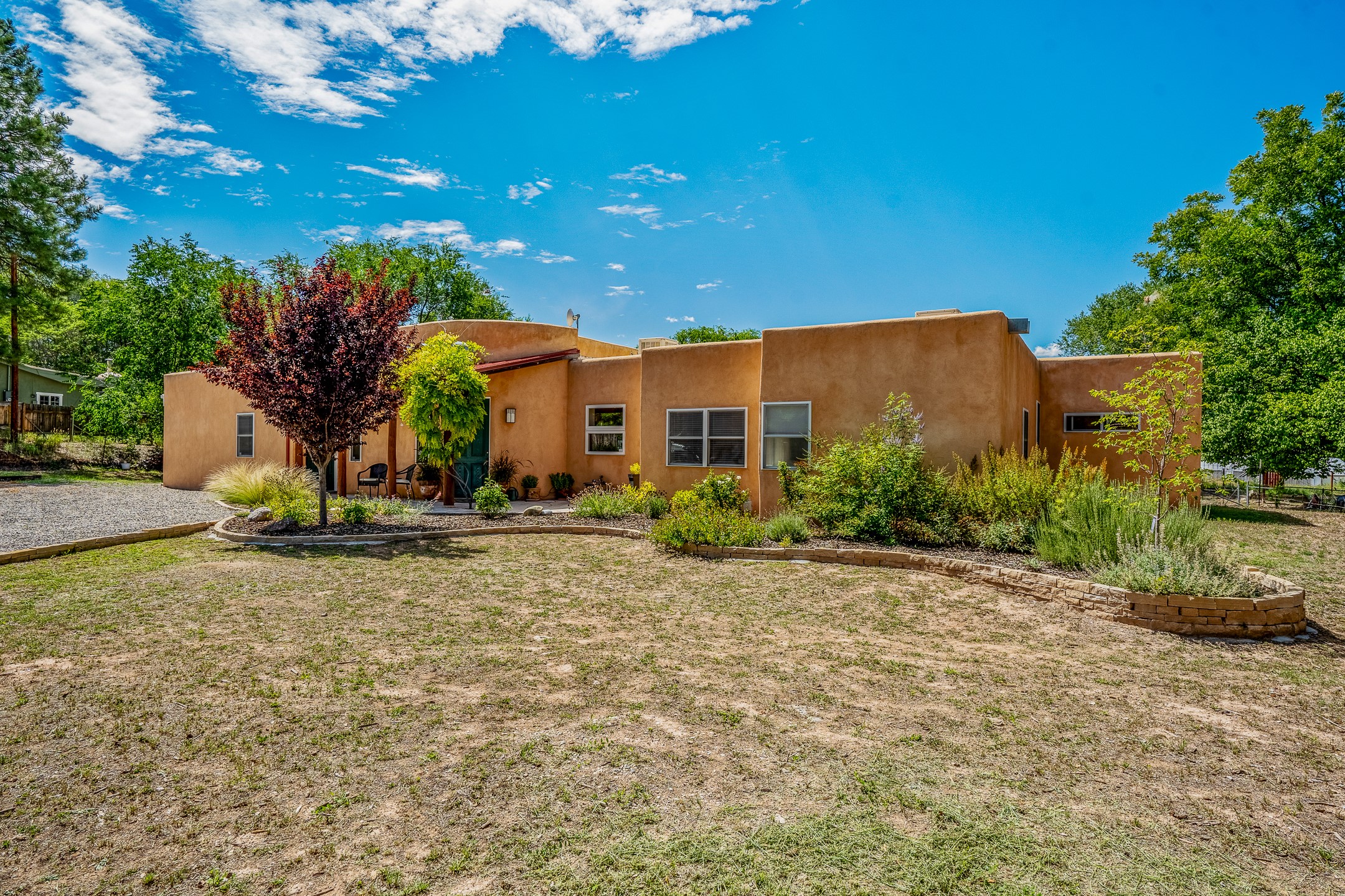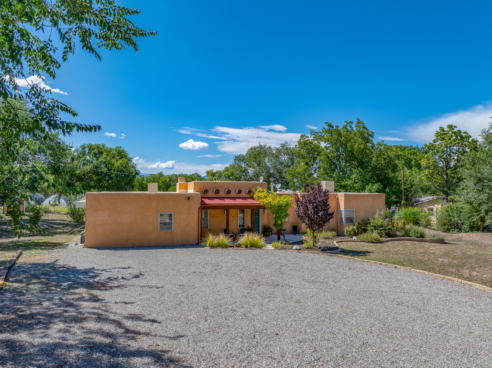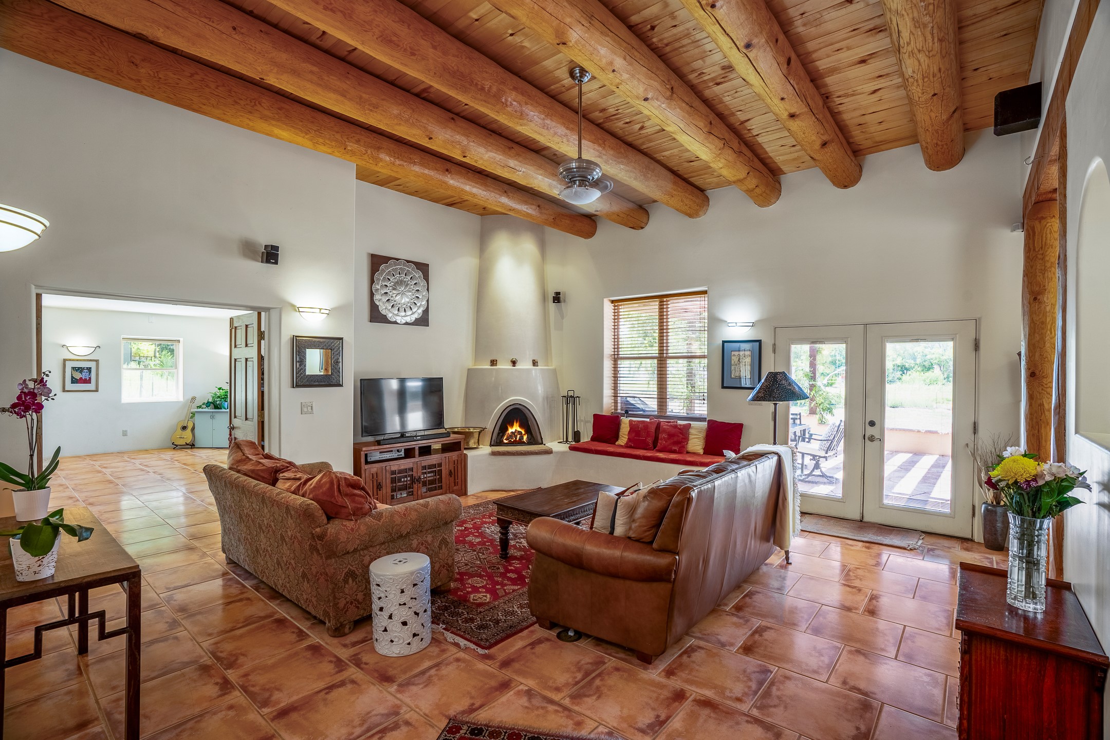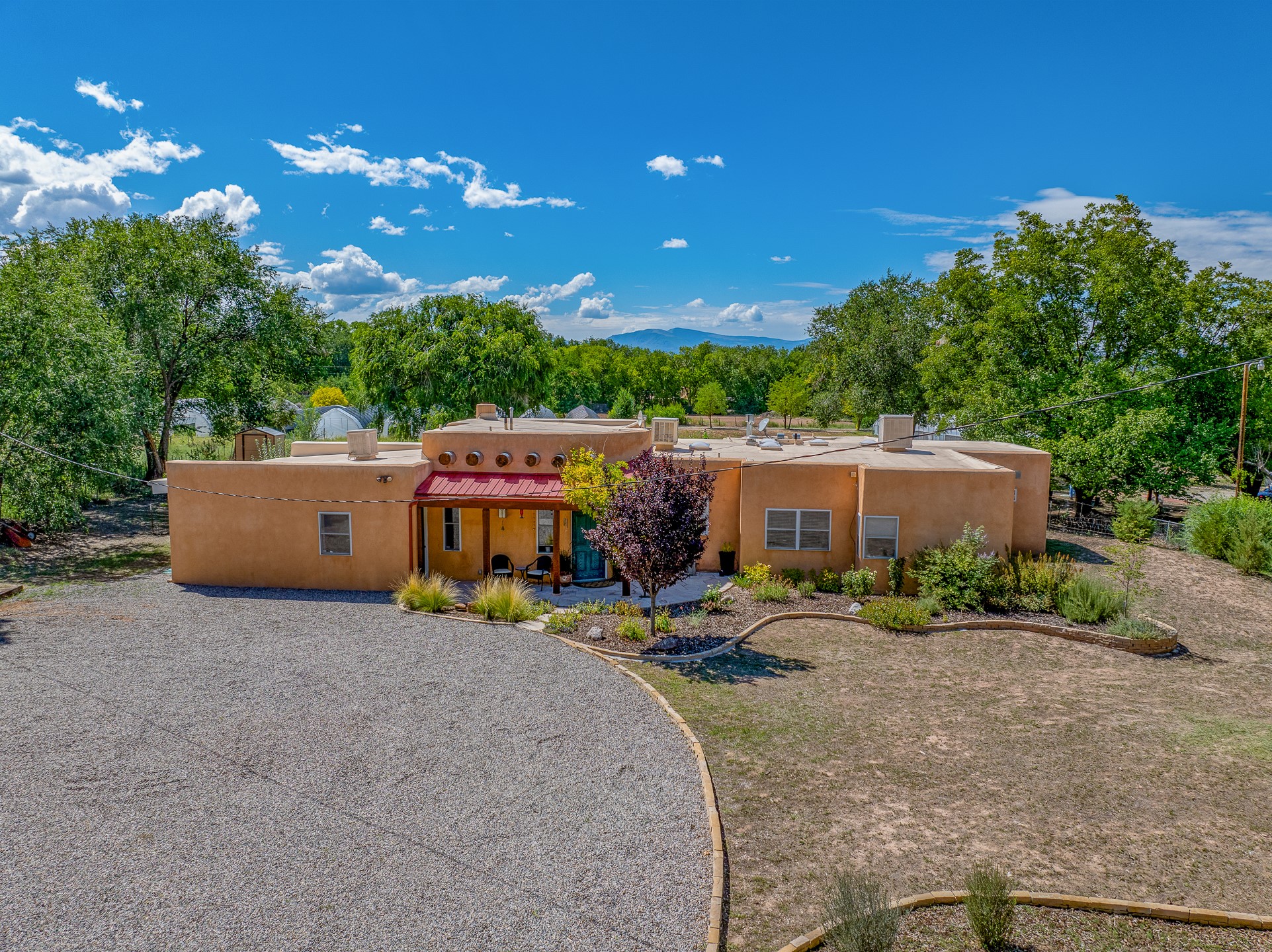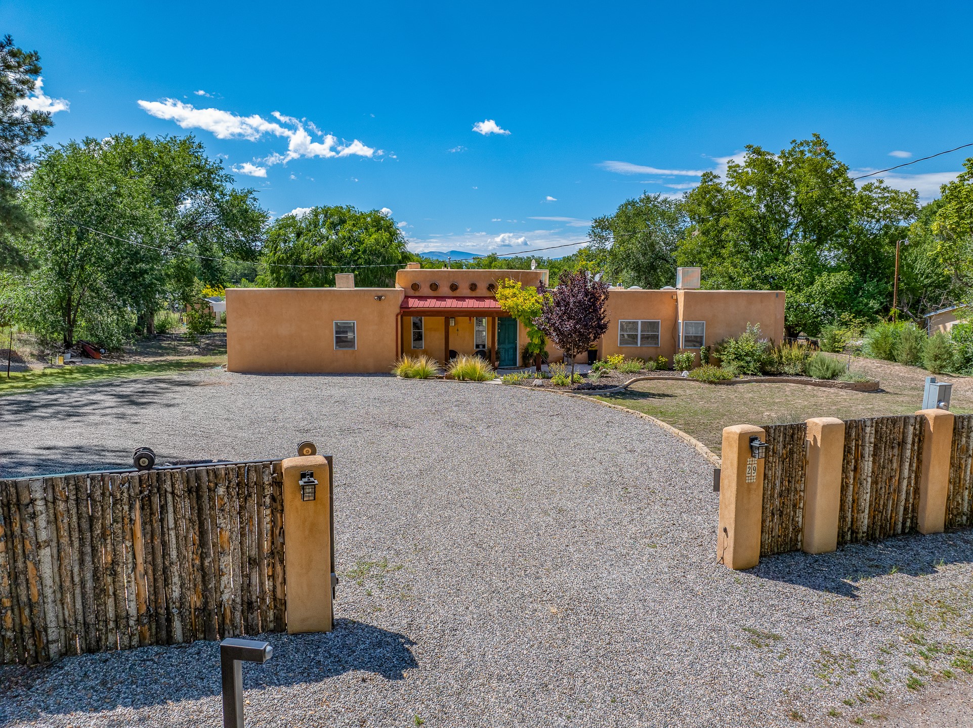 Custom Move-in-Ready, Single-Level, Southwestern-Style Home on 0.736 Acres! 2558 sq ft, 3 Bed / 2.5 Bath, Large Studio with Separate Entrance, Vaulted Wooden Tongue and Groove Ceilings, Skylights, Kiva Fireplace, Landscaping with Fruit Trees and Watering System, Backs to Organic Farm, Close to BLM Hiking Trails, Newer Roof (2022) Under Warranty, Water Filtration System, Cooling, and More! This beautiful custom home, located just 30 minutes from Los Alamos and Santa Fe, was built in 2001 using insulated concrete form (ICF) construction for long-life and great insulation, while also being impervious to fire, rot, and infestation. The home exudes high-end Southwestern charm and style, starting with the latilla and stucco fence that greets you upon arrival to the property. The charm continues as you enter the home and step into the showcase living room, featuring a wood-burning kiva fireplace, 14' ceilings, and 36' vigas. The tile floor flows throughout the living areas and leads to a large studio. The studio features a separate exterior entrance and access to the powder room, perfect for a home business/office or for a family recreation room. The kitchen features stainless-steel appliances, including a gas range with a convection/air fryer oven, and a large peninsula for preparing and staging food for holiday meals. It flows into the formal dining room and has easy access to the flagstone patio for indoor-outdoor entertaining. When it's time to wind down, head towards the bedroom wing, where you'll find two guest bedrooms, a guest bathroom, and the primary suite. The primary suite features wood tongue and groove ceilings, a curved architectural wall, nichos for displaying art, a private sitting area, a walk-in closet, and a large en suite bathroom. The en suite bathroom features dual vanities, a walk-in shower, and a Jacuzzi tub. Stepping into the back yard, you will enjoy a large flagstone patio covered with a 14' high pergola, established landscaping that includes fruit trees and a six-station irrigation system, and access to a walking path around an organic farm. Additional property features include a security system, electric gate, newer (2022) roof with transferable warranty, evaporative cooling, five-zone radiant heating system, and a whole-house water filtration system. Call today to schedule your private showing before this beautiful property is gone!