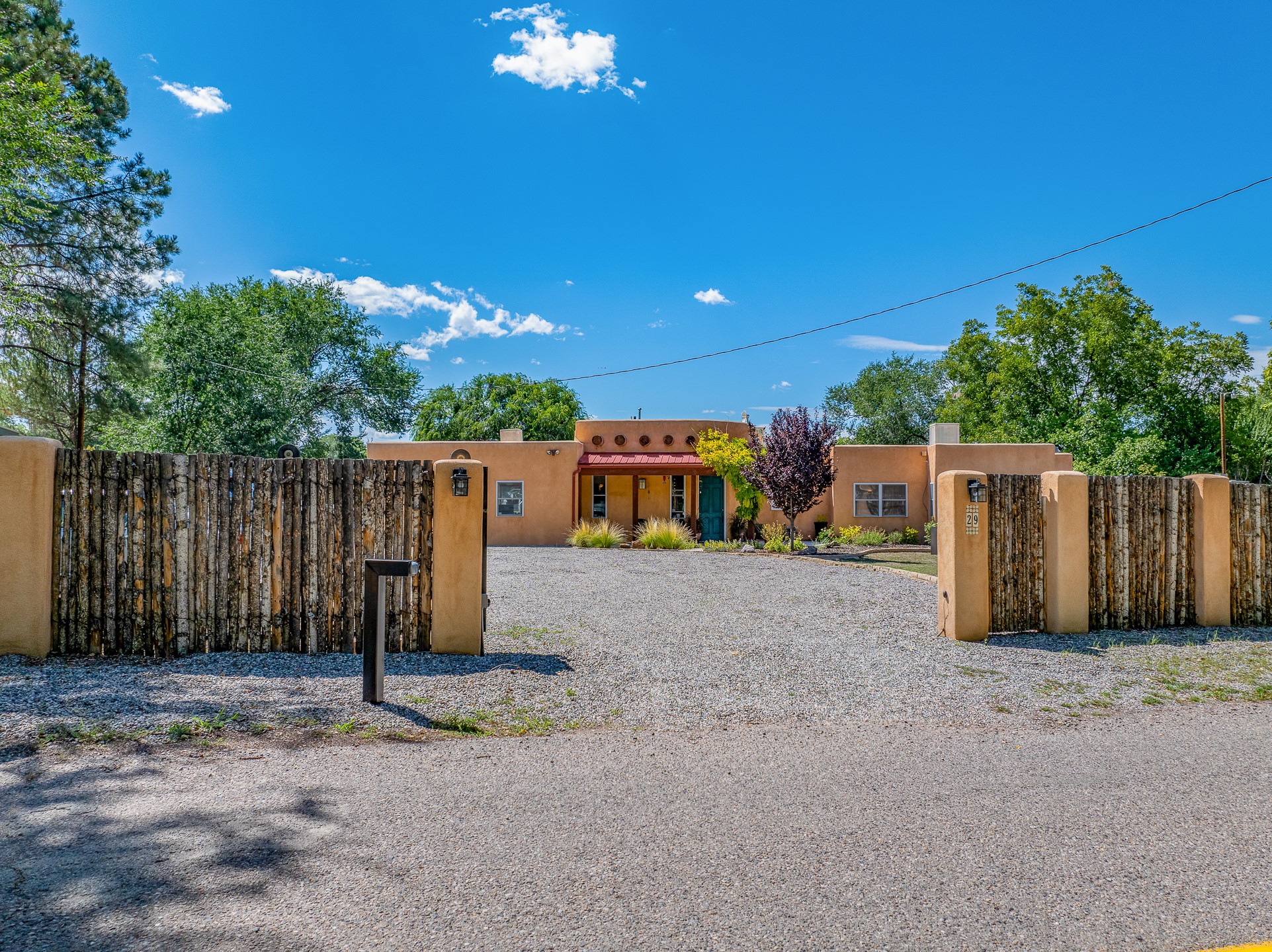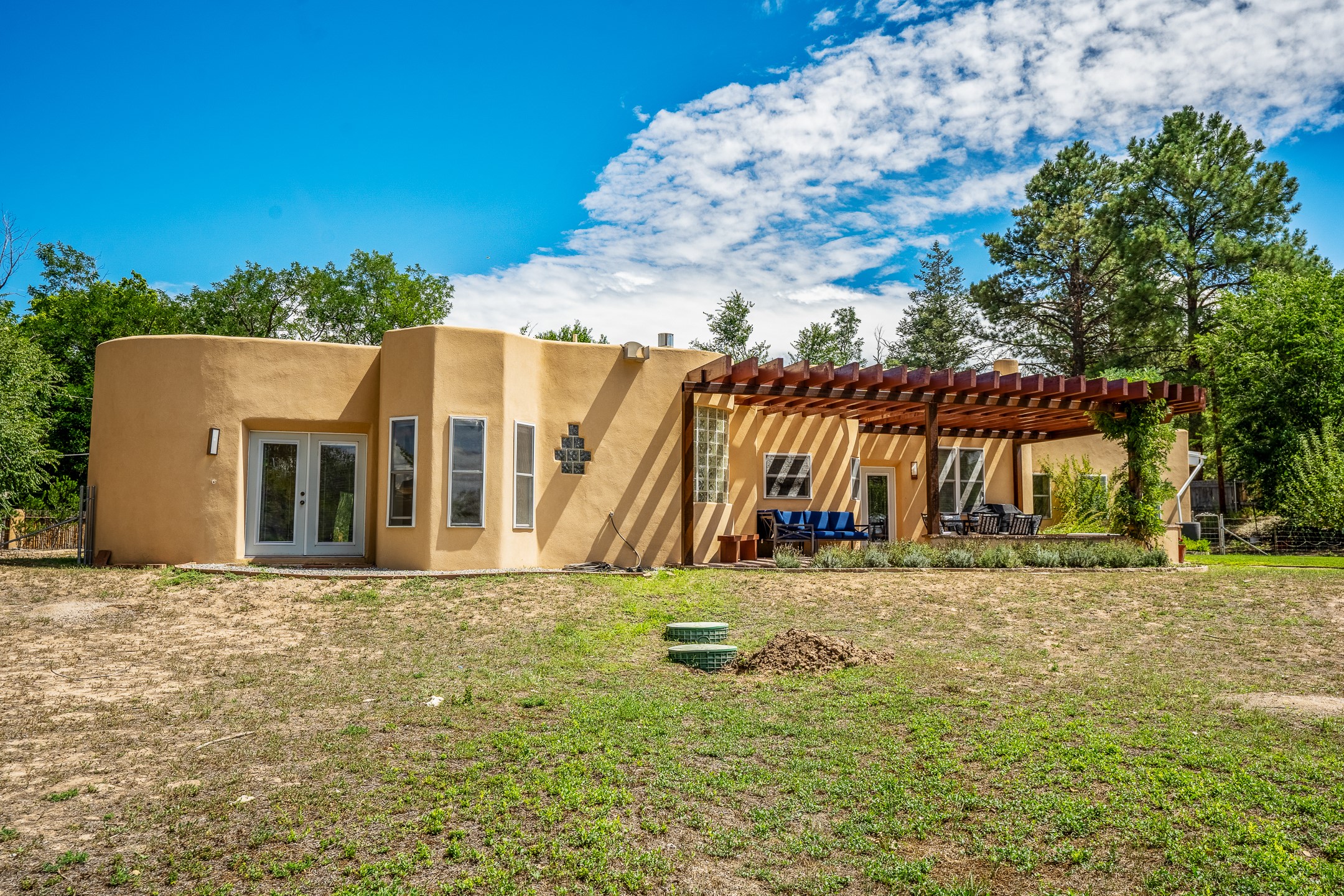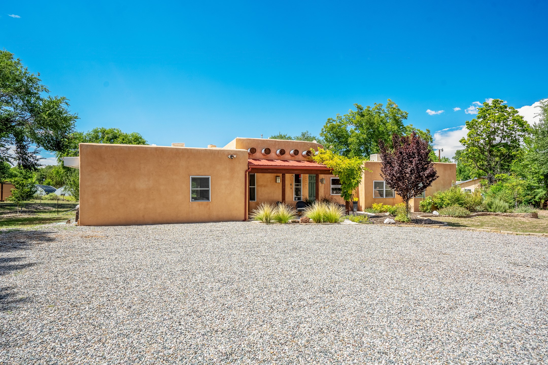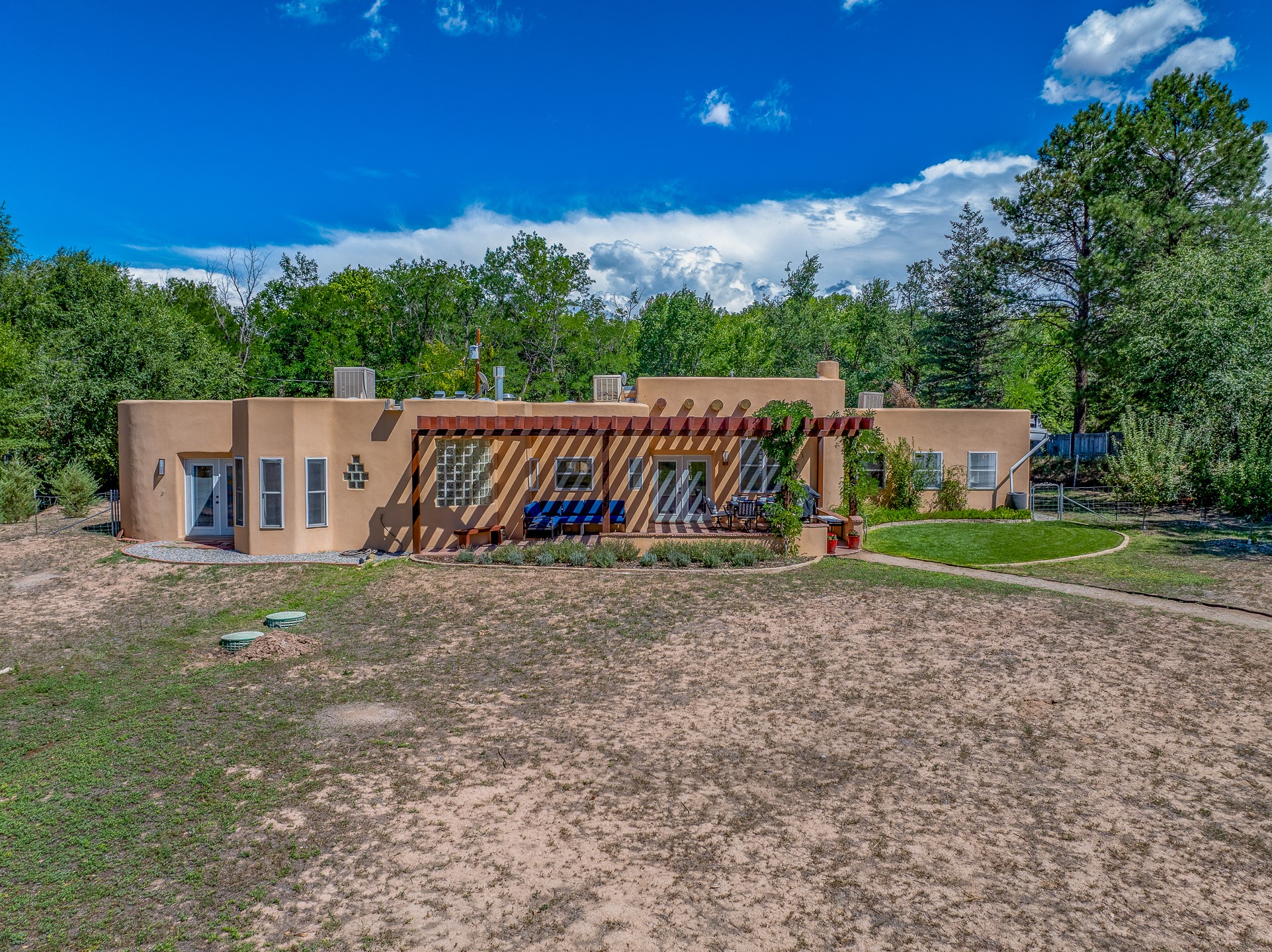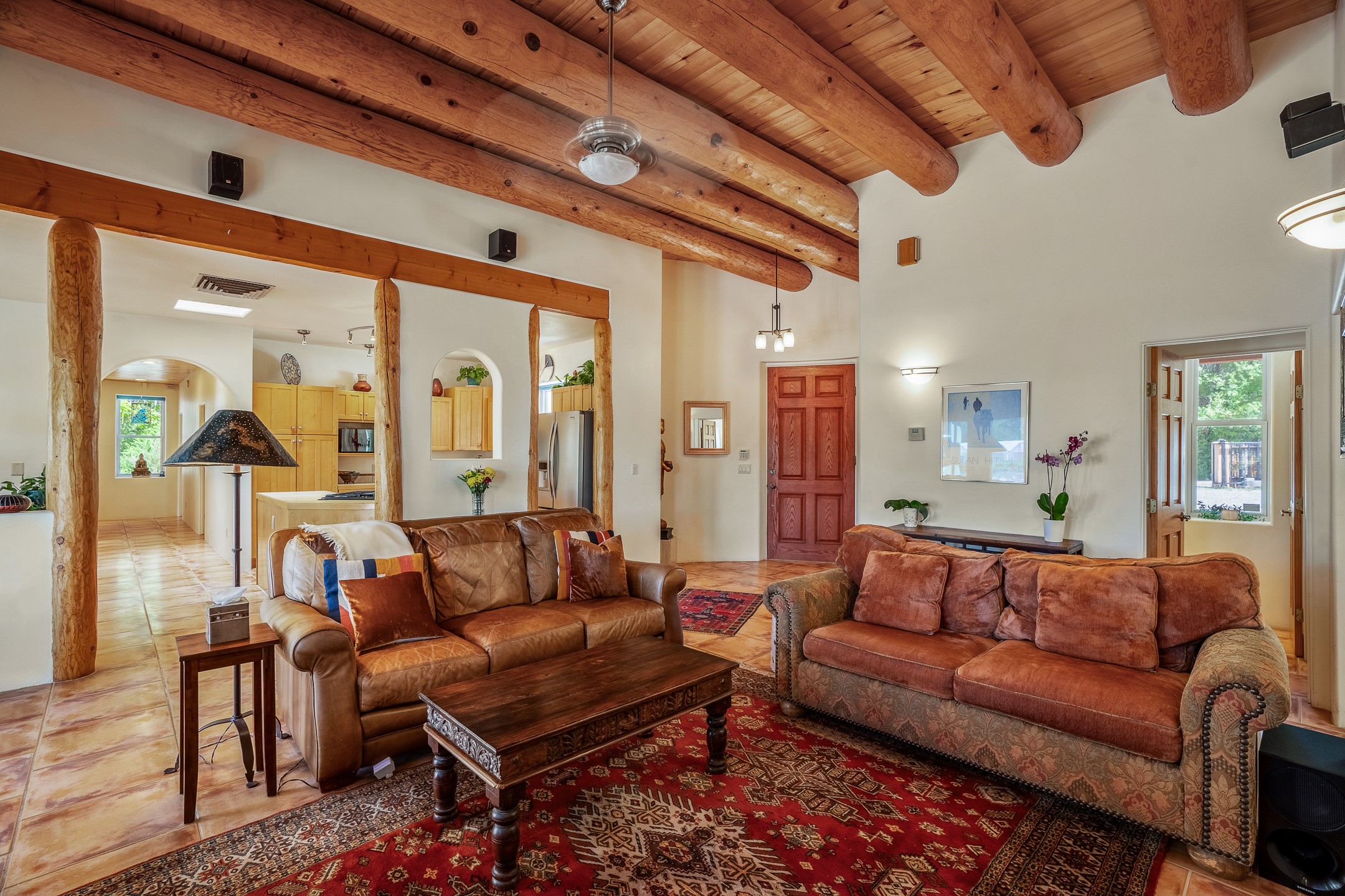 Custom Move-in-Ready, Single-Level, Southwestern-Style Home on 0.736 Acres! 2558 sq ft, 3 Bed / 2.5 Bath, Large Studio with Separate Entrance, Vaulted Wooden Tongue and Groove Ceilings, Skylights, Kiva Fireplace, Landscaping with Fruit Trees and Watering System, Backs to Organic Farm, Close to BLM Hiking Trails, Newer Roof (2022) Under Warranty, Water Filtration System, Cooling, and More! This beautiful custom home, located just 30 minutes from Los Alamos and Santa Fe, was built in 2001 using insulated concrete form (ICF) construction for long-life and great insulation, while also being impervious to fire, rot, and infestation. The home exudes high-end Southwestern charm and style, starting with the latilla and stucco fence that greets you upon arrival to the property. The charm continues as you enter the home and step into the showcase living room, featuring a wood-burning kiva fireplace, 14' ceilings, and 36' vigas. The tile floor flows throughout the living areas and leads to a large studio. The studio features a separate exterior entrance and access to the powder room, perfect for a home business/office or for a family recreation room. The kitchen features stainless-steel appliances, including a gas range with a convection/air fryer oven, and a large peninsula for preparing and staging food for holiday meals. It flows into the formal dining room and has easy access to the flagstone patio for indoor-outdoor entertaining. When it's time to wind down, head towards the bedroom wing, where you'll find two guest bedrooms, a guest bathroom, and the primary suite. The primary suite features wood tongue and groove ceilings, a curved architectural wall, nichos for displaying art, a private sitting area, a walk-in closet, and a large en suite bathroom. The en suite bathroom features dual vanities, a walk-in shower, and a Jacuzzi tub. Stepping into the back yard, you will enjoy a large flagstone patio covered with a 14' high pergola, established landscaping that includes fruit trees and a six-station irrigation system, and access to a walking path around an organic farm. Additional property features include a security system, electric gate, newer (2022) roof with transferable warranty, evaporative cooling, five-zone radiant heating system, and a whole-house water filtration system. Call today to schedule your private showing before this beautiful property is gone!