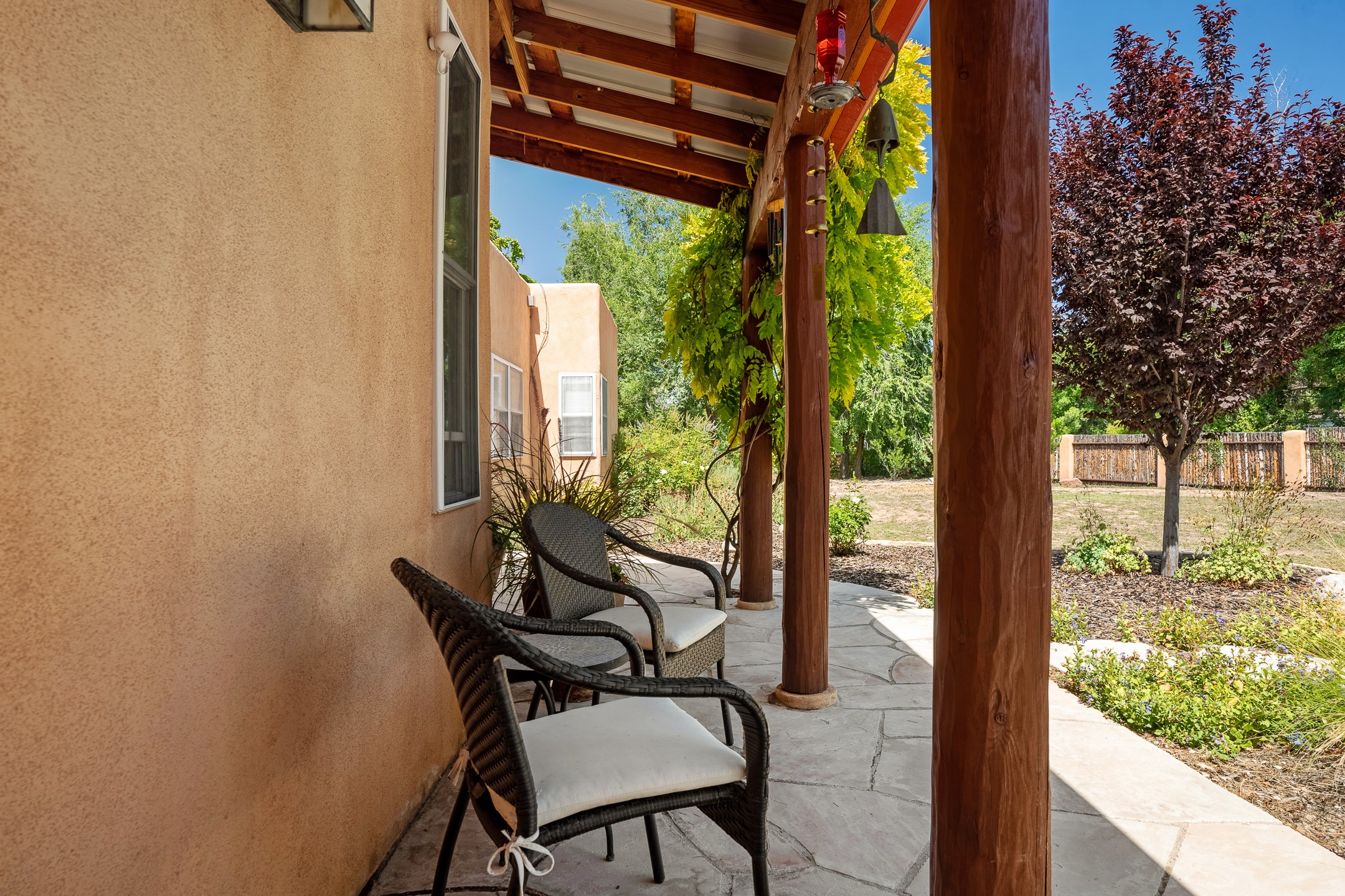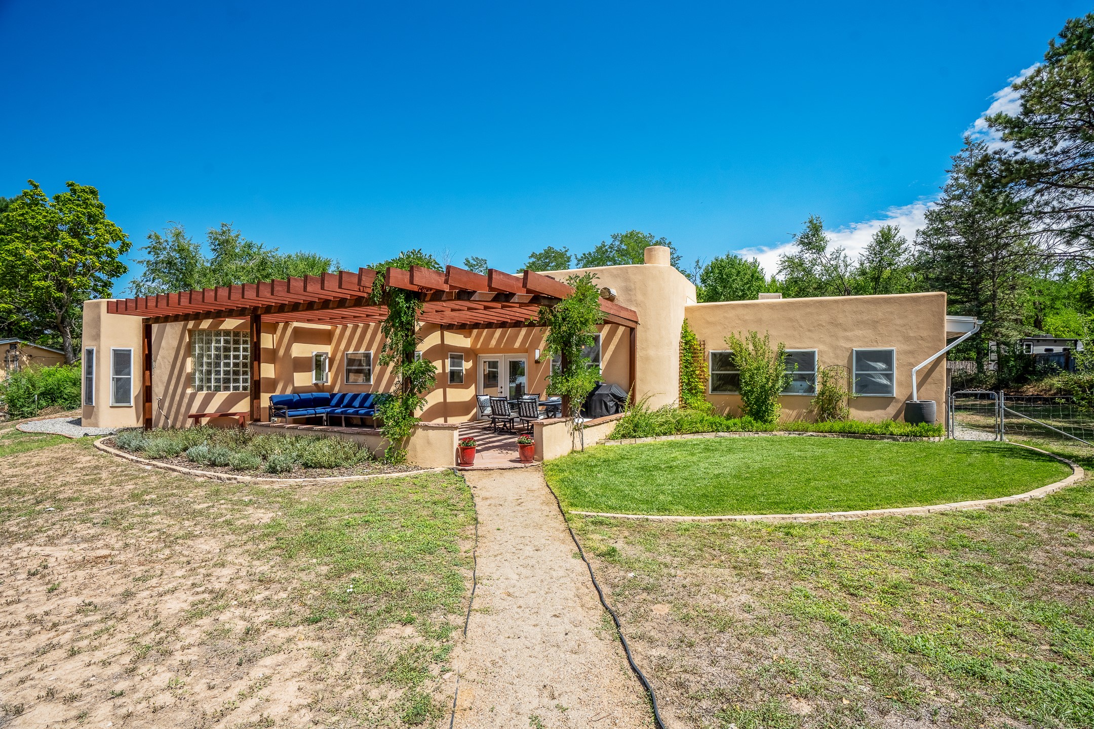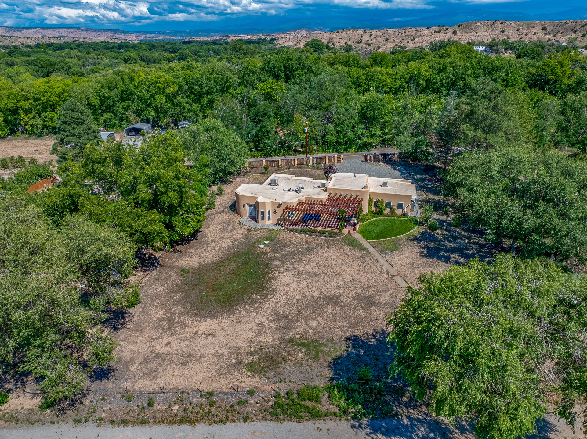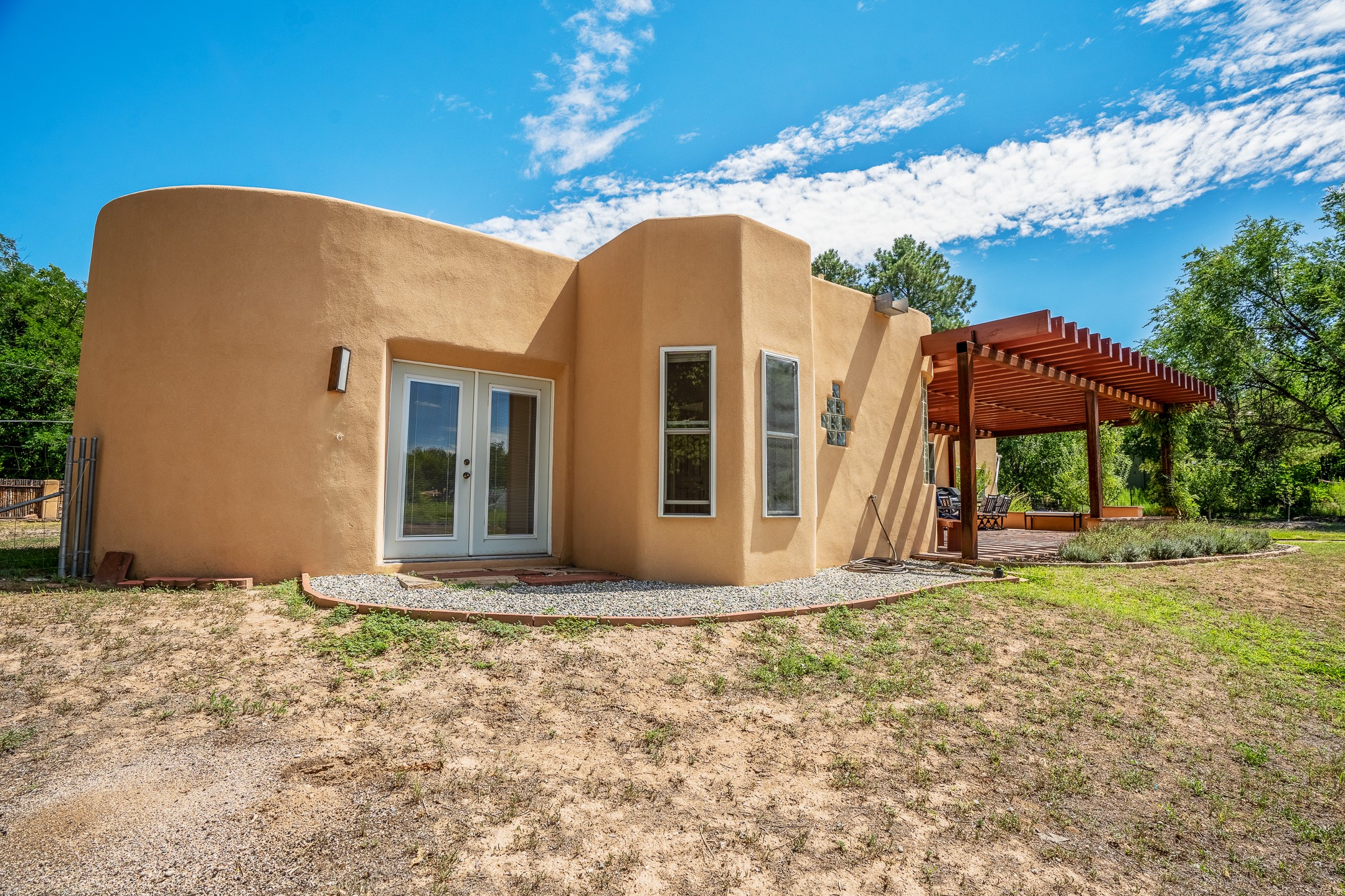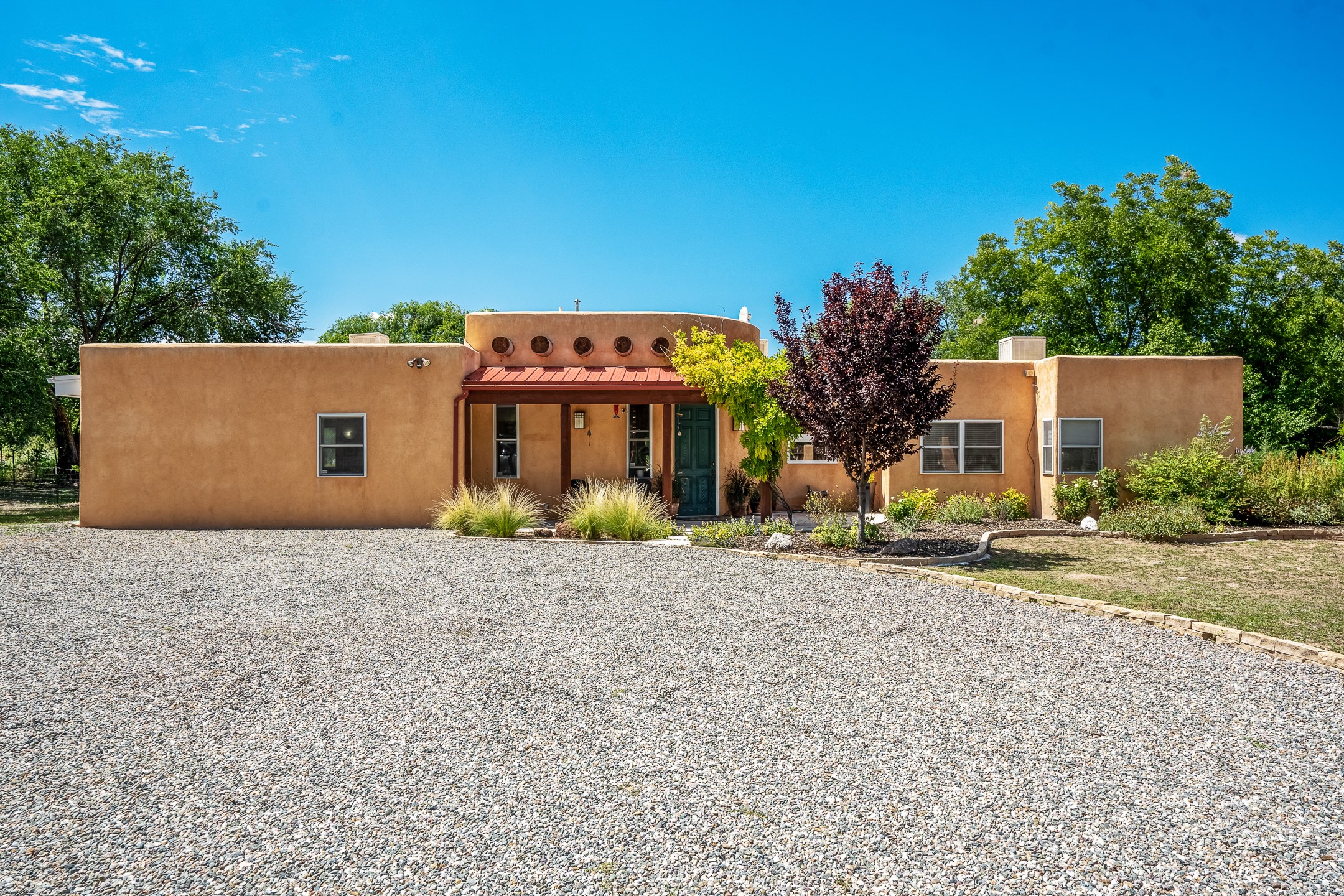Custom Move-in-Ready, Single-Level, Southwestern-Style Home on 0.736 Acres! 2558 sq ft, 3 Bed / 2.5 Bath, Large Studio with Separate Entrance, Vaulted Wooden Tongue and Groove Ceilings, Skylights, Kiva Fireplace, Landscaping with Fruit Trees and Watering System, Backs to Organic Farm, Close to BLM Hiking Trails, Newer Roof (2022) Under Warranty, Water Filtration System, Cooling, and More! This beautiful custom home, located just 30 minutes from Los Alamos and Santa Fe, was built in 2001 using insulated concrete form (ICF) construction for long-life and great insulation, while also being impervious to fire, rot, and infestation. The home exudes high-end Southwestern charm and style, starting with the latilla and stucco fence that greets you upon arrival to the property. The charm continues as you enter the home and step into the showcase living room, featuring a wood-burning kiva fireplace, 14' ceilings, and 36' vigas. The tile floor flows throughout the living areas and leads to a large studio. The studio features a separate exterior entrance and access to the powder room, perfect for a home business/office or for a family recreation room. The kitchen features stainless-steel appliances, including a gas range with a convection/air fryer oven, and a large peninsula for preparing and staging food for holiday meals. It flows into the formal dining room and has easy access to the flagstone patio for indoor-outdoor entertaining. When it's time to wind down, head towards the bedroom wing, where you'll find two guest bedrooms, a guest bathroom, and the primary suite. The primary suite features wood tongue and groove ceilings, a curved architectural wall, nichos for displaying art, a private sitting area, a walk-in closet, and a large en suite bathroom. The en suite bathroom features dual vanities, a walk-in shower, and a Jacuzzi tub. Stepping into the back yard, you will enjoy a large flagstone patio covered with a 14' high pergola, established landscaping that includes fruit trees and a six-station irrigation system, and access to a walking path around an organic farm. Additional property features include a security system, electric gate, newer (2022) roof with transferable warranty, evaporative cooling, five-zone radiant heating system, and a whole-house water filtration system. Call today to schedule your private showing before this beautiful property is gone!