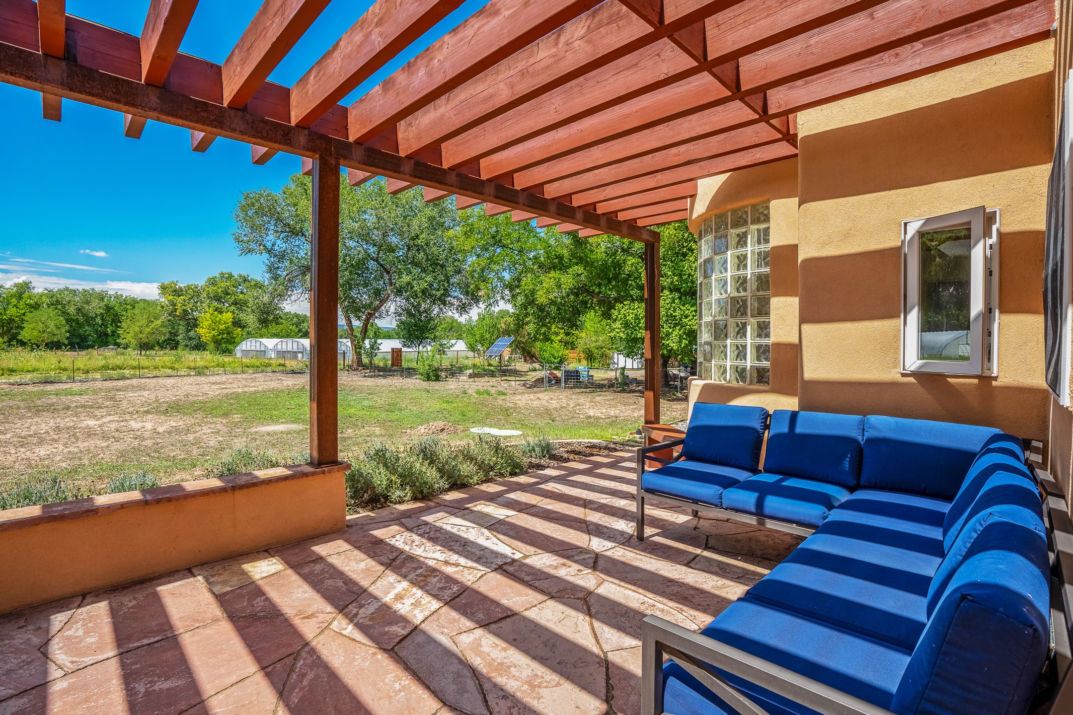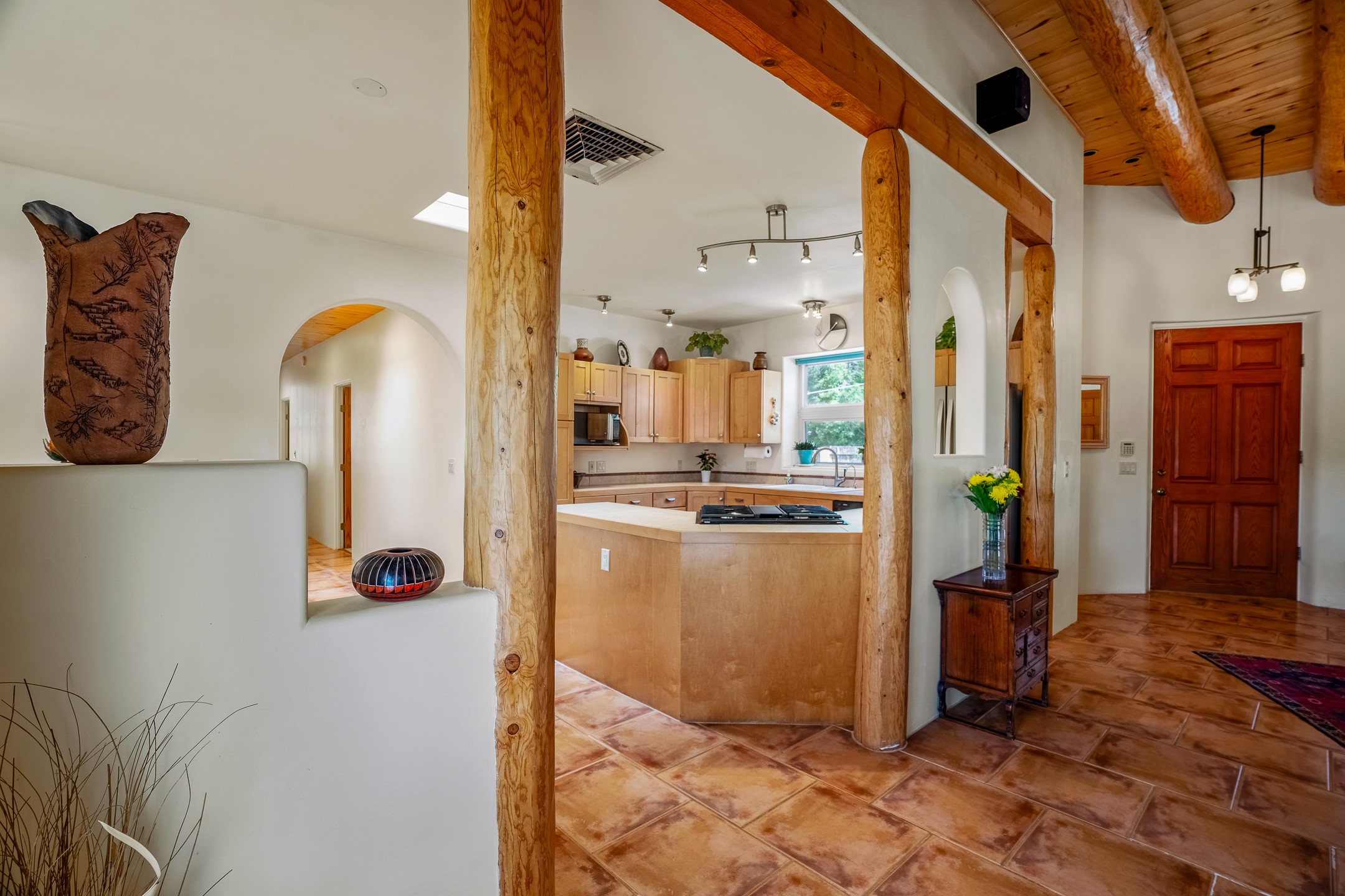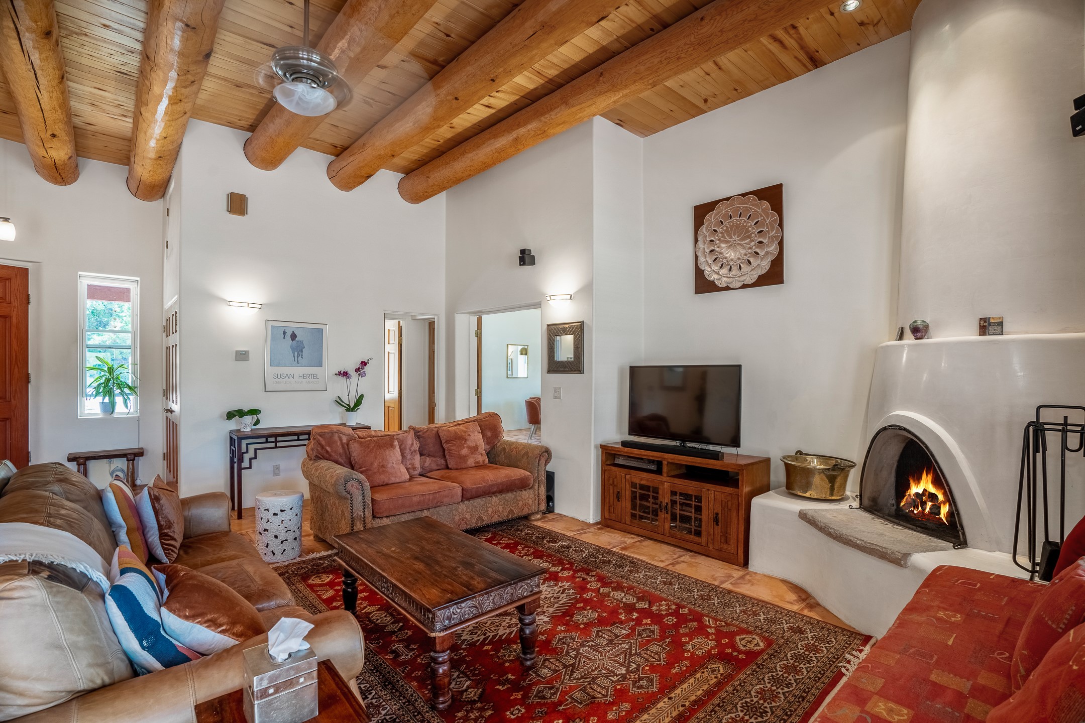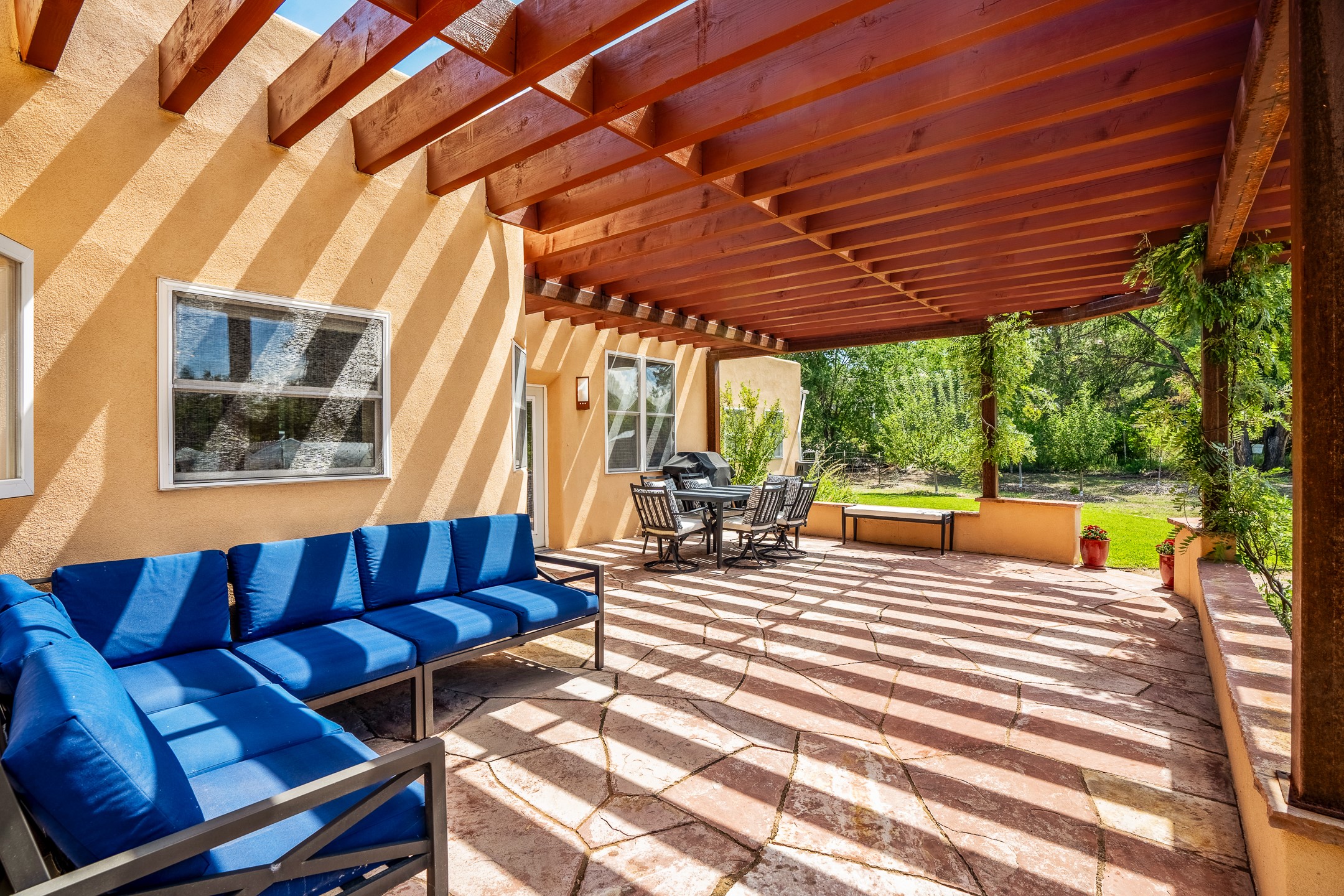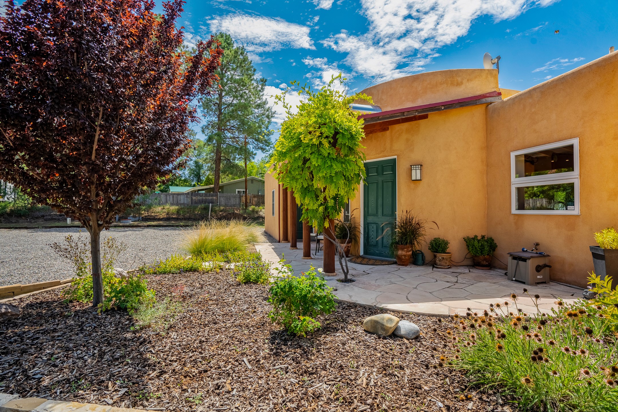 Custom Move-in-Ready, Single-Level, Southwestern-Style Home on 0.736 Acres! 2558 sq ft, 3 Bed / 2.5 Bath, Large Studio with Separate Entrance, Vaulted Wooden Tongue and Groove Ceilings, Skylights, Kiva Fireplace, Landscaping with Fruit Trees and Watering System, Backs to Organic Farm, Close to BLM Hiking Trails, Newer Roof (2022) Under Warranty, Water Filtration System, Cooling, and More! This beautiful custom home, located just 30 minutes from Los Alamos and Santa Fe, was built in 2001 using insulated concrete form (ICF) construction for long-life and great insulation, while also being impervious to fire, rot, and infestation. The home exudes high-end Southwestern charm and style, starting with the latilla and stucco fence that greets you upon arrival to the property. The charm continues as you enter the home and step into the showcase living room, featuring a wood-burning kiva fireplace, 14' ceilings, and 36' vigas. The tile floor flows throughout the living areas and leads to a large studio. The studio features a separate exterior entrance and access to the powder room, perfect for a home business/office or for a family recreation room. The kitchen features stainless-steel appliances, including a gas range with a convection/air fryer oven, and a large peninsula for preparing and staging food for holiday meals. It flows into the formal dining room and has easy access to the flagstone patio for indoor-outdoor entertaining. When it's time to wind down, head towards the bedroom wing, where you'll find two guest bedrooms, a guest bathroom, and the primary suite. The primary suite features wood tongue and groove ceilings, a curved architectural wall, nichos for displaying art, a private sitting area, a walk-in closet, and a large en suite bathroom. The en suite bathroom features dual vanities, a walk-in shower, and a Jacuzzi tub. Stepping into the back yard, you will enjoy a large flagstone patio covered with a 14' high pergola, established landscaping that includes fruit trees and a six-station irrigation system, and access to a walking path around an organic farm. Additional property features include a security system, electric gate, newer (2022) roof with transferable warranty, evaporative cooling, five-zone radiant heating system, and a whole-house water filtration system. Call today to schedule your private showing before this beautiful property is gone!