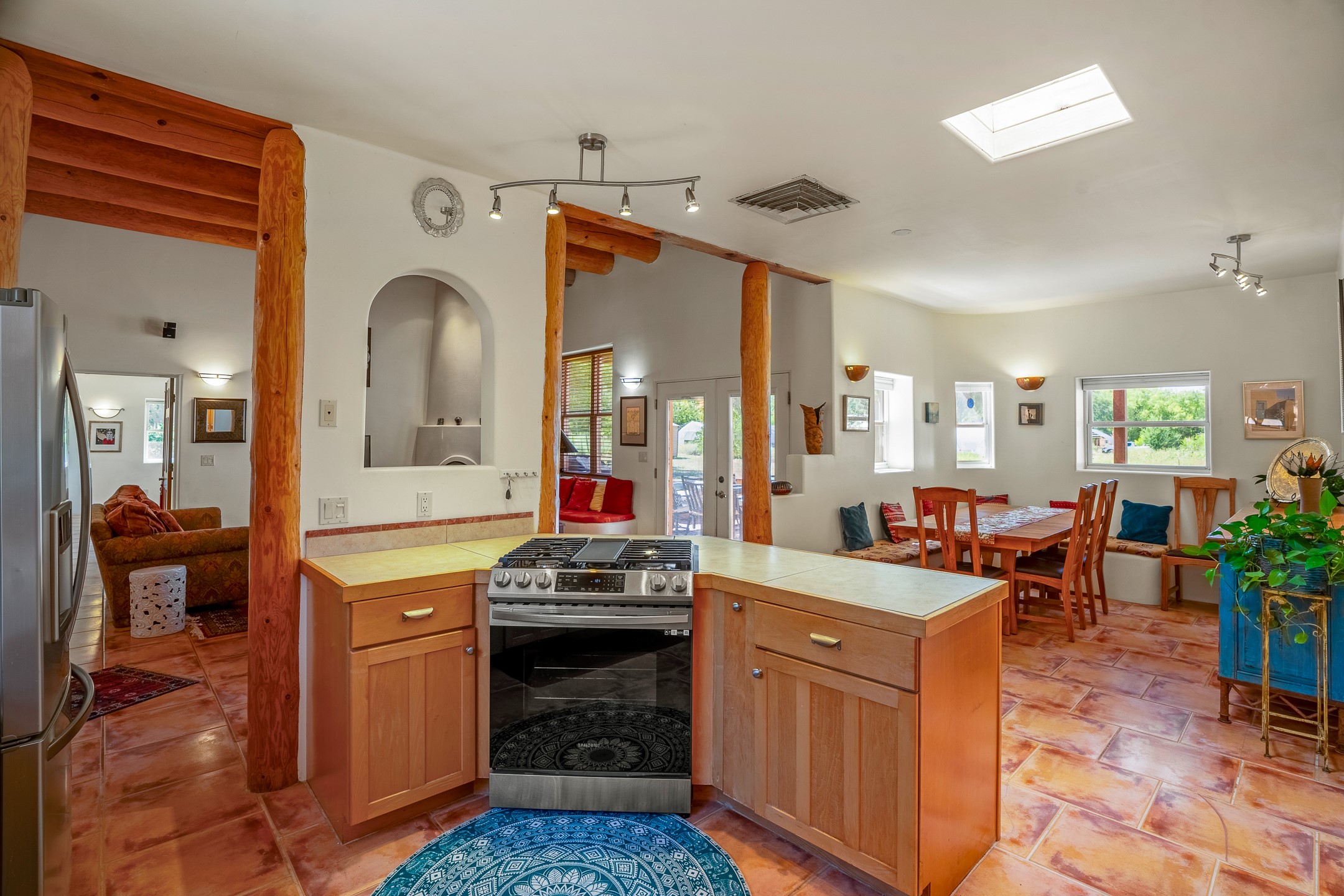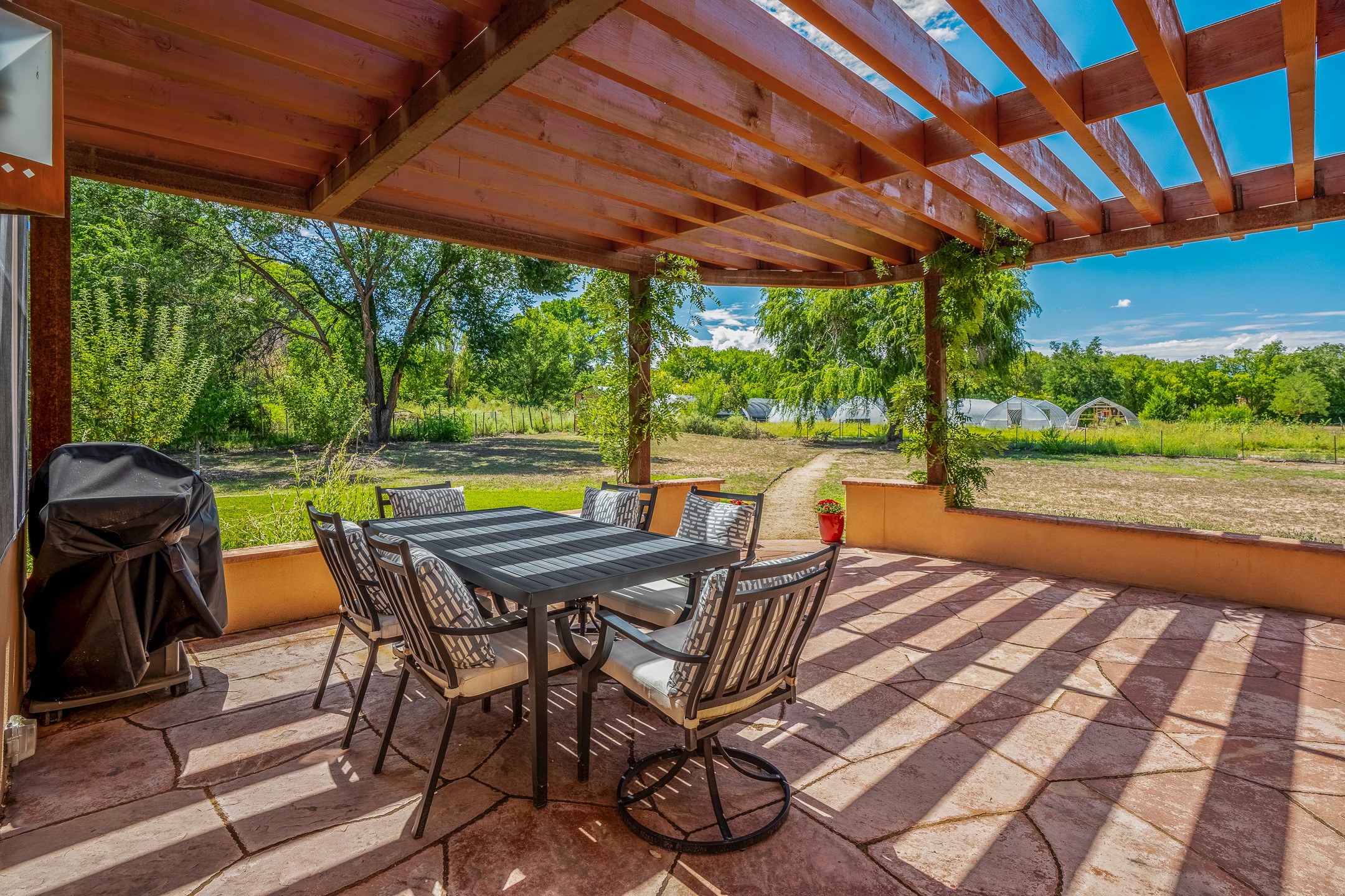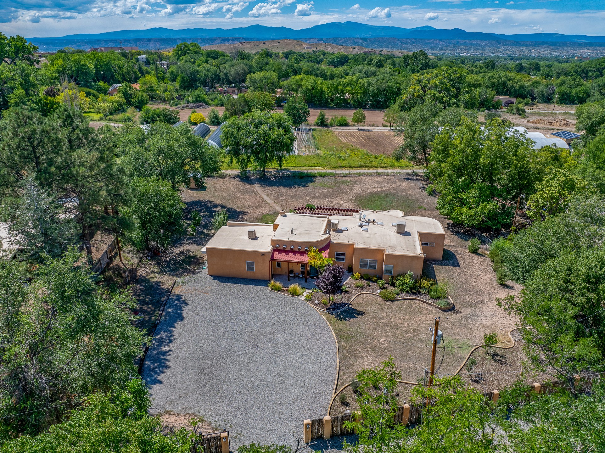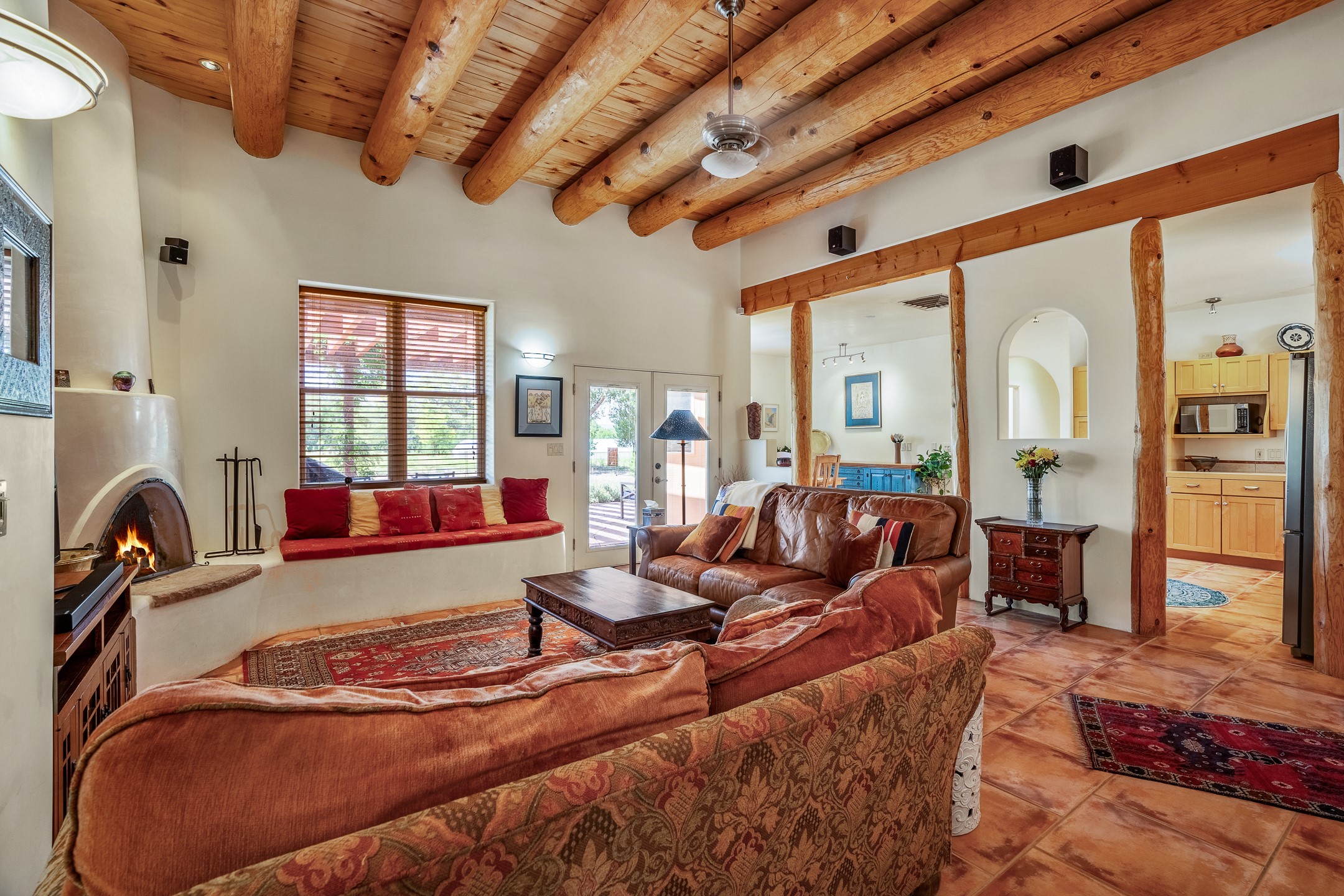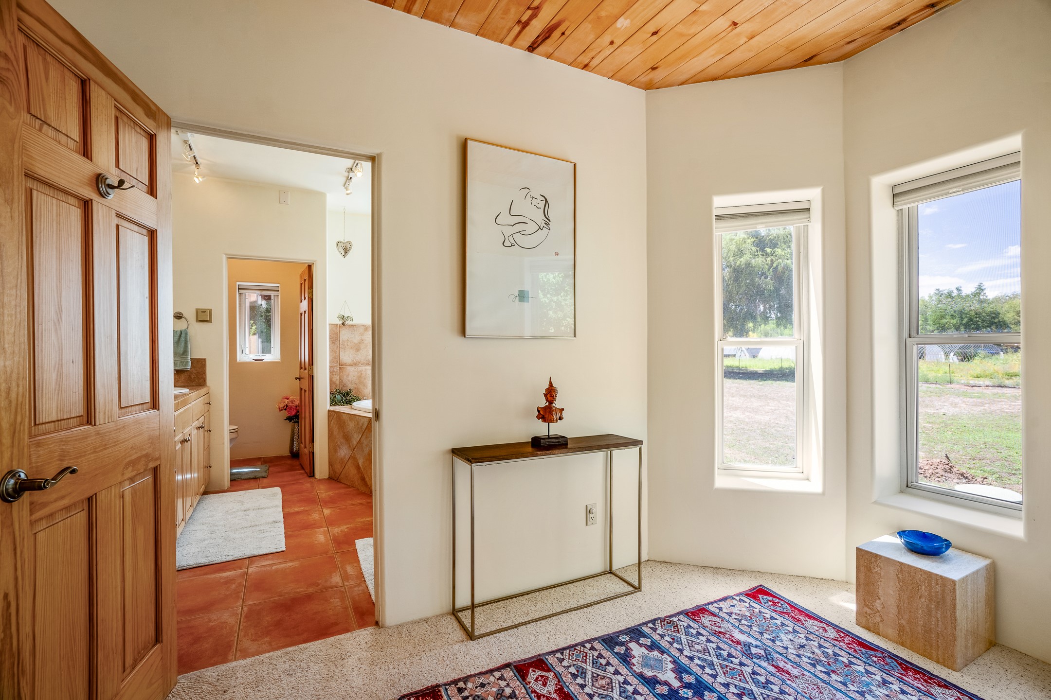 Custom Move-in-Ready, Single-Level, Southwestern-Style Home on 0.736 Acres! 2558 sq ft, 3 Bed / 2.5 Bath, Large Studio with Separate Entrance, Vaulted Wooden Tongue and Groove Ceilings, Skylights, Kiva Fireplace, Landscaping with Fruit Trees and Watering System, Backs to Organic Farm, Close to BLM Hiking Trails, Newer Roof (2022) Under Warranty, Water Filtration System, Cooling, and More! This beautiful custom home, located just 30 minutes from Los Alamos and Santa Fe, was built in 2001 using insulated concrete form (ICF) construction for long-life and great insulation, while also being impervious to fire, rot, and infestation. The home exudes high-end Southwestern charm and style, starting with the latilla and stucco fence that greets you upon arrival to the property. The charm continues as you enter the home and step into the showcase living room, featuring a wood-burning kiva fireplace, 14' ceilings, and 36' vigas. The tile floor flows throughout the living areas and leads to a large studio. The studio features a separate exterior entrance and access to the powder room, perfect for a home business/office or for a family recreation room. The kitchen features stainless-steel appliances, including a gas range with a convection/air fryer oven, and a large peninsula for preparing and staging food for holiday meals. It flows into the formal dining room and has easy access to the flagstone patio for indoor-outdoor entertaining. When it's time to wind down, head towards the bedroom wing, where you'll find two guest bedrooms, a guest bathroom, and the primary suite. The primary suite features wood tongue and groove ceilings, a curved architectural wall, nichos for displaying art, a private sitting area, a walk-in closet, and a large en suite bathroom. The en suite bathroom features dual vanities, a walk-in shower, and a Jacuzzi tub. Stepping into the back yard, you will enjoy a large flagstone patio covered with a 14' high pergola, established landscaping that includes fruit trees and a six-station irrigation system, and access to a walking path around an organic farm. Additional property features include a security system, electric gate, newer (2022) roof with transferable warranty, evaporative cooling, five-zone radiant heating system, and a whole-house water filtration system. Call today to schedule your private showing before this beautiful property is gone!