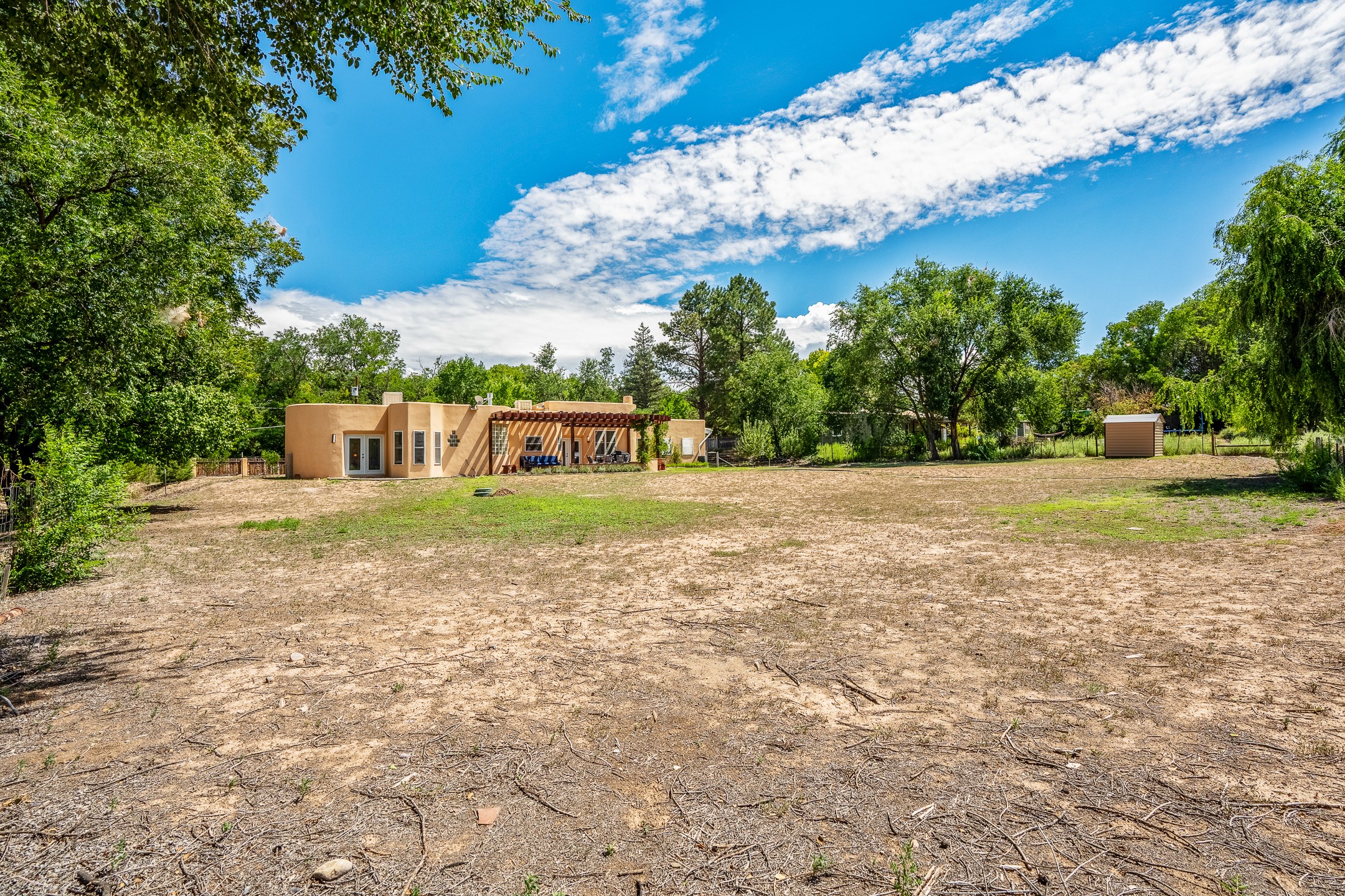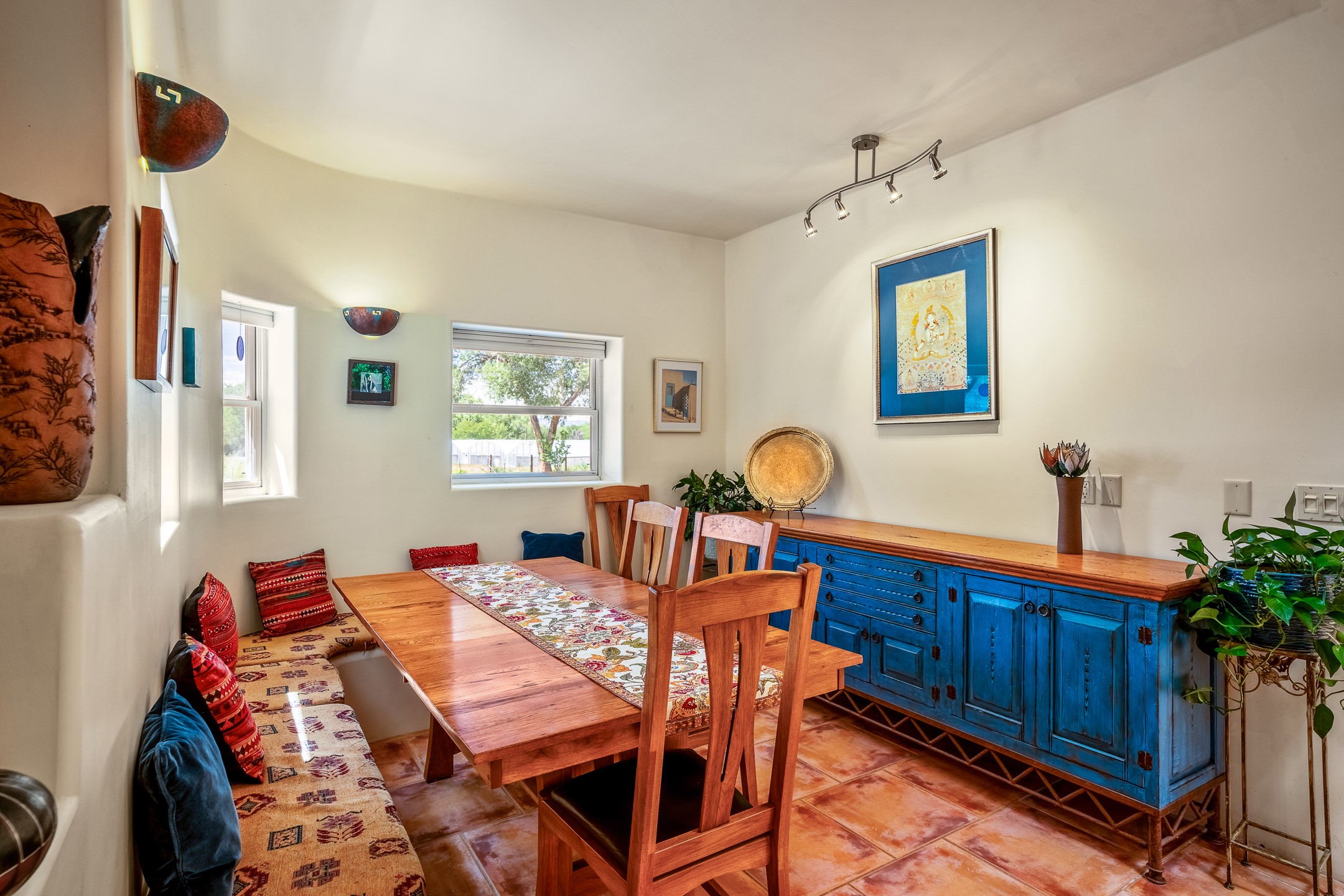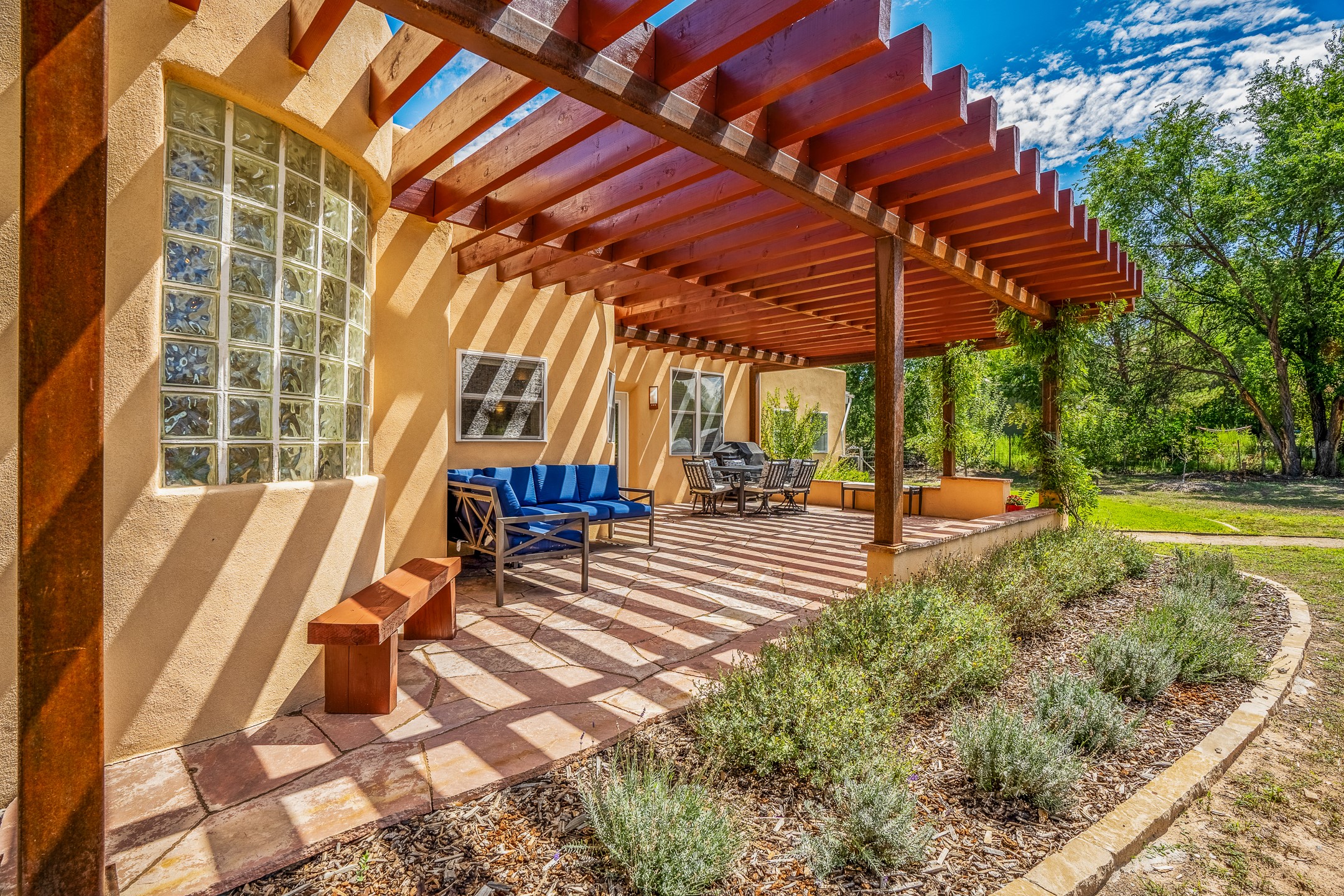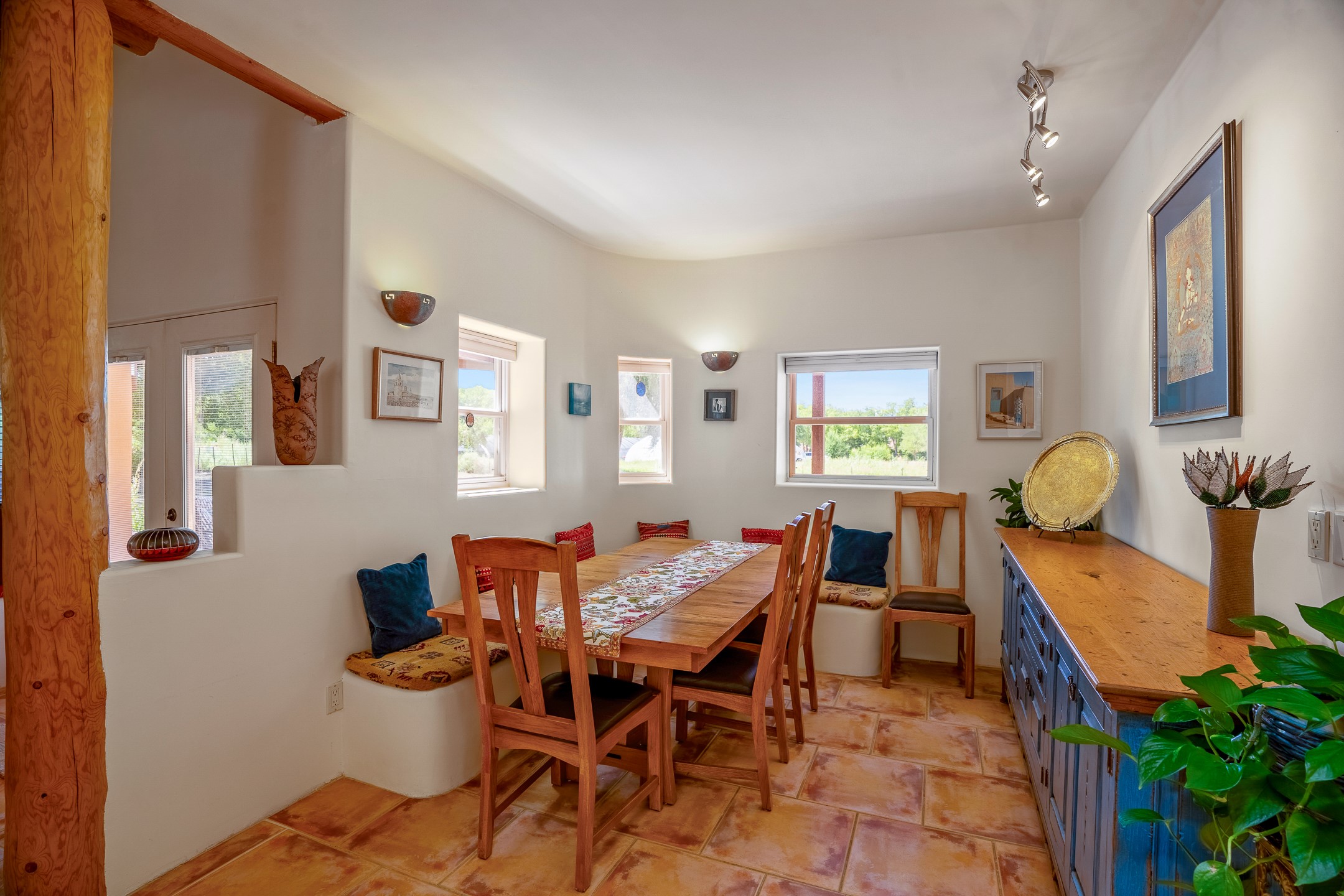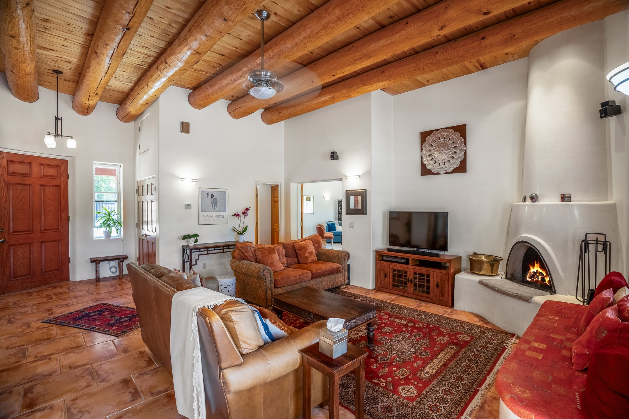 Custom Move-in-Ready, Single-Level, Southwestern-Style Home on 0.736 Acres! 2558 sq ft, 3 Bed / 2.5 Bath, Large Studio with Separate Entrance, Vaulted Wooden Tongue and Groove Ceilings, Skylights, Kiva Fireplace, Landscaping with Fruit Trees and Watering System, Backs to Organic Farm, Close to BLM Hiking Trails, Newer Roof (2022) Under Warranty, Water Filtration System, Cooling, and More! This beautiful custom home, located just 30 minutes from Los Alamos and Santa Fe, was built in 2001 using insulated concrete form (ICF) construction for long-life and great insulation, while also being impervious to fire, rot, and infestation. The home exudes high-end Southwestern charm and style, starting with the latilla and stucco fence that greets you upon arrival to the property. The charm continues as you enter the home and step into the showcase living room, featuring a wood-burning kiva fireplace, 14' ceilings, and 36' vigas. The tile floor flows throughout the living areas and leads to a large studio. The studio features a separate exterior entrance and access to the powder room, perfect for a home business/office or for a family recreation room. The kitchen features stainless-steel appliances, including a gas range with a convection/air fryer oven, and a large peninsula for preparing and staging food for holiday meals. It flows into the formal dining room and has easy access to the flagstone patio for indoor-outdoor entertaining. When it's time to wind down, head towards the bedroom wing, where you'll find two guest bedrooms, a guest bathroom, and the primary suite. The primary suite features wood tongue and groove ceilings, a curved architectural wall, nichos for displaying art, a private sitting area, a walk-in closet, and a large en suite bathroom. The en suite bathroom features dual vanities, a walk-in shower, and a Jacuzzi tub. Stepping into the back yard, you will enjoy a large flagstone patio covered with a 14' high pergola, established landscaping that includes fruit trees and a six-station irrigation system, and access to a walking path around an organic farm. Additional property features include a security system, electric gate, newer (2022) roof with transferable warranty, evaporative cooling, five-zone radiant heating system, and a whole-house water filtration system. Call today to schedule your private showing before this beautiful property is gone!