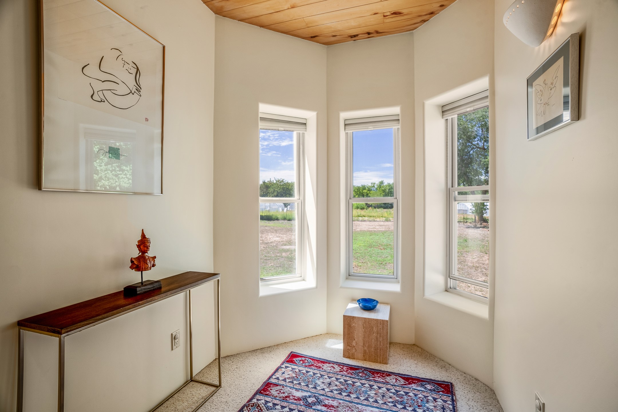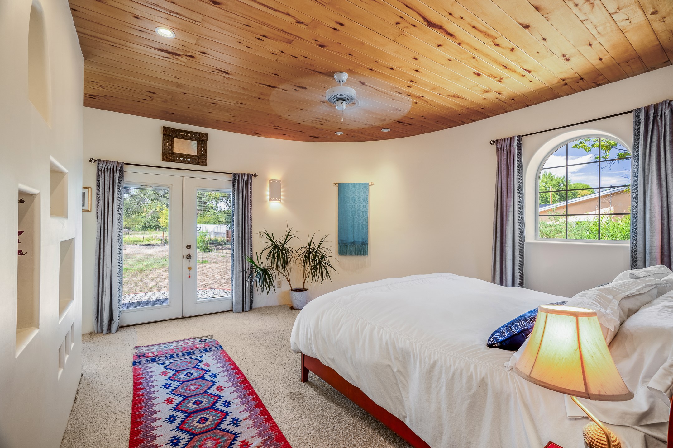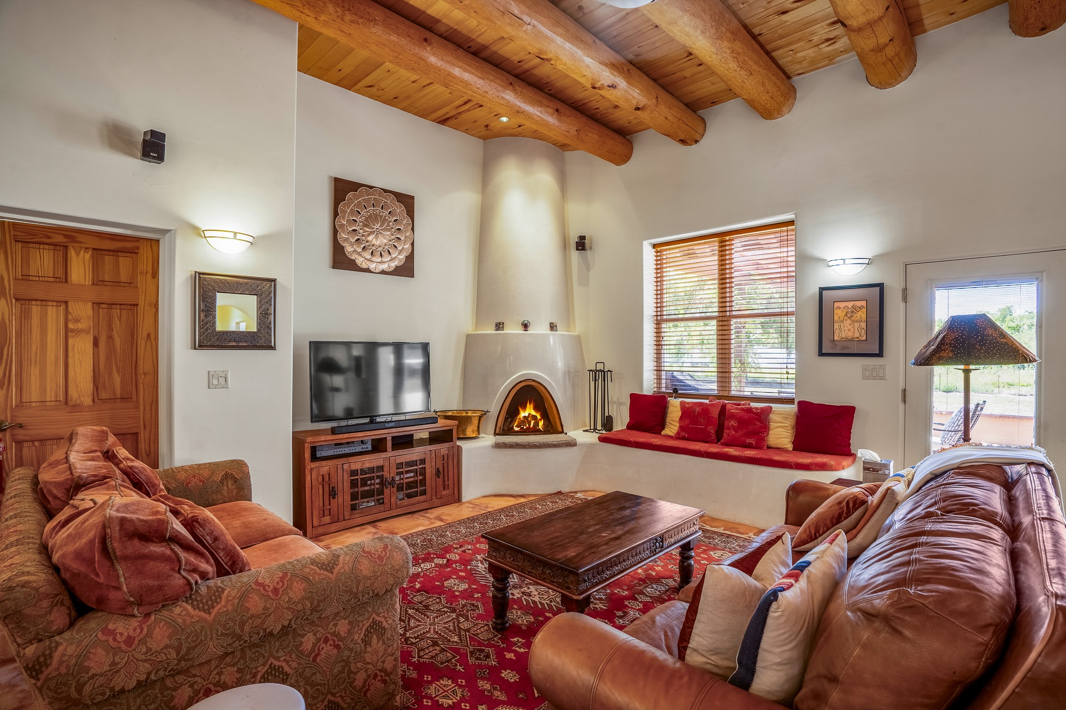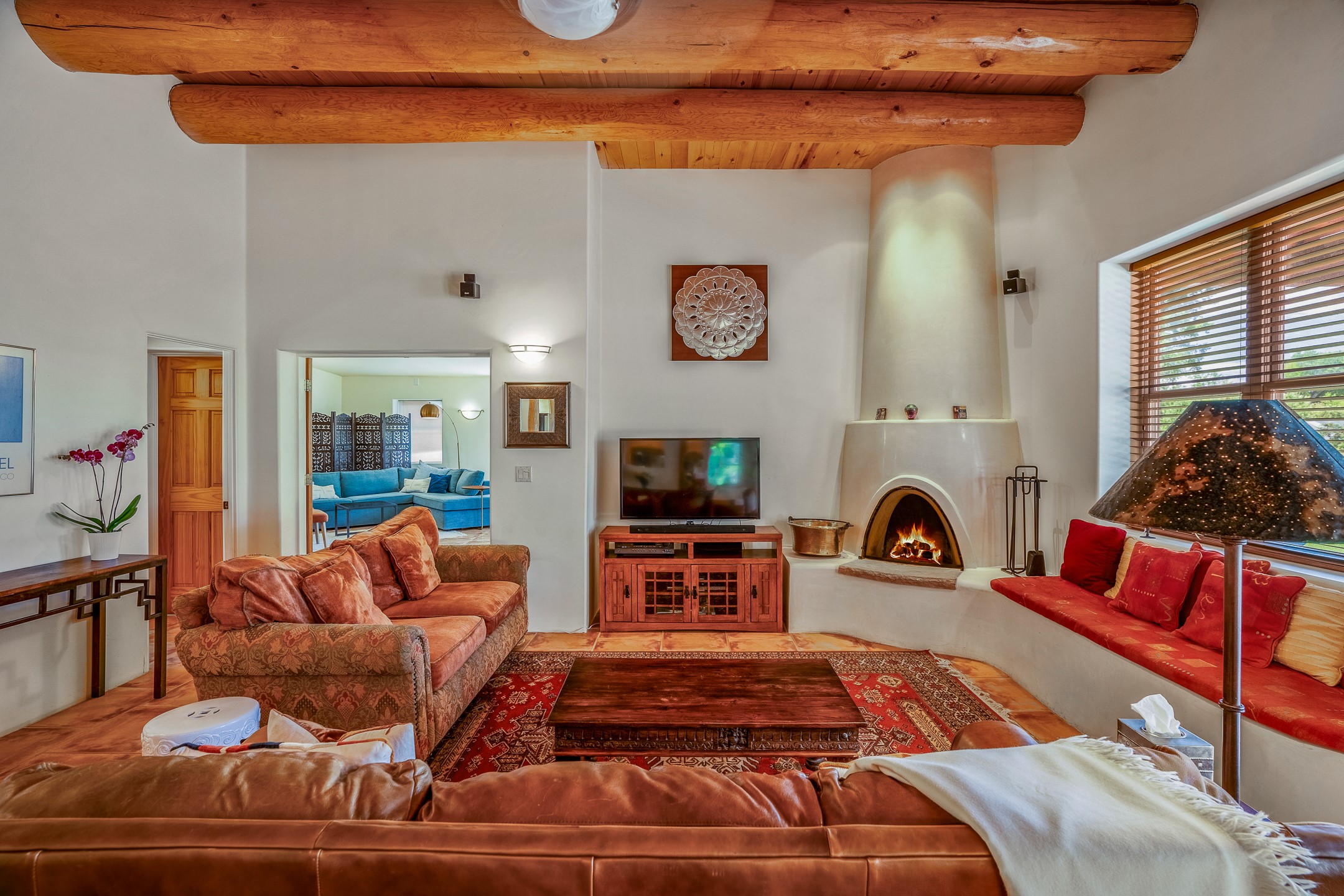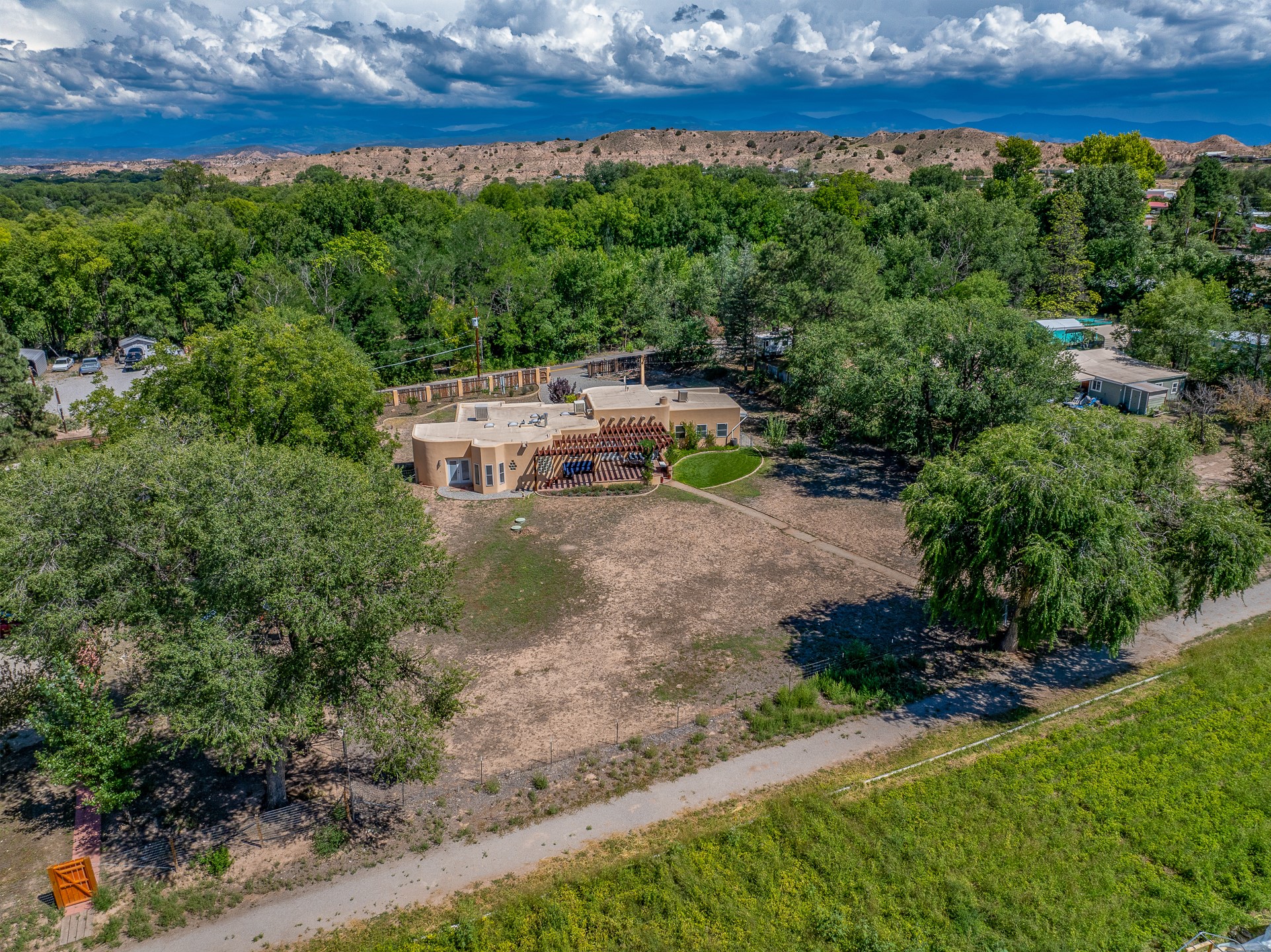 Custom Move-in-Ready, Single-Level, Southwestern-Style Home on 0.736 Acres! 2558 sq ft, 3 Bed / 2.5 Bath, Large Studio with Separate Entrance, Vaulted Wooden Tongue and Groove Ceilings, Skylights, Kiva Fireplace, Landscaping with Fruit Trees and Watering System, Backs to Organic Farm, Close to BLM Hiking Trails, Newer Roof (2022) Under Warranty, Water Filtration System, Cooling, and More! This beautiful custom home, located just 30 minutes from Los Alamos and Santa Fe, was built in 2001 using insulated concrete form (ICF) construction for long-life and great insulation, while also being impervious to fire, rot, and infestation. The home exudes high-end Southwestern charm and style, starting with the latilla and stucco fence that greets you upon arrival to the property. The charm continues as you enter the home and step into the showcase living room, featuring a wood-burning kiva fireplace, 14' ceilings, and 36' vigas. The tile floor flows throughout the living areas and leads to a large studio. The studio features a separate exterior entrance and access to the powder room, perfect for a home business/office or for a family recreation room. The kitchen features stainless-steel appliances, including a gas range with a convection/air fryer oven, and a large peninsula for preparing and staging food for holiday meals. It flows into the formal dining room and has easy access to the flagstone patio for indoor-outdoor entertaining. When it's time to wind down, head towards the bedroom wing, where you'll find two guest bedrooms, a guest bathroom, and the primary suite. The primary suite features wood tongue and groove ceilings, a curved architectural wall, nichos for displaying art, a private sitting area, a walk-in closet, and a large en suite bathroom. The en suite bathroom features dual vanities, a walk-in shower, and a Jacuzzi tub. Stepping into the back yard, you will enjoy a large flagstone patio covered with a 14' high pergola, established landscaping that includes fruit trees and a six-station irrigation system, and access to a walking path around an organic farm. Additional property features include a security system, electric gate, newer (2022) roof with transferable warranty, evaporative cooling, five-zone radiant heating system, and a whole-house water filtration system. Call today to schedule your private showing before this beautiful property is gone!
