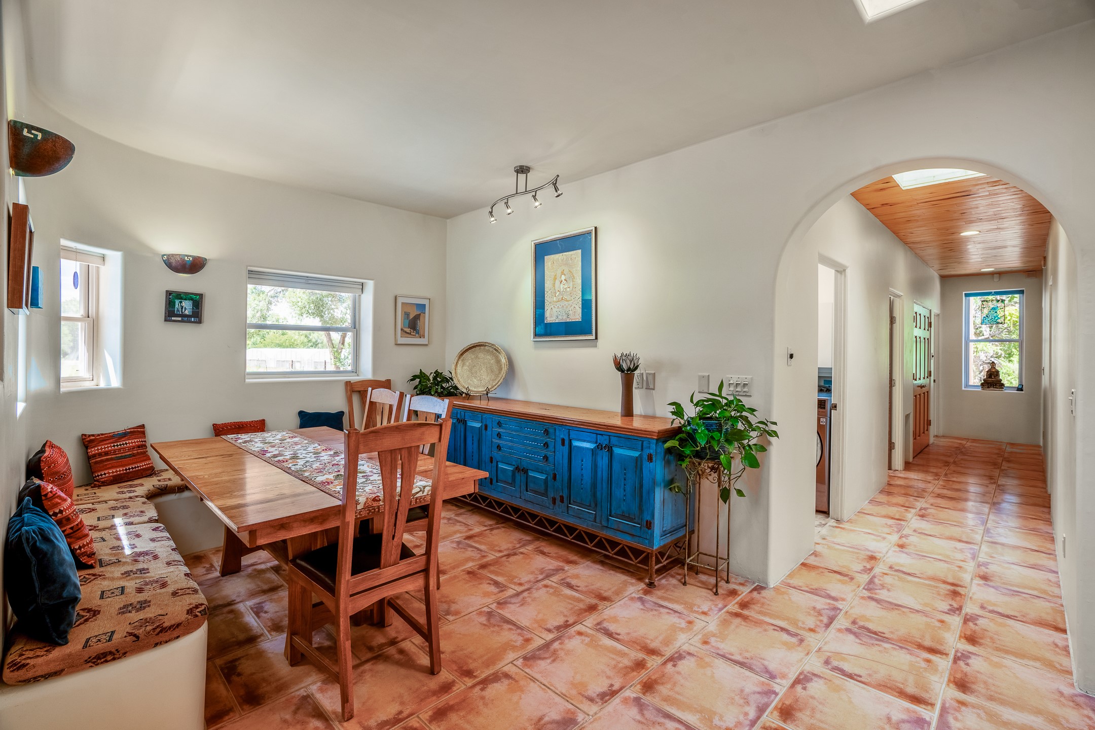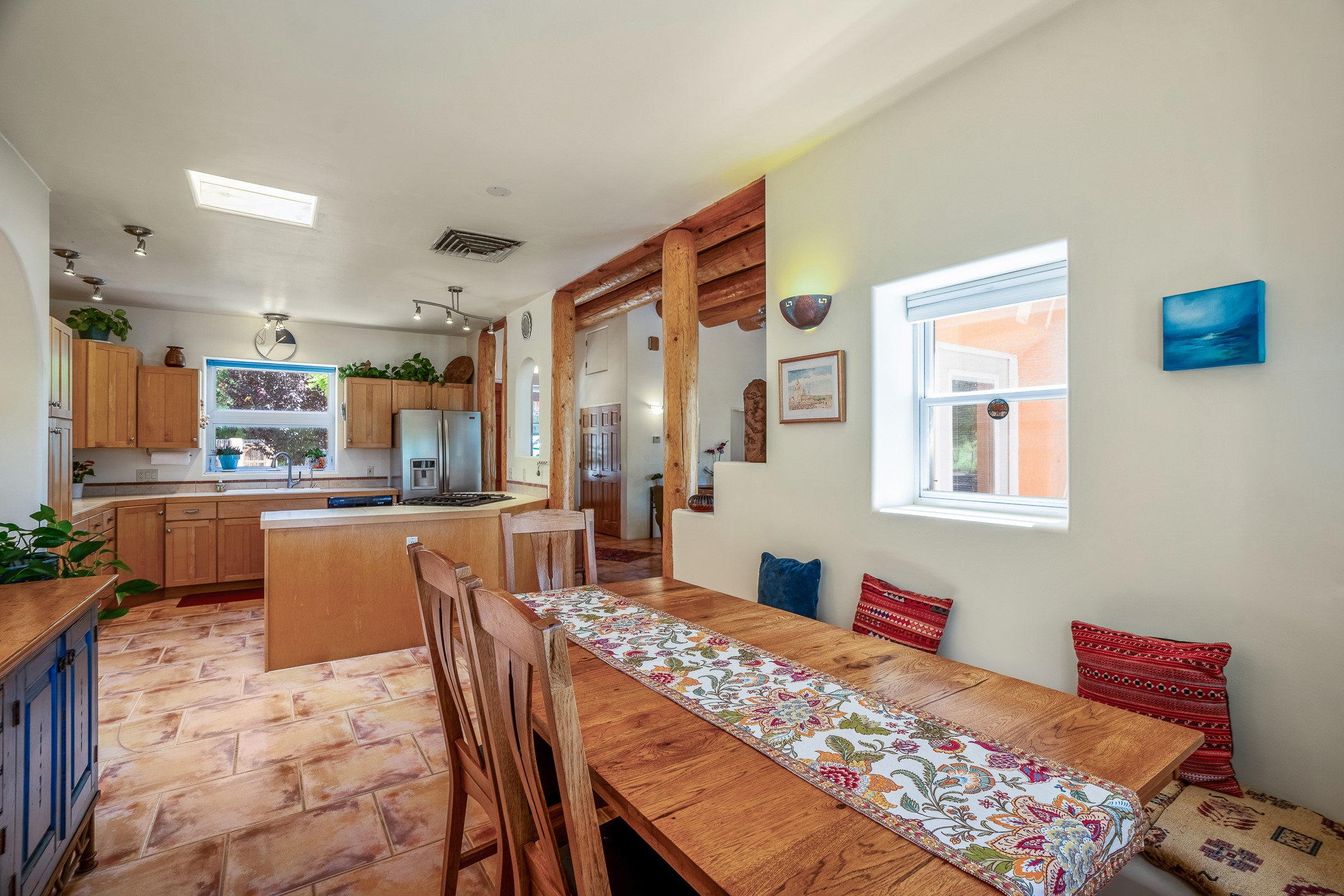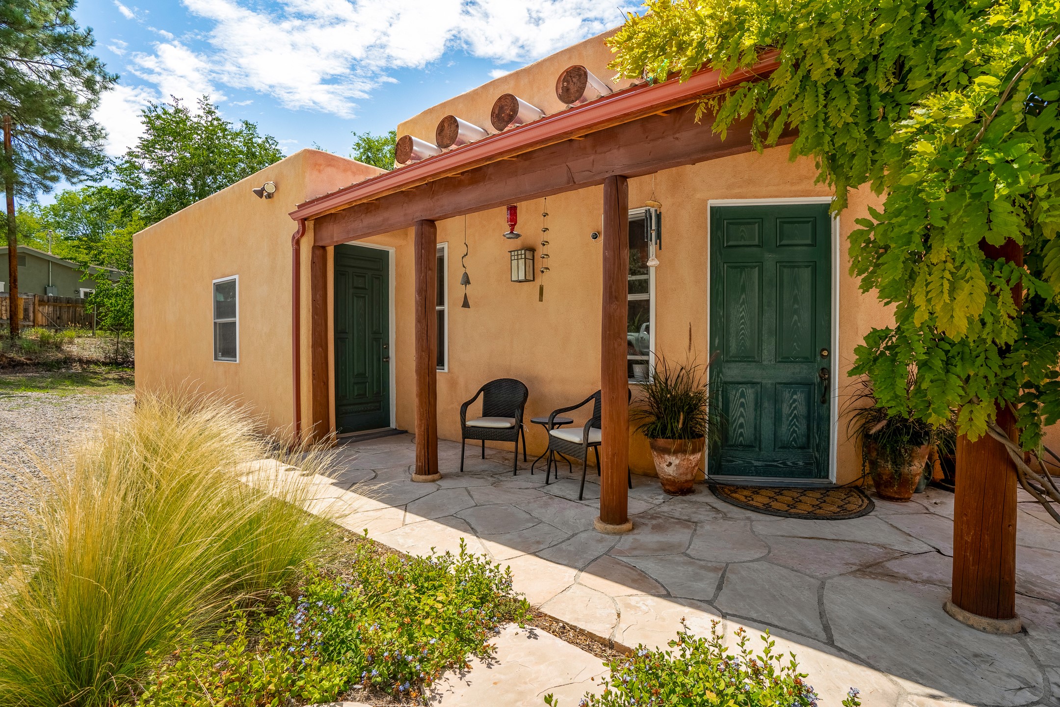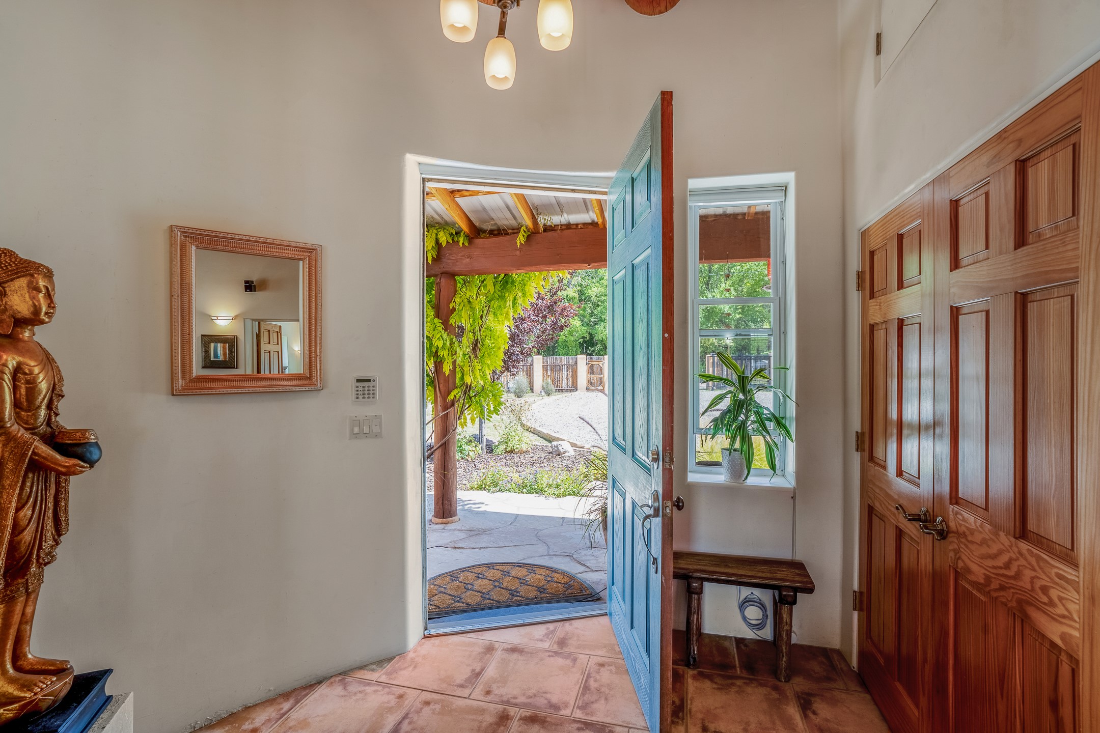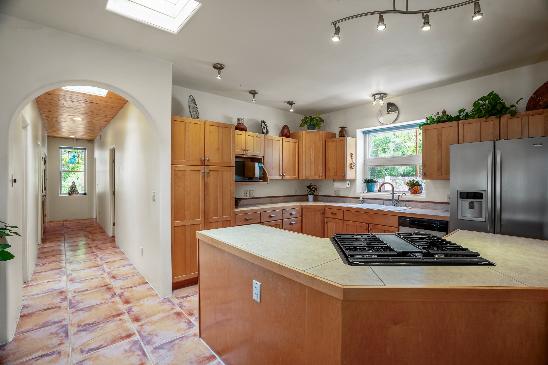 Custom Move-in-Ready, Single-Level, Southwestern-Style Home on 0.736 Acres! 2558 sq ft, 3 Bed / 2.5 Bath, Large Studio with Separate Entrance, Vaulted Wooden Tongue and Groove Ceilings, Skylights, Kiva Fireplace, Landscaping with Fruit Trees and Watering System, Backs to Organic Farm, Close to BLM Hiking Trails, Newer Roof (2022) Under Warranty, Water Filtration System, Cooling, and More! This beautiful custom home, located just 30 minutes from Los Alamos and Santa Fe, was built in 2001 using insulated concrete form (ICF) construction for long-life and great insulation, while also being impervious to fire, rot, and infestation. The home exudes high-end Southwestern charm and style, starting with the latilla and stucco fence that greets you upon arrival to the property. The charm continues as you enter the home and step into the showcase living room, featuring a wood-burning kiva fireplace, 14' ceilings, and 36' vigas. The tile floor flows throughout the living areas and leads to a large studio. The studio features a separate exterior entrance and access to the powder room, perfect for a home business/office or for a family recreation room. The kitchen features stainless-steel appliances, including a gas range with a convection/air fryer oven, and a large peninsula for preparing and staging food for holiday meals. It flows into the formal dining room and has easy access to the flagstone patio for indoor-outdoor entertaining. When it's time to wind down, head towards the bedroom wing, where you'll find two guest bedrooms, a guest bathroom, and the primary suite. The primary suite features wood tongue and groove ceilings, a curved architectural wall, nichos for displaying art, a private sitting area, a walk-in closet, and a large en suite bathroom. The en suite bathroom features dual vanities, a walk-in shower, and a Jacuzzi tub. Stepping into the back yard, you will enjoy a large flagstone patio covered with a 14' high pergola, established landscaping that includes fruit trees and a six-station irrigation system, and access to a walking path around an organic farm. Additional property features include a security system, electric gate, newer (2022) roof with transferable warranty, evaporative cooling, five-zone radiant heating system, and a whole-house water filtration system. Call today to schedule your private showing before this beautiful property is gone!