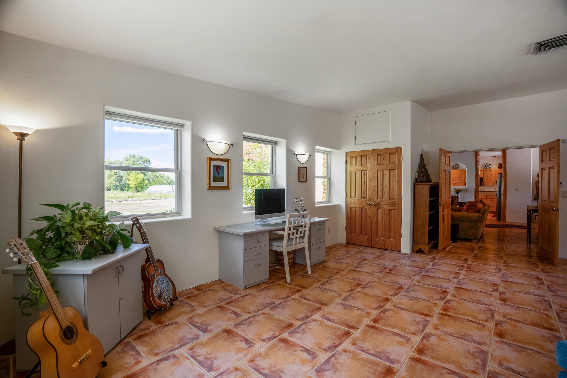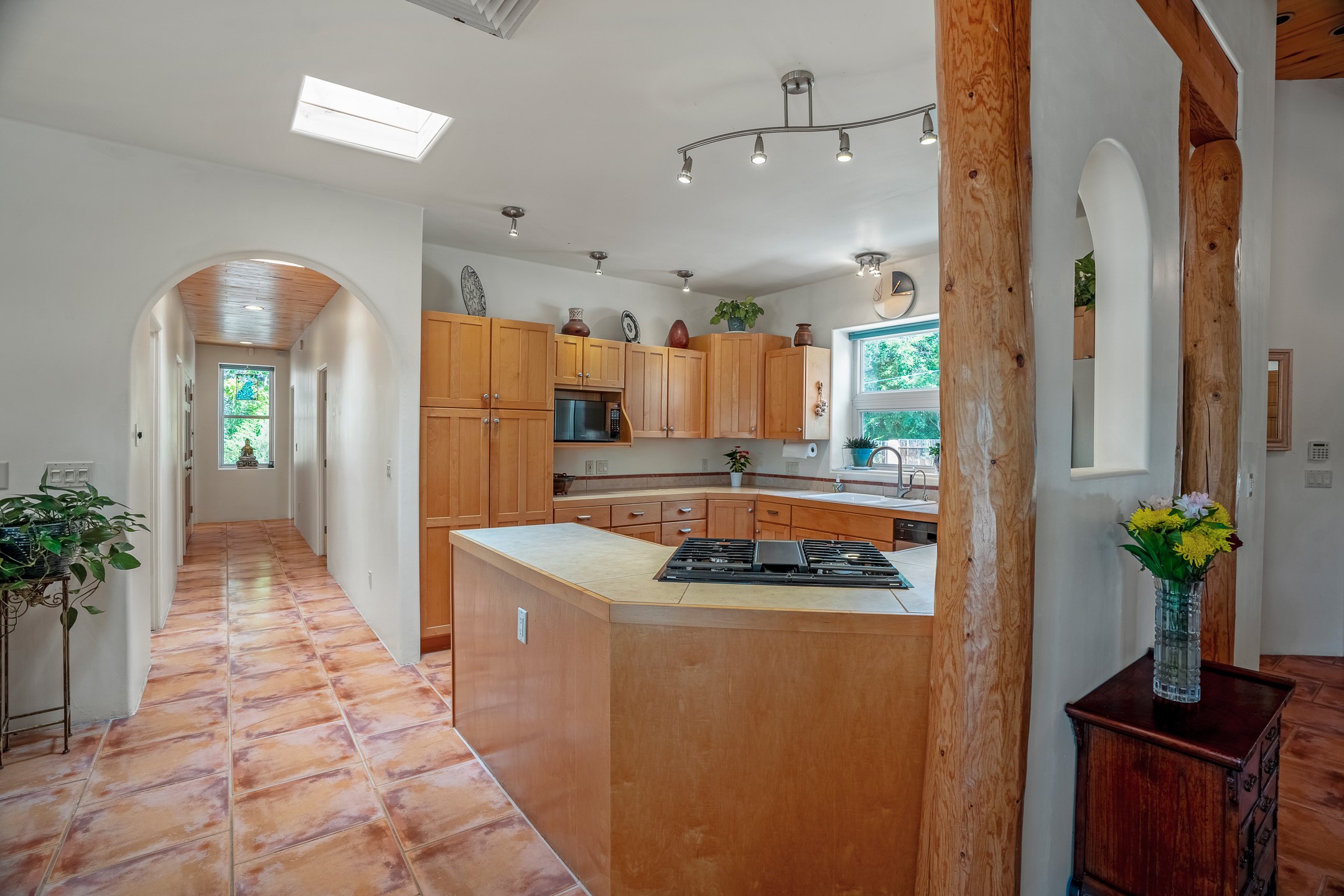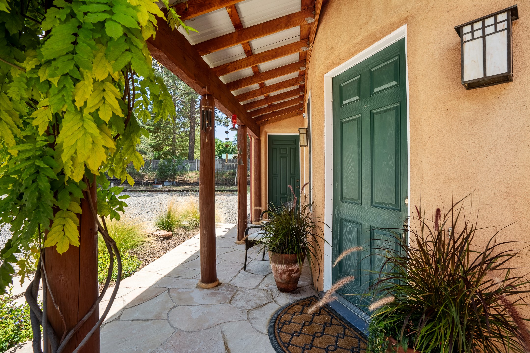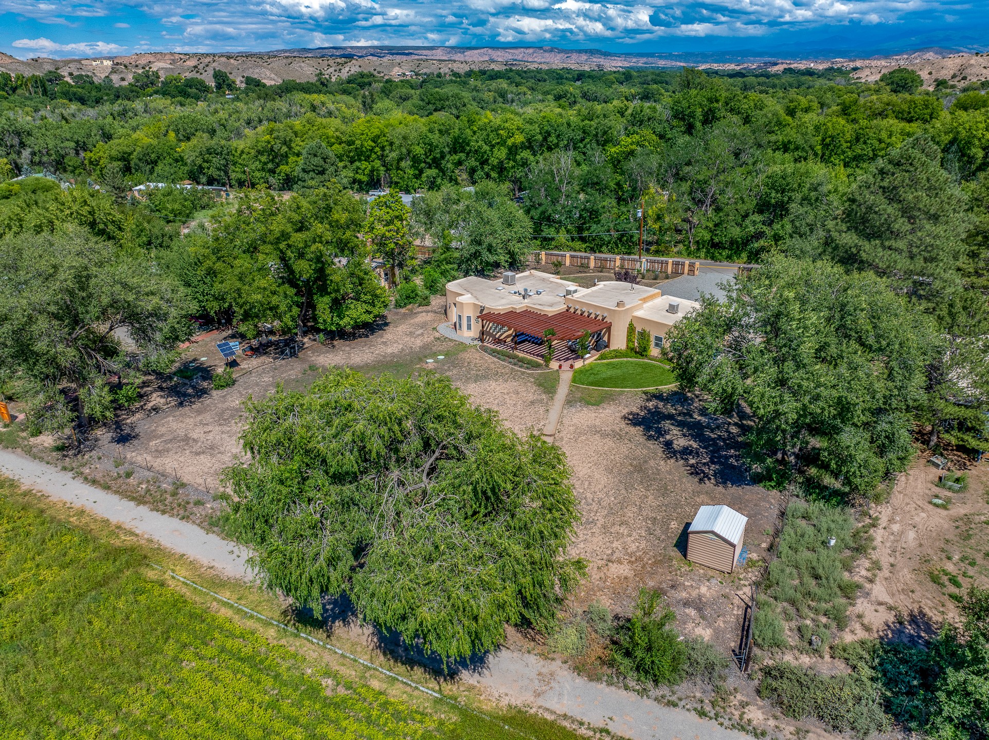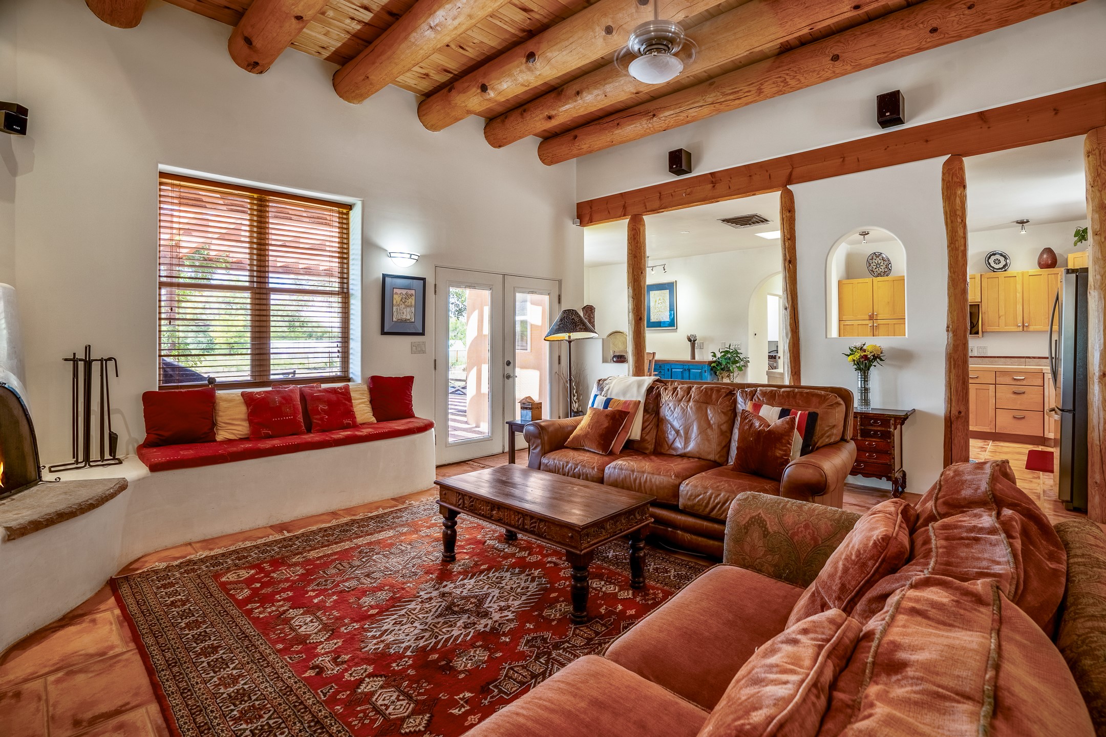 Custom Move-in-Ready, Single-Level, Southwestern-Style Home on 0.736 Acres! 2558 sq ft, 3 Bed / 2.5 Bath, Large Studio with Separate Entrance, Vaulted Wooden Tongue and Groove Ceilings, Skylights, Kiva Fireplace, Landscaping with Fruit Trees and Watering System, Backs to Organic Farm, Close to BLM Hiking Trails, Newer Roof (2022) Under Warranty, Water Filtration System, Cooling, and More! This beautiful custom home, located just 30 minutes from Los Alamos and Santa Fe, was built in 2001 using insulated concrete form (ICF) construction for long-life and great insulation, while also being impervious to fire, rot, and infestation. The home exudes high-end Southwestern charm and style, starting with the latilla and stucco fence that greets you upon arrival to the property. The charm continues as you enter the home and step into the showcase living room, featuring a wood-burning kiva fireplace, 14' ceilings, and 36' vigas. The tile floor flows throughout the living areas and leads to a large studio. The studio features a separate exterior entrance and access to the powder room, perfect for a home business/office or for a family recreation room. The kitchen features stainless-steel appliances, including a gas range with a convection/air fryer oven, and a large peninsula for preparing and staging food for holiday meals. It flows into the formal dining room and has easy access to the flagstone patio for indoor-outdoor entertaining. When it's time to wind down, head towards the bedroom wing, where you'll find two guest bedrooms, a guest bathroom, and the primary suite. The primary suite features wood tongue and groove ceilings, a curved architectural wall, nichos for displaying art, a private sitting area, a walk-in closet, and a large en suite bathroom. The en suite bathroom features dual vanities, a walk-in shower, and a Jacuzzi tub. Stepping into the back yard, you will enjoy a large flagstone patio covered with a 14' high pergola, established landscaping that includes fruit trees and a six-station irrigation system, and access to a walking path around an organic farm. Additional property features include a security system, electric gate, newer (2022) roof with transferable warranty, evaporative cooling, five-zone radiant heating system, and a whole-house water filtration system. Call today to schedule your private showing before this beautiful property is gone!