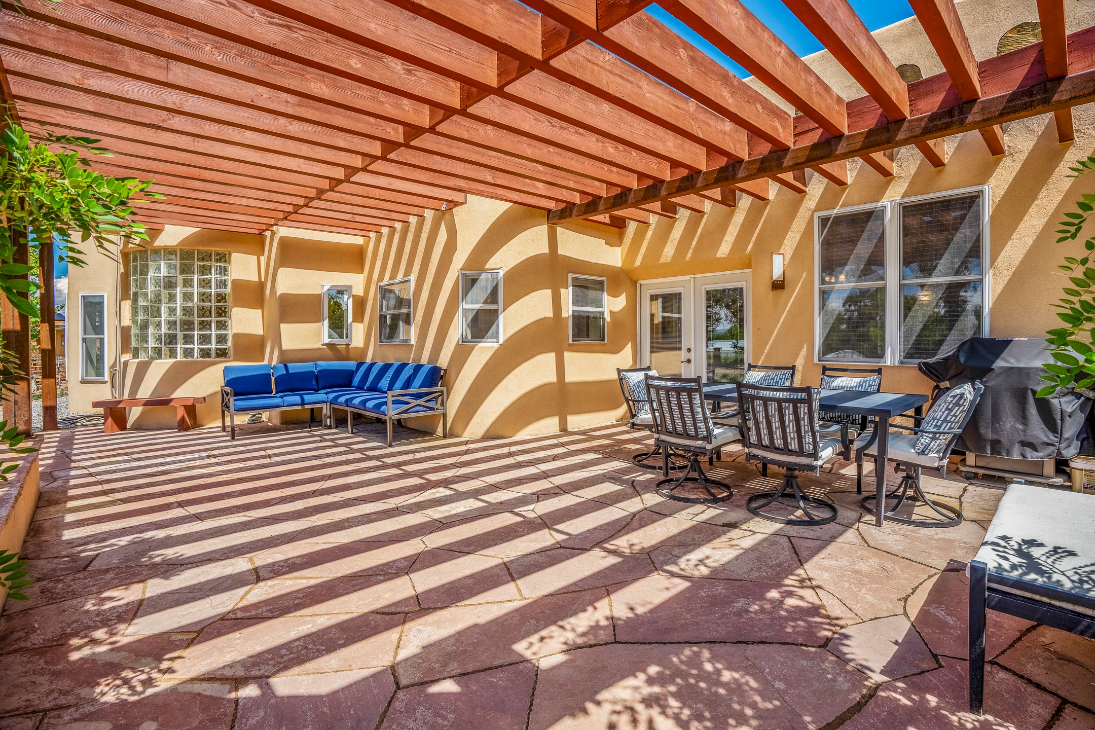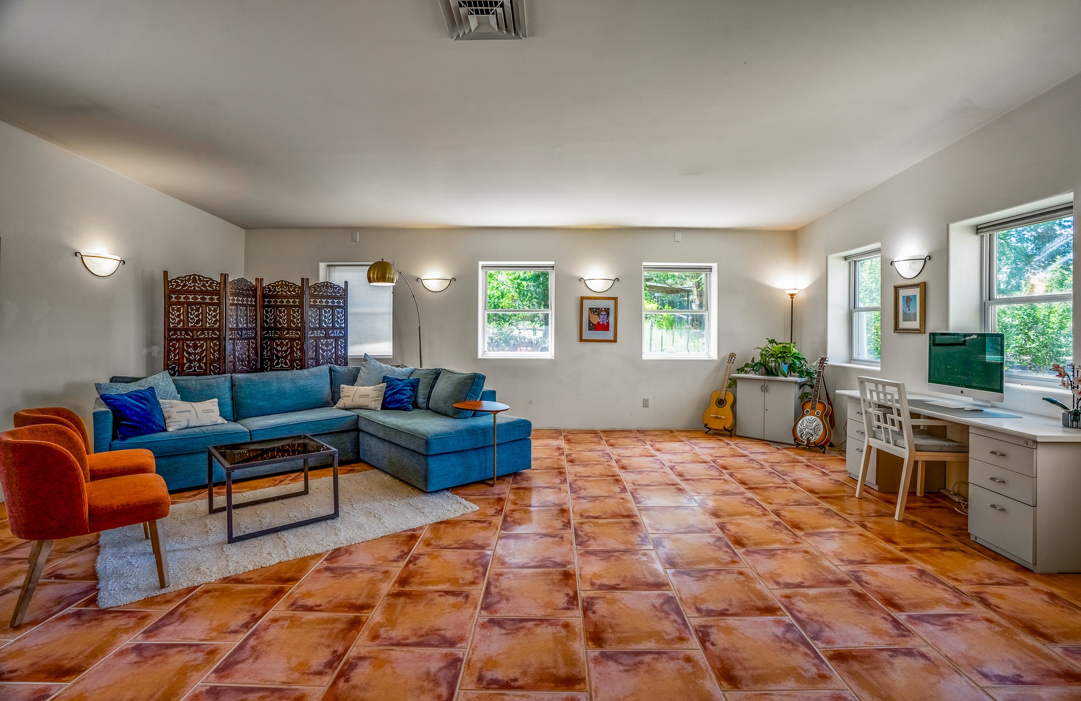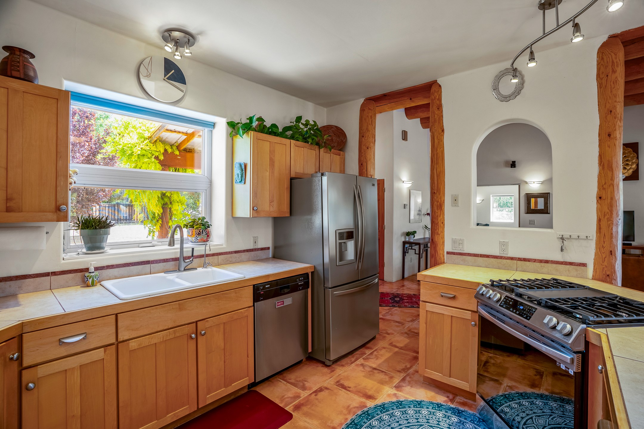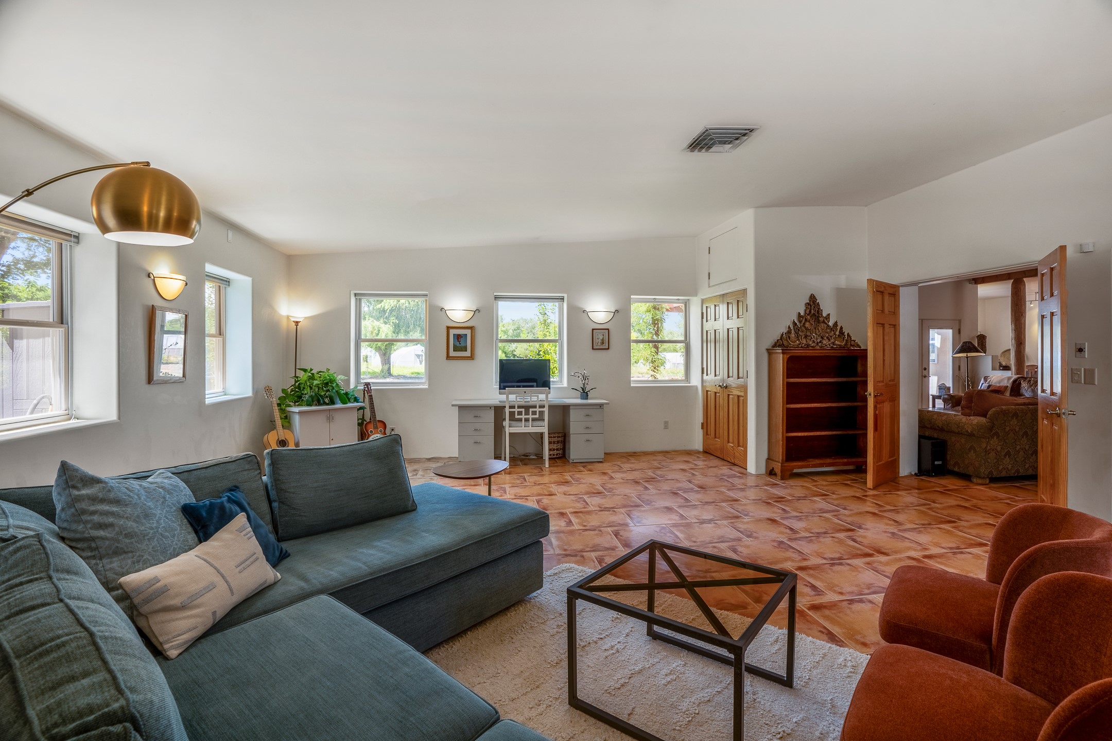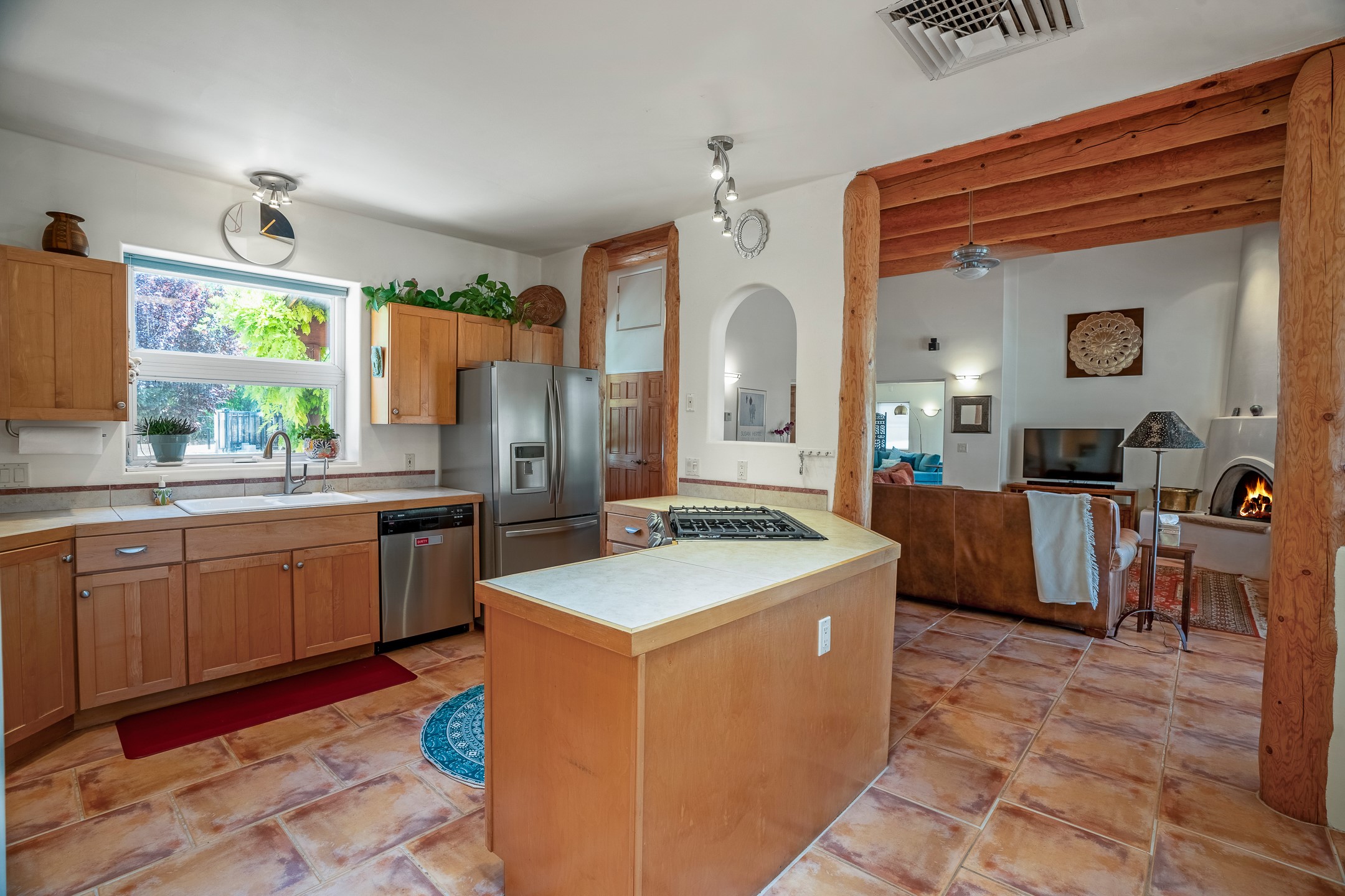 Custom Move-in-Ready, Single-Level, Southwestern-Style Home on 0.736 Acres! 2558 sq ft, 3 Bed / 2.5 Bath, Large Studio with Separate Entrance, Vaulted Wooden Tongue and Groove Ceilings, Skylights, Kiva Fireplace, Landscaping with Fruit Trees and Watering System, Backs to Organic Farm, Close to BLM Hiking Trails, Newer Roof (2022) Under Warranty, Water Filtration System, Cooling, and More! This beautiful custom home, located just 30 minutes from Los Alamos and Santa Fe, was built in 2001 using insulated concrete form (ICF) construction for long-life and great insulation, while also being impervious to fire, rot, and infestation. The home exudes high-end Southwestern charm and style, starting with the latilla and stucco fence that greets you upon arrival to the property. The charm continues as you enter the home and step into the showcase living room, featuring a wood-burning kiva fireplace, 14' ceilings, and 36' vigas. The tile floor flows throughout the living areas and leads to a large studio. The studio features a separate exterior entrance and access to the powder room, perfect for a home business/office or for a family recreation room. The kitchen features stainless-steel appliances, including a gas range with a convection/air fryer oven, and a large peninsula for preparing and staging food for holiday meals. It flows into the formal dining room and has easy access to the flagstone patio for indoor-outdoor entertaining. When it's time to wind down, head towards the bedroom wing, where you'll find two guest bedrooms, a guest bathroom, and the primary suite. The primary suite features wood tongue and groove ceilings, a curved architectural wall, nichos for displaying art, a private sitting area, a walk-in closet, and a large en suite bathroom. The en suite bathroom features dual vanities, a walk-in shower, and a Jacuzzi tub. Stepping into the back yard, you will enjoy a large flagstone patio covered with a 14' high pergola, established landscaping that includes fruit trees and a six-station irrigation system, and access to a walking path around an organic farm. Additional property features include a security system, electric gate, newer (2022) roof with transferable warranty, evaporative cooling, five-zone radiant heating system, and a whole-house water filtration system. Call today to schedule your private showing before this beautiful property is gone!