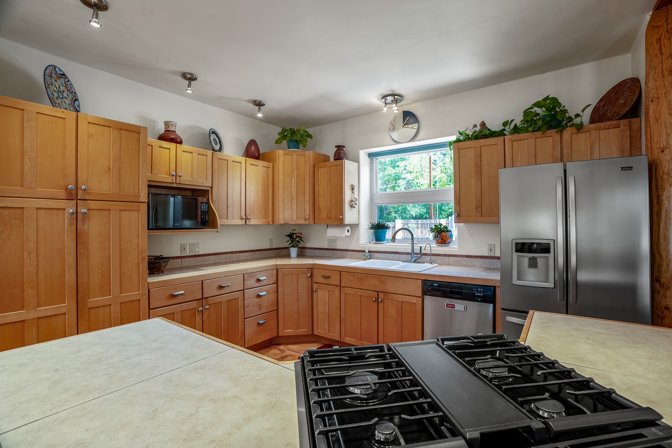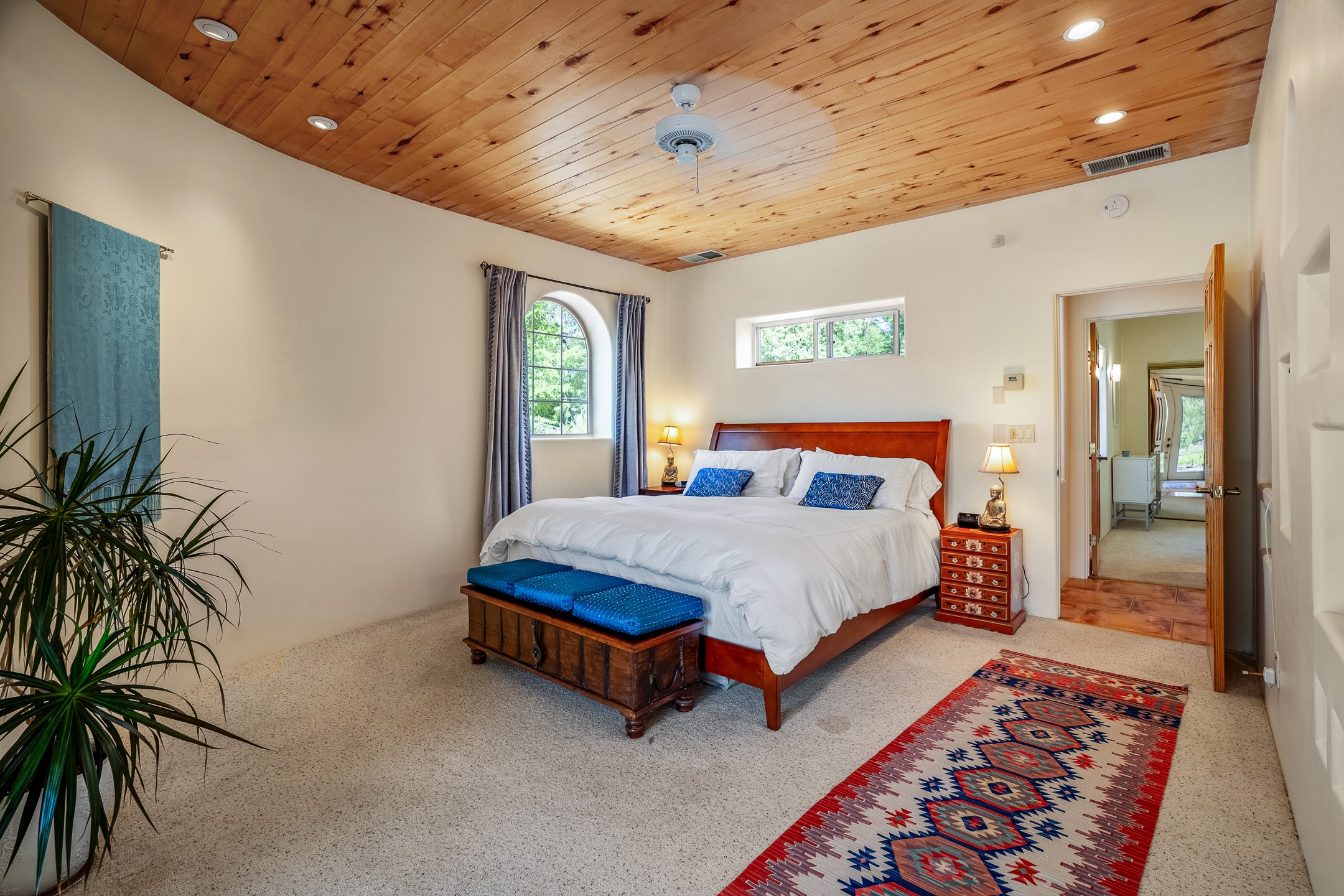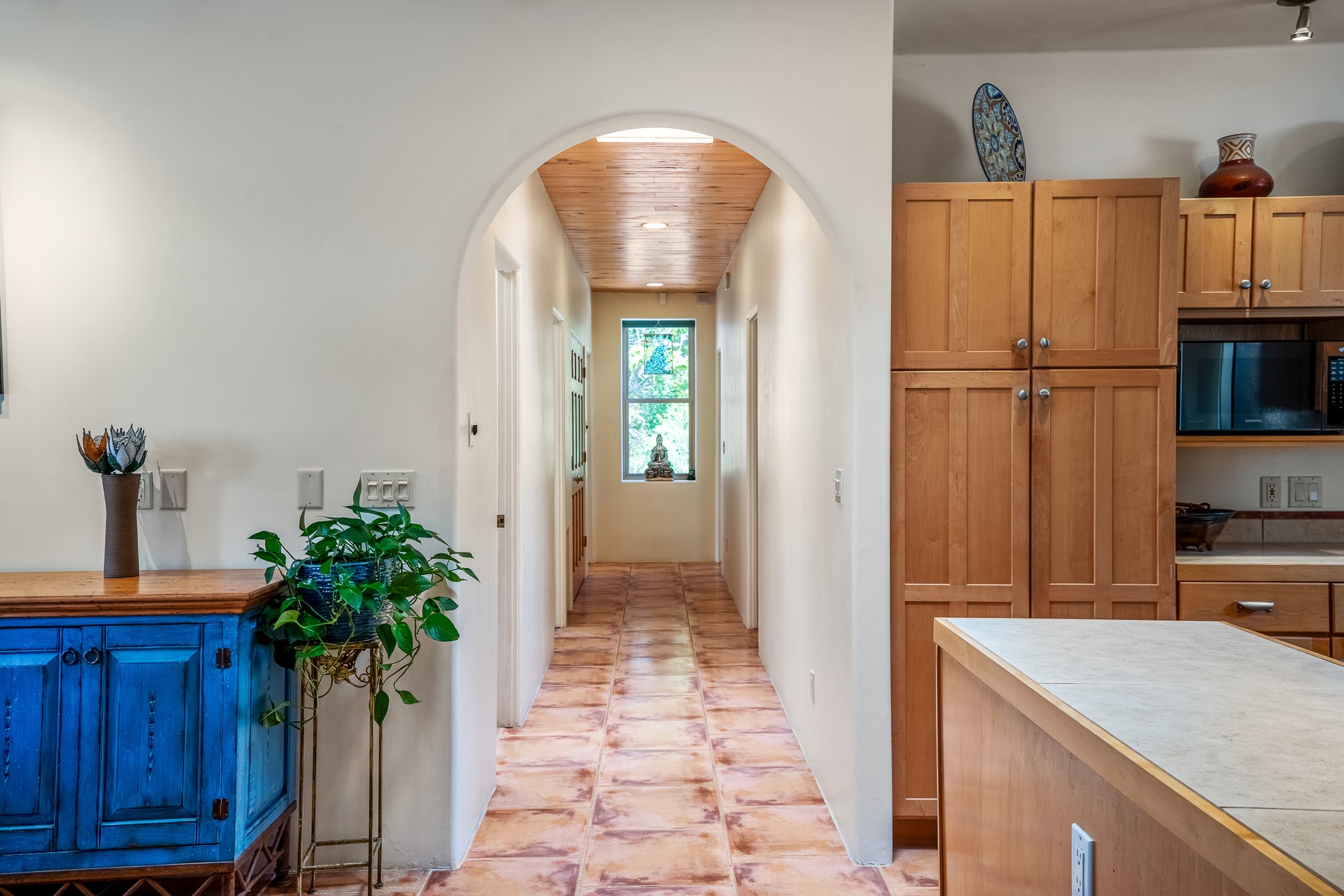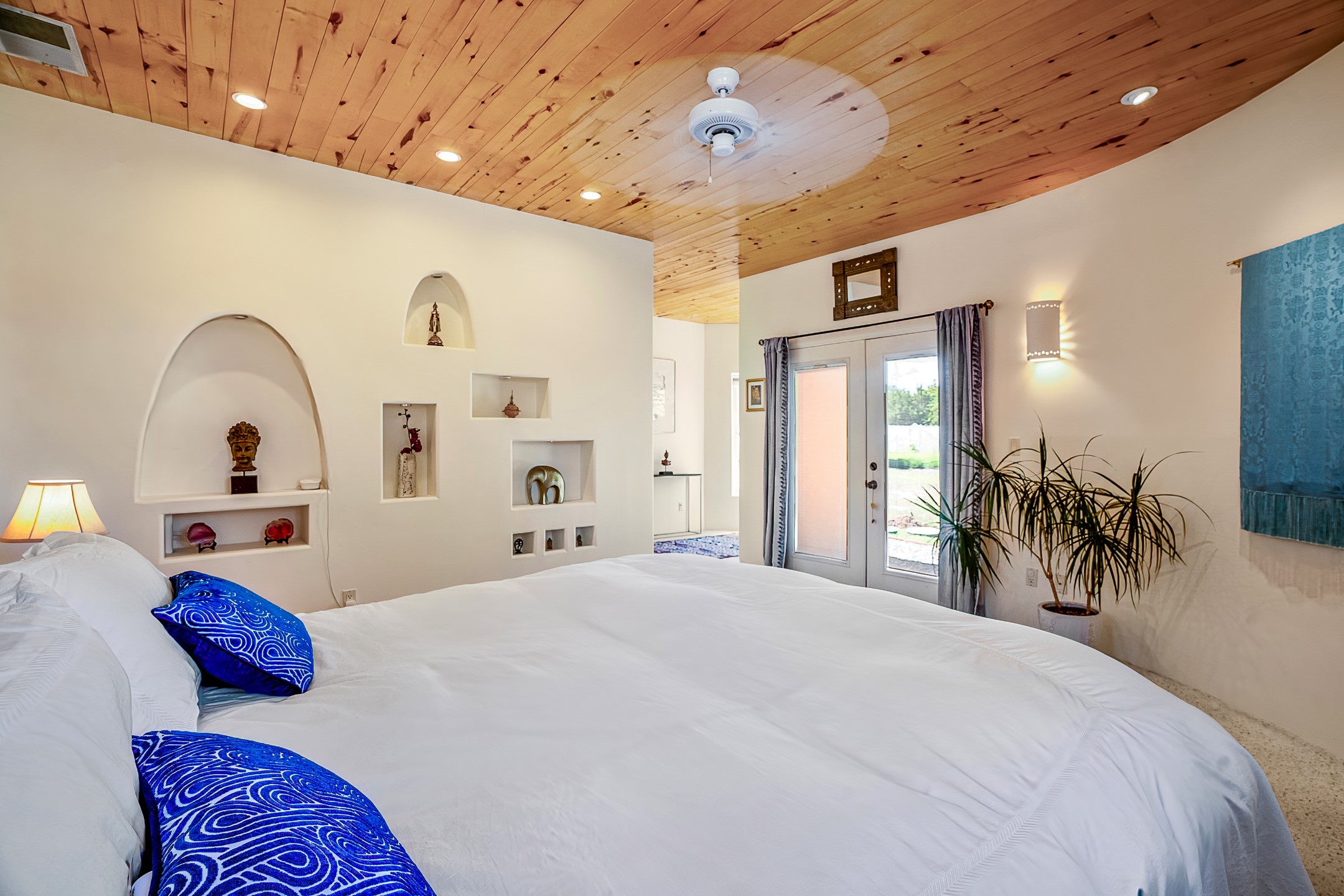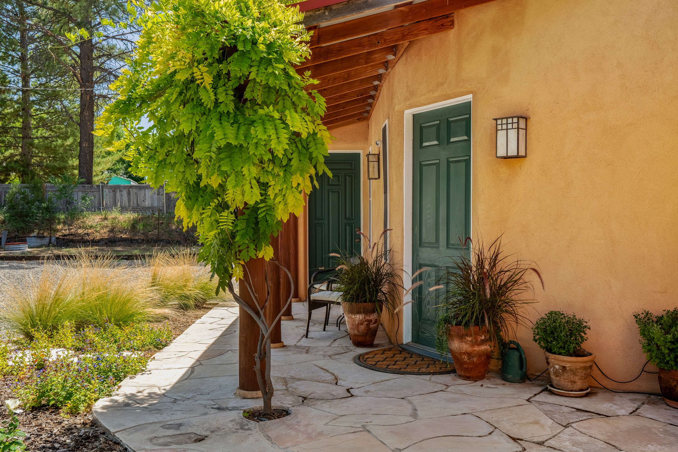 Custom Move-in-Ready, Single-Level, Southwestern-Style Home on 0.736 Acres! 2558 sq ft, 3 Bed / 2.5 Bath, Large Studio with Separate Entrance, Vaulted Wooden Tongue and Groove Ceilings, Skylights, Kiva Fireplace, Landscaping with Fruit Trees and Watering System, Backs to Organic Farm, Close to BLM Hiking Trails, Newer Roof (2022) Under Warranty, Water Filtration System, Cooling, and More! This beautiful custom home, located just 30 minutes from Los Alamos and Santa Fe, was built in 2001 using insulated concrete form (ICF) construction for long-life and great insulation, while also being impervious to fire, rot, and infestation. The home exudes high-end Southwestern charm and style, starting with the latilla and stucco fence that greets you upon arrival to the property. The charm continues as you enter the home and step into the showcase living room, featuring a wood-burning kiva fireplace, 14' ceilings, and 36' vigas. The tile floor flows throughout the living areas and leads to a large studio. The studio features a separate exterior entrance and access to the powder room, perfect for a home business/office or for a family recreation room. The kitchen features stainless-steel appliances, including a gas range with a convection/air fryer oven, and a large peninsula for preparing and staging food for holiday meals. It flows into the formal dining room and has easy access to the flagstone patio for indoor-outdoor entertaining. When it's time to wind down, head towards the bedroom wing, where you'll find two guest bedrooms, a guest bathroom, and the primary suite. The primary suite features wood tongue and groove ceilings, a curved architectural wall, nichos for displaying art, a private sitting area, a walk-in closet, and a large en suite bathroom. The en suite bathroom features dual vanities, a walk-in shower, and a Jacuzzi tub. Stepping into the back yard, you will enjoy a large flagstone patio covered with a 14' high pergola, established landscaping that includes fruit trees and a six-station irrigation system, and access to a walking path around an organic farm. Additional property features include a security system, electric gate, newer (2022) roof with transferable warranty, evaporative cooling, five-zone radiant heating system, and a whole-house water filtration system. Call today to schedule your private showing before this beautiful property is gone!