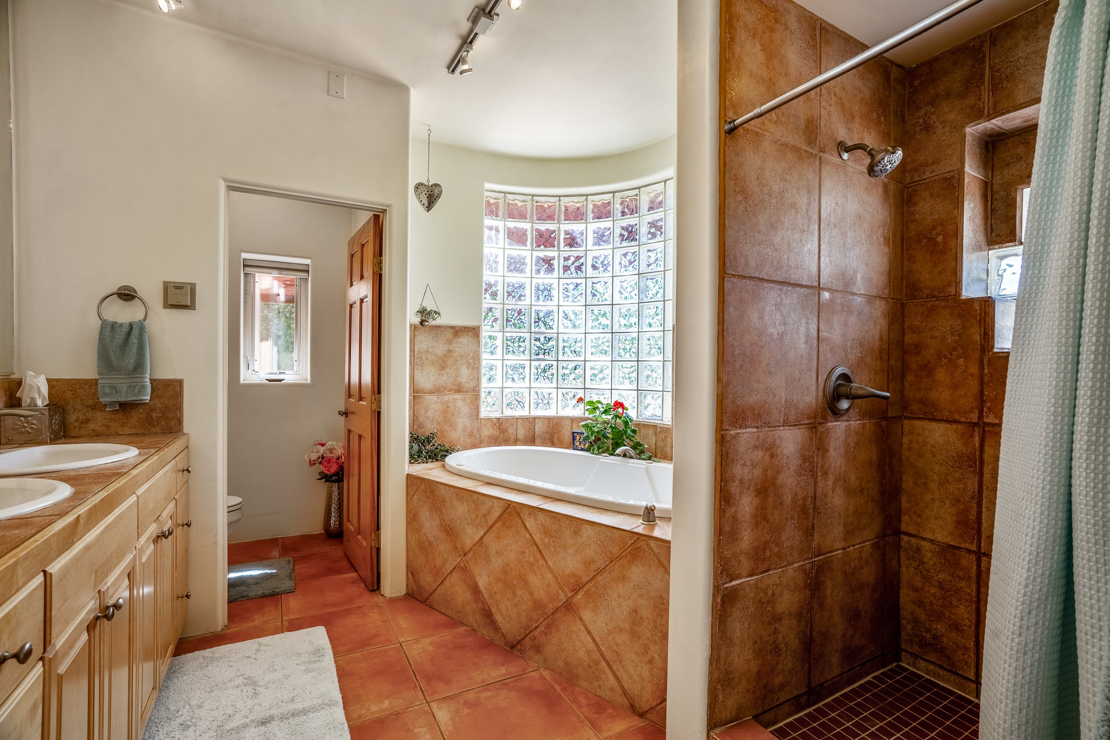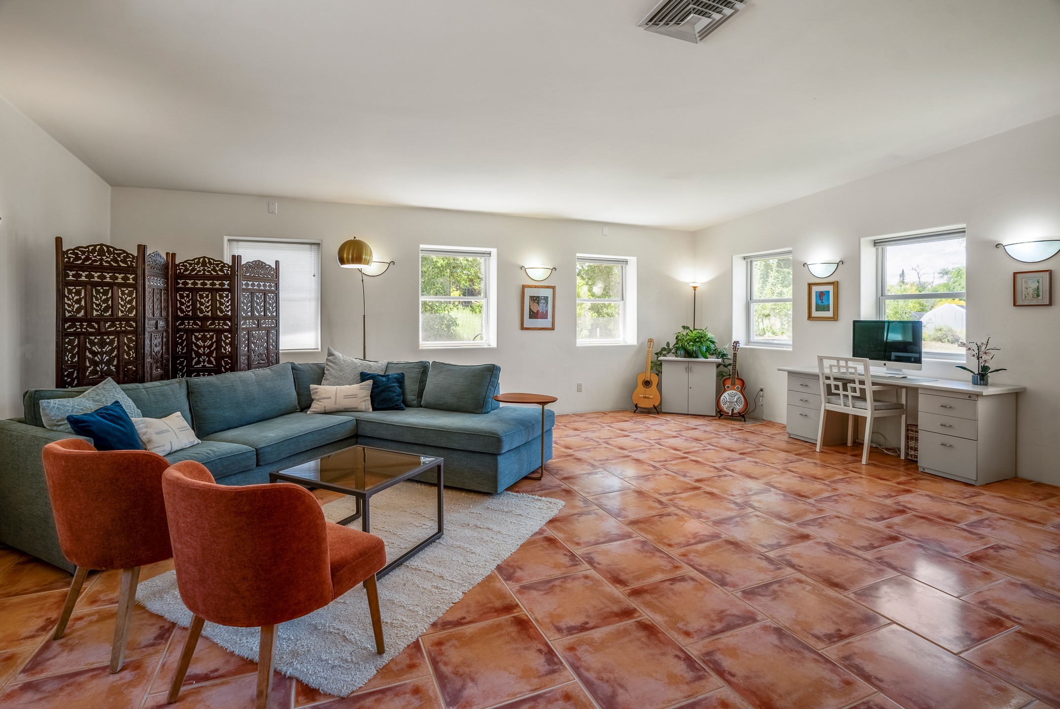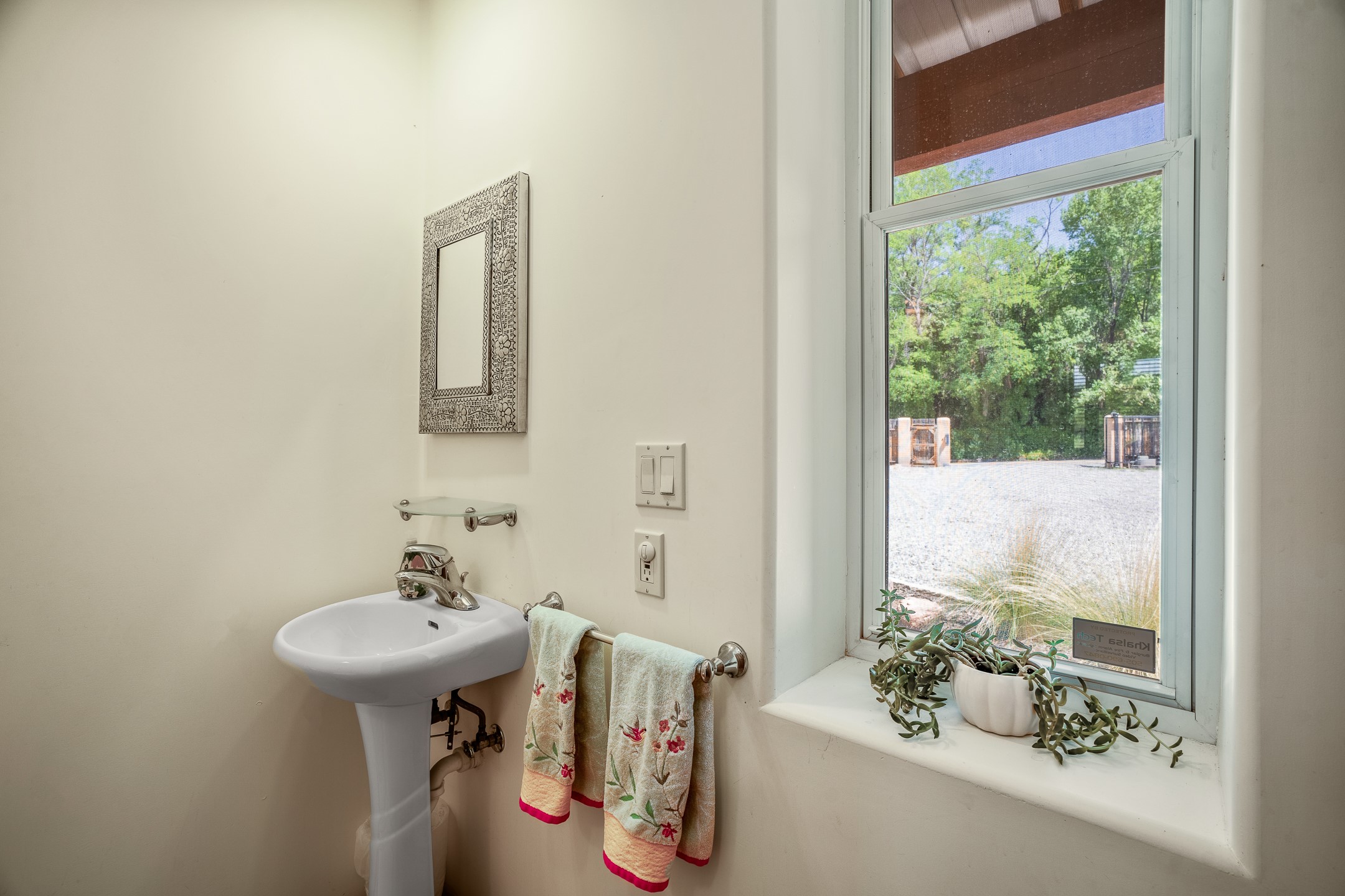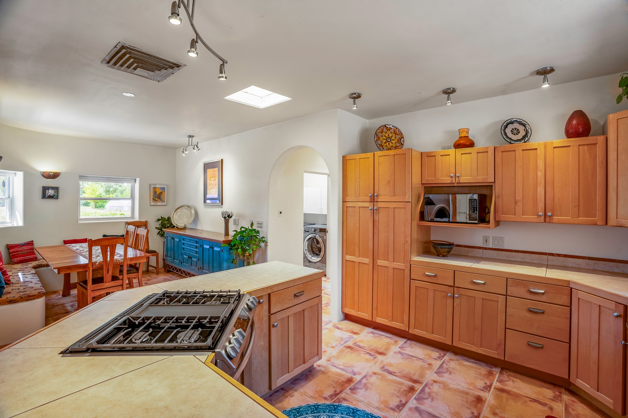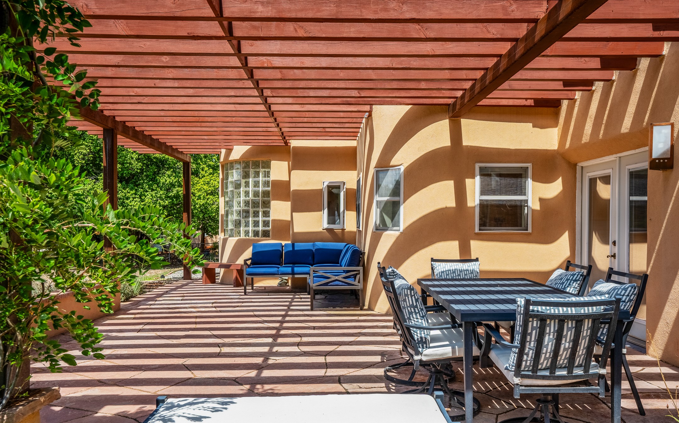Custom Move-in-Ready, Single-Level, Southwestern-Style Home on 0.736 Acres! 2558 sq ft, 3 Bed / 2.5 Bath, Large Studio with Separate Entrance, Vaulted Wooden Tongue and Groove Ceilings, Skylights, Kiva Fireplace, Landscaping with Fruit Trees and Watering System, Backs to Organic Farm, Close to BLM Hiking Trails, Newer Roof (2022) Under Warranty, Water Filtration System, Cooling, and More! This beautiful custom home, located just 30 minutes from Los Alamos and Santa Fe, was built in 2001 using insulated concrete form (ICF) construction for long-life and great insulation, while also being impervious to fire, rot, and infestation. The home exudes high-end Southwestern charm and style, starting with the latilla and stucco fence that greets you upon arrival to the property. The charm continues as you enter the home and step into the showcase living room, featuring a wood-burning kiva fireplace, 14' ceilings, and 36' vigas. The tile floor flows throughout the living areas and leads to a large studio. The studio features a separate exterior entrance and access to the powder room, perfect for a home business/office or for a family recreation room. The kitchen features stainless-steel appliances, including a gas range with a convection/air fryer oven, and a large peninsula for preparing and staging food for holiday meals. It flows into the formal dining room and has easy access to the flagstone patio for indoor-outdoor entertaining. When it's time to wind down, head towards the bedroom wing, where you'll find two guest bedrooms, a guest bathroom, and the primary suite. The primary suite features wood tongue and groove ceilings, a curved architectural wall, nichos for displaying art, a private sitting area, a walk-in closet, and a large en suite bathroom. The en suite bathroom features dual vanities, a walk-in shower, and a Jacuzzi tub. Stepping into the back yard, you will enjoy a large flagstone patio covered with a 14' high pergola, established landscaping that includes fruit trees and a six-station irrigation system, and access to a walking path around an organic farm. Additional property features include a security system, electric gate, newer (2022) roof with transferable warranty, evaporative cooling, five-zone radiant heating system, and a whole-house water filtration system. Call today to schedule your private showing before this beautiful property is gone!