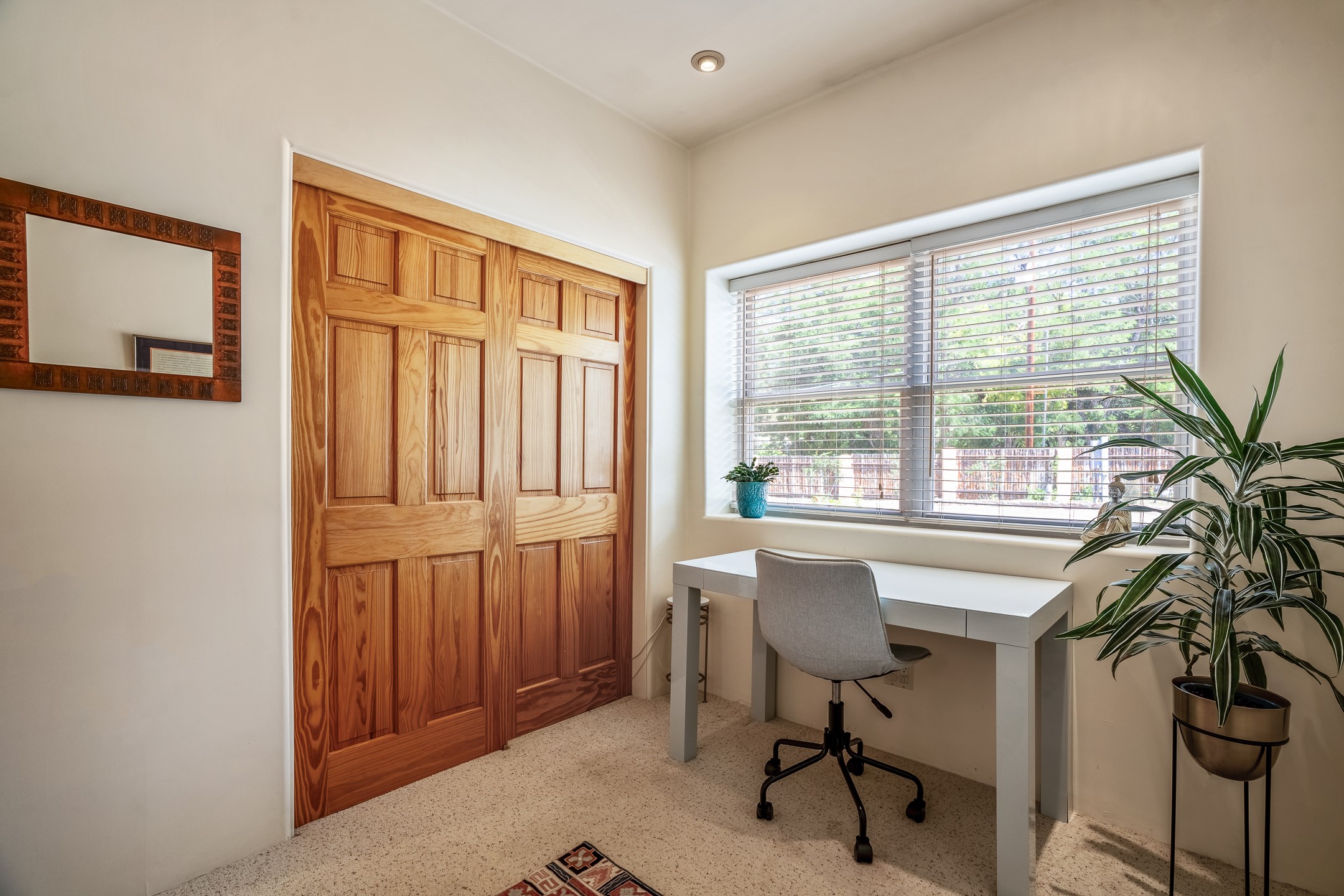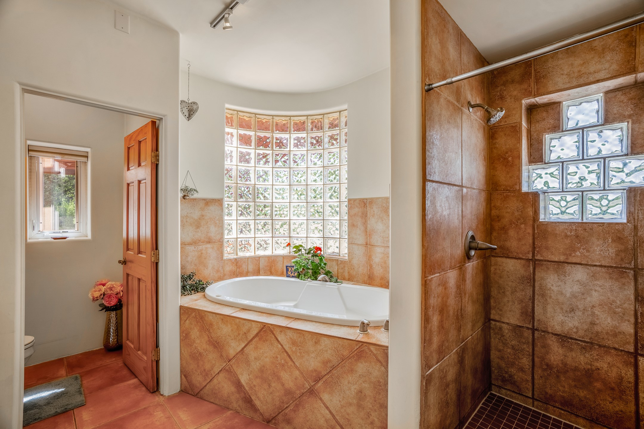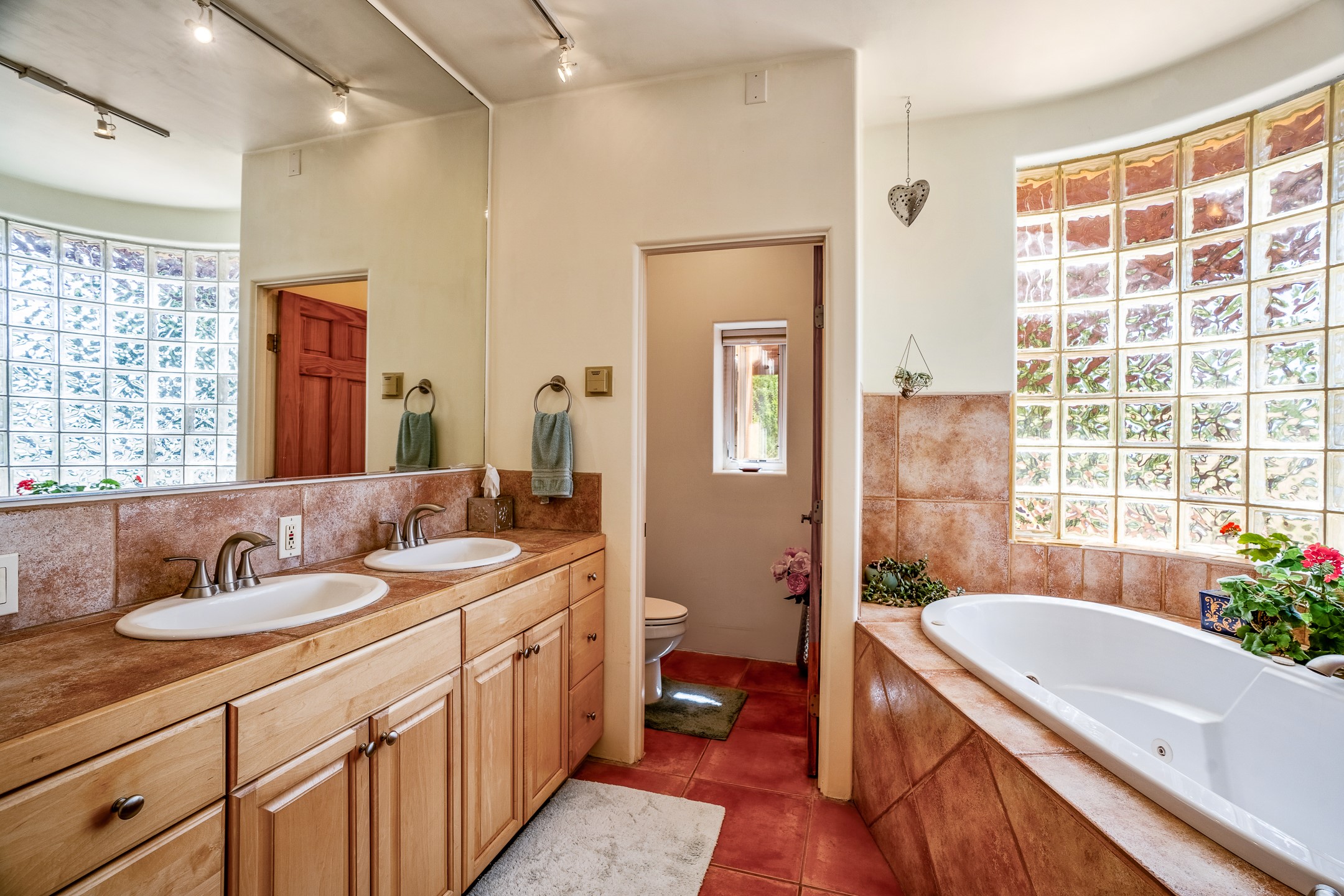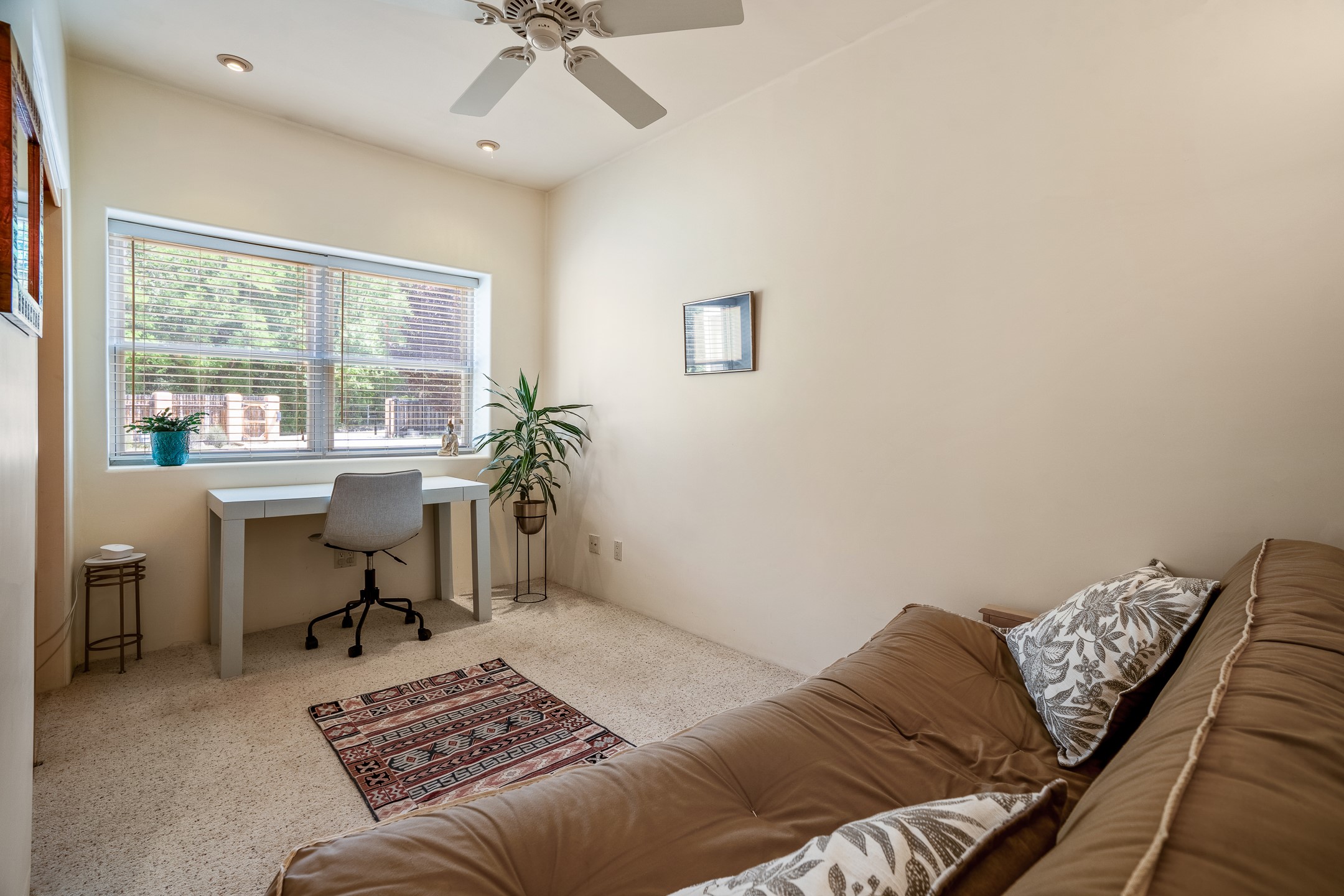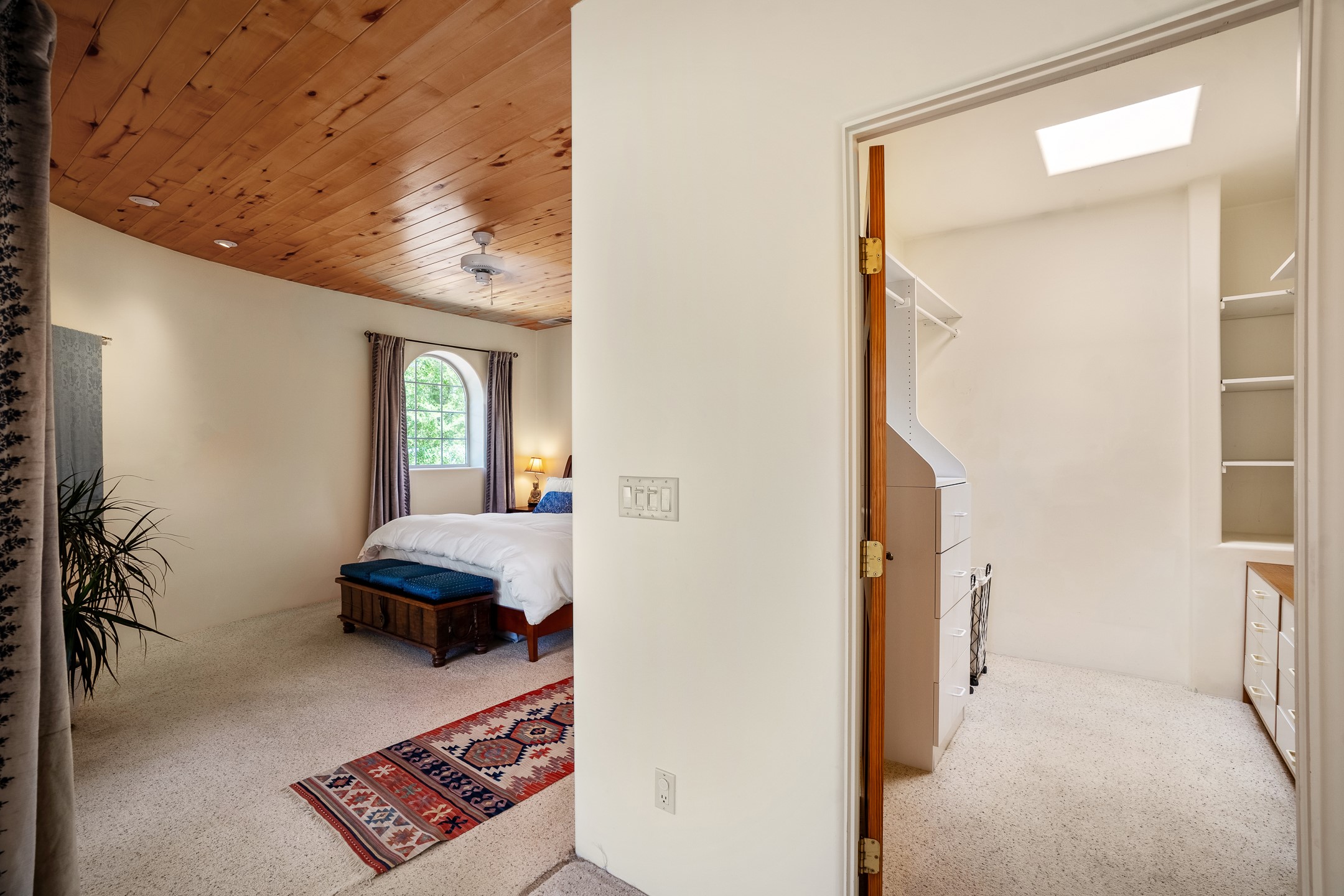Custom Move-in-Ready, Single-Level, Southwestern-Style Home on 0.736 Acres! 2558 sq ft, 3 Bed / 2.5 Bath, Large Studio with Separate Entrance, Vaulted Wooden Tongue and Groove Ceilings, Skylights, Kiva Fireplace, Landscaping with Fruit Trees and Watering System, Backs to Organic Farm, Close to BLM Hiking Trails, Newer Roof (2022) Under Warranty, Water Filtration System, Cooling, and More! This beautiful custom home, located just 30 minutes from Los Alamos and Santa Fe, was built in 2001 using insulated concrete form (ICF) construction for long-life and great insulation, while also being impervious to fire, rot, and infestation. The home exudes high-end Southwestern charm and style, starting with the latilla and stucco fence that greets you upon arrival to the property. The charm continues as you enter the home and step into the showcase living room, featuring a wood-burning kiva fireplace, 14' ceilings, and 36' vigas. The tile floor flows throughout the living areas and leads to a large studio. The studio features a separate exterior entrance and access to the powder room, perfect for a home business/office or for a family recreation room. The kitchen features stainless-steel appliances, including a gas range with a convection/air fryer oven, and a large peninsula for preparing and staging food for holiday meals. It flows into the formal dining room and has easy access to the flagstone patio for indoor-outdoor entertaining. When it's time to wind down, head towards the bedroom wing, where you'll find two guest bedrooms, a guest bathroom, and the primary suite. The primary suite features wood tongue and groove ceilings, a curved architectural wall, nichos for displaying art, a private sitting area, a walk-in closet, and a large en suite bathroom. The en suite bathroom features dual vanities, a walk-in shower, and a Jacuzzi tub. Stepping into the back yard, you will enjoy a large flagstone patio covered with a 14' high pergola, established landscaping that includes fruit trees and a six-station irrigation system, and access to a walking path around an organic farm. Additional property features include a security system, electric gate, newer (2022) roof with transferable warranty, evaporative cooling, five-zone radiant heating system, and a whole-house water filtration system. Call today to schedule your private showing before this beautiful property is gone!