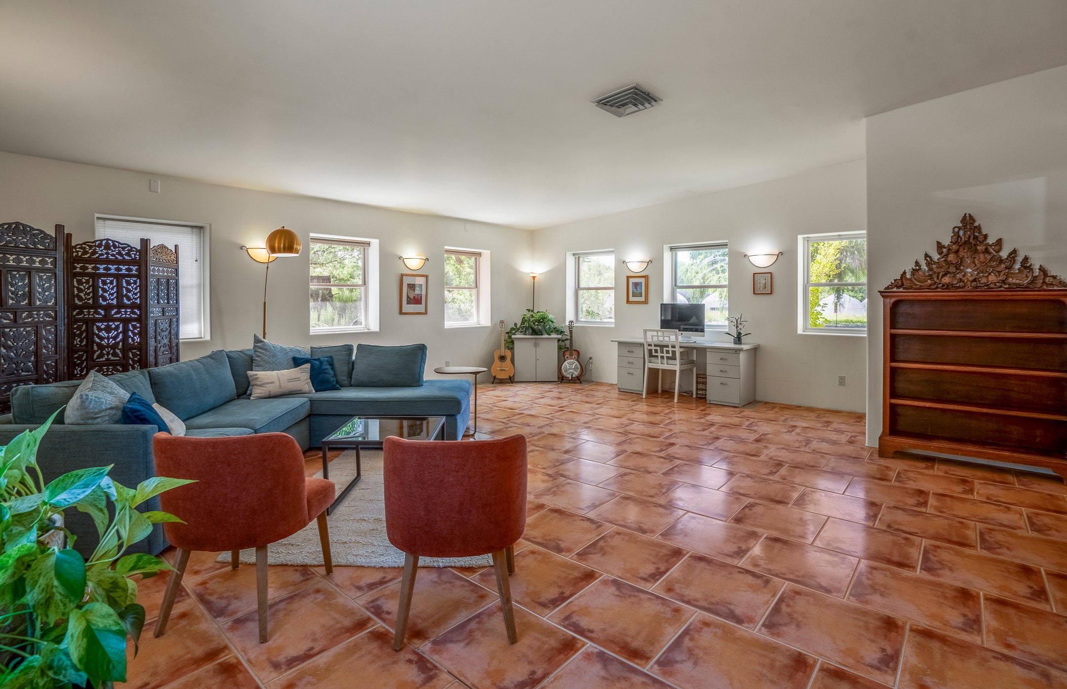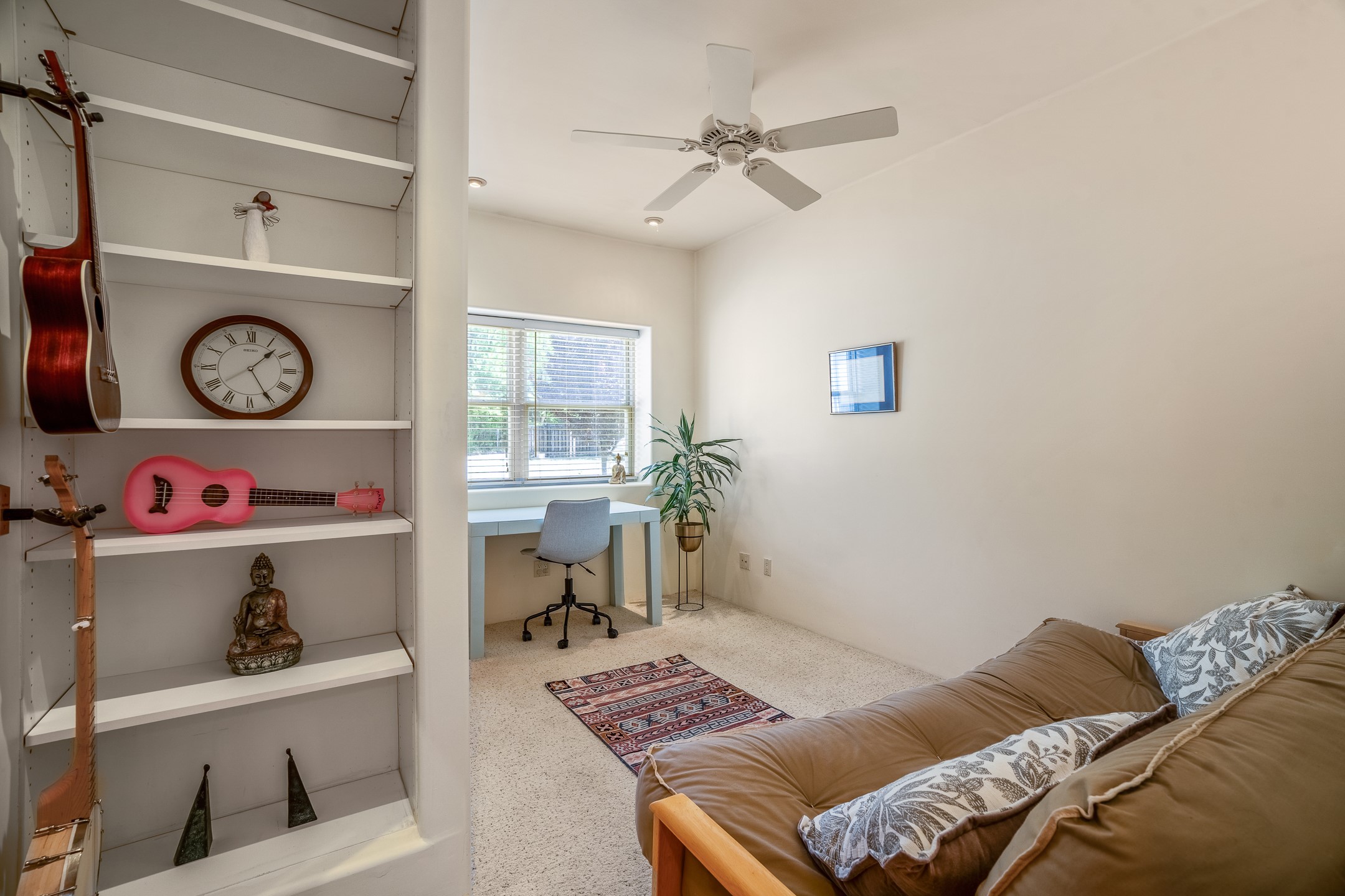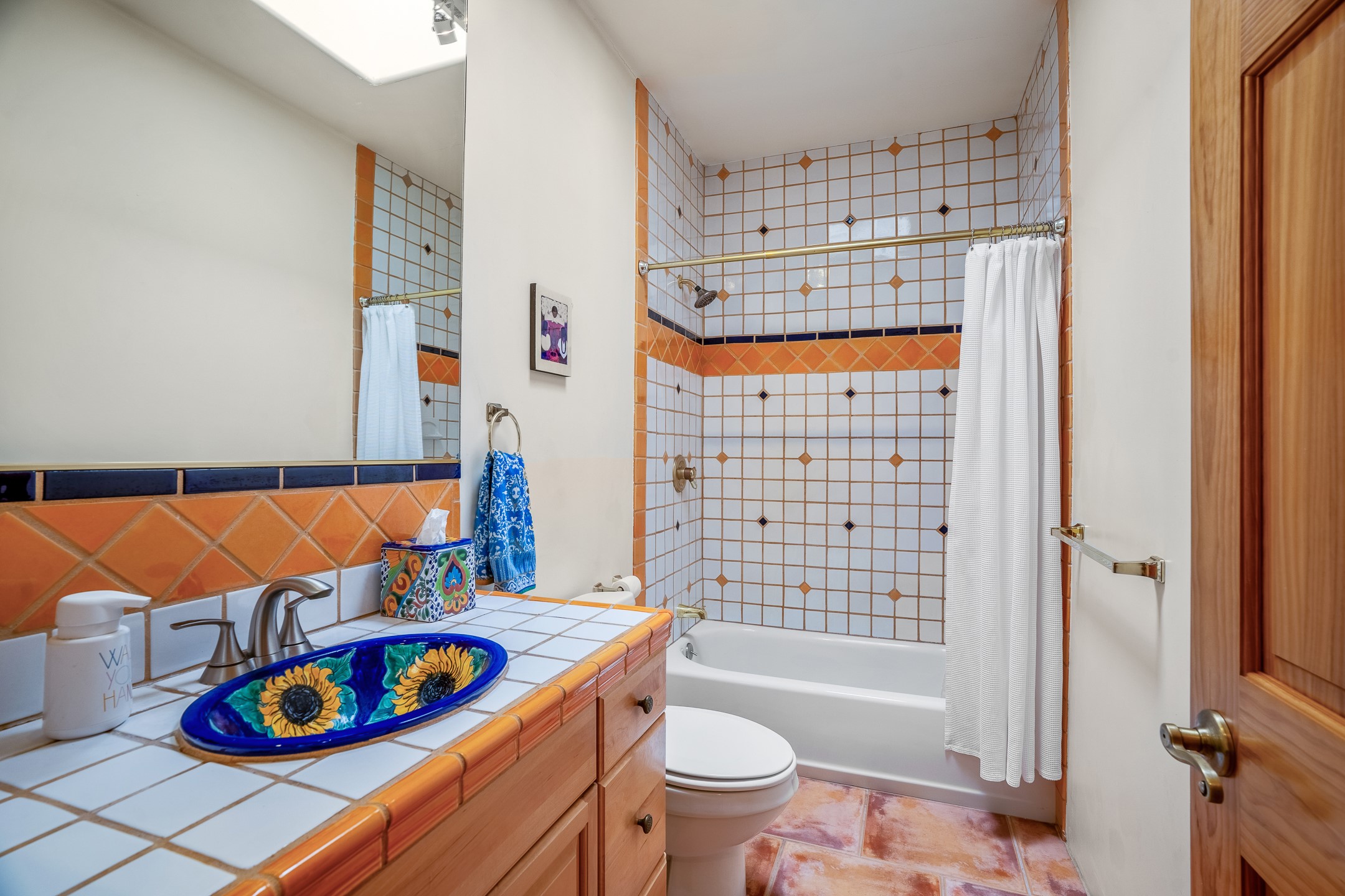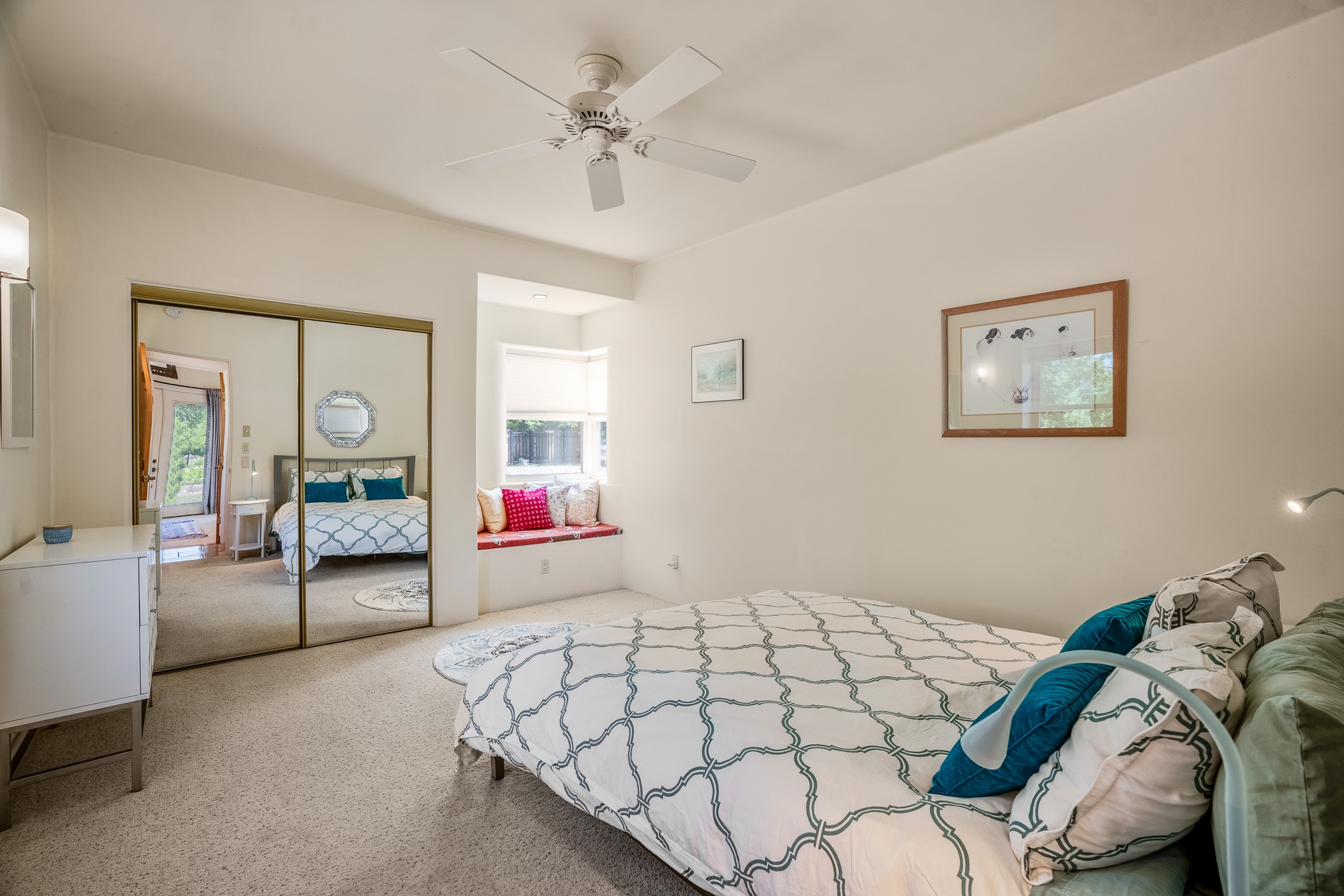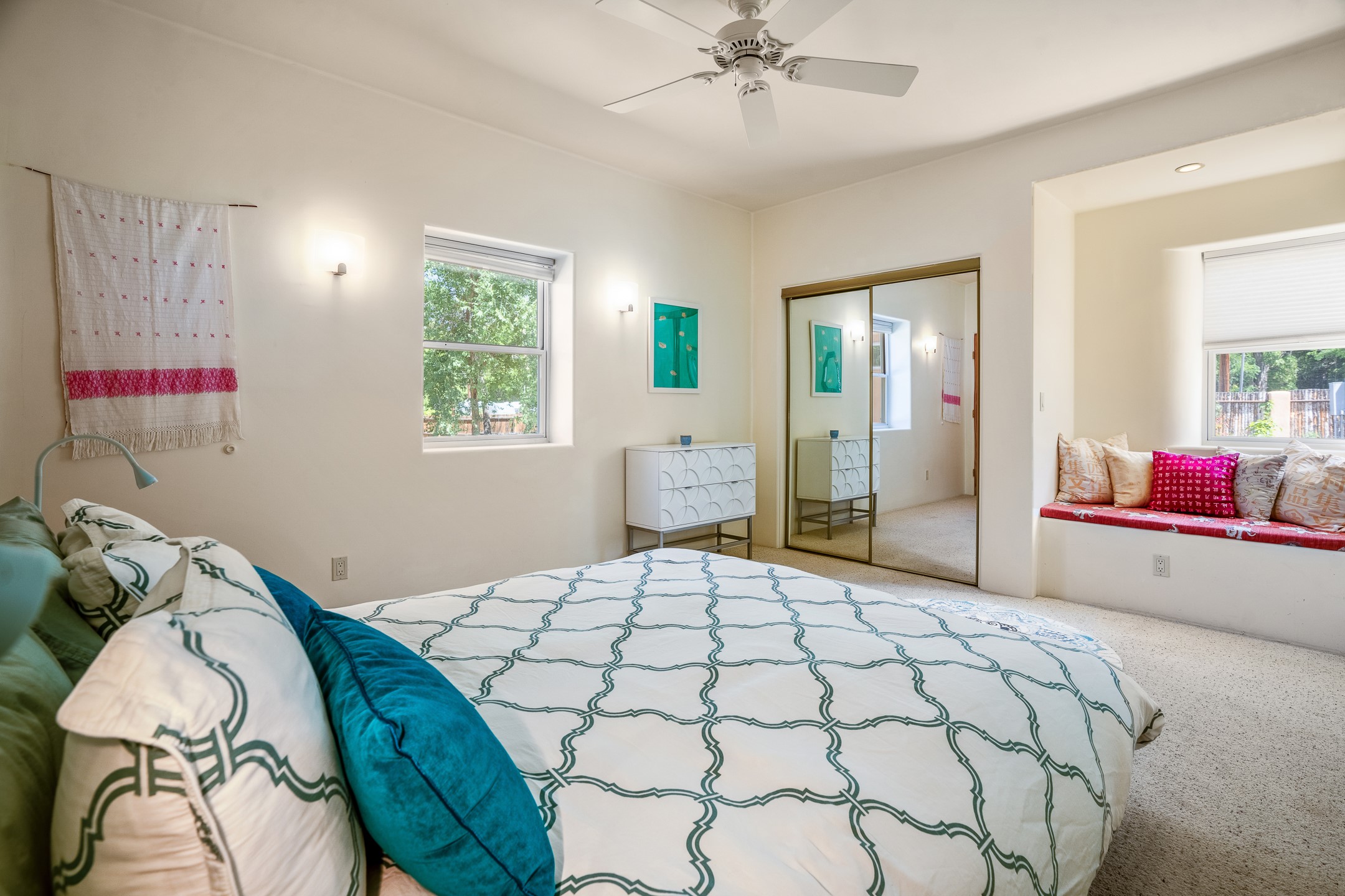 Custom Move-in-Ready, Single-Level, Southwestern-Style Home on 0.736 Acres! 2558 sq ft, 3 Bed / 2.5 Bath, Large Studio with Separate Entrance, Vaulted Wooden Tongue and Groove Ceilings, Skylights, Kiva Fireplace, Landscaping with Fruit Trees and Watering System, Backs to Organic Farm, Close to BLM Hiking Trails, Newer Roof (2022) Under Warranty, Water Filtration System, Cooling, and More! This beautiful custom home, located just 30 minutes from Los Alamos and Santa Fe, was built in 2001 using insulated concrete form (ICF) construction for long-life and great insulation, while also being impervious to fire, rot, and infestation. The home exudes high-end Southwestern charm and style, starting with the latilla and stucco fence that greets you upon arrival to the property. The charm continues as you enter the home and step into the showcase living room, featuring a wood-burning kiva fireplace, 14' ceilings, and 36' vigas. The tile floor flows throughout the living areas and leads to a large studio. The studio features a separate exterior entrance and access to the powder room, perfect for a home business/office or for a family recreation room. The kitchen features stainless-steel appliances, including a gas range with a convection/air fryer oven, and a large peninsula for preparing and staging food for holiday meals. It flows into the formal dining room and has easy access to the flagstone patio for indoor-outdoor entertaining. When it's time to wind down, head towards the bedroom wing, where you'll find two guest bedrooms, a guest bathroom, and the primary suite. The primary suite features wood tongue and groove ceilings, a curved architectural wall, nichos for displaying art, a private sitting area, a walk-in closet, and a large en suite bathroom. The en suite bathroom features dual vanities, a walk-in shower, and a Jacuzzi tub. Stepping into the back yard, you will enjoy a large flagstone patio covered with a 14' high pergola, established landscaping that includes fruit trees and a six-station irrigation system, and access to a walking path around an organic farm. Additional property features include a security system, electric gate, newer (2022) roof with transferable warranty, evaporative cooling, five-zone radiant heating system, and a whole-house water filtration system. Call today to schedule your private showing before this beautiful property is gone!